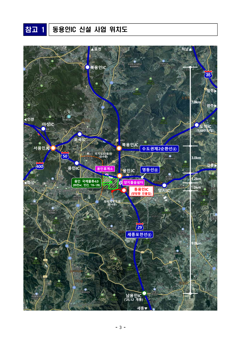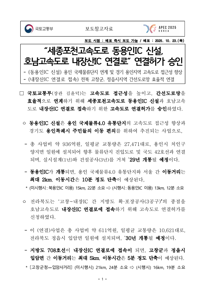 - 1 - 보도참고자료 보도 시점 : 배포 즉시 보도 가능 / 배포 : 2025. 10. 23.(목) “세종포천고속도로 동용인IC 신설, 호남고속도로 내장산IC 연결로” 연결허가 승인- (동용인IC 신설) 용인 국제물류단지 연계 및 경기 용인지역 고속도로 접근성 향상- (내장산IC 연결로 접속) 전북 고창군, 정읍시지역 간선도로망 효율적 연결□ 국토교통부(장관 김윤덕)는 고속도로 접근성을 높이고, 간선도로망을 효율적으로 연계하기 위해 세종포천고속도로 동용인IC 신설과 호남고속도로 내장산IC 연결로 접속하기 위한 고속도로 연결허가를 승인하였다. ㅇ 동용인IC 신설은 용인 국제물류4.0 유통단지의 고속도로 접근성 향상과경기도 용인특례시 주민들의 이동 편의를 위하여 추진되는 사업으로, - 총 사업비 약 936억원, 일평균 교통량은 27,471대로, 용인시 처인구 양지면 일원에 설치되어 향후 물류단지 진입도로 및 국도 42호선과 연결되며, 실시설계(1년)와 건설공사(3년)를 거쳐 ’29년 개통될 예정이다. - 동용인IC가 개통되면, 용인 국제물류4.0 유통단지와 서울 간 이동거리는 최대 2km, 이동시간은 10분 정도 단축이 예상된다, * (미시행시: 북용인IC 이용) 15km, 22분 소요 ⇨ (시행시: 동용인IC 이용) 13km, 12분 소요ㅇ 전라북도는 ‘고창~내장IC 간 지방도 확·포장공사(3공구)’의 종점을호남고속도로 내장산IC 연결로에 접속하기 위해 고속도로 연결허가를 신청하였다. - 이 (연결)사업은 총 사업비 약 611억원, 일평균 교통량은 10,621대로, 전라북도 정읍시 입암면 일원에 설치되며, ’30년 개통될 예정이다. - 지방도 708호선이 내장산IC 연결로에 접속이 되면, 고창군과 정읍시 입암면 간 이동거리는 최대 5km, 이동시간은 5분 정도 단축이 예상된다. * 〔고창군청↔입암사거리〕 (미시행시) 21km, 24분 소요 ⇨ (시행시) 16km, 19분 소요 - 2 - □ 국토교통부 이우제 도로국장은 “이번 고속도로 연결허가 승인이 “지역 주민의 교통편의 개선과 함께 물류 비용 절감을 통한 지역 경제 활성화에도 큰 효과가 있을 것으로 기대한다”고 밝혔다. 담당 부서 도로국 책임자 과 장 김기대 (044-201-3875) 도로정책과 담당자 사무관 이왕근 (044-201-3883) 주무관 윤양중 (044-201-3880) - 3 - 참고 1 동용인IC 신설 사업 위치도 용인IC 용인JC 양지IC) ◀인천 강릉▶서용인JC 마성IC 북용인JC 북용인IC 포곡IC 도척IC (9,695대/일) ◀화성 광주▶▲포천 세종▼ 하남▲ 청주▶50 400 세종포천선⑥ 29 동용인IC (양방향 진출입) 양지졸음쉼터 영동선⑧ 수도권제2순환선④ 남용인IC (‘25.12 개통) 35 1.2km 1.0km 9.8km 3.0km 7.0km 용인휴게소 용인 국제물류4.0 (95만㎡, 민간, ‘19~’29) 국지도57호선 (공사중) 도시계획도로 (공사중) - 4 - 참고 2 지방도 708호선 내장산IC 연결로 접속 사업 위치도 정읍IC 백양사IC 내장산IC 선운산IC 줄포IC 논산▲순천▼ 서울▲ ▼무안 국도23호④ 국도1호④ 15 서해안선④ 호남선④ 25 1공구(5.4km) 2공구(4.5km) 3공구(3.4km) 8.5km 9.2km - 5 - 참고 3 사업 기대효과 ① 세종포천고속도로 동용인IC 신설 사업 국제물류 4.0 동용인IC ※ 경로 : (미시행시) 유통단지↔물류1호선↔국지도57호선↔국도45호선↔지방도57호선↔북용인IC (시 행 시) 유통단지↔동용인IC↔세종포천선↔북용인IC ② 호남고속도로 내장산IC 연결로 지방도 접속 사업 고창군청 입암사거리 연결로 접속 ※ 경로 : (미시행시) 고창군청↔군도모양성로↔지방도고인돌대로, 왕림로, 밤고개로, 정읍남로, 입암로↔입암사거리 (시 행 시) 고창군청↔군도모양성로↔지방도고인돌대로, 왕림로, 밤고개로↔입암사거리 거리 시간 21km 24분 거리 시간 16km 19분