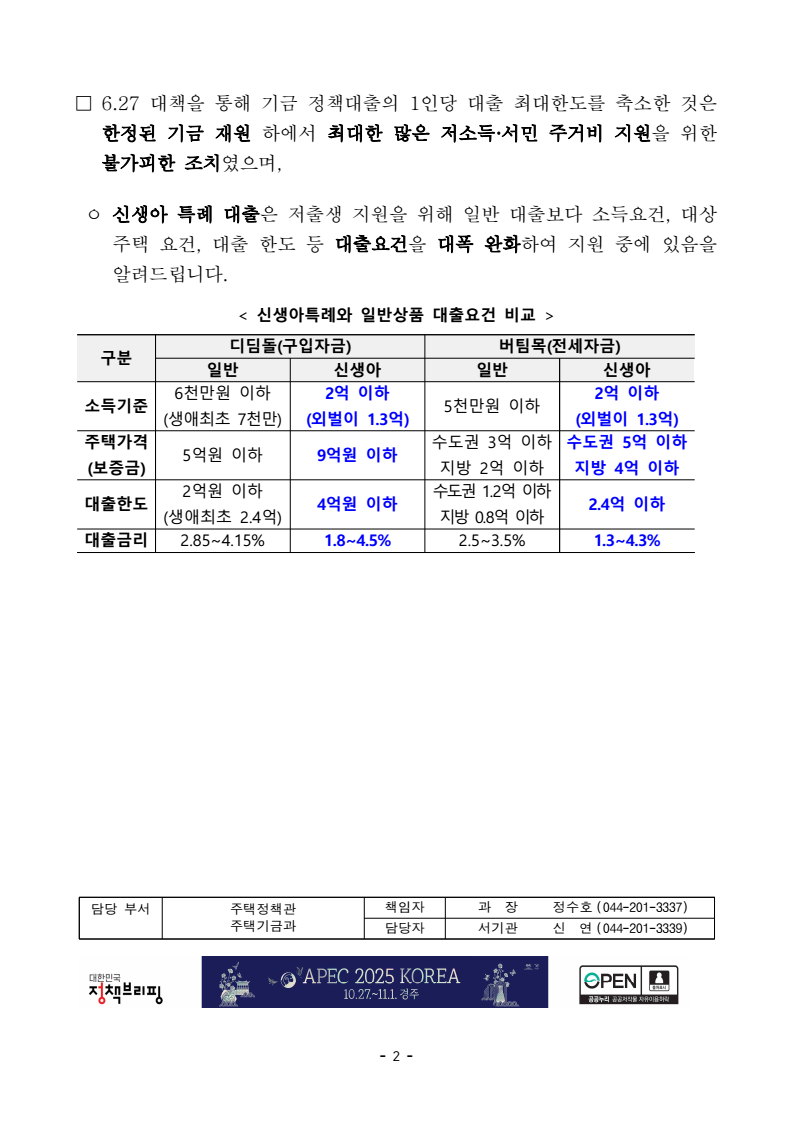 - 1 - 보도해명자료 보도시점 : 배포 즉시 보도 가능 / 배포 : 2025. 10. 27.(월) 신생아특례대출이 6.27대책 이후 급감하였다는 보도는 사실과 다릅니다. < 보도 내용 (동아일보, 10.27) > ◈ 신생아특례대출도 줄었다, 6.27 대책 석달만에 83% 급감 - 9월 대출 “승인건수”는 476건, 6월 승인건수(2,842건) 대비 83% 급감 - 6.27 대책에서 대출한도를 축소(최대 5억→4억)한 영향 □ 기사는 통계를 잘못 해석한 것으로, 신생아특례대출이 줄었다는 지적은 사실이 아닙니다. ㅇ 기사에서 인용한 수치는 9월 신생아특례 신청건수(디딤돌 4,588건) 중 10월 13일 기준, 최종 대출승인이 이루어진 대출건수(476건)를 단순 집계한 것으로, 이를 바탕으로 대출 실적이 줄었다고 볼 수는 없습니다. ㅇ 기금 대출은 신청기한(대출 실행일 30일(전세)~50일(구입) 이전) 제한이 있어 대출 신청부터 승인(통상 실행일 1~2주 전)~실행까지는 1~2개월의 시차가 있을 수 밖에 없습니다. ㅇ 따라서, 현재 시점에서 9월 대출신청건 중 대다수는 대출심사 중(승인 이전)에 있으므로, 승인 건수는 적게 집계될 수 밖에 없습니다. * 대출 신청 후 최소 2개월 내 대출 승인 건수가 최종 확정됨 □ 현재 신생아특례대출은 금년들어 월 0.9조~1조원 정도로 꾸준히 실행되고 있으며, 전년과 비교하더라도 약 16% 증가(‘24년 월평균 8,566억 → ’25년 월평균 9,994억)하여 실행되고 있습니다. < 신생아특례 대출 월별 실적 > 구분 ’25.1 ’25.2 ’25.3 ’25.4 ’25.5 ’25.6 ’25.7 ’25.8 ’25.9 실행건수 3,532 4,226 3,708 4,022 3,760 3,628 3,592 3,515 3,741 금액(억원) 9,150 11,275 9,562 10,568 10,005 9,808 9,653 9,776 10,152 - 2 - □ 6.27 대책을 통해 기금 정책대출의 1인당 대출 최대한도를 축소한 것은 한정된 기금 재원 하에서 최대한 많은 저소득·서민 주거비 지원을 위한 불가피한 조치였으며, ㅇ 신생아 특례 대출은 저출생 지원을 위해 일반 대출보다 소득요건, 대상주택 요건, 대출 한도 등 대출요건을 대폭 완화하여 지원 중에 있음을 알려드립니다. < 신생아특례와 일반상품 대출요건 비교 > 구분 디딤돌(구입자금) 버팀목(전세자금) 일반 신생아 일반 신생아 소득기준 6천만원 이하 (생애최초 7천만) 2억 이하 (외벌이 1.3억) 5천만원 이하 2억 이하 (외벌이 1.3억) 주택가격 (보증금) 5억원 이하 9억원 이하 수도권 3억 이하 지방 2억 이하 수도권 5억 이하지방 4억 이하대출한도 2억원 이하 (생애최초 2.4억) 4억원 이하 수도권 1.2억 이하 지방 0.8억 이하 2.4억 이하 대출금리 2.85~4.15% 1.8~4.5% 2.5~3.5% 1.3~4.3% 담당 부서 주택정책관 책임자 과 장 정수호 (044-201-3337) 주택기금과 담당자 서기관 신 연 (044-201-3339)