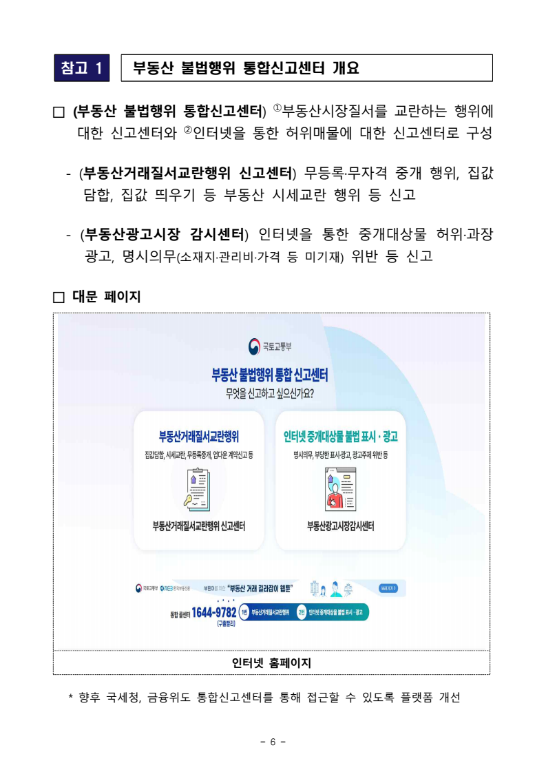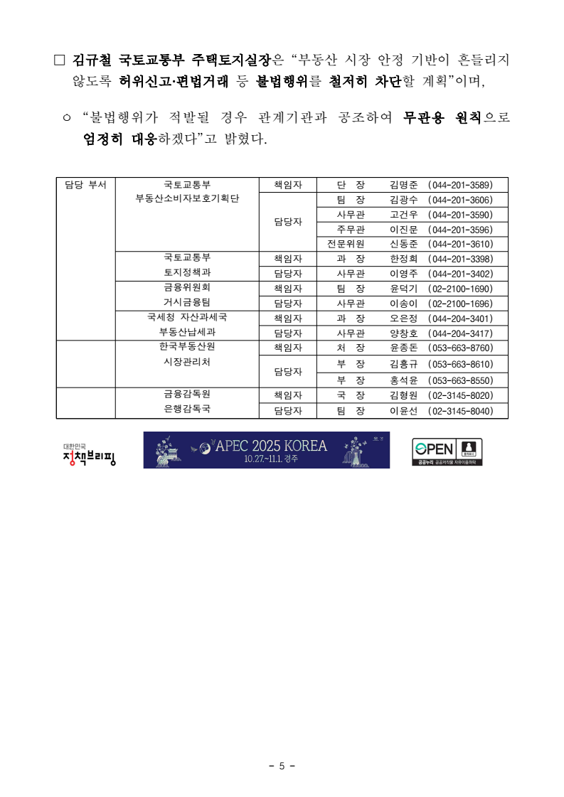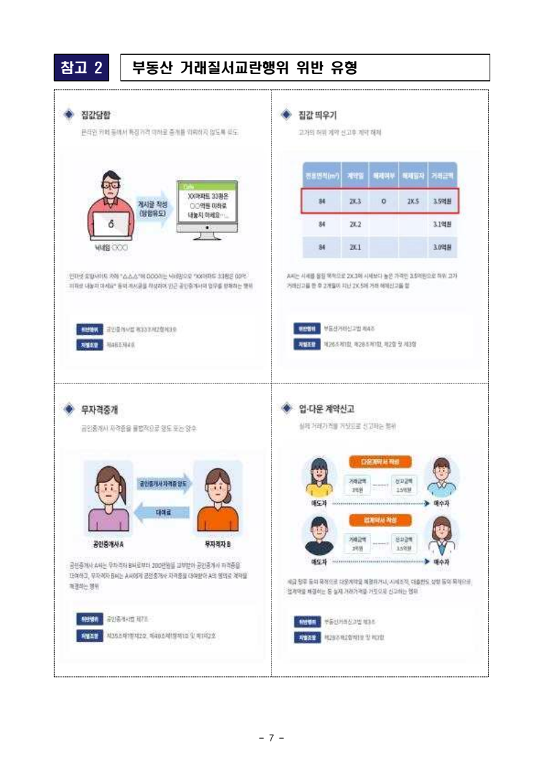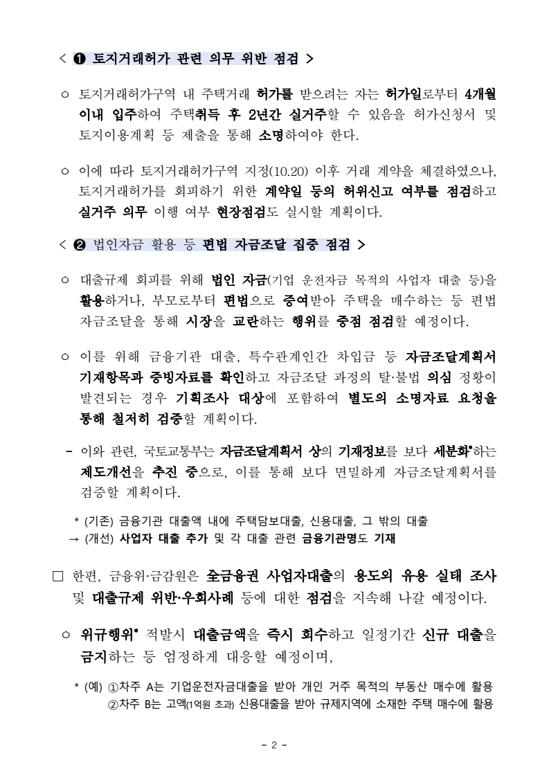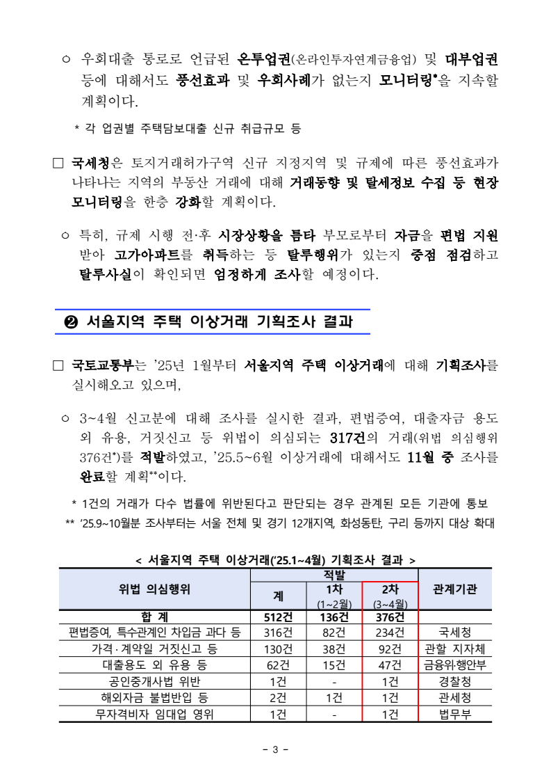 - 1 - 보도자료 보도시점 : 2025. 10. 26.(일) 11:00 이후(10. 27.(월) 조간) / 배포 : 2025. 10. 27.(월) 「주택시장 안정화 대책」 시행 관련 수도권 부동산 시장 교란행위 집중조사- 토지거래허가 관련 의무위반, 대출규정 위반, 편법증여 등 중점 점검- 서울지역 주택 이상거래(’25.3~4월) 기획조사 통해 위법의심 거래 317건 적발- 특수관계인 간 직거래(’24.1월~’25.2월) 기획조사 통해 위범의심 거래 264건 적발□ 국토교통부(장관 김윤덕)는 지난 10.15.(수) 발표한 「주택시장 안정화 대책」에 따라 서울 전역과 경기 12개 지역이 투기과열지구 및 토지거래허가구역으로 지정됨에 따라 부동산 불법행위를 집중 조사할 계획이라고 밝혔다. ㅇ 또한, ’25.3~4월 서울지역 주택 이상거래 기획조사를 통해 위법의심 거래 317건을 적발하고, ’24.1월~’25.2월 특수관계인 간 직거래 기획조사를 통해서는 위법의심 거래 264건을 적발하였다고 밝혔다. ❶ 서울·경기 등 부동산 시장 기획조사 확대 □ 국토교통부는 토지거래허가구역이 확대되고 대출규제 강화 등 시장 안정 대책이 본격적으로 실행됨에 따라, 토지거래허가 위반이나, 편법 대출· 증여 등 시장질서를 교란하는 이상거래가 확대될 우려에 대비하여ㅇ 현재 서울을 중심으로 실시 중인 부동산 기획조사 및 현장점검을 ’25.9~10월 부동산 거래 조사부터 서울 전체 및 경기 12개 지역과 규제지역 지정으로 풍선효과가 우려되는 화성동탄, 구리 등까지 대상을확대하여 추진할 계획이다. □ 국토교통부는 향후 기획조사 및 현장점검 확대를 통해 ➊토지거래허가 관련 의무 위반, ➋편법 자금조달 등을 중점 점검할 예정이다. - 2 - < ➊ 토지거래허가 관련 의무 위반 점검 > ㅇ 토지거래허가구역 내 주택거래 허가를 받으려는 자는 허가일로부터 4개월 이내 입주하여 주택취득 후 2년간 실거주할 수 있음을 허가신청서 및 토지이용계획 등 제출을 통해 소명하여야 한다. ㅇ 이에 따라 토지거래허가구역 지정(10.20) 이후 거래 계약을 체결하였으나, 토지거래허가를 회피하기 위한 계약일 등의 허위신고 여부를 점검하고 실거주 의무 이행 여부 현장점검도 실시할 계획이다. < ➋ 법인자금 활용 등 편법 자금조달 집중 점검 > ㅇ 대출규제 회피를 위해 법인 자금(기업 운전자금 목적의 사업자 대출 등)을 활용하거나, 부모로부터 편법으로 증여받아 주택을 매수하는 등 편법 자금조달을 통해 시장을 교란하는 행위를 중점 점검할 예정이다. ㅇ 이를 위해 금융기관 대출, 특수관계인간 차입금 등 자금조달계획서 기재항목과 증빙자료를 확인하고 자금조달 과정의 탈·불법 의심 정황이 발견되는 경우 기획조사 대상에 포함하여 별도의 소명자료 요청을 통해 철저히 검증할 계획이다. - 이와 관련, 국토교통부는 자금조달계획서 상의 기재정보를 보다 세분화*하는제도개선을 추진 중으로, 이를 통해 보다 면밀하게 자금조달계획서를 검증할 계획이다. * (기존) 금융기관 대출액 내에 주택담보대출, 신용대출, 그 밖의 대출 → (개선) 사업자 대출 추가 및 각 대출 관련 금융기관명도 기재 □ 한편, 금융위·금감원은 全금융권 사업자대출의 용도외 유용 실태 조사및 대출규제 위반·우회사례 등에 대한 점검을 지속해 나갈 예정이다. ㅇ 위규행위* 적발시 대출금액을 즉시 회수하고 일정기간 신규 대출을금지하는 등 엄정하게 대응할 예정이며, * (예) ①차주 A는 기업운전자금대출을 받아 개인 거주 목적의 부동산 매수에 활용②차주 B는 고액(1억원 초과) 신용대출을 받아 규제지역에 소재한 주택 매수에 활용 - 3 - ㅇ 우회대출 통로로 언급된 온투업권(온라인투자연계금융업) 및 대부업권등에 대해서도 풍선효과 및 우회사례가 없는지 모니터링*을 지속할 계획이다. * 각 업권별 주택담보대출 신규 취급규모 등 □ 국세청은 토지거래허가구역 신규 지정지역 및 규제에 따른 풍선효과가 나타나는 지역의 부동산 거래에 대해 거래동향 및 탈세정보 수집 등 현장 모니터링을 한층 강화할 계획이다. ㅇ 특히, 규제 시행 전·후 시장상황을 틈타 부모로부터 자금을 편법 지원받아 고가아파트를 취득하는 등 탈루행위가 있는지 중점 점검하고탈루사실이 확인되면 엄정하게 조사할 예정이다. ❷ 서울지역 주택 이상거래 기획조사 결과 □ 국토교통부는 ’25년 1월부터 서울지역 주택 이상거래에 대해 기획조사를 실시해오고 있으며, ㅇ 3~4월 신고분에 대해 조사를 실시한 결과, 편법증여, 대출자금 용도 외 유용, 거짓신고 등 위법이 의심되는 317건의 거래(위법 의심행위 376건*)를 적발하였고, ’25.5~6월 이상거래에 대해서도 11월 중 조사를 완료할 계획**이다. * 1건의 거래가 다수 법률에 위반된다고 판단되는 경우 관계된 모든 기관에 통보 ** ’25.9~10월분 조사부터는 서울 전체 및 경기 12개지역, 화성동탄, 구리 등까지 대상 확대< 서울지역 주택 이상거래(‘25.1~4월) 기획조사 결과 > 위법 의심행위 적발 관계기관계 1차 (1~2월) 2차 (3~4월) 합 계 512건 136건 376건 편법증여, 특수관계인 차입금 과다 등 316건 82건 234건 국세청가격 · 계약일 거짓신고 등 130건 38건 92건 관할 지자체대출용도 외 유용 등 62건 15건 47건 금융위·행안부