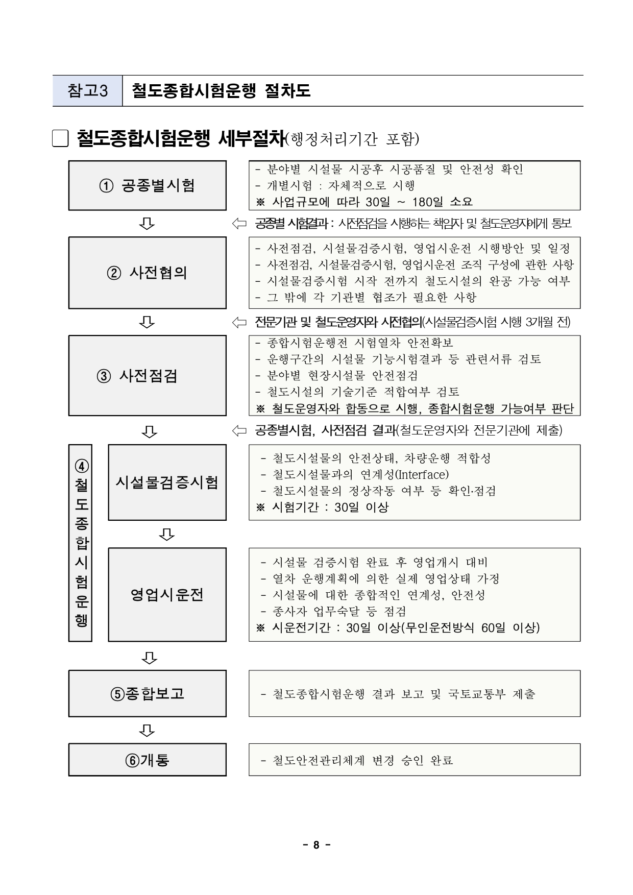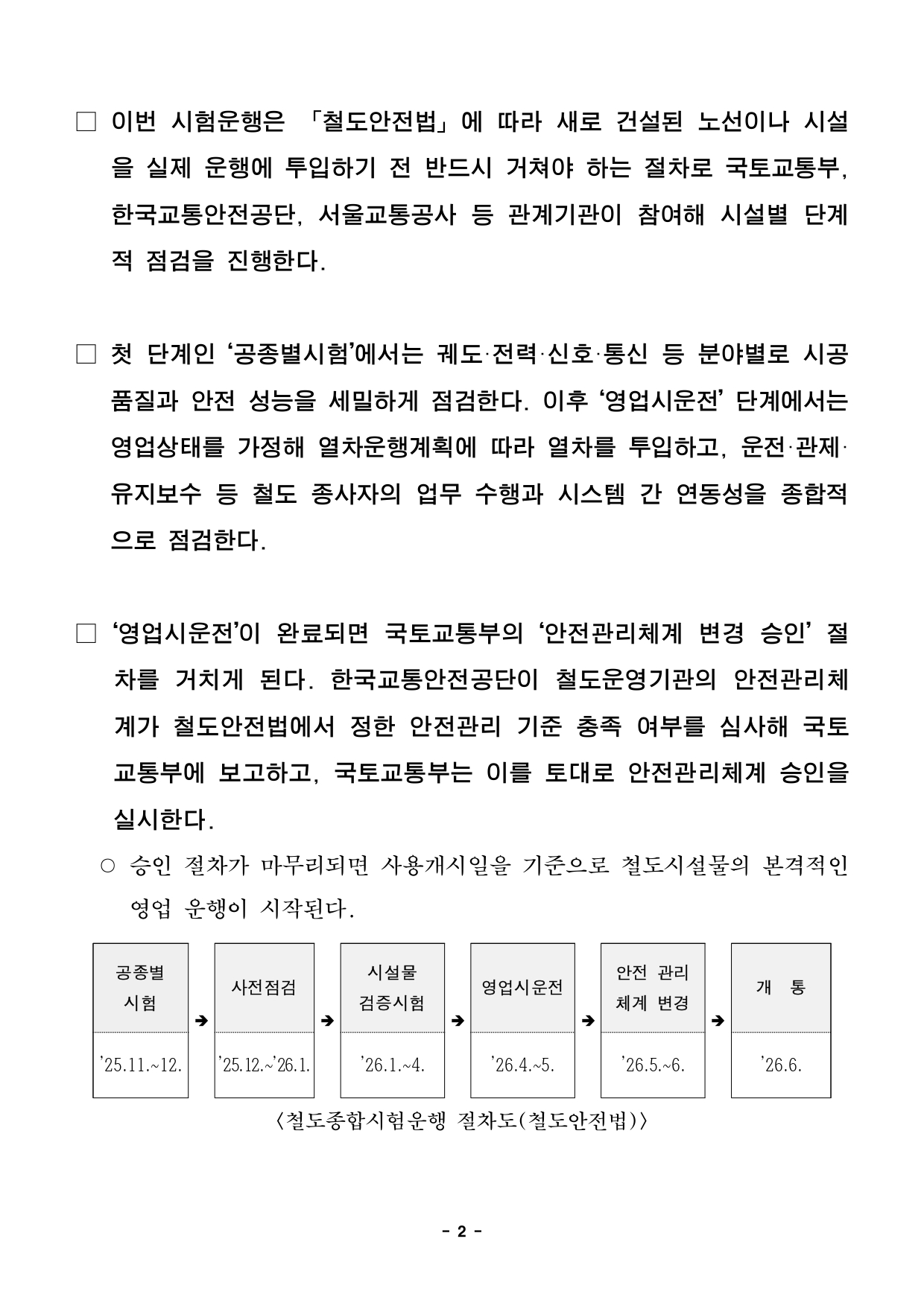 - 1 - 2025. 10. 29.(수) 조간용 이 보도자료는 2025년 10월 28일 오전 11:15부터 보도할 수 있습니다.보도자료담당 부서 : 도시기반시설본부 도시철도설비부 도시철도설비부장 배광희 02-6438-2708사진 없음 □ 사진 있음 ▣ 쪽수 : 8쪽 신호과장 오수년 02-6438-2770서울시, 2026년 6월 개통 목표로 진접차량기지 철도종합시험운행 개시- 시, 11월 1일부터 진접차량기지 안전성·운행체계 점검…철도종합시험운행 후 내년 6월개통예정- 최대 52대 수용, 유치선 36선, 종합관리동 등 설치, 철도시설 성능과 안전성을 종합적으로점검- 정비 효율을 높이고 운행 안정성 강화해 시민이 보다 안전하고 편리하게 이용할 수 있도록지원□ 서울시는 오는 11월 1일(토)부터 진접차량기지의 안전성과운행체계를 점검하는 철도종합시험운행에 들어간다. ○ 철도종합시험운행은 새로 건설된 철도시설의 성능과 안전성을 종합적으로점검하는 절차로, 시민이 안전하고 쾌적하게 지하철을 이용할 수있도록하기 위한 마지막 단계다. □ 진접차량기지는 2026년 6월 개통을 목표로, 최대 52대의차량을수용할 수 있는 경기도 남양주시 진접읍 금곡리 일원에 조성되는시설이다. 주요 시설로는 유치선 36선, 종합관리동, 검수고 등건축물14동과 전차선·송변전·신호설비 등이 있다. ○ 차량기지는 지하철 차량의 정비, 점검, 세척, 주박(대기) 등을 담당하는핵심 기반시설로, 열차의 안전운행을 책임지는 곳이다. - 2 - □ 이번 시험운행은 「철도안전법」에 따라 새로 건설된 노선이나시설을 실제 운행에 투입하기 전 반드시 거쳐야 하는 절차로 국토교통부, 한국교통안전공단, 서울교통공사 등 관계기관이 참여해 시설별단계적 점검을 진행한다. □ 첫 단계인 ‘공종별시험’에서는 궤도·전력·신호·통신 등 분야별로시공품질과 안전 성능을 세밀하게 점검한다. 이후 ‘영업시운전’ 단계에서는영업상태를 가정해 열차운행계획에 따라 열차를 투입하고, 운전·관제· 유지보수 등 철도 종사자의 업무 수행과 시스템 간 연동성을종합적으로 점검한다. □ ‘영업시운전’이 완료되면 국토교통부의 ‘안전관리체계 변경 승인’ 절차를 거치게 된다. 한국교통안전공단이 철도운영기관의 안전관리체계가 철도안전법에서 정한 안전관리 기준 충족 여부를 심사해국토교통부에 보고하고, 국토교통부는 이를 토대로 안전관리체계승인을실시한다. ○ 승인 절차가 마무리되면 사용개시일을 기준으로 철도시설물의 본격적인영업 운행이 시작된다. 공종별 시험 è 사전점검 è 시설물 검증시험 è 영업시운전 è 안전 관리 체계 변경 è 개 통’25.11.~12. ’25.12.~’26.1. ’26.1.~4. ’26.4.~5. ’26.5.~6. ’26.6. <철도종합시험운행 절차도(철도안전법)> - 3 - □ 진접차량기지가 운영되면 차량은 2022년 3월 개통된 진접선(4호선연장, 별내별가람~진접, 14.9㎞, 3개 역)의 진접역 또는 오남역을통해 차량기지로 출입하게 된다. □ 한편 시는 차량기지를 통해 수도권 북부 지역의 철도 운행 효율성을높이고, 안정적인 차량 정비·관리 체계를 구축해 시민이 보다안전하고 편리하게 지하철을 이용할 수 있도록 지원할 계획이다. □ 안대희 서울시 도시기반시설본부장은 “차량기지는 시민이 안전하고쾌적하게 이용할 수 있게 하는 철도 핵심 시설”이라며, “개통을위한철도종합시험운행을 철저히 수행해 내년 6월 안전한 개통이이루어지도록 최선을 다하겠다”라고 말했다. - 4 - 참고1 진접선(4호선연장) 차량기지 건설사업 개요 사업개요 ㅇ 위 치 : 남양주시 진접읍 금곡리 일원 / 서울시 노원구 상계동 일원 ㅇ 규 모 : 차량기지 197,400㎡, 입·출고선 4.9㎞ ㅇ 기 간 : ’18. 12.~ ’27. 6. ㅇ 총사업비 : 7,078억원(서울시 6,776억원) 전체노선 - 5 - 참고2 진접차량기지 전경 <차량기지 전경> <차량기지 전경> - 6 - <검수고> <종합관리동> - 7 - <유치선> <유치선> - 8 - 참고3 철도종합시험운행 절차도 철도종합시험운행 세부절차(행정처리기간 포함) ① 공종별시험 - 분야별 시설물 시공후 시공품질 및 안전성 확인 - 개별시험 : 자체적으로 시행 ※ 사업규모에 따라 30일 ~ 180일 소요 ⇩ ⇦ 공종별 시험결과 : 사전점검을 시행하는 책임자 및 철도운영자에게 통보② 사전협의 - 사전점검, 시설물검증시험, 영업시운전 시행방안 및 일정- 사전점검, 시설물검증시험, 영업시운전 조직 구성에 관한 사항- 시설물검증시험 시작 전까지 철도시설의 완공 가능 여부- 그 밖에 각 기관별 협조가 필요한 사항 ⇩ ⇦ 전문기관 및 철도운영자와 사전협의(시설물검증시험 시행 3개월 전) ③ 사전점검 - 종합시험운행전 시험열차 안전확보 - 운행구간의 시설물 기능시험결과 등 관련서류 검토 - 분야별 현장시설물 안전점검 - 철도시설의 기술기준 적합여부 검토 ※ 철도운영자와 합동으로 시행, 종합시험운행 가능여부 판단⇩ ⇦ 공종별시험, 사전점검 결과(철도운영자와 전문기관에 제출) ④ 철 도 종 합 시 험 운 행 시설물검증시험 - 철도시설물의 안전상태, 차량운행 적합성 - 철도시설물과의 연계성(Interface) - 철도시설물의 정상작동 여부 등 확인․점검 ※ 시험기간 : 30일 이상 ⇩ 영업시운전 - 시설물 검증시험 완료 후 영업개시 대비 - 