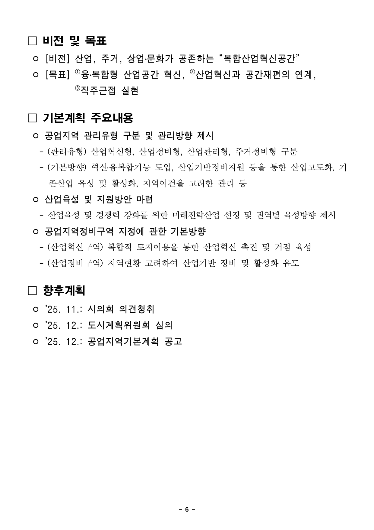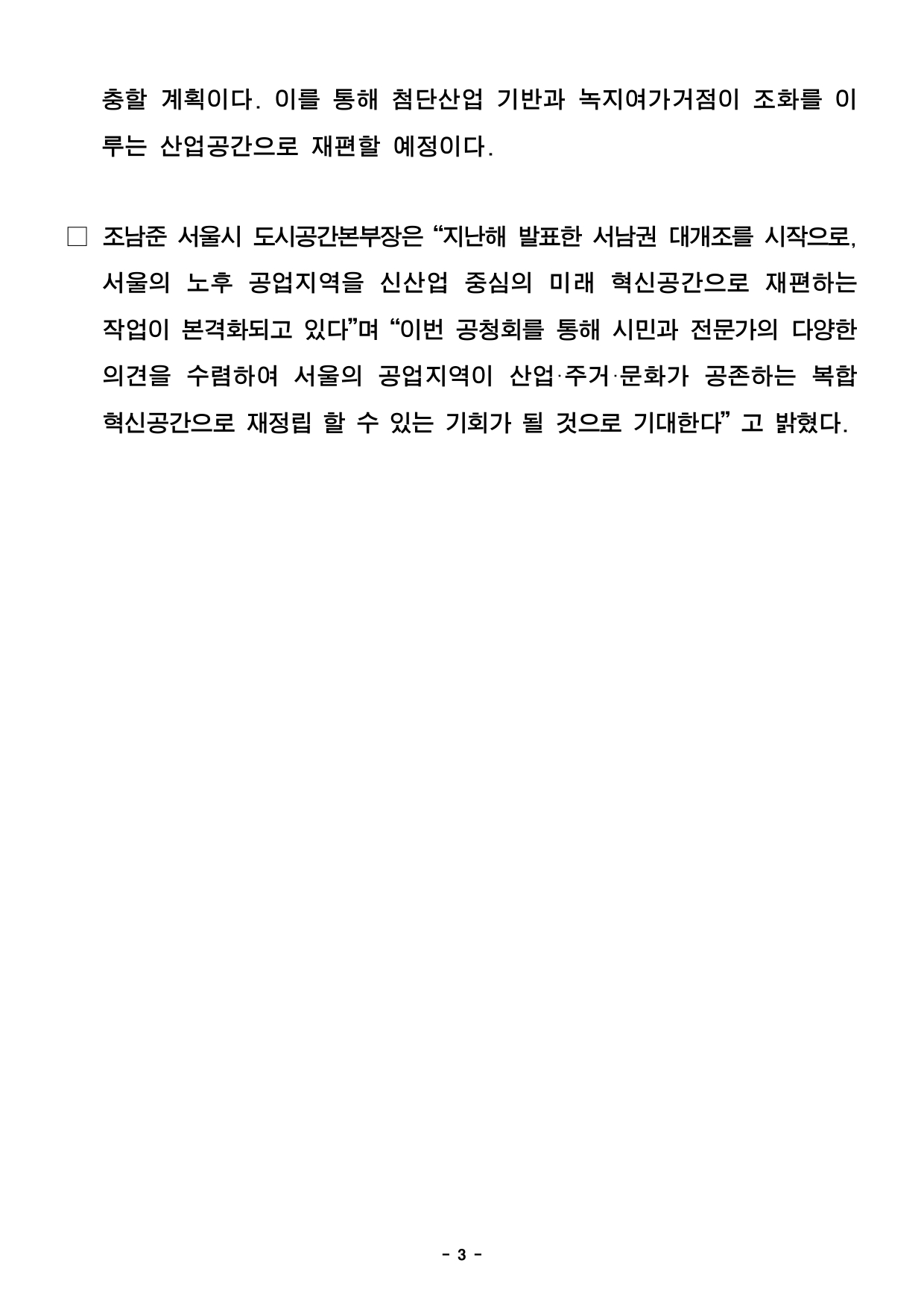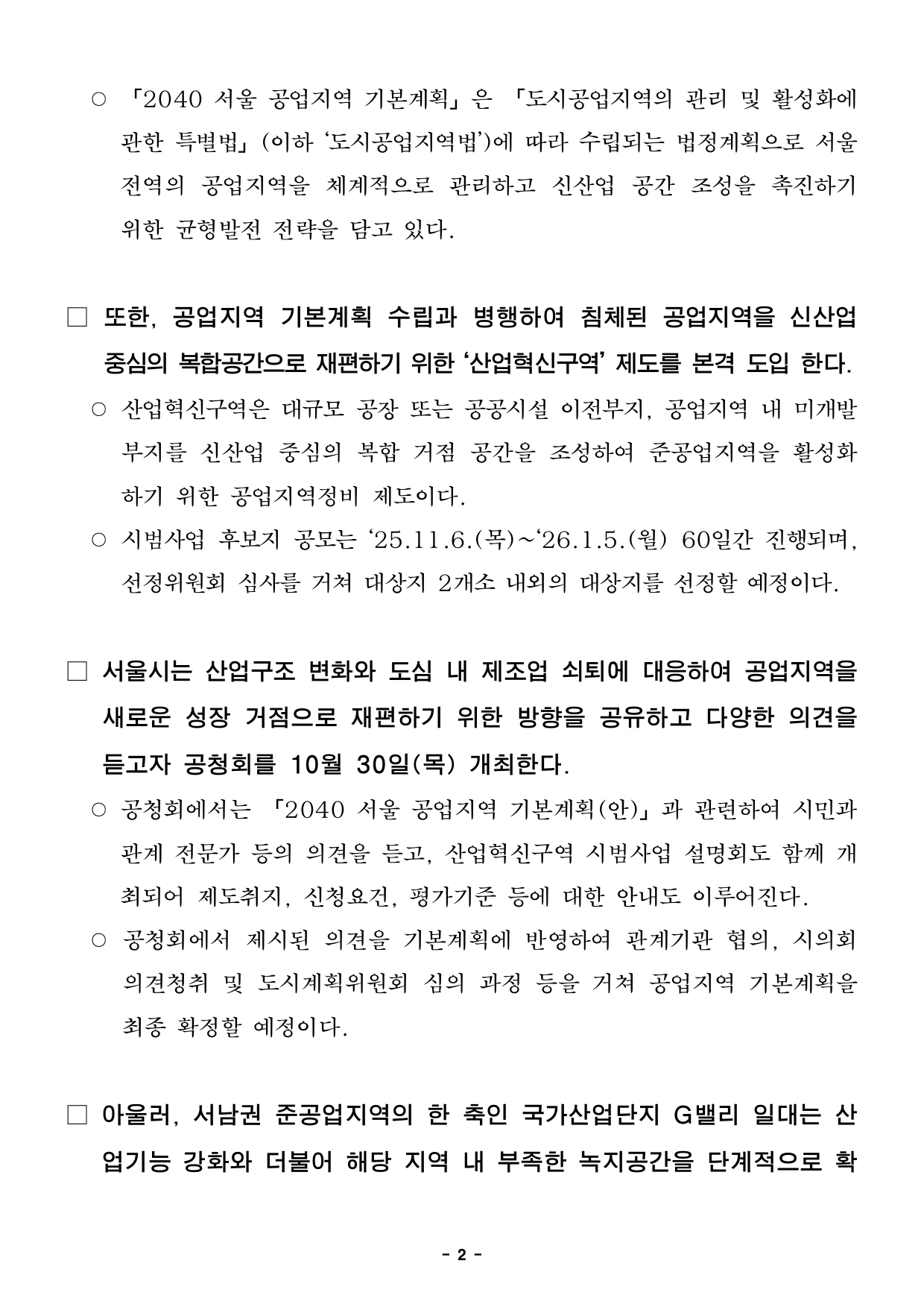 - 1 - 2025. 10. 28.(화) 석간용 이 보도자료는 2025년 10월 28일 오전 06:00부터 보도할 수 있습니다.보도자료담당 부서: 도시공간본부 도시계획과 도시계획과장 이광구 02-2133-8305 도시계획혁신팀장 서준원 02-2133-8326 사진 없음 ▣ 사진 있음 □ 쪽수: 6쪽 서울시, '서남권 대개조' 일환으로 공업지역 혁신전략 가동신산업 중심의 복합혁신공간으로 대전환 추진- 산업구조 고도화와 도시 환경 변화에 대응한 준공업지역 종합적 발전방향논의...공업지역을 신산업 중심의 복합혁신공간으로 전환하기 위한 전략제시- 신산업 중심의 복합 거점 공간 조성 기반 마련을 위한 산업혁신구역 선정공모추진- 서울시, 10월 30일(목) 오후 2시, 공청회 개최를 통해 시민과관계전문가 의견 수렴 후 「2040 서울 공업지역 기본계획」마련- 서남권 G밸리, 첨단산업과 녹지여가공간이 공존하는 산업거점으로 업그레이드□ 서울시는 지난해 「서남권 대개조」를 발표하며, 노후 공업지역이집중된서남권 준공업지역을 첨단산업 중심의 미래 첨단․융복합산업집적지로전환하고 새로운 성장거점으로 구축하겠다는 ‘준공업지역 혁신및산업혁신공간 종합전략’을 제시한 바 있다. □ 이에, 서울시는 공업지역을 산업·주거·문화가 공존하는 미래 신산업중심의복합혁신거점으로 전환하기 위해 공업지역 유형별 관리방향, 권역별미래전략산업, 공업지역정비구역 지정에 관한 기본 방향 등을담은「2040 서울 공업지역 기본계획(안)」을 마련했다. - 2 - ○ 「2040 서울 공업지역 기본계획」은 「도시공업지역의 관리 및 활성화에관한 특별법」(이하 ‘도시공업지역법’)에 따라 수립되는 법정계획으로서울전역의 공업지역을 체계적으로 관리하고 신산업 공간 조성을 촉진하기위한 균형발전 전략을 담고 있다. □ 또한, 공업지역 기본계획 수립과 병행하여 침체된 공업지역을신산업중심의 복합공간으로 재편하기 위한 ‘산업혁신구역’ 제도를 본격 도입한다. ○ 산업혁신구역은 대규모 공장 또는 공공시설 이전부지, 공업지역 내미개발부지를 신산업 중심의 복합 거점 공간을 조성하여 준공업지역을활성화하기 위한 공업지역정비 제도이다. ○ 시범사업 후보지 공모는 ‘25.11.6.(목)~‘26.1.5.(월) 60일간 진행되며, 선정위원회 심사를 거쳐 대상지 2개소 내외의 대상지를 선정할 예정이다. □ 서울시는 산업구조 변화와 도심 내 제조업 쇠퇴에 대응하여 공업지역을새로운 성장 거점으로 재편하기 위한 방향을 공유하고 다양한의견을듣고자 공청회를 10월 30일(목) 개최한다. ○ 공청회에서는 「2040 서울 공업지역 기본계획(안)」과 관련하여시민과관계 전문가 등의 의견을 듣고, 산업혁신구역 시범사업 설명회도함께개최되어 제도취지, 신청요건, 평가기준 등에 대한 안내도 이루어진다. ○ 공청회에서 제시된 의견을 기본계획에 반영하여 관계기관 협의, 시의회의견청취 및 도시계획위원회 심의 과정 등을 거쳐 공업지역 기본계획을최종 확정할 예정이다. □ 아울러, 서남권 준공업지역의 한 축인 국가산업단지 G밸리 일대는산업기능 강화와 더불어 해당 지역 내 부족한 녹지공간을 단계적으로확 - 3 - 충할 계획이다. 이를 통해 첨단산업 기반과 녹지여가거점이 조화를이루는 산업공간으로 재편할 예정이다. □ 조남준 서울시 도시공간본부장은 “지난해 발표한 서남권 대개조를시작으로,서울의 노후 공업지역을 신산업 중심의 미래 혁신공간으로 재편하는작업이 본격화되고 있다”며 “이번 공청회를 통해 시민과 전문가의다양한의견을 수렴하여 서울의 공업지역이 산업·주거·문화가 공존하는복합혁신공간으로 재정립 할 수 있는 기회가 될 것으로 기대한다” 고밝혔다. - 4 - 붙 임 1 「2040 서울 공업지역 기본계획」 공청회 포스터 - 5 - 붙 임 2 「2040 서울 공업지역 기본계획」 주요내용 □ 추진배경 ㅇ「도시 공업지역의 관리 및 활성화에 관한 특별법」(이하 도시공업지역법) 제정(’21.1) 및 시행(’22.1)에 따라 ‘공업지역기본계획’ 수립 의무화 ㅇ 공업지역의 계획적 개발과 체계적 관리를 위한 기본방향 수립 □ 현황 및 특성 ㅇ (대상) 서울시 공업지역 19.97㎢ 중 산업단지 4개소(3.21㎢)를 제외한 16.76㎢구 분 계 영등포구 구로구 금천구 양천구 강서구 성동구 도봉구 강동구 비고준공업지역 19.97 5.02 4.20 4.12 0.09 2.92 2.05 1.49 0.08 - 산업단지 외 16.76 5.02 3.65 2.65 0.09 1.81 2.05 1.49 - - 산업단지 내 3.21 - 0.55 1.48 - 1.11 - - 0.08 - * (도시공업지역) 산업단지 등 다른 법령에 따라 관리되는 공업지역을 제외한 순수 공업지역(도시공업지역법 제2조) ᄋ [특성] 건축물 노후화 가속 및 공원 등 기반시설 부족, 상대적으로 대규모 부지 다수 입지 - 6 - □ 비전 및 목표 ᄋ [비전] 산업, 주거, 상업․문화가 공존하는 “복합산업혁신공간” ᄋ [목표] ①융․복합형 산업공간 혁신, ②산업혁신과 공간재편의 연계, ③직주근접 실현 □ 기본계획 주요내용 ᄋ 공업지역 관리유형 구분 및 관리방향 제시 - (관리유형) 산업혁신형, 산업정비형, 산업관리형, 주거정비형 구분 - (기본방향) 혁신․융복합기능 도입, 산업기반정비지원 등을 통한 산업고도화, 기존산업 육성 및 활성화, 지역여건