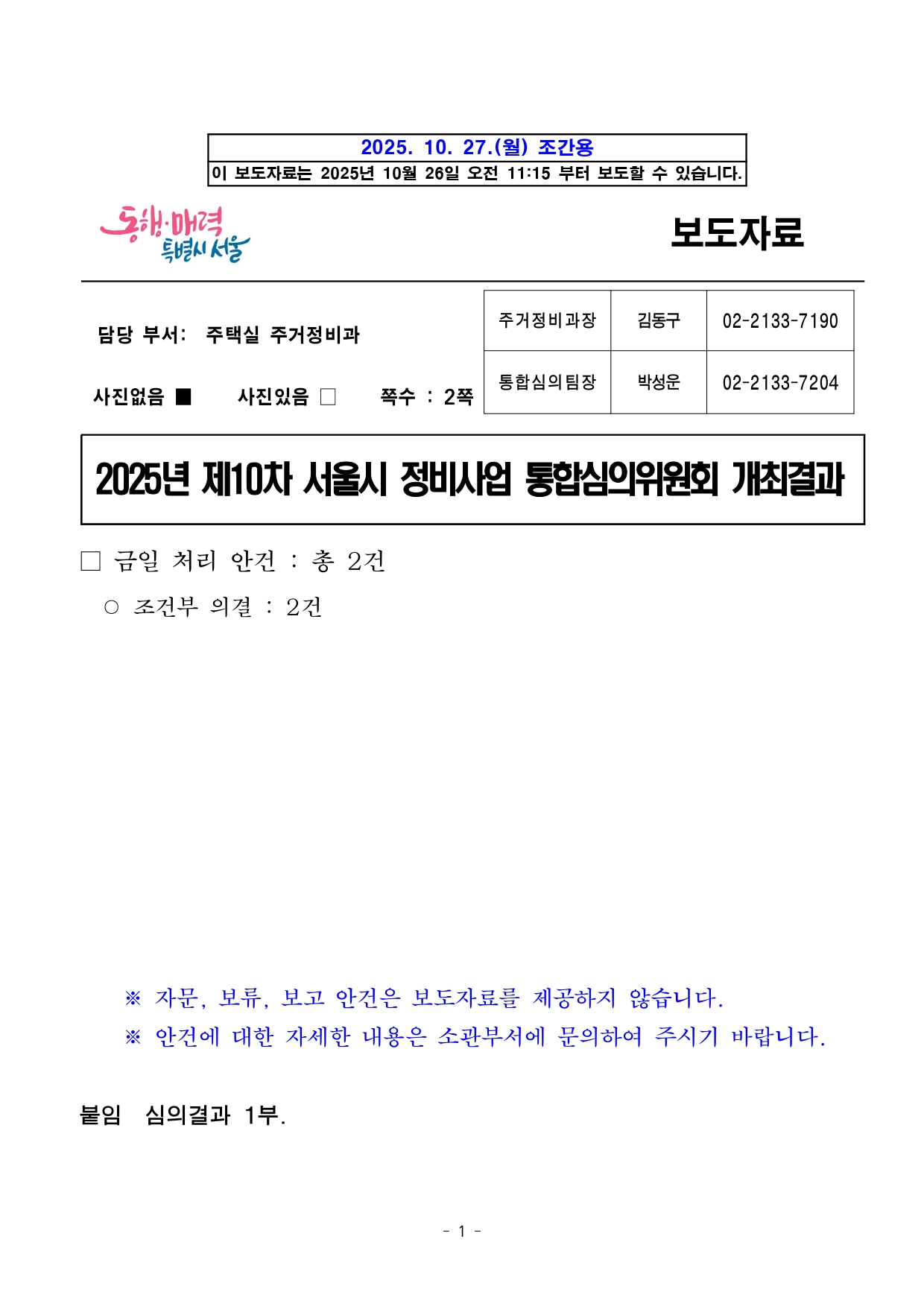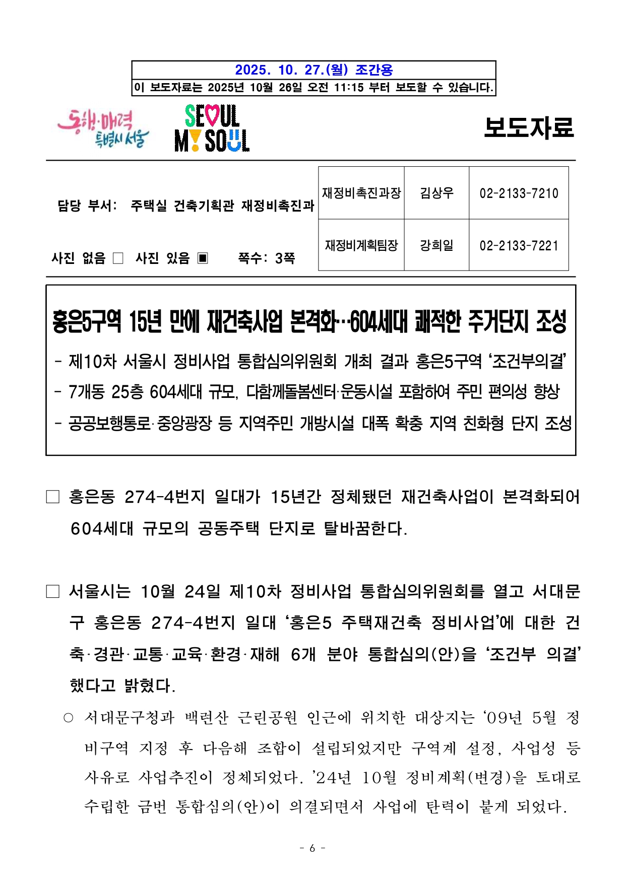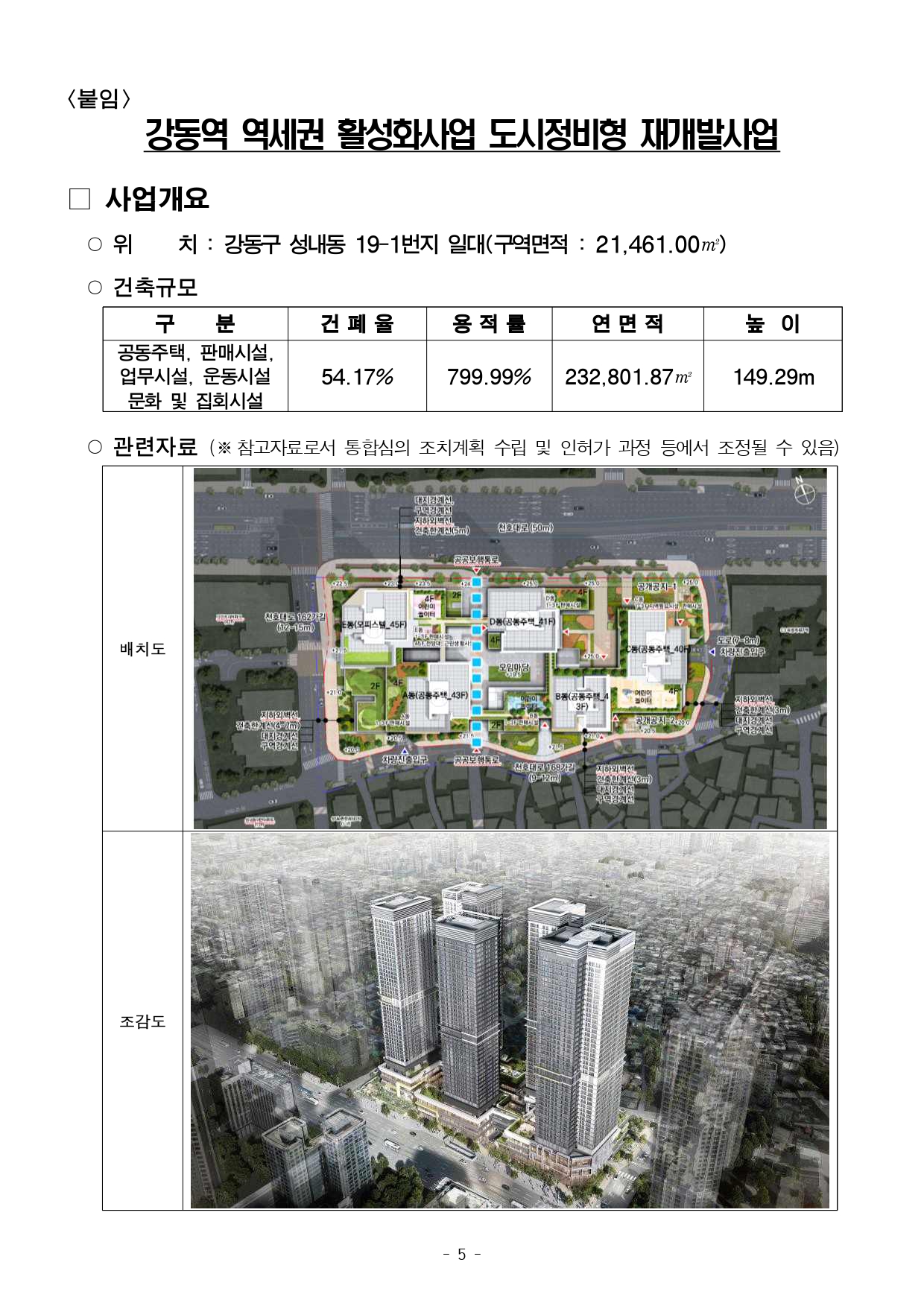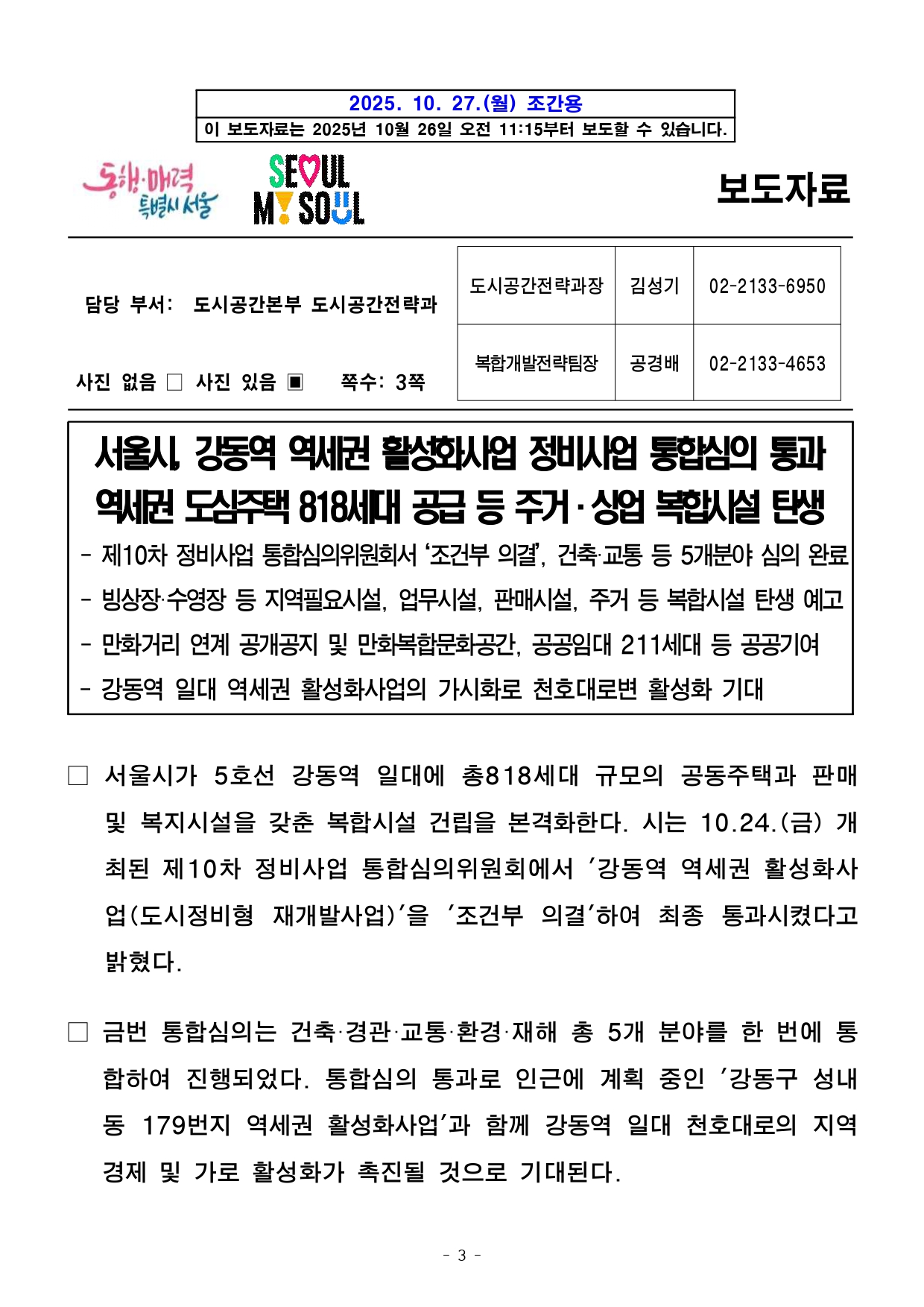 - 1 - 2025. 10. 27.(월) 조간용 이 보도자료는 2025년 10월 26일 오전 11:15 부터 보도할 수 있습니다. 보도자료담당 부서: 주택실 주거정비과 주거정비과장 김동구 02-2133-7190통합심의팀장 박성운 02-2133-7204사진없음 ■ 사진있음 □ 쪽수 : 2쪽 2025년 제10차 서울시 정비사업 통합심의위원회 개최결과□ 금일 처리 안건 : 총 2건 ○ 조건부 의결 : 2건 ※ 자문, 보류, 보고 안건은 보도자료를 제공하지 않습니다. ※ 안건에 대한 자세한 내용은 소관부서에 문의하여 주시기 바랍니다. 붙임 심의결과 1부. - 2 - 제10차 정비사업 통합심의위원회 개최결과【 2025. 10. 24. (금) 14:00】 ▣ 총 2건 (조건부 의결 2) 연 번 안 건 명 안 건 개 요 심의결과 비고1 <심의-신규> 강동역 역세권활성화사업 도시정비형 재개발사업 ○ 위 치 : 강동구 성내동 19-1번지 일원(21,461.0㎡) ○ 지역지구 : 일반상업지역, 천호지구 지구단위계획구역(C3 특별계획구역) ○ 내 용 : 건축+경관+교통+환경+재해 통합심의 조 건 부 의 결 <도시공간전략과> 복합개발전략팀팀장 : 공경배담당 : 양영지(2133-4655) 2 <심의-신규> 홍은5 주택재건축 정비사업 ○ 위 치 : 서대문구 홍은동 274-4 일대(34,817.0㎡) ○ 지역지구 : 제2종일반주거지역 ○ 내 용 : 건축+경관+교통+교육+환경+재해 통합심의 조 건 부 의 결 <재정비촉진과> 재정비계획팀팀장 : 강희일담당 : 이영선(2133-7213) - 3 - 2025. 10. 27.(월) 조간용 이 보도자료는 2025년 10월 26일 오전 11:15부터 보도할 수 있습니다. 보도자료담당 부서: 도시공간본부 도시공간전략과 도시공간전략과장 김성기 02-2133-6950 복합개발전략팀장 공경배 02-2133-4653 사진 없음 □ 사진 있음 ▣ 쪽수: 3쪽 서울시, 강동역 역세권 활성화사업 정비사업 통합심의 통과역세권 도심주택 818세대 공급 등 주거·상업 복합시설 탄생- 제10차 정비사업 통합심의위원회서 ‘조건부 의결’, 건축·교통 등 5개분야심의완료- 빙상장·수영장 등 지역필요시설, 업무시설, 판매시설, 주거 등 복합시설탄생예고- 만화거리 연계 공개공지 및 만화복합문화공간, 공공임대 211세대 등 공공기여- 강동역 일대 역세권 활성화사업의 가시화로 천호대로변 활성화 기대□ 서울시가 5호선 강동역 일대에 총818세대 규모의 공동주택과판매및 복지시설을 갖춘 복합시설 건립을 본격화한다. 시는 10.24.(금) 개최된 제10차 정비사업 통합심의위원회에서 '강동역 역세권 활성화사업(도시정비형 재개발사업)'을 '조건부 의결'하여 최종 통과시켰다고밝혔다. □ 금번 통합심의는 건축·경관·교통·환경·재해 총 5개 분야를 한번에통합하여 진행되었다. 통합심의 통과로 인근에 계획 중인 '강동구성내동 179번지 역세권 활성화사업'과 함께 강동역 일대 천호대로의지역경제 및 가로 활성화가 촉진될 것으로 기대된다. - 4 - □ 강동구 성내동 19-1번지 일대(21,461.00㎡)에 추진되는 이번사업은,종로·강남·고덕 등 주요 업무지구를 대중교통으로 연결하는 배후주거지로써 총 818세대의 '역세권 도심 공동주택'을 공급한다. 특히, 공급세대 중 211세대는 미리내집 등 공공임대주택으로 계획되어입지가뛰어난 공공임대 주택이 확보될 예정이다. ○ 건축 규모는 건폐율 54.17%, 용적률 799.99%가 적용되며, 연면적232,801.87㎡, 높이 149.29m로 공동주택, 판매시설, 업무시설,운동시설, 문화 및 집회시설 등이 복합 개발된다. □ 특히, 주민편의를 위한 공공시설 도입도 눈에 띈다. 강동구 일대에동계체육시설인 빙상장 및 실내 수영장, 문화센터 등 지역에서 요구되는공공시설이 건립되어 지역 주민들의 문화 편의와 체육·여가활동의여건이크게 향상될 것으로 기대된다. ○ 지하2층부터 지상3층에 걸쳐 판매시설(34,190.06㎡)이 계획되어천호대로 유동인구 유입을 유도하고 상업 기능을 활성화할 전망이다.만화거리 등 인근 명소와 연계한 공개공지 및 만화복합문화공간도조성되어 지역 정체성을 살린 도심 휴게공간을 제공할 계획이다. ○ 금번 통합심의에서는 유사시 주민의 안전한 피난 대피를 위해내화기준을 추가 검토 주문하였다. □ 서울시 관계자는 "이번 통합심의를 통해 강동역 일대는 지역 상권이활성화됨과 동시에 정주 및 보행 환경이 향상되고, 천호‧성내 생활권의지역중심지로 거듭나 천호대로변의 경쟁력을 강화할 것으로 기대한다"고밝혔다. - 5 - <붙임> 강동역 역세권 활성화사업 도시정비형 재개발사업□ 사업개요 ○ 위 치 : 강동구 성내동 19-1번지 일대(구역면적 : 21,461.00㎡) ○ 건축규모 구 분 건 폐 율 용 적 률 연 면 적 높 이공동주택, 판매시설, 업무시설, 운동시설 문화 및 집회시설 54.17% 799.99% 232,801.87㎡ 149.29m○ 관련자료 (※참고자료로서 통합심의 조치계획 수립 및 인허가 과정 등에서 조정될 수 있음) 배치도 조감도 - 6 - 2025. 10. 27.(월) 조간용 이 보도자료는 2025년 10월 26일 오전 11:15 부터 보도할 수 있습니다. 보도자료담당 부서: 주택실 건축기획관 재정비촉진과 재정비촉진과장 김상우 02-2133-7210 재정비계획팀장 강희일 02-2133-7221 사진 없음 □ 사진 있음 ▣ 쪽수: 3쪽 홍은5구역 15년 만에 재건축사업 본격화…604세대 쾌적한 주거단지 조성- 제10차 서울시 정비사업 통합심의위원회 개최 결과 홍은5구역 ‘조건
