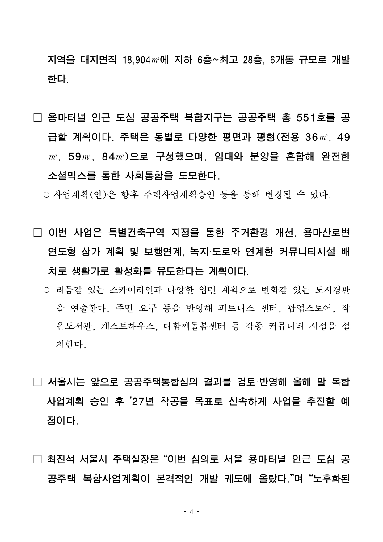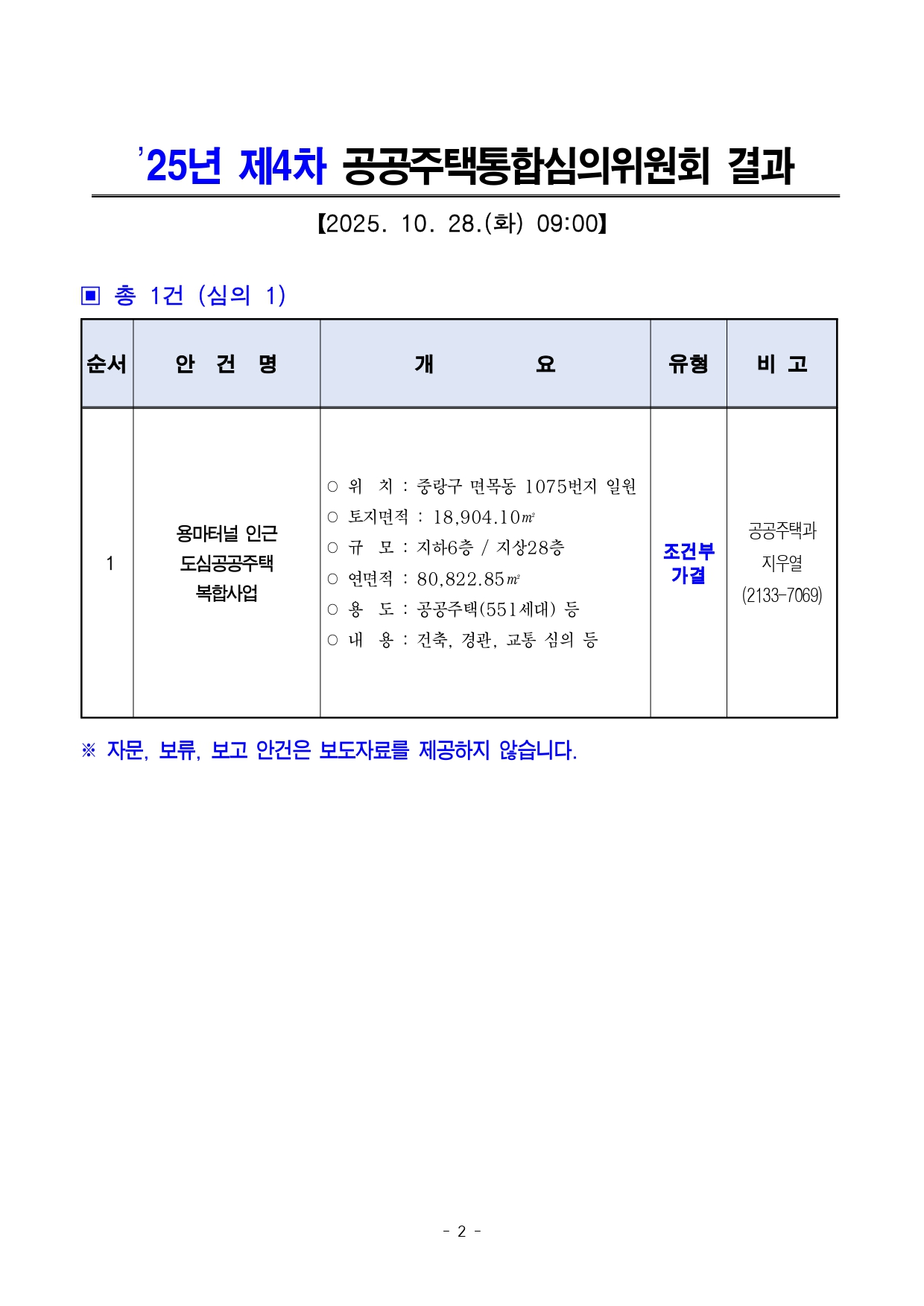 - 1 - 2025. 10. 29.(수) 석간용 이 보도자료는 2025년 10월 29일 오전 10:00부터 보도할 수 있습니다. 보도자료담당부서 : 주택정책실 공공주택과 공공주택정책과장 하대근 2133-7050공공주택사업팀장 윤진석 2133-7067사진없음 ▣ 사진있음 □ 쪽수 : 2쪽 2025년 제4차 공공주택통합심의위원회 개최결과□ 금일 처리 안건 : 총 1건 ○ 심 의 : 1건 (조건부가결 1건) ※ 안건에 대한 자세한 내용은 붙임 소관팀에 문의하여 주시기 바랍니다. 붙임 : 심의결과 1부 - 2 - ’25년 제4차 공공주택통합심의위원회 결과【2025. 10. 28.(화) 09:00】 ▣ 총 1건 (심의 1) 순서 안 건 명 개 요 유형 비고1 용마터널 인근 도심공공주택 복합사업 ○ 위 치 : 중랑구 면목동 1075번지 일원 ○ 토지면적 : 18,904.10㎡ ○ 규 모 : 지하6층 / 지상28층 ○ 연면적 : 80,822.85㎡ ○ 용 도 : 공공주택(551세대) 등 ○ 내 용 : 건축, 경관, 교통 심의 등 조건부 가결 공공주택과지우열(2133-7069) ※ 자문, 보류, 보고 안건은 보도자료를 제공하지 않습니다. - 3 - 2025. 10. 29.(수) 석간용 이 보도자료는 2025년 10월 29일 오전 10:00부터 보도할 수 있습니다. 보도자료담당 부서: 주택실 공공주택과 공공주택과장 하대근 2133-7050도심공공주택복합 팀장 신종현 2133-7056사진 없음 □ 사진 있음 ▣ 쪽수: 3쪽 관련 누리집 (메뉴) 용마터널 인근 공공주택 총 551세대 공급…도심 공공주택 복합사업 본궤도- 10.28. 공공주택 통합심의, 용마터널 인근 도심 공공주택 복합사업계획(안) 가결- 동북권에 공공주택 551호…임대·분양 혼합해 소셜믹스 실현 - ’25년 말 복합사업계획 승인 후 ’27년 착공 목표 노후 저층주거지 획기적개선□ 중랑구 용마터널 인근에 공공주택 총 551호가 공급되며 노후화된저층주거지의 환경이 획기적으로 개선될 전망이다. □ 서울시는 10월 28일 열린 제4차 공공주택통합심의위원회에서중랑구 면목동 1075번지 일원의 「서울 용마터널 인근 도심 공공주택복합사업계획(안)」을 ‘조건부가결’ 처리했다고 밝혔다. □ 대상지는 공동주택 및 학교로 둘러싸인 노후화된 저층주거지로주거환경 개선이 시급한 지역이었다. 서울시는 특별건축구역 지정을통해이 - 4 - 지역을 대지면적 18,904㎡에 지하 6층~최고 28층, 6개동 규모로개발한다. □ 용마터널 인근 도심 공공주택 복합지구는 공공주택 총 551호를공급할 계획이다. 주택은 동별로 다양한 평면과 평형(전용 36㎡, 49㎡, 59㎡, 84㎡)으로 구성했으며, 임대와 분양을 혼합해완전한소셜믹스를 통한 사회통합을 도모한다. ○ 사업계획(안)은 향후 주택사업계획승인 등을 통해 변경될 수 있다. □ 이번 사업은 특별건축구역 지정을 통한 주거환경 개선, 용마산로변연도형 상가 계획 및 보행연계, 녹지·도로와 연계한 커뮤니티시설배치로 생활가로 활성화를 유도한다는 계획이다. ○ 리듬감 있는 스카이라인과 다양한 입면 계획으로 변화감 있는 도시경관을 연출한다. 주민 요구 등을 반영해 피트니스 센터, 팝업스토어, 작은도서관, 게스트하우스, 다함께돌봄센터 등 각종 커뮤니티 시설을설치한다. □ 서울시는 앞으로 공공주택통합심의 결과를 검토·반영해 올해 말복합사업계획 승인 후 ’27년 착공을 목표로 신속하게 사업을 추진할예정이다. □ 최진석 서울시 주택실장은 “이번 심의로 서울 용마터널 인근 도심공공주택 복합사업계획이 본격적인 개발 궤도에 올랐다.”며 “노후화된 - 5 - 저층 주거지의 개발밀도를 확보하고 주변 지역과 어우러질 수있는개발과 도심지 활성화에 기여할 것으로 기대한다.”고 말했다. - 6 - <첨부1> 위치도 및 조감도 - 7 - □ 위치도 □ 투시도 □ 조감도