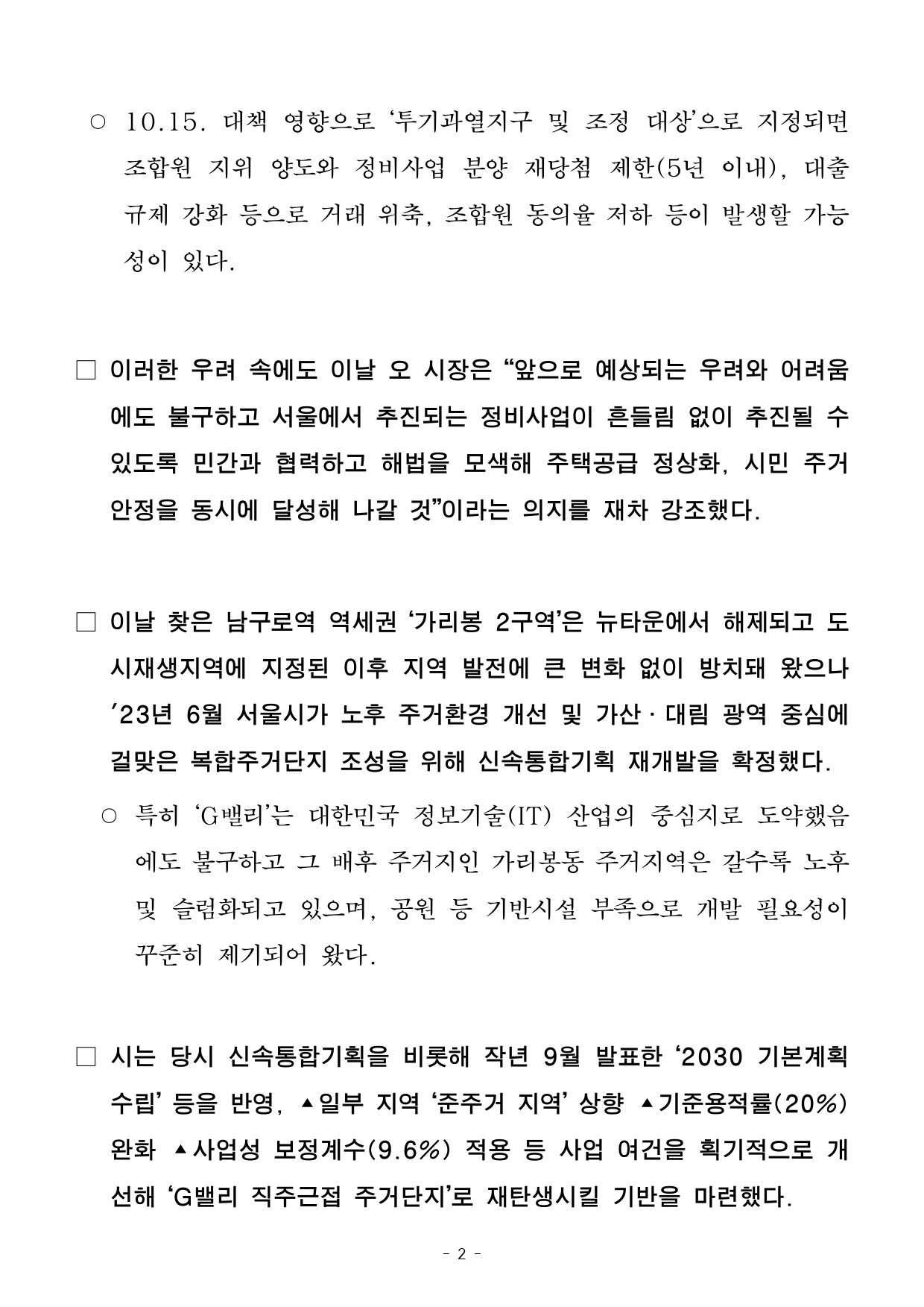 - 1 - □ 지난 '23년 6월, 재개발 신속통합기획 확정 이후 이번 달 1일(수)추진위원회 구성을 승인받고 조합설립을 준비 중인 ‘가리봉 2구역’이10.15. 정부 부동산 대책으로 인해 사업 추진에 어려움이 예상되는가운데 오세훈 서울시장이 현장을 찾았다. □ 오 시장은 28일(화) 오후 2시 구로공단 배후지로 '14년 뉴타운지구 해제 이후 사업을 전환, 신속통합기획 재개발이 추진되고있는가리봉동 87-177 일대(가리봉 2구역)를 찾아 현장을 점검하고주민을 만나 지역 현안과 애로사항을 청취했다. 2025. 10. 29.(수) 조간용 이 보도자료는 2025년 10월 28일 오후 14:00부터 보도할 수 있습니다. 보도자료 담당부서 : 주택실 주거정비과 주거정비과장 김동구 2133-7190 주거정비정책팀장 김지호 2133-7205 갈등공정관리팀장 현승주 2133-7196 사진없음 □ 사진있음 ▣ 쪽수 : 6쪽 오 시장, 가리봉2 현장의견 청취…"정비사업 우려 않도록 흔들림 없이 추진"- 10.15. 정부 발표 우려 속 ‘신속통합기획 재개발’ 추진 중인 가리봉 2구역주민간담회- ▴일부지역 준주거 상향 ▴기준용적률 완화 ▴사업성 보정계수 등 사업여건획기적개선- ‘신속통합기획2.0’으로 사업가속 기대… 시, 과감한 제도혁신‧현장소통으로공급정상화- 오 시장 “현장 목소리 듣고 정부에도 확실히 전할 것… 공급 끌어올려 주택시장안정화” - 2 - ○ 10.15. 대책 영향으로 ‘투기과열지구 및 조정 대상’으로 지정되면조합원 지위 양도와 정비사업 분양 재당첨 제한(5년 이내), 대출규제 강화 등으로 거래 위축, 조합원 동의율 저하 등이 발생할가능성이 있다. □ 이러한 우려 속에도 이날 오 시장은 “앞으로 예상되는 우려와어려움에도 불구하고 서울에서 추진되는 정비사업이 흔들림 없이 추진될수있도록 민간과 협력하고 해법을 모색해 주택공급 정상화, 시민주거안정을 동시에 달성해 나갈 것”이라는 의지를 재차 강조했다. □ 이날 찾은 남구로역 역세권 ‘가리봉 2구역’은 뉴타운에서 해제되고도시재생지역에 지정된 이후 지역 발전에 큰 변화 없이 방치돼왔으나'23년 6월 서울시가 노후 주거환경 개선 및 가산․대림 광역중심에걸맞은 복합주거단지 조성을 위해 신속통합기획 재개발을 확정했다. ○ 특히 ‘G밸리’는 대한민국 정보기술(IT) 산업의 중심지로 도약했음에도 불구하고 그 배후 주거지인 가리봉동 주거지역은 갈수록노후및 슬럼화되고 있으며, 공원 등 기반시설 부족으로 개발 필요성이꾸준히 제기되어 왔다. □ 시는 당시 신속통합기획을 비롯해 작년 9월 발표한 ‘2030 기본계획수립’ 등을 반영, ▴일부 지역 ‘준주거 지역’ 상향 ▴기준용적률(20%)완화 ▴사업성 보정계수(9.6%) 적용 등 사업 여건을 획기적으로개선해 ‘G밸리 직주근접 주거단지’로 재탄생시킬 기반을 마련했다. - 3 - ○ 가리봉 2구역은 가리봉 도시재생활성화지역 중 처음으로재개발전환된 구역으로 ‘신속통합기획 가이드라인’에 맞춰 정비계획을수립하고 작년 9월에는 도시계획위원회 심의를 거쳐 올 3월정비구역 지정고시하는 등 사업이 순조롭게 추진되고 있다. □ 서울시는 지난 7월 발표한 ‘주택공급 촉진 방안’에 이어 인․허가규제 혁신을 통해 정비사업 기간을 기존 18.5년→ 12년으로 단축하는‘신속통합기획 2.0’을 추진 중이다. 가리봉 2구역은 이 기준을적용받아 사업 추진에 한층 속도가 붙을 것으로 기대된다. ○ 이러한 목표 달성을 위해 시는 공정촉진회의를 열고 세밀하게공정을 관리해 나가는 한편 갈등관리책임관을 배치해 갈등 요소도사전에 최소화한다는 계획이다. □ 서울은 지난 10여 년간('12~'20년) 정비구역 총 389곳이해제되고 '15년 이후에는 뉴타운 지구를 제외한 재개발 신규 지정이단한건도 없었던 결과로 심각한 공급 절벽에 직면해 있다. 따라서시는‘주택공급 정상화’를 목표로 과감한 제도 혁신과 현장 중심의소통을이어오고 있다. ○ 지난 16일(목)에는 오 시장이 서울시 정비사업연합회(서정연)를만나 정책간담회를 갖고 10.15. 정부 부동산 대책에 따른현장의어려움과 개선 방안을 직접 청취하기도 했다. - 4 - □ 오세훈 시장은 “지난 20여 년간 가리봉 주민이 느꼈던 좌절이반복되지 않도록 현장 목소리를 더 가까이 듣고 정부에 전할 것은전하고개선할 것은 분명히 고치겠다”며 “가리봉2구역 사업을 본 궤도에올려놓기 위해 힘 있게 추진해 나가는 한편 신속통합기획2.0으로공급을 빠르게 밀어 올려 주택시장 안정을 이뤄 나갈 것”이라고 말했다. - 5 - 사진1. 28일(화) 구로구 가리봉2구역을 찾은 오세훈 서울시장이 신속통합기획 재개발 지원방향을 설명하고 있다. 사진2. 오세훈 서울시장이 28일(화) 구로구 가리봉2구역에서 열린 지역 주민 간담회에서 질문에 답변하고 있다. 붙 임 간담회 사진 - 6 - 사진3. 28일(화) 구로구 가리봉2구역 신속통합기획 재개발 현장을 찾은 오세훈 서울시장이 현장을 둘러보고 있다. 사진4. 오세훈 서울시장이 28일(화) 구로구 가리봉2구역 신속통합기획 재개발 현황 브리핑을 청취하고 있다.