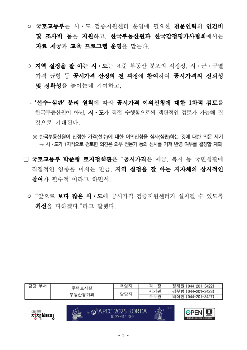 - 1 - 보도자료 보도시점 : 2025. 10. 30.(목) 16:00 이후(10. 31.(금) 조간) / 배포 : 2025. 10. 30.(목) ‘공시가격 검증지원센터’ 전국 확대 본격 논의… 9개 시·도와 시범사업 업무협약 체결- 지역 실정을 잘 아는 시ㆍ도가 감정평가사와 함께 가격 산정 전 과정에 참여- ‘선수-심판’ 분리 원칙에 따라 이의신청에 대한 1차적 검토를 시ㆍ도가 수행□ 국토교통부(장관 김윤덕)는 전국 9개 시ㆍ도*와 ‘공시가격 검증지원센터 시범사업’ 추진을 위한 업무협약(MOU)을 10월 30일 오후 국토연구원에서 체결한다. * 서울특별시, 대구광역시, 인천광역시, 대전광역시, 경기도, 충청북도, 충청남도, 전라남도, 경상북도□ 이번 업무협약은 「부동산 공시제도 개선방안(’23.10)」의 후속조치 중 하나인 ‘시ㆍ도 공시가격 검증지원센터’를 제도화하기 위한 준비과정으로, ㅇ 그간 국토교통부는 정책연구용역 등을 통해 시ㆍ도 공시가격 검증지원센터 운영매뉴얼(안)을 마련(’23.12~’24.7)하고, 이를 서울ㆍ경기ㆍ충남 지역에 시범 적용(’24.9~’25.9)한 바 있다. ※ (국토연구원) 사업수행자로서 검증지원센터를 총괄하며 지자체 의견수렴 등을 종합적으로 진행□ 이번 업무협약의 주요 내용 및 기대효과는 다음과 같다. ㅇ 올해 시범사업은 기존 시범 적용 지자체인 서울, 경기, 충남 뿐만 아니라, 대구, 인천, 대전, 충북, 전남 및 경북 등 9개 시ㆍ도로 확대되었으며, 이는 검증지원센터에 대한 시ㆍ도의 관심이 전국으로 확산되고있음을 의미한다. - 2 - ㅇ 국토교통부는 시ㆍ도 검증지원센터 운영에 필요한 전문인력의 인건비 및 조사비 등을 지원하고, 한국부동산원과 한국감정평가사협회에서는 자료 제공과 교육 프로그램 운영을 맡는다. ㅇ 지역 실정을 잘 아는 시ㆍ도는 표준 부동산 분포의 적정성, 시ㆍ군ㆍ구별 가격 균형 등 공시가격 산정의 전 과정에 참여하여 공시가격의 신뢰성 및 정확성을 높이는데 기여하고, - ‘선수-심판’ 분리 원칙에 따라 공시가격 이의신청에 대한 1차적 검토를한국부동산원이 아닌, 시ㆍ도가 직접 수행함으로써 객관적인 검토가 가능해질것으로 기대된다. ※ 한국부동산원이 산정한 가격(선수)에 대한 이의신청을 심사(심판)하는 것에 대한 의문 제기→ 시ㆍ도가 1차적으로 검토한 의견은 외부 전문가 등의 심사를 거쳐 반영 여부를 결정할 계획□ 국토교통부 박준형 토지정책관은 “공시가격은 세금, 복지 등 국민생활에직접적인 영향을 미치는 만큼, 지역 실정을 잘 아는 지자체의 상시적인 참여가 필수적”이라고 하면서, ㅇ “앞으로 보다 많은 시ㆍ도에 공시가격 검증지원센터가 설치될 수 있도록최선을 다하겠다.”라고 말했다. 담당 부서 주택토지실 부동산평가과 책임자 과 장 정재원 (044-201-3422) 담당자 서기관 김부병 (044-201-3423) 주무관 박아현 (044-201-3427)