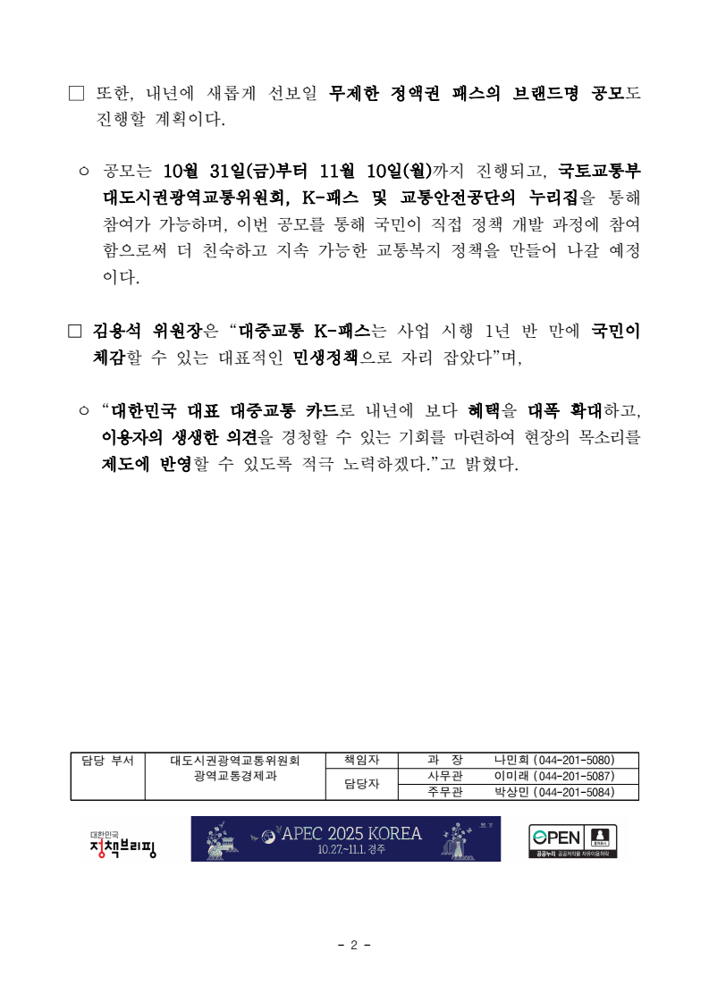 - 1 - 보도시점 : 2025. 10. 30.(목) 11:00 이후(10. 31.(금) 조간) / 배포 : 2025. 10. 30.(목) K-패스 이용자, 400만명 돌파! - 무제한 정액권 패스 명칭 공모, 신규가입자·고빈도 이용자 대상 이벤트 진행□ 국토교통부(장관 김윤덕) 대도시권광역교통위원회(위원장 김용석, 이하 ‘대광위’)는국민 교통비 절감을 위한 대표 교통복지 정책인 ‘K-패스’의 이용자가 출시(‘24년 5월) 17개월 만에 400만 명을 돌파했다고 밝혔다. ㅇ K-패스는 월 15회 이상 대중교통을 이용할 경우 월 최대 60회까지 지출금액의 일부*를 이용자에게 돌려주는 패스로 교통비 부담을 줄여주고, 대중교통 이용을 활성화하는 데 앞장서고 있다. * (환급률) 일반 20%, 청년 30%, 다자녀(2자녀) 30%, 다자녀(3자녀 이상) 50%, 저소득 53.3%ㅇ 혜택을 확대하기 위해 올해 다자녀 가구 유형(2자녀 30%, 3자녀 이상 50%)을 신설하였으며, 내년부터는 어르신 유형(만 65세 이상, 30%)을 신설할 예정이며, 이와 함께 고빈도 이용자의 교통비 부담을 획기적으로 덜어주기 위해 정액권 형태의 무제한 패스를 도입할 예정이다. □ 대광위는 K-패스에 많은 관심을 보여준 국민들께 감사의 뜻을 전하고자10월 31일부터 다양한 온라인 이벤트를 진행한다고 밝혔다. ㅇ ’25년에 새롭게 가입한 신규 이용자와 고빈도 이용자를 대상으로 추첨을 통해 경품을 증정할 예정이다. ㅇ 아울러, 이용자 아이디어 공유 행사를 함께 개최하여 K-패스를 이용하면서좋았던 점이나 개선이 필요하다고 느낀 점을 자유롭게 제안받을 계획이며, 우수 제안자에게는 소정의 상품을 제공할 예정이다. 보도자료 - 2 - □ 또한, 내년에 새롭게 선보일 무제한 정액권 패스의 브랜드명 공모도진행할 계획이다. ㅇ 공모는 10월 31일(금)부터 11월 10일(월)까지 진행되고, 국토교통부 대도시권광역교통위원회, K-패스 및 교통안전공단의 누리집을 통해 참여가 가능하며, 이번 공모를 통해 국민이 직접 정책 개발 과정에 참여함으로써 더 친숙하고 지속 가능한 교통복지 정책을 만들어 나갈 예정이다. □ 김용석 위원장은 “대중교통 K-패스는 사업 시행 1년 반 만에 국민이 체감할 수 있는 대표적인 민생정책으로 자리 잡았다”며, ㅇ “대한민국 대표 대중교통 카드로 내년에 보다 혜택을 대폭 확대하고, 이용자의 생생한 의견을 경청할 수 있는 기회를 마련하여 현장의 목소리를제도에 반영할 수 있도록 적극 노력하겠다.”고 밝혔다. 담당 부서 대도시권광역교통위원회 책임자 과 장 나민희 (044-201-5080) 광역교통경제과 담당자 사무관 이미래 (044-201-5087) 주무관 박상민 (044-201-5084) - 3 - 참 고 K-패스 400만명 달성 기념 이벤트 홍보 포스터