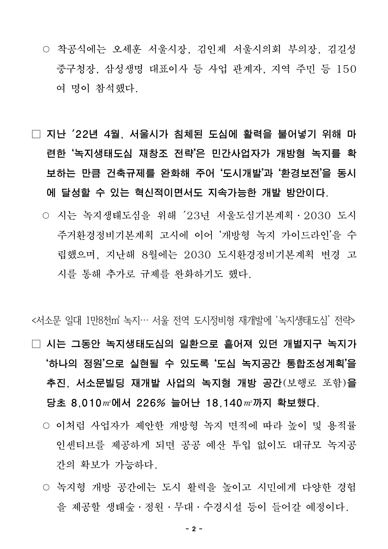 - 1 - 2025. 11. 5.(수) 석간용 이 보도자료는 2025년 11월 5일 오전 10:30부터 보도할 수 있습니다.보도자료담당부서 : 도시공간본부 도시재창조과 중구 도심정비과 도시재창조과장 김용배 02-2133-4630 도시재창조정책팀장 문보성 02-2133-4632 도심정비과장 서연우 02-3396-8242 사진없음 □ 사진있음 ▣ 쪽수 도시재개발팀장 오명희 02-3396-5771 : 5쪽 녹지생태도심 '서소문빌딩 재개발'…녹지‧문화 품은 혁신 업무지구로 재탄생- 11.5.(수) 녹지생태도심 재창조 성과 발표 및 선도사업 ‘서소문빌딩 재개발’ 착공식- 서소문 일대 1만8천㎡ 녹지… 서울 전역 도시정비형 재개발에 ‘녹지생태도심’ 전략- 오는 '30년 ‘서소문빌딩 재개발’ 클래식 공연장 들어서 도심 서측 문화랜드마크로- 오 시장 “녹지생태도심 통해 서울 전역 녹색 네트워크 연결, 글로벌 녹색도시발돋움” □ 오는 '30년, 서소문로에 서울광장 1.3배에 이르는 대규모녹지가조성되고 강북권 최초 ‘클래식 전문 공연장’이 들어선다. 앞으로이일대는 서울역 북부역세권․힐튼 부지 등 재개발 사업과 함께대규모 녹지를 품은 혁신 업무지구(154만㎡)로 재탄생, 새로운도심비즈니스 축으로 발돋움할 것으로 기대된다. □ 서울시는 11.5.(수) ‘녹지생태도심 선도 사업 서소문빌딩 재개발사업 착공식’을 갖고, 지난 3년간 서소문 일대 3개 지구 재개발(▴서울역-서대문 1․2구역 1지구 ▴서소문 11․12지구 ▴서소문10지구)과 함께 추진된 「녹지생태도심 재창조 전략」 성과를 발표했다. - 2 - ○ 착공식에는 오세훈 서울시장, 김인제 서울시의회 부의장, 김길성중구청장, 삼성생명 대표이사 등 사업 관계자, 지역 주민 등150여 명이 참석했다. □ 지난 '22년 4월, 서울시가 침체된 도심에 활력을 불어넣기위해마련한 ‘녹지생태도심 재창조 전략’은 민간사업자가 개방형 녹지를확보하는 만큼 건축규제를 완화해 주어 ‘도시개발’과 ‘환경보전’을동시에 달성할 수 있는 혁신적이면서도 지속가능한 개발 방안이다. ○ 시는 녹지생태도심을 위해 '23년 서울도심기본계획․2030 도시주거환경정비기본계획 고시에 이어 ‘개방형 녹지 가이드라인’을수립했으며, 지난해 8월에는 2030 도시환경정비기본계획 변경고시를 통해 추가로 규제를 완화하기도 했다. <서소문 일대 1만8천㎡ 녹지… 서울 전역 도시정비형 재개발에 ‘녹지생태도심’ 전략>□ 시는 그동안 녹지생태도심의 일환으로 흩어져 있던 개별지구녹지가‘하나의 정원’으로 실현될 수 있도록 ‘도심 녹지공간 통합조성계획’을추진, 서소문빌딩 재개발 사업의 녹지형 개방 공간(보행로포함)을당초 8,010㎡에서 226% 늘어난 18,140㎡까지 확보했다. ○ 이처럼 사업자가 제안한 개방형 녹지 면적에 따라 높이 및용적률인센티브를 제공하게 되면 공공 예산 투입 없이도 대규모녹지공간의 확보가 가능하다. ○ 녹지형 개방 공간에는 도시 활력을 높이고 시민에게 다양한경험을 제공할 생태숲․정원․무대․수경시설 등이 들어갈 예정이다. - 3 - □ 현재 서소문 일대를 비롯해 ▴양동구역(서울역 앞) ▴수표구역(을지로3가 일대) 등, 보존 위주 정책이 추진되던 시기와 비교해약5배많은 총 36개 지구에서 ‘녹지생태도심 재창조 전략’이 적용된정비사업이 진행되고 있다. ○ ‘녹지생태도심 재창조’ 추진 이전 연평균 약 2.7건에 그쳤던도심정비사업은 정책 시행 이후 연평균 12.8건으로 대폭 늘었다. □ 이들 사업이 모두 완료되면 서울광장의 약 8배(10만㎡)에달하는대규모 민간 녹지가 확충돼 ‘정원도시 서울’에 방점을 찍는 도심정원이 실현될 것으로 기대된다. ○ 시는 도심뿐 아니라 앞으로 서울 전역에서 진행되는 ‘도시정비형재개발 사업’에도 녹지생태도심 전략을 적극 도입해 서울을친환경 녹색도시로 바꿔 나간다는 방침이다. <오는 '30년 ‘서소문빌딩 재개발’ 클래식 공연장 들어서 도심 서측 문화 랜드마크로>□ 녹지생태도심 선도 사업의 뼈대인 ‘서소문빌딩 재개발 사업(서울역서대문 1․2구역 1지구)’은 중구 순화동 7번지 일대에 지하8층~지상 38층(연면적 249,179㎡) 업무․문화 복합시설을 조성하는도시정비형 재개발로, '30년 6월 준공을 목표로 추진된다. □ 재개발이 완료되면 대형 오피스 노후화로 활력을 잃어가던서소문일대는 문화와 녹지를 품은 대규모 혁신 업무지구(154만㎡)로재 - 4 - 탄생할 것으로 기대된다. 서소문빌딩 오피스 면적은 당초 대비약3.5배, 수용 인원은 3배 가량 늘어날 전망이다. □ 서초 예술의전당처럼 강북권 최초 ‘클래식 전문 공연장’도 들어선다. 1980년대 개관 이래 음악․무용 등 공연 문화를 선도해 왔던호암아트홀은 1,100석 규모 클래식 공연장으로 거듭나 품격 있는문화공간이자 도심 서측의 랜드마크로 자리매김할 전망이다. ○ 특히 지상 4~9층 공연장 공중 배치로 추가 확보된 저층부외부공간은 녹지와 연계하여 개방감과 공공성을 동시에 갖춘 도심속휴식 공간으로도 활용될 예정이다. □ 오세훈 서울시장은 “오늘 착공은 단순한 개발사업이 아니라서울이녹색도시로 다시 태어나는 도심 전환의 출발점”이라며 “규제완화와인센티브로 도시에 활력을 불어넣고 녹지를 