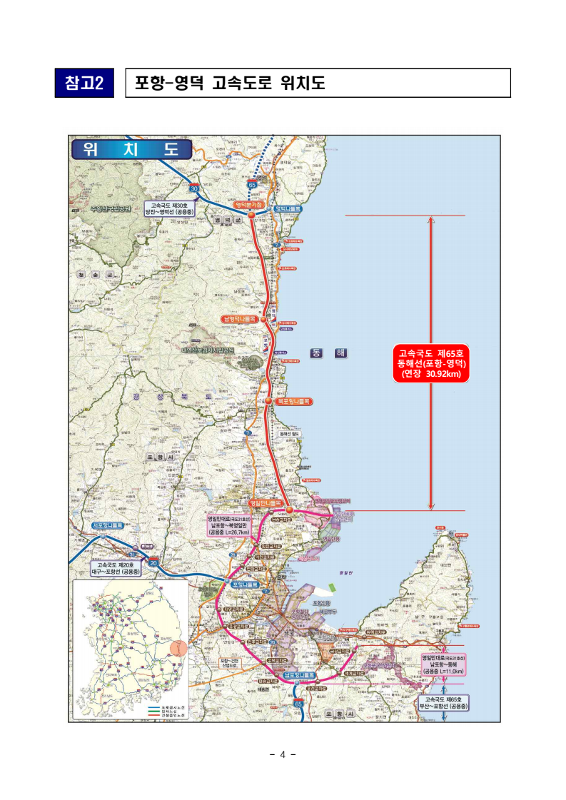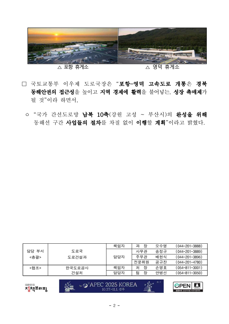 - 1 - 보도시점 : 2025. 11. 6.(목) 11:00 이후(11. 7.(금) 조간) / 배포 : 2025. 11. 6. (목) 동해를 잇다, 미래를 달리다… 포항 ~ 영덕 고속도로 개통- 8일 오전 10시 30.9km 구간 개통… 포항~영덕 간 이동시간 23분 단축□ 국토교통부(장관 김윤덕)와 한국도로공사(사장 함진규)는 동해고속도로포항–영덕 구간을 11월 8일 오전 10시 개통한다. ㅇ 이번 개통구간은 연장 30.9km에 이르는 왕복 4차로로, 총사업비 1조 6,115억 원을 투입하였으며, ’16년 착공 후 9년여의 공사기간을 거쳐 완공되었다. □ 포항-영덕 고속도로가 개통되면 포항시 북구 흥해읍에서 영덕군 강구면까지 주행거리는 약 6km 감소(37km→31km,△16%)하고 이동시간은 약 23분 단축(42분→19분,△55%)될 것으로 예상되며, ㅇ 인접 도로인 국도 7호선 교통량의 상당 부분도 전환되어 출퇴근은 물론 해안 관광객 이동도 한결 원활해져 교통혼잡 완화에 크게 기여할 것으로기대된다. □ 포항–영덕 고속도로는 최초로 터널 내 위성항법시스템(GPS)을 시범도입해터널 내부에서도 끊김 없이 자동차 내비게이션 이용이 가능하도록하여 운전자 편의를 개선하였으며, ㅇ 동해 해안 도로의 특성을 활용하여 바다가 보이는 지점에 휴게소(2개소)를조성하고 각각 선박 모양과, 지역 특산품을 형상화하는 건축물을 조성하여 지역 홍보 효과에도 기여할 것으로 기대된다. * 포항휴게소는 영일만의 선박, 영덕 휴게소는 영덕대게를 형상화함 보도자료 - 2 - △ 포항 휴게소 △ 영덕 휴게소 □ 국토교통부 이우제 도로국장은 “포항–영덕 고속도로 개통은 경북 동해안권의 접근성을 높이고 지역 경제에 활력을 불어넣는, 성장 촉매제가될 것”이라 하면서, ㅇ “국가 간선도로망 남북 10축(강원 고성 ~ 부산시)의 완성을 위해동해선 구간 사업들의 절차를 차질 없이 이행할 계획”이라고 밝혔다. 담당 부서 <총괄> 도로국 도로건설과 책임자 과 장 오수영 (044-201-3888) 담당자 사무관 송정규 (044-201-3889) 주무관 배현식 (044-201-3896) 전문위원 공규찬 (044-201-4780) <협조> 한국도로공사 책임자 처 장 손영호 (054-811-3001) 건설처 담당자 팀 장 안병선 (054-811-3050) - 3 - 참고1 포항-영덕 고속도로 사업개요 □ 사업개요 ㅇ (사업구간) 경상북도 포항시 북구 흥해읍~경상북도 영덕군 강구면ㅇ (사업규모) 연장 30.9km, 4차로 신설 ㅇ (총사업비) 1조 6,115억원 ㅇ (주요시설) 분기점 1개소, 나들목 3개소, 휴게소 2개소 □ 추진경위 ㅇ 2009. 3 : 예비타당성 조사 완료 ㅇ 2011. 11 : 타당성조사 완료 ㅇ 2013. 8 : 기본설계 완료 ㅇ 2015. 12 : 실시설계 완료 ㅇ 2016. 8 : 공사착공 ㅇ 2025. 11 : 공사 개통(개통 : ’25. 11. 8) □ 개통의미 ㅇ 동해안 지역의 이동거리 단축 및 관광산업 활성화 기여 등에따른광역 도로망 구축 및 물류비용절감 등 지역개발 촉진 □ 기대효과 ㅇ 사회적 편익 423억원/년 절감, 주행거리 6km↓, 주행시간 23분↓ ※ (거리) 37.0km → 31.0km (△16%) / (통행시간) 42분 → 19분 (△55%) - 4 - 참고2 포항-영덕 고속도로 위치도 고속국도 제65호 동해선(포항-영덕) (연장 30.92km)