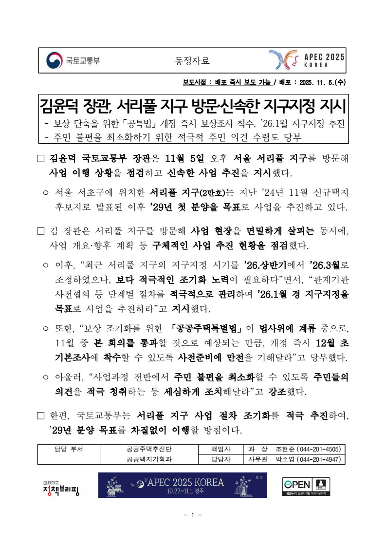 - 1 - 동정자료 보도시점 : 배포 즉시 보도 가능 / 배포 : 2025. 11. 5.(수) 김윤덕 장관, 서리풀 지구 방문·신속한 지구지정 지시- 보상 단축을 위한 「공특법」 개정 즉시 보상조사 착수, ’26.1월 지구지정 추진- 주민 불편을 최소화하기 위한 적극적 주민 의견 수렴도 당부 □ 김윤덕 국토교통부 장관은 11월 5일 오후 서울 서리풀 지구를 방문해 사업 이행 상황을 점검하고 신속한 사업 추진을 지시했다. ㅇ 서울 서초구에 위치한 서리풀 지구(2만호)는 지난 ’24년 11월 신규택지후보지로 발표된 이후 ’29년 첫 분양을 목표로 사업을 추진하고 있다. □ 김 장관은 서리풀 지구를 방문해 사업 현장을 면밀하게 살피는 동시에, 사업 개요·향후 계획 등 구체적인 사업 추진 현황을 점검했다. ㅇ 이후, “최근 서리풀 지구의 지구지정 시기를 ’26.상반기에서 ’26.3월로조정하였으나, 보다 적극적인 조기화 노력이 필요하다”면서, “관계기관사전협의 등 단계별 절차를 적극적으로 관리하며 ’26.1월 경 지구지정을 목표로 사업을 추진하라”고 지시했다. ㅇ 또한, “보상 조기화를 위한 「공공주택특별법」이 법사위에 계류 중으로, 11월 중 본 회의를 통과할 것으로 예상되는 만큼, 개정 즉시 12월 초 기본조사에 착수할 수 있도록 사전준비에 만전을 기해달라”고 당부했다. ㅇ 아울러, “사업과정 전반에서 주민 불편을 최소화할 수 있도록 주민들의 의견을 적극 청취하는 등 세심하게 조치해달라”고 강조했다. □ 한편, 국토교통부는 서리풀 지구 사업 절차 조기화를 적극 추진하여, ’29년 분양 목표를 차질없이 이행할 방침이다. 담당 부서 공공주택추진단 책임자 과 장 조현준 (044-201-4505) 공공택지기획과 담당자 사무관 박소영 (044-201-4947) - 2 - 참 고 서리풀지구 위치도 □ 서리풀1지구 □ 서리풀2지구