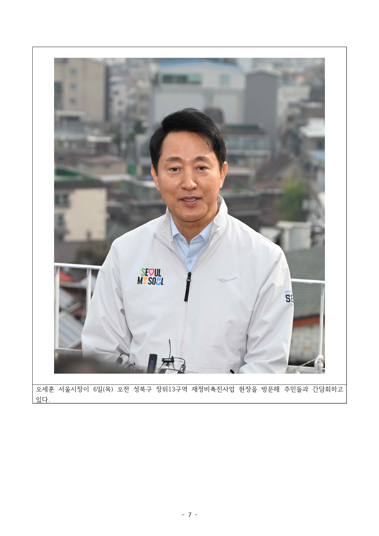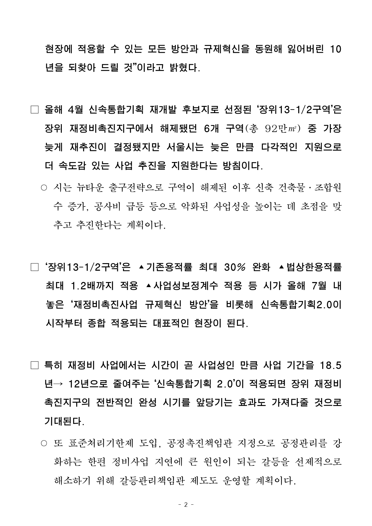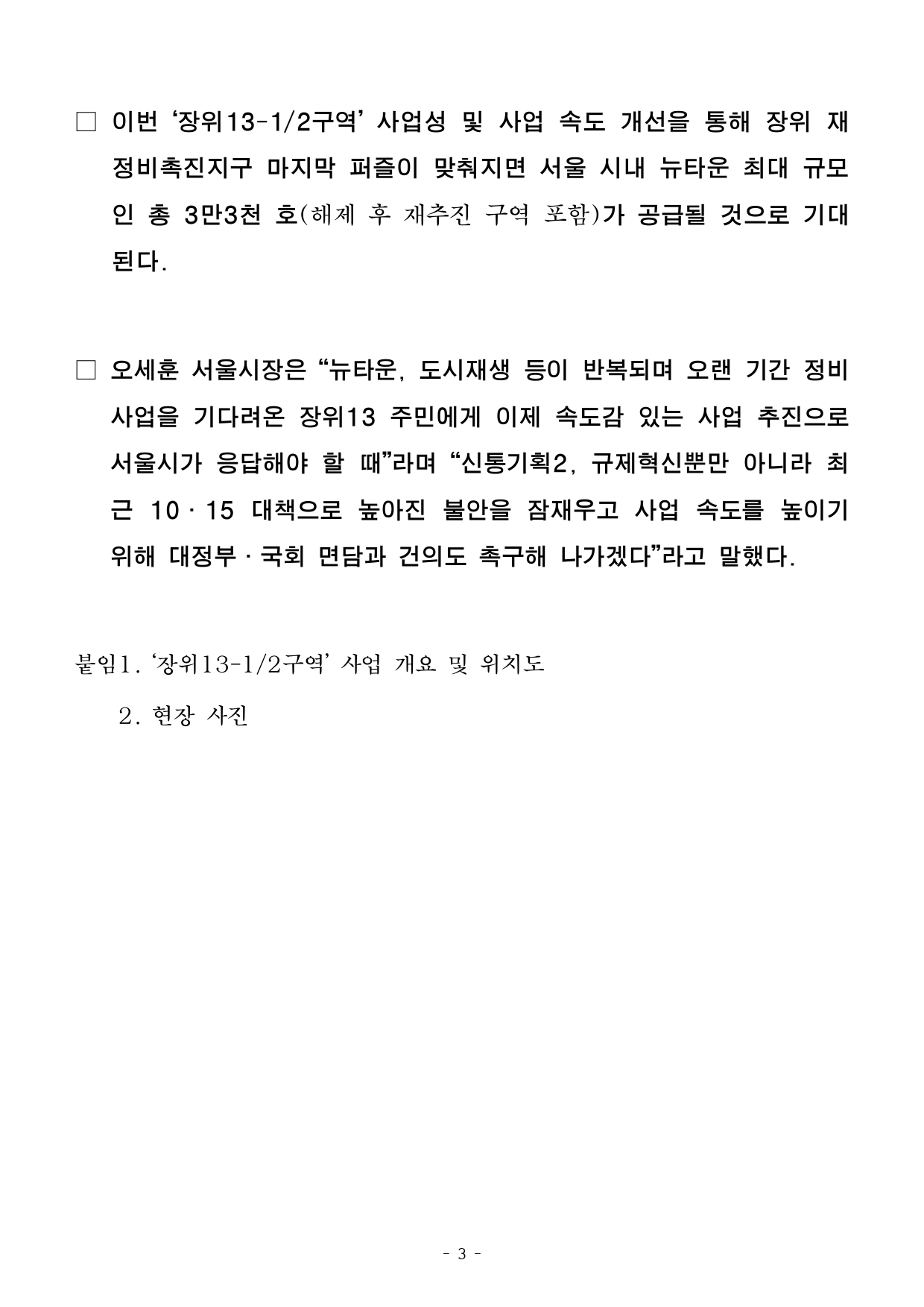 - 1 - □ 서울시가 뉴타운 출구전략 상흔이 상존하고 있는 ‘장위13구역’에▴신속통합기획 2.0 ▴재정비촉진사업 규제혁신 방안 등을 종합적용해 10년 만에 사업 재추진에 들어간다. 재정비가 마지막으로결정된장위13구역(약 6천 호)까지 사업에 들어가면 장위 재촉지구에서는총 3만3천 호가 공급될 전망이다. □ 정부의 10‧15 대책으로 정비사업에 대한 불안감이 커지고있는가운데 오세훈 서울시장은 11.6.(목) 장위13-1/2구역(구, 장위13구역)에서 열린 주민간담회에서 “사업성을 획기적으로 끌어올리기위해2025. 11. 6.(목) 석간용 이 보도자료는 2025년 11월 6일 오전 10:30부터 보도할 수 있습니다. 보도자료 담당부서 : 주택실 재정비촉진과 재정비촉진과장 김상우 2133-7210 재정비정책팀장 박상희 2133-7216 재정비계획팀장 강희일 2133-7221 사진없음 □ 사진있음 ▣ 쪽수 : 8쪽 '장위13' 신속통합2‧재촉 규제혁신 적용…오 시장 "사업성 개선방안 총동원"- 11.6.(목) 오세훈 서울시장 ‘장위13-1/2’ 간담회… 장위 재촉지구 중 마지막구역- 뉴타운 해제 후 악화된 사업성 개선 초점… ‘신통2.0, 재촉사업 규제혁신’ 종합적용- ‘신통기획2.0’으로 사업 기간 단축… '32년 뉴타운 최대 규모 3만3천 호착공목표- 오 시장 “속도감 있는 사업으로 응답할 것… 대정부‧국회 면담, 건의도적극촉구” - 2 - 현장에 적용할 수 있는 모든 방안과 규제혁신을 동원해 잃어버린10년을 되찾아 드릴 것”이라고 밝혔다. □ 올해 4월 신속통합기획 재개발 후보지로 선정된 ‘장위13-1/2구역’은장위 재정비촉진지구에서 해제됐던 6개 구역(총 92만㎡) 중가장늦게 재추진이 결정됐지만 서울시는 늦은 만큼 다각적인 지원으로더 속도감 있는 사업 추진을 지원한다는 방침이다. ○ 시는 뉴타운 출구전략으로 구역이 해제된 이후 신축 건축물․조합원수 증가, 공사비 급등 등으로 악화된 사업성을 높이는 데 초점을맞추고 추진한다는 계획이다. □ ‘장위13-1/2구역’은 ▴기존용적률 최대 30% 완화 ▴법상한용적률최대 1.2배까지 적용 ▴사업성보정계수 적용 등 시가 올해7월내놓은 ‘재정비촉진사업 규제혁신 방안’을 비롯해 신속통합기획2.0이시작부터 종합 적용되는 대표적인 현장이 된다. □ 특히 재정비 사업에서는 시간이 곧 사업성인 만큼 사업 기간을18.5년→ 12년으로 줄여주는 ‘신속통합기획 2.0’이 적용되면 장위재정비촉진지구의 전반적인 완성 시기를 앞당기는 효과도 가져다줄것으로기대된다. ○ 또 표준처리기한제 도입, 공정촉진책임관 지정으로 공정관리를강화하는 한편 정비사업 지연에 큰 원인이 되는 갈등을 선제적으로해소하기 위해 갈등관리책임관 제도도 운영할 계획이다. - 3 - □ 이번 ‘장위13-1/2구역’ 사업성 및 사업 속도 개선을 통해 장위재정비촉진지구 마지막 퍼즐이 맞춰지면 서울 시내 뉴타운 최대규모인 총 3만3천 호(해제 후 재추진 구역 포함)가 공급될 것으로기대된다. □ 오세훈 서울시장은 “뉴타운, 도시재생 등이 반복되며 오랜 기간정비사업을 기다려온 장위13 주민에게 이제 속도감 있는 사업 추진으로서울시가 응답해야 할 때”라며 “신통기획2, 규제혁신뿐만 아니라최근 10․15 대책으로 높아진 불안을 잠재우고 사업 속도를높이기위해 대정부․국회 면담과 건의도 촉구해 나가겠다”라고 말했다. 붙임1. ‘장위13-1/2구역’ 사업 개요 및 위치도 2. 현장 사진 - 4 - <첨부1> ‘장위13-1/2구역’ 사업 개요 및 위치도 사업 개요 구역명 장위13-1구역 장위13-2구역 위치 성북구 장위동 219-90번지 일대 성북구 장위동 224-12번지일대면적 약 131,226m2 약 111,641m2 동의율 51.28% (902명/1,759명) 51.50% (565명/1,097명) 용도지역 제1종, 제2종(7층 이하), 제3종 제1종, 제2종(7층 이하) 위치도 - 5 - <첨부2> 오세훈 서울시장이 6일(목) 오전 성북구 장위13구역 재정비촉진사업 현장을 방문해 주민들과 간담회하고 있다. - 6 - 오세훈 서울시장이 6일(목) 오전 성북구 장위13구역 재정비촉진사업 현장을 방문해 일대를 점검하고 있다. - 7 - 오세훈 서울시장이 6일(목) 오전 성북구 장위13구역 재정비촉진사업 현장을 방문해 주민들과 간담회하고 있다. - 8 - 오세훈 서울시장이 6일(목) 오전 성북구 장위13구역 재정비촉진사업 현장을 방문해 일대를 점검하고 있다. 오세훈 서울시장이 6일(목) 오전 성북구 장위13구역 재정비촉진사업 현장을 방문해 진행상황을 점검하고 있다.