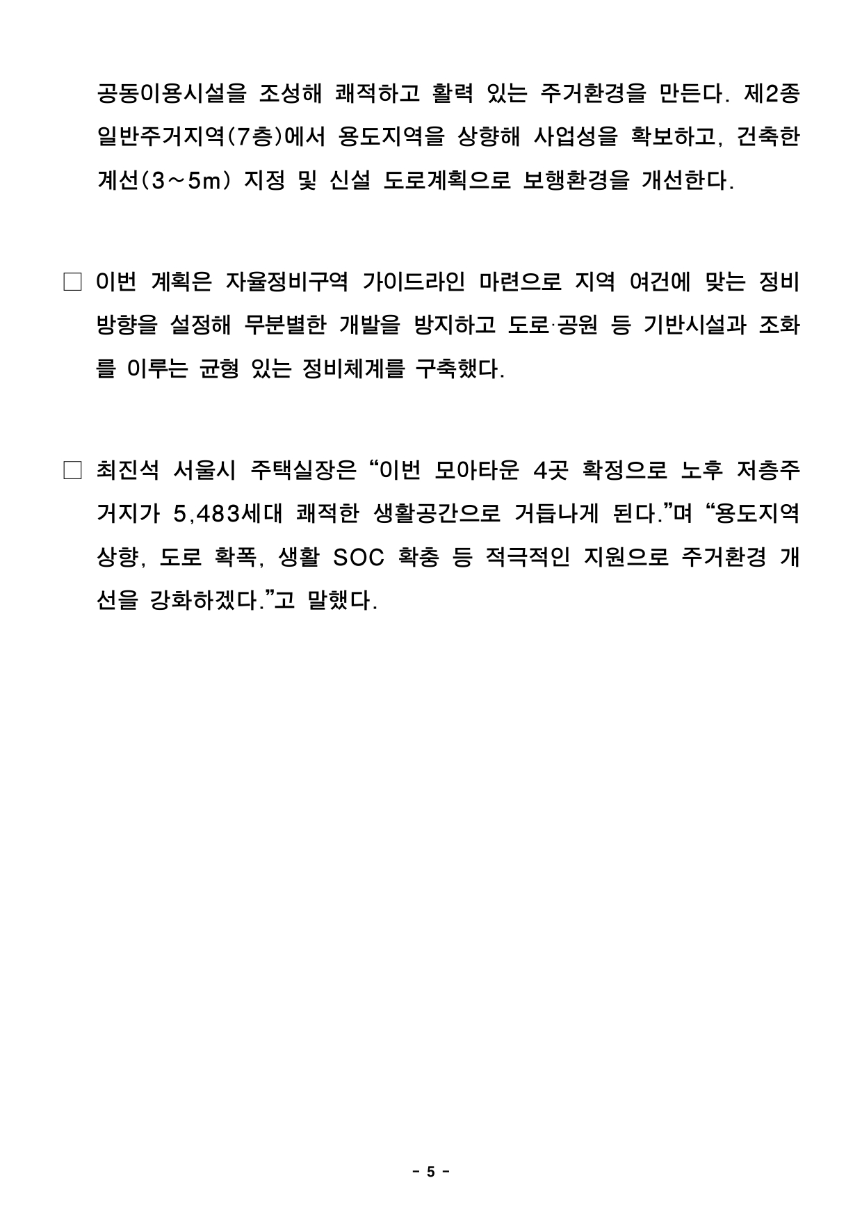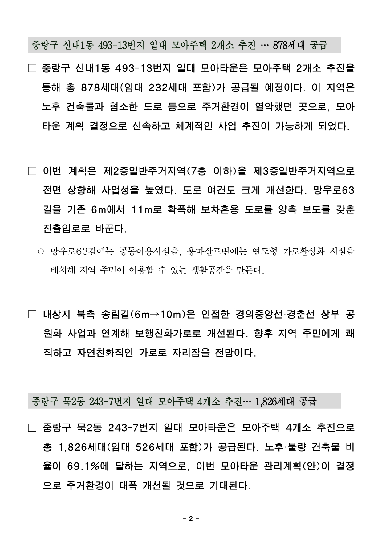 2025. 11. 12.(수) 조간용 이 보도 자료는 2025년 11월 11일 오전 11:15부터 보도할 수 있습니다. 보도 자료담당 부서: 주택실 전략주택공급과 전략주택공급과장 양준모 2133-6280 모아주택사업팀장 박교관 02-2133-8239 사진 없음 □ 사진 있음 ▣ 쪽수 모아주택관리팀장 정여란 2133-8226 : 12쪽 서울시, 중랑·광진·관악 모아타운 4곳 확정… 5,483세대 주택공급 속도① 중랑구 신내1동 493-13 일대 모아타운, 878세대 공급…보도 신설로 보행 편의·안전강화② 중랑구 묵2동 243-7 일대 모아타운, 용도지역 상향 1,826세대…주요도로 확폭, 가로환경개선③ 자양2동 649 일대 모아타운, 2,325세대 공급 어린이공원 신설, 한강변 주거환경 개선본격화④ 청룡동 1535 일대 모아타운, 454세대 공급, 신설 도로계획 보행환경 개선□ 서울시가 노후 저층주거지 개선을 위해 모아타운 사업 4개 지역을확정해총 5,483세대 주택공급에 나선다. 용도지역 상향, 도로 확폭, 생활SOC 확충 등이 함께 이뤄져 주민 체감 효과가 클 것으로 기대된다. □ 서울시는 11월 10일 제16차 소규모주택정비 통합심의 소위원회에서‘중랑구 신내1동 493-13일대 모아타운’ 외 3건을 통과시켰다고밝혔다. □ 통과된 안건은 ▲중랑구 신내1동 493-13번지 일대 모아타운▲중랑구묵2동 243-7번지 일대 모아타운 ▲광진구 자양2동 649번지 일대모아타운 ▲관악구 청룡동 1535번지 일대 모아타운으로, 사업추진시모아주택 총 5,483세대(임대 1,405세대 포함)가 공급될 예정이다. - 2 - 중랑구 신내1동 493-13번지 일대 모아주택 2개소 추진 … 878세대공급□ 중랑구 신내1동 493-13번지 일대 모아타운은 모아주택 2개소추진을통해 총 878세대(임대 232세대 포함)가 공급될 예정이다. 이지역은노후 건축물과 협소한 도로 등으로 주거환경이 열악했던 곳으로, 모아타운 계획 결정으로 신속하고 체계적인 사업 추진이 가능하게되었다. □ 이번 계획은 제2종일반주거지역(7층 이하)을 제3종일반주거지역으로전면 상향해 사업성을 높였다. 도로 여건도 크게 개선한다. 망우로63길을 기존 6m에서 11m로 확폭해 보차혼용 도로를 양측 보도를갖춘진출입로로 바꾼다. ○ 망우로63길에는 공동이용시설을, 용마산로변에는 연도형 가로활성화시설을배치해 지역 주민이 이용할 수 있는 생활공간을 만든다. □ 대상지 북측 송림길(6m→10m)은 인접한 경의중앙선·경춘선상부공원화 사업과 연계해 보행친화가로로 개선된다. 향후 지역 주민에게쾌적하고 자연친화적인 가로로 자리잡을 전망이다. 중랑구 묵2동 243-7번지 일대 모아주택 4개소 추진… 1,826세대 공급□ 중랑구 묵2동 243-7번지 일대 모아타운은 모아주택 4개소추진으로총 1,826세대(임대 526세대 포함)가 공급된다. 노후·불량 건축물비율이 69.1%에 달하는 지역으로, 이번 모아타운 관리계획(안)이결정으로 주거환경이 대폭 개선될 것으로 기대된다. - 3 - ○ 인근 중랑천로변 남-북 축으로 모아타운 대상지 및 신속통합기획(중화6구역)등 개발계획이 활발히 추진되고 있어, 주민들의 개발에 대한 기대감과요청이높은 곳이다. □ 이번 계획은 기존 제2종·제2종(7층 이하)일반주거지역을 제3종일반주거지역으로 상향해 사업성을 높였다. 모아타운 내부 주요 도로를확폭해 교통 여건을 개선한다. ○ ▴봉화산로3길(8m→12m) ▴중랑천로56길(6m→8m) 확폭과 함께건축한계선 3m를 지정해 공공보행통로를 조성하고 보행친화적 환경을만든다. □ 인근 묵현초·신묵초 학생들의 안전한 통학 환경 확보를 위해 통학로변보도를 확폭·신설하며 충분한 보행공간도 마련한다. 이번 사업으로지역주민의 보행 안정성과 주거 쾌적성이 크게 향상될 것으로 기대된다. 자양2동 649번지 일대 모아주택 5개소 추진… 2,325세대 공급 □ 광진구 자양2동 649번지 일대(95,352.8㎡)는 모아주택 5개소를통해기존 1,424세대에서 901세대 늘어난 총 2,325세대(임대 583세대포함)를 공급한다. 한강변 주거환경 개선과 함께 주택공급이 대폭확대될전망이다. ○ 이 지역은 노후건축물 72.9%, 반지하 주택 61.3%에 이르는 노후저층주거밀집지역으로, 주거환경 개선이 필요했던 곳이다. □ 이번 모아타운 관리계획에서는 모아주택 사업시행계획(안) 마련시용도 - 4 - 지역을 제2종일반주거지역(7층 이하)에서 제3종일반주거지역으로상향해주택공급을 활성화하고 임대주택 확보하는 기반을 마련했다. □ 또한, 뚝섬로54길을 기존 6m에서 14m로, 인근 도로는 최대12m까지확폭해 교통 흐름과 진출입 여건을 개선한다. 보도를 신설해 안전한보행환경을 조성한다. □ 구역 내 어린이공원(1,768㎡)도 새로 만든다. 기존 사회복지시설자양노인복지관 기능은 그대로 유지해 주민 생활편의를 강화할 계획이다. □ 한강변 도시경관을 고려해 뚝섬로52길·56길에 건축한계선을 설정해열린조망축을 확보하고, 주요 가로변 활성화시설을 배치한다. 모아타운추진으로 한강변 양호한 입지를 살려 탁월한 조망과 경관을 확보하면서도, 주변도시경관과 조화를 이루는 주거환경이 조성될 전망이다. 관악구 청룡동 1535번지 일대 모아주택 4개소 추진 … 454세대 공급□ 관악구 청룡동 1535번지 일대(92,420.1㎡)는 모아주택 4개소를통해 총 454세대(임대 64세대 포함)가 공