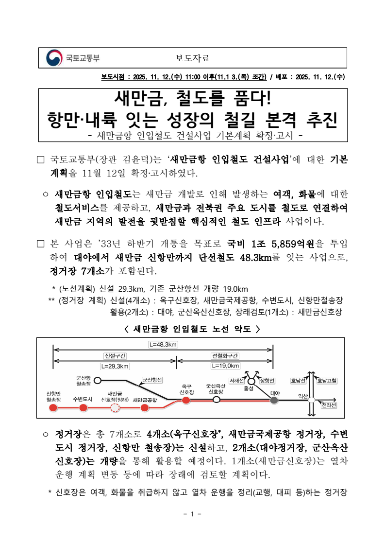 - 1 - 보도자료 보도시점 : 2025. 11. 12.(수) 11:00 이후(11.1 3.(목) 조간) / 배포 : 2025. 11. 12.(수) 새만금, 철도를 품다! 항만·내륙 잇는 성장의 철길 본격 추진- 새만금항 인입철도 건설사업 기본계획 확정‧고시 - □ 국토교통부(장관 김윤덕)는 ‘새만금항 인입철도 건설사업’에 대한 기본계획을 11월 12일 확정‧고시하였다. ㅇ 새만금항 인입철도는 새만금 개발로 인해 발생하는 여객, 화물에 대한 철도서비스를 제공하고, 새만금과 전북권 주요 도시를 철도로 연결하여 새만금 지역의 발전을 뒷받침할 핵심적인 철도 인프라 사업이다. □ 본 사업은 ’33년 하반기 개통을 목표로 국비 1조 5,859억원을 투입하여 대야에서 새만금 신항만까지 단선철도 48.3km를 잇는 사업으로, 정거장 7개소가 포함된다. * (노선계획) 신설 29.3km, 기존 군산항선 개량 19.0km ** (정거장 계획) 신설(4개소) : 옥구신호장, 새만금국제공항, 수변도시, 신항만철송장활용(2개소) : 대야, 군산옥산신호장, 장래검토(1개소) : 새만금신호장〈 새만금항 인입철도 노선 약도 〉 ㅇ 정거장은 총 7개소로 4개소(옥구신호장* , 새만금국제공항 정거장, 수변도시 정거장, 신항만 철송장)는 신설하고, 2개소(대야정거장, 군산옥산신호장)는 개량을 통해 활용할 예정이다. 1개소(새만금신호장)는 열차운행 계획 변동 등에 따라 장래에 검토할 계획이다. * 신호장은 여객, 화물을 취급하지 않고 열차 운행을 정리(교행, 대피 등)하는 정거장 - 2 - ㅇ 이중, 여객역은 새만금국제공항 정거장, 수변도시 정거장, 대야 정거장이며, 화물 취급역은 신항만 철송장이다. * 역명은 개통 전 역명심의위원회 등 절차를 거쳐 확정할 예정 □ 향후 건설이 완료되면 익산에서 새만금수변도시까지 전동열차로 36분대에 연결 운행하는 여객 노선이 마련되어, 새만금권역 내 주민, 입주기업 종사자 등의 이동 편의 증진과 함께 새만금 인근 관광지(고군산군도 등)의 관광 활성화도 기대된다. ㅇ 또한, 화물의 경우 새만금 신항만에서 대야, 광양항까지 잇는 새로운 철도물류 노선도 생길 예정이다. □ 새만금항 인입철도는 이번 기본계획 고시 후 공구 구분, 공구별 설계· 시공 일괄입찰(Turn Key) 방식 또는 기타 공사 방식 등 입찰 방법의 적정성 등을 심의·결정하는 대형공사 입찰방법 심의를 거쳐 사업을 추진하게 되며, 이후 심의 결과를 반영해 설계 및 공사 등 후속 절차를 조속히 진행할 계획이다. □ 국토교통부 윤진환 철도국장은 “새만금항 인입철도는 물류의 효율성뿐만아니라 새만금과 익산 등 인근 도시를 잇고 새만금 권역 내 주민, 입주기업종사자 등의 이동 편의를 높이는 생활 철도망으로서의 의미도 크다”면서, ㅇ “새만금이 서해안 경제·생활축의 중심으로 도약할 수 있도록 사업을 차질없이 준비하는 한편, 현장 중심의 안전관리 강화로 근로자와 국민이 안심할 수 있는 건설 현장이 될 수 있도록 최선을 다하겠다”고 밝혔다. 국토교통부 철도국 철도건설과 책임자 과 장 허경민 (044-201-4166) 담당자 사무관 김재석 (044-201-3953) 주무관 강송희 (044-201-3957) - 3 - 참고 1 새만금항 인입철도 건설사업 개요 □ 사업개요 ㅇ 사업목적 : 새만금 개발로 발생하는 여객·화물에 철도서비스를제공하여 지역 내 연계를 강화하고 주변 지역과 교류 활성화ㅇ 사업내용 : 군산 대야면 ~ 수변도시 신항만철송장 간 48.3km단선전철(신설 29.3km, 개량 19.0km) ㅇ 총사업비 / 사업기간 : 1조 5,859억원(전액국비) / ‘25 ∼ ’33년□ 주요 추진경위 ㅇ `19. 5 : 사전타당성조사 ㅇ `21. 7 : 제4차 국가철도망 구축계획 반영(2021~2030) ㅇ `21.12 : 예비타당성조사 통과 ㅇ `22. 5 : 타당성 조사 및 기본계획 착수 ㅇ `25.11 : 기본계획 고시 □ 향후계획 ㅇ ‘33년 하반기 개통을 목표로 설계, 시공 등 후속절차 추진 - 4 - 참고 2 새만금항 인입철도 위치도