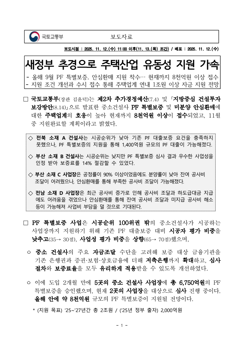 - 1 - 보도자료 보도시점 : 2025. 11. 12.(수) 11:00 이후(11. 13.(목) 조간) / 배포 : 2025. 11. 12.(수) 새정부 추경으로 주택산업 유동성 지원 가속- 올해 9월 PF 특별보증, 안심환매 지원 착수… 현재까지 8천억원 이상 접수- 지원 조건 개선과 수시 접수 통해 주택업계 연내 1조원 이상 자금 지원 전망□ 국토교통부(장관 김윤덕)는 제2차 추가경정예산(7.4) 및 「지방중심 건설투자 보강방안(8.14)」으로 발표한 중소건설사 PF 특별보증 및 미분양 안심환매에 대한 주택업계의 호응이 높아 현재까지 8천억원 이상이 접수되었고, 11월 중 지원완료할 계획이라고 밝혔다. ◇ 전북 소재 A 건설사는 시공순위가 낮아 기존 PF 대출보증 요건을 충족하지 못했으나, PF 특별보증의 지원을 통해 1,400억원 규모의 PF 대출이 가능해졌다. ◇ 부산 소재 B 건설사는 시공순위는 낮지만 PF 특별보증 심사 결과 우수한 사업성을인정 받아 보증료를 14% 절감할 수 있었다. ◇ 부산 소재 C 사업장은 공정률이 90% 이상이었음에도 분양률이 낮아 잔여 공사비 조달이 어려웠으나, 안심환매를 통해 부족한 공사비 조달이 가능해졌다. ◇ 전남 소재 D 사업장은 최근 공사비 증가로 인해 공사비 조달과 하도급대금 지급에도 어려움을 겪었으나 안심환매를 통해 잔여 공사비 조달과 미지급 공사비 해소 등이 가능해져 사업비 부담을 덜 것으로 기대된다. □ PF 특별보증 사업은 시공순위 100위권 밖의 중소건설사가 시공하는 사업장까지 지원하기 위해 기존 PF 대출보증 대비 시공자 평가 비중을 낮추고(35→ 30점), 사업성 평가 비중을 상향(65→ 70점)했으며, ㅇ 중소 건설사의 주요 자금조달 수단을 고려해 보증 대상 금융기관을 기존 은행권과 증권·보험·상호금융에 더해 저축은행까지 확대하고, 심사 절차와 보증료율을 모두 유리하게 적용받을 수 있도록 개선하였다. ㅇ 이에 도입 2개월 만에 5곳의 중소 건설사 사업장에 총 6,750억원의 PF 특별보증을 승인했으며, 현재 2곳의 사업장을 대상으로 심사 진행 중이다. 올해 안에 약 8천억원 규모의 PF 특별보증이 지원될 전망이다. * (지원 목표) ‘25~’27년간 총 2조원 / (‘25년 정부 출자) 2,000억원 - 2 - □ 안심환매 사업은 미분양으로 자금난과 사업 추진 어려움을 겪는 지방 사업장을 대상으로, 한시적으로 약 3~4%대의 저금리 자금을 공급해 주택사업의 성공적인 준공을 돕는다. * (지원 목표) ‘25~’28년간 1만호, 약 2.4조원 / (‘25년 정부 출·융자) 2,500억원ㅇ 지난 9월 5일 1차 모집 공고 이후, 현재까지 1,644억원 규모의 신청이 접수되었으며, 11월 중 심사를 거쳐 연내 자금 지원까지 마무리할 계획이다. ㅇ 아울러, 11월 4일부터 2차 모집 공고 중으로, 이번 공고부터는 주택업계편의를 위해 신청 기간을 제한하지 않고 수시 접수 방식으로 바꾸고, 그간 제기된 업계 제안 사항을 반영하여 개선된 조건*으로 지원할 계획이다. * 공정률 기준 미달성 사업장도 자금지원 전까지 달성하는 조건부로 사업신청 가능, 잔여수입금 인정 범위 확대, 시공순위 30위내 건설사도 우선지원 신청 등 요건 완화□ 국토교통부 김헌정 주택정책관은 “PF 특별보증과 안심환매 사업을 통해올해 안으로 약 1조원 이상의 유동성을 지원할 수 있을 것으로 전망된다” 라며, “앞으로 사업 추진 과정에서도 주택업계의 의견을 지속 수렴하여 주택 공급 여건을 적극적으로 뒷받침할 계획이다”고 밝혔다. 담당 부서 주택정책관 책임자 과 장 정수호 (044-201-3337) 주택기금과 담당자 사무관 권지현 (044-201-3338) 유관 기관 주택도시보증공사 책임자 실 장 이민섭 (051-955-5710) 기업금융실 담당자 팀 장 최승욱 (051-955-5770) 담당자 팀 장 함종철 (051-955-5771)