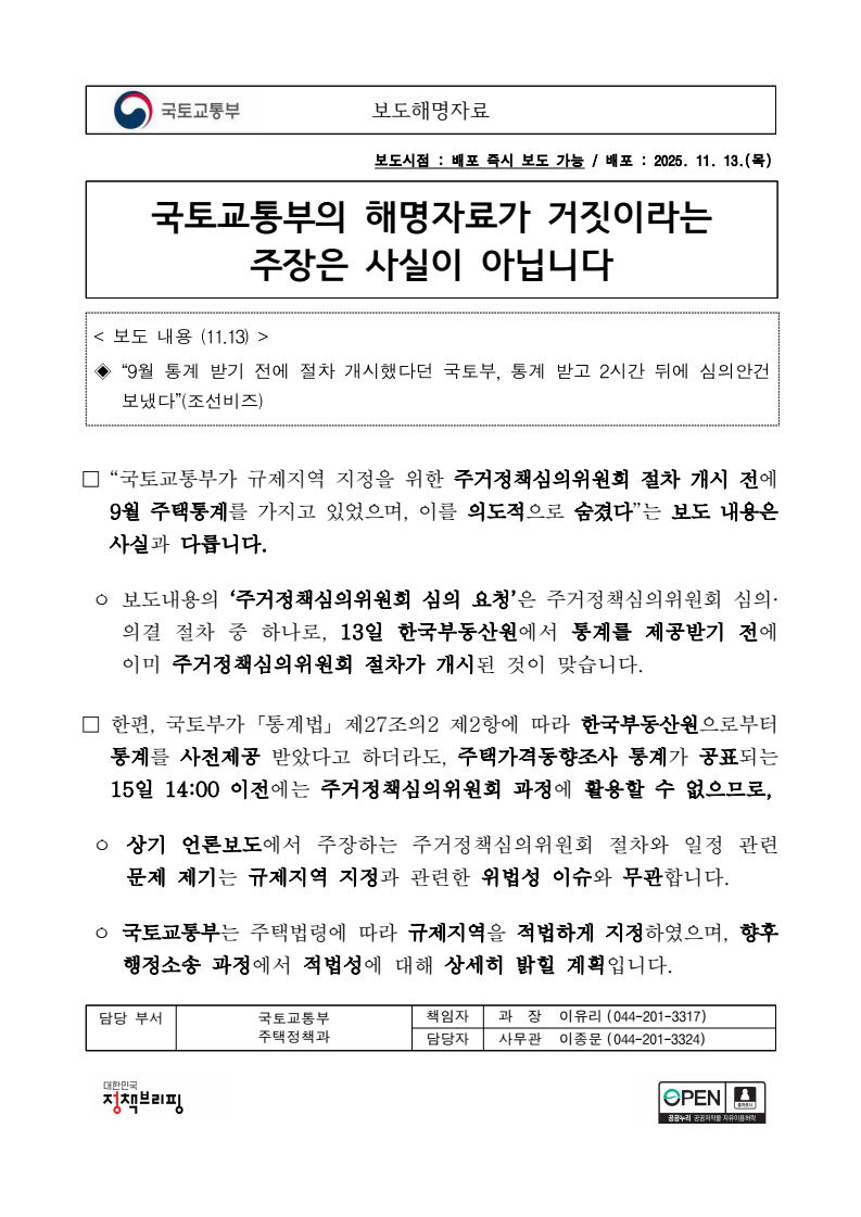 보도해명자료 보도시점 : 배포 즉시 보도 가능 / 배포 : 2025. 11. 13.(목) 국토교통부의 해명자료가 거짓이라는 주장은 사실이 아닙니다 < 보도 내용 (11.13) > ◈ “9월 통계 받기 전에 절차 개시했다던 국토부, 통계 받고 2시간 뒤에 심의안건보냈다”(조선비즈) □ “국토교통부가 규제지역 지정을 위한 주거정책심의위원회 절차 개시 전에9월 주택통계를 가지고 있었으며, 이를 의도적으로 숨겼다”는 보도 내용은 사실과 다릅니다. ㅇ 보도내용의 ‘주거정책심의위원회 심의 요청’은 주거정책심의위원회 심의· 의결 절차 중 하나로, 13일 한국부동산원에서 통계를 제공받기 전에 이미 주거정책심의위원회 절차가 개시된 것이 맞습니다. □ 한편, 국토부가 「통계법」 제27조의2 제2항에 따라 한국부동산원으로부터통계를 사전제공 받았다고 하더라도, 주택가격동향조사 통계가 공표되는15일 14:00 이전에는 주거정책심의위원회 과정에 활용할 수 없으므로, ㅇ 상기 언론보도에서 주장하는 주거정책심의위원회 절차와 일정 관련 문제 제기는 규제지역 지정과 관련한 위법성 이슈와 무관합니다. ㅇ 국토교통부는 주택법령에 따라 규제지역을 적법하게 지정하였으며, 향후 행정소송 과정에서 적법성에 대해 상세히 밝힐 계획입니다. 담당 부서 국토교통부 책임자 과 장 이유리 (044-201-3317) 주택정책과 담당자 사무관 이종문 (044-201-3324)