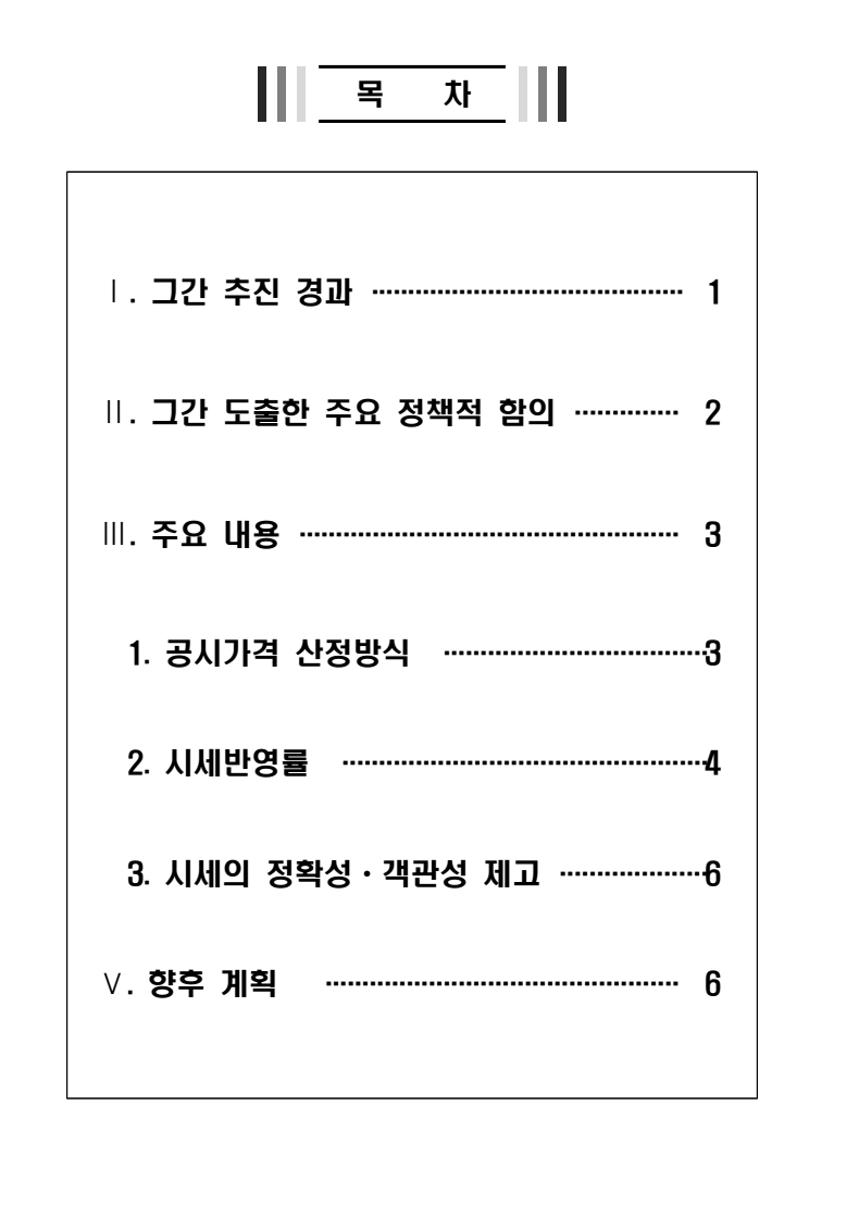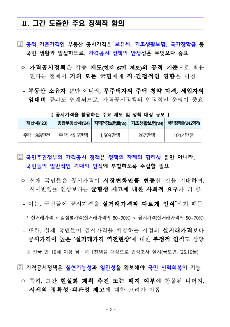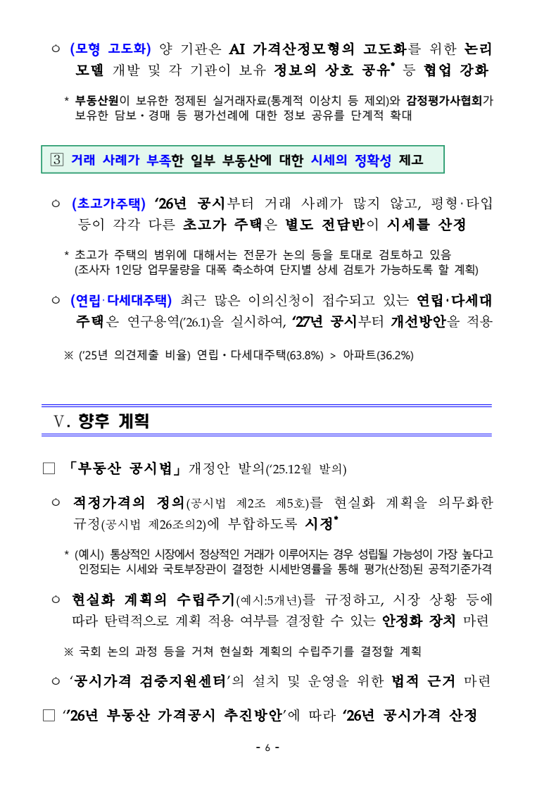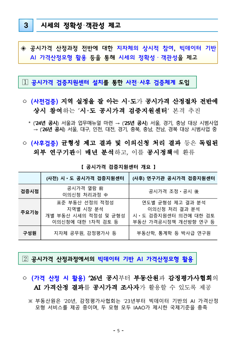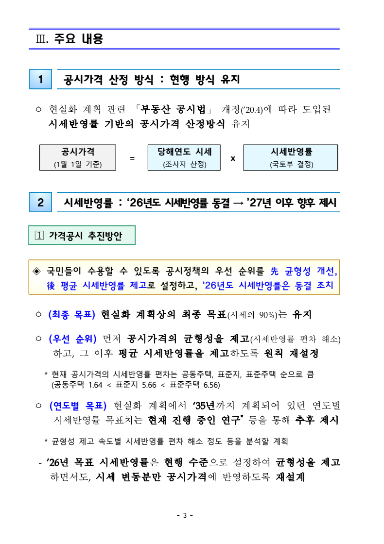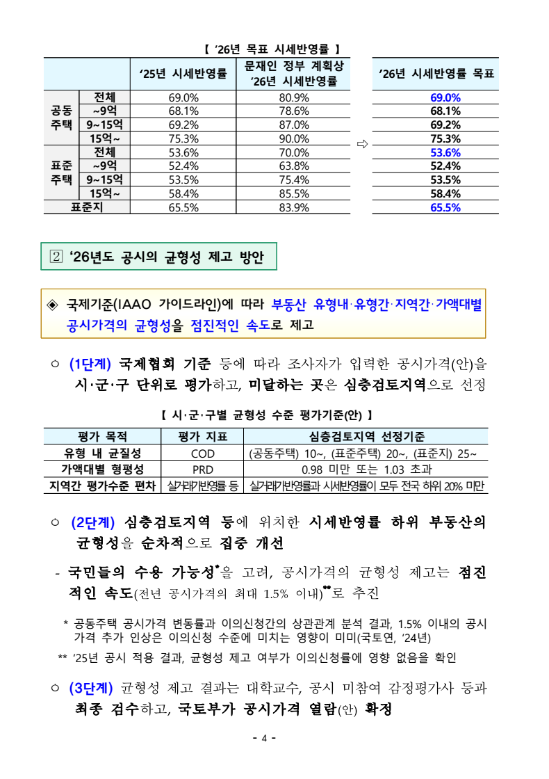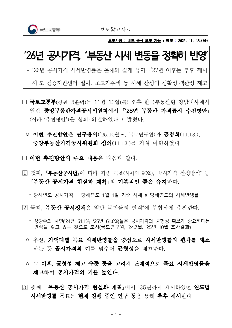 - 1 - 보도참고자료 보도시점 : 배포 즉시 보도 가능 / 배포 : 2025. 11. 13.(목) ’26년 공시가격, ‘부동산 시세 변동을 정확히 반영’ - ‘26년 공시가격 시세반영률은 올해와 같게 유지…’27년 이후는 추후 제시- 시·도 검증지원센터 설치, 초고가주택 등 시세 산정의 정확성·객관성 제고□ 국토교통부(장관 김윤덕)는 11월 13일(목) 오후 한국부동산원 강남지사에서열린 중앙부동산가격공시위원회에서 「‘26년 부동산 가격공시 추진방안」 (이하 ‘추진방안’)을 심의ㆍ의결하였다고 밝혔다. ㅇ 이번 추진방안은 연구용역(’25.10월 ~, 국토연구원)과 공청회(11.13.), 중앙부동산가격공시위원회 심의(11.13.)를 거쳐 마련하였다. □ 이번 추진방안의 주요 내용은 다음과 같다. 첫째, 「부동산공시법」에 따라 최종 목표(시세의 90%), 공시가격 산정방식* 등「부동산 공시가격 현실화 계획」의 기본적인 틀은 유지한다. * 당해연도 공시가격 = 당해연도 1월 1일 기준 시세 X 당해연도의 시세반영률 둘째, 부동산 공시정책은 일반 국민들의 인식*에 부합하게 추진한다. * 상당수의 국민(‘24년 61.1%, ’25년 61.6%)들은 공시가격의 균형성 확보가 중요하다는인식을 갖고 있는 것으로 조사(국토연구원, ‘24.7월, ’25년 10월 조사결과) ㅇ 우선, 가액대별 목표 시세반영률을 중심으로 시세반영률의 편차를 해소하는 등 공시가격의 키를 맞추어 균형성을 제고한다. ㅇ 그 이후, 균형성 제고 수준 등을 고려해 단계적으로 목표 시세반영률을 제고하여 공시가격의 키를 높인다. 셋째, 「부동산 공시가격 현실화 계획」에서 ‘35년까지 제시하였던 연도별 시세반영률 목표는 현재 진행 중인 연구 등을 통해 추후 제시한다. - 2 - 넷째, ’26년도 목표 시세반영률은 금년 수준과 동일하게 유지하며, 공시가격의 균형성도 점진적(전년도 공시가격의 1.5% 이내)으로 제고한다. 공동주택 표준단독주택 표준지전체 ~9억 9~15억 15억~ 전체 ~9억 9~15억 15억~ (토지) 시세 반영률 69.0% 68.1% 69.2% 75.3% 53.6% 52.4% 53.5% 58.4% 65.5%【 ‘추진방안’에 따른 ’26년 목표 시세반영률 】 다섯째, 공시가격 검증지원센터를 통한 사전ㆍ사후 검증체계 도입, 빅데이터 기반 AI 가격 산정모형 활용, 초고가주택 전담반 구성 등 공시가격 산정에활용되는 시세의 정확성과 객관성도 한층 더 높인다. □ 이번 추진방안에 따라 산정된 ’26년의 최종 공시가격은 ’26년 상반기 최종 결정될 예정*이다. * (표준지ㆍ표준주택) 공시가격(안) 열람(‘25.12) → 공시가격 결정(’26.1) (공동주택) 공시가격(안) 열람(‘26.3) → 공시가격 결정(’26.4) □ 국토교통부 김윤덕 장관은 “현재 67개 제도에 활용되는 공적 기준가격인부동산 공시가격은 국민 생활과 매우 밀접”하다고 하면서, ㅇ “‘26년도 부동산 공시가격에 적용되는 시세반영률은 현재 수준으로 유지하되, 시세 산정의 정밀성도 높여, 부동산 시세 변동을 정확히 반영할 수 있도록 노력하겠다.”라고 밝혔다. 담당 부서 토지정책관 부동산평가과 책임자 과 장 정재원 (044-201-3422) 담당자 서기관 김부병 (044-201-3423) 주무관 박아현 (044-201-3427) 전문위원 최정환 (044-201-3431)