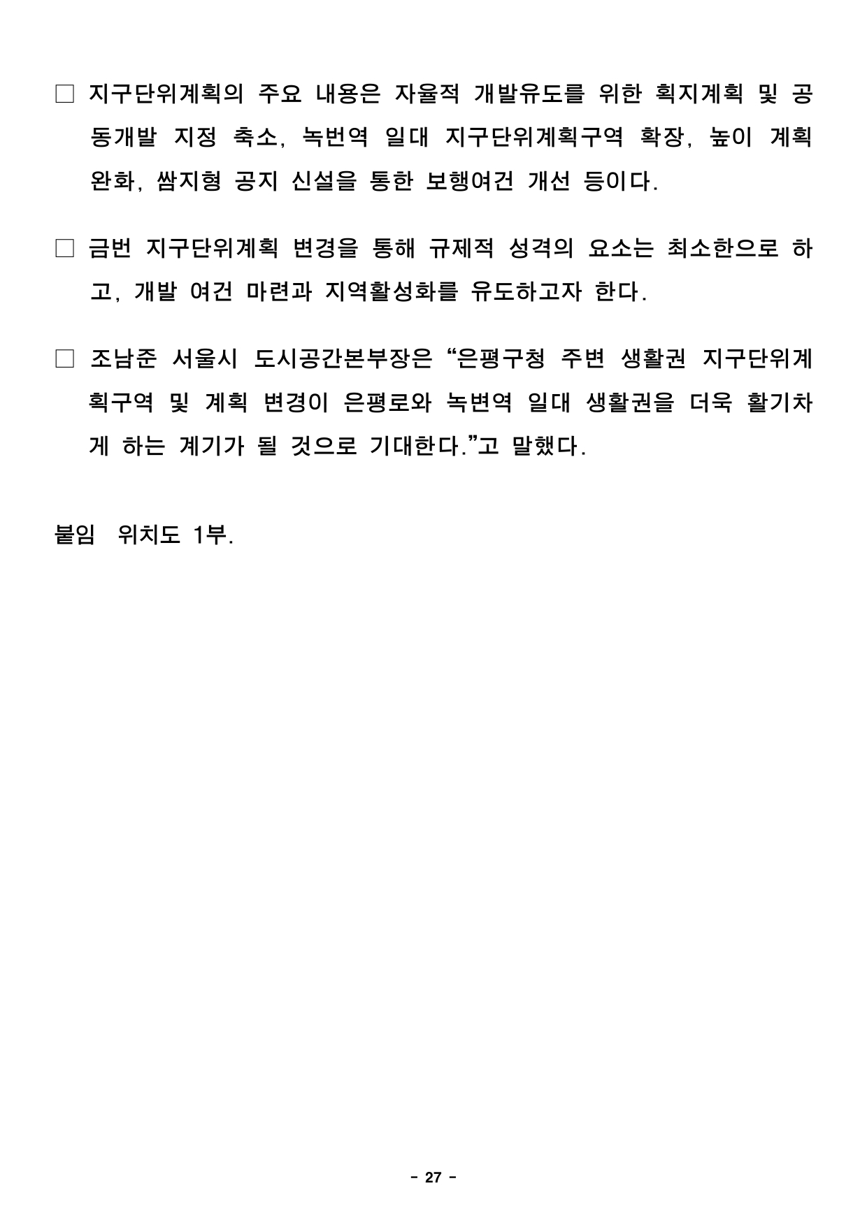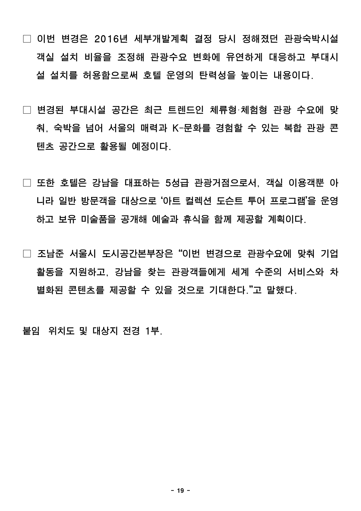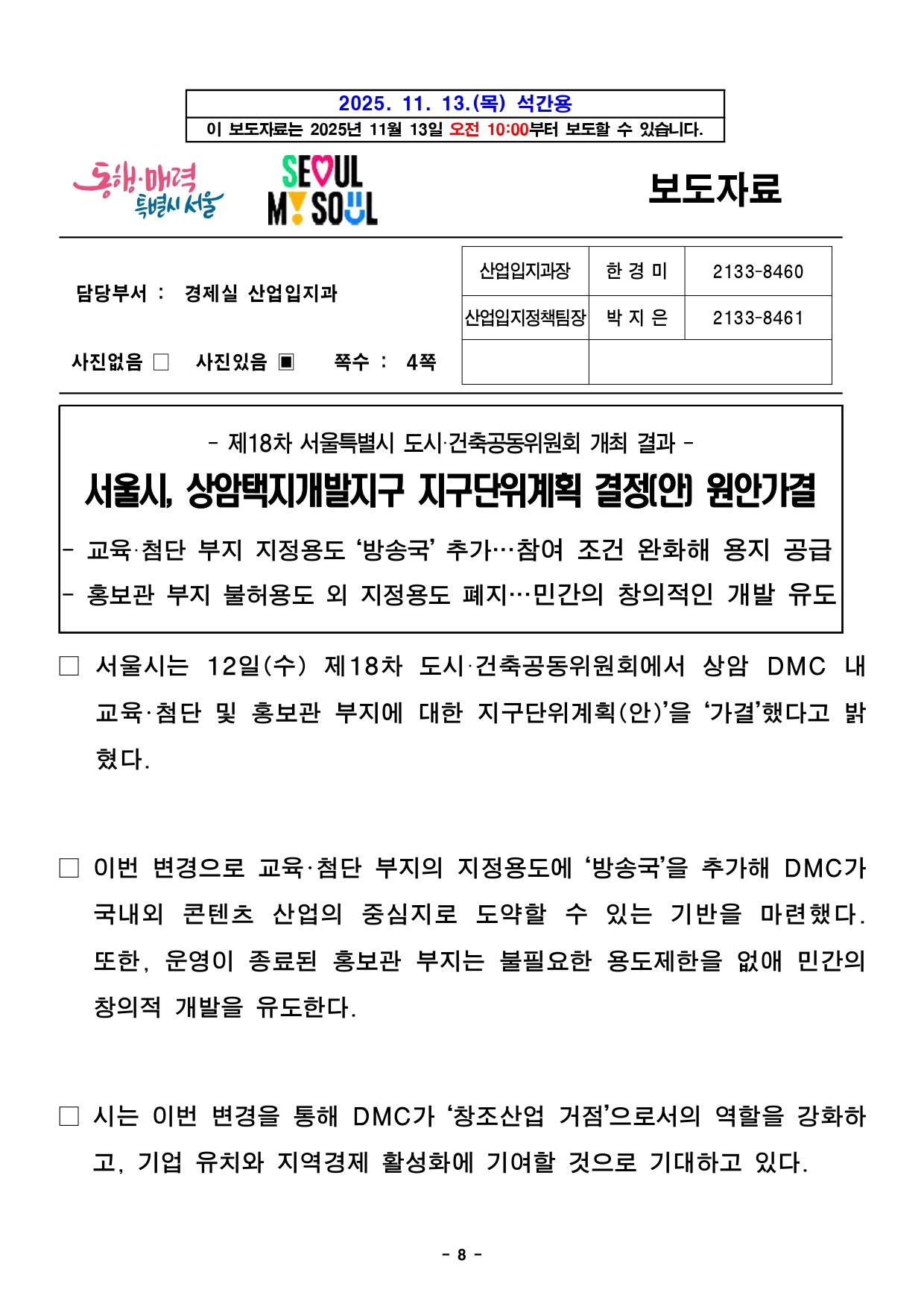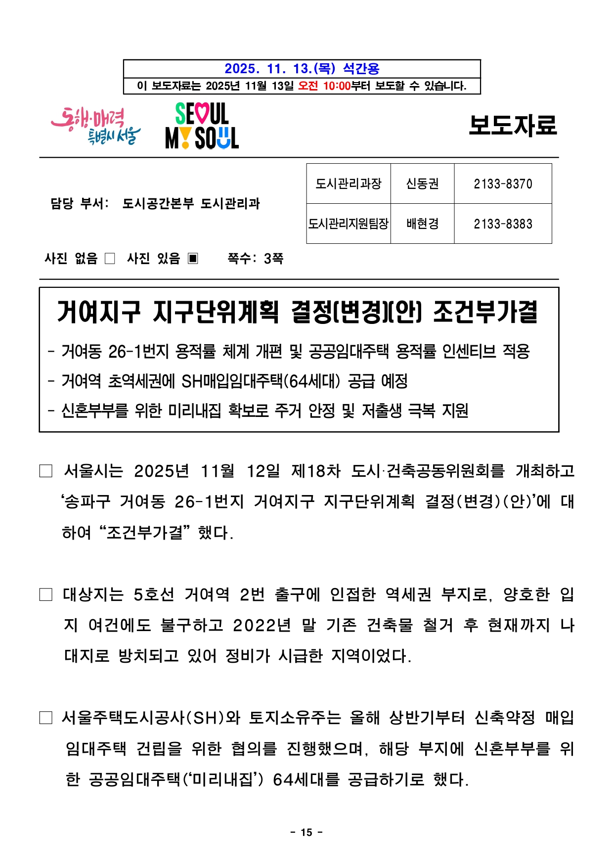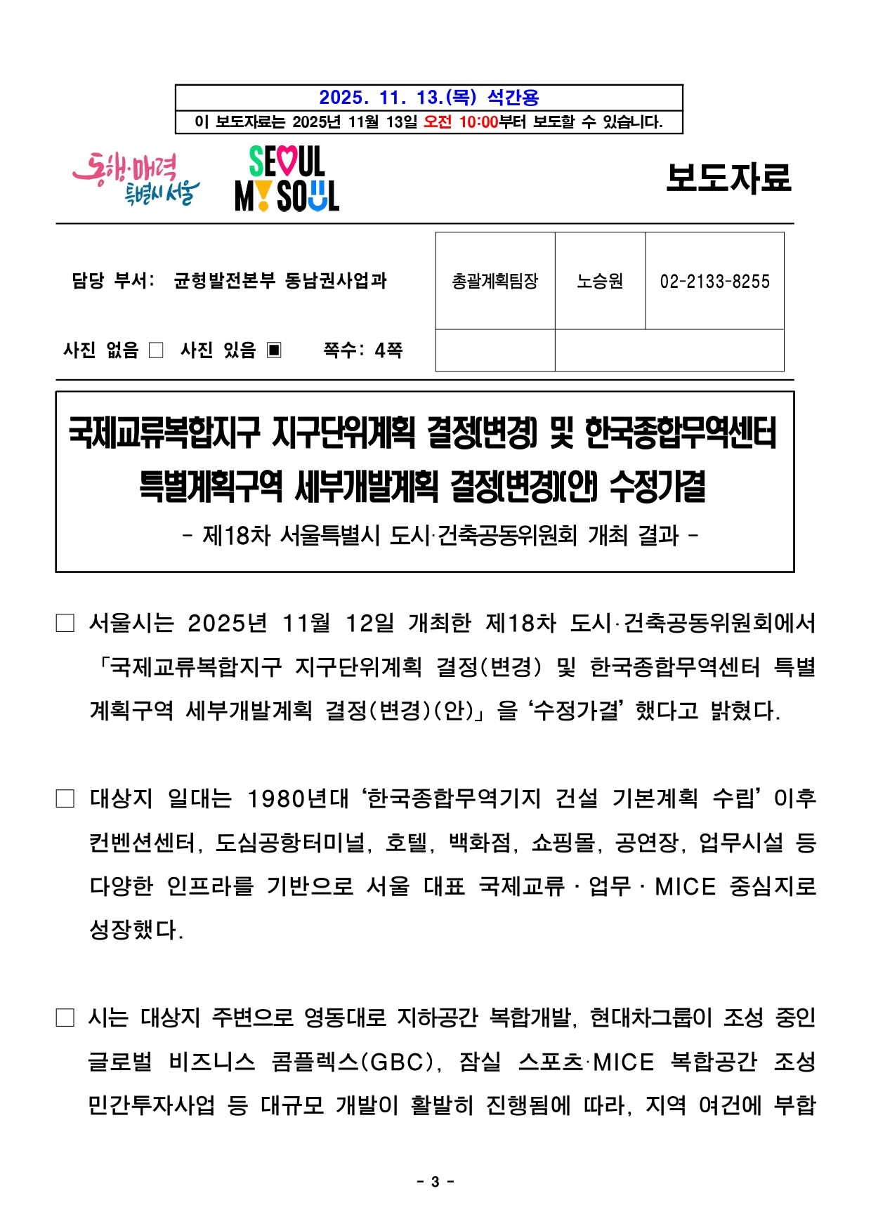 - 1 - 2025. 11. 13.(목) 석간용 이 보도자료는 2025년 11월 13일 오전 10:00부터 보도할 수 있습니다.보도자료담당부서 : 도시공간본부 도시관리과 도시관리과장 신동권 2133-8370 도시관리정책팀장 이현정 2133-8372 사진없음 ▣ 사진있음 □ 쪽수 : 2쪽 서울도시공간포털 (도시건축공동위원회) http://urban.seoul.go.kr (https://commission.eseoul.go.kr/ ) 제18차 서울특별시 도시·건축공동위원회 개최결과□ 금일 위원회 상정 안건 : 총 7건 ㅇ 원안가결 : 2건 ㅇ 수정가결 : 4건 ㅇ 조건부가결 : 1건 ※ 안건에 대한 자세한 내용은 붙임 소관부서에 문의하여 주시기 바랍니다. 붙임 개최결과 1부. 끝. - 2 - 제18차 도시건축공동위원회 개최결과【 2025.11.12. (수) 14:00 】 ▣ 총 7건 (심의 7건) 연 번 안건명 개 요 개최 결과 비고1 <심의> 국제교류복합지구 지구단위계획 결정(변경) 및 한국종합무역센타 특별계획구역 세부개발계획 결정(변경)(안) ○ 위 치 : 강남구 삼성동 159 일대(161,784.5㎡) ○ 내 용 : 코엑스~잠실종합운동장 일대 지구단위계획 결정(변경) 및 특별계획구역 결정(변경)(안) 심의 - 국제교류복합지구(코엑스~잠실운동장 일대) 지구단위계획 변경 - 한국종합무역센타 특별계획구역 세부개발계획 변경 수정가결 <동남권사업과> 총괄계획팀팀장 : 노승원담당 : 채기현/이은중(2133-8254/8258) 2 <심의> 상암택지개발지구 지구단위계획 결정(변경) ○ 위 치 : 마포구 상암동 509-7 일원(1,690,171.6㎡) ○ 내 용 : 택지개발지구 지구단위계획 결정(변경)(안) 심의 - DMC 택지개발지구 내 미매각 교육첨단용지 지정용도 변경 원안가결 <산업입지과> 산업입지정책팀팀장 : 박지은담당 : 박광수(2133-8465) 3 <심의> 왕십리광역중심 지구단위계획구역 및 계획(변경), 성동구 행당동 293-11 일원 역세권 활성화사업 지구단위계획구역 지정 및 계획 결정(안) ○ 위 치 : 성동구 행당동 293-11 일대(4,994㎡) ○ 내 용 : 역세권 활성화사업 추진을 위한 지구단위계획구역 지정 및 계획 결정(안) 심의 - 왕십리광역중심 지구단위계획구역 변경(218,000㎡ → 213,006㎡) - 행당동 293-11 일원 역세권활성화사업 지구단위계획구역 지정 - 용도지역 변경 : 준주거지역 → 일반상업지역 수정가결 <도시공간전략과> 복합개발전략팀팀장 : 공경배담당 : 송영기(2133-4656) 4 <심의> 거여지구 지구단위계획(거여동 26-1번지) 결정(변경) ○ 위 치 : 송파구 거여동 26-1번지(920.5㎡) ○ 내 용 : 매입임대주택 건립을 위한 거여지구 내 거여동 29-1번지 지구단위계획 결정(변경) 심의 - 상한용적률 항목 중첩에 따른 기반시설 충분여부 조건부 가결 <도시관리과> 도시관리지원팀팀장 : 배현경담당 : 장은교(2133-8384) 5 <심의> 테헤란로 지구단위계획 및 역삼동 676 특별계획구역 세부개발계획 결정(변경) ○ 위 치 : 강남구 역삼동 676번지 일대(18,489.7㎡) ○ 내 용 : 르네상스 호텔 재정비를 위한 지구단위계획 및 특별계획구역 세부개발계획 결정(변경) 심의 - 지정용도 내 주석에 명기된 객실 비율 변경 (관광숙박시설의 객실 비율 84.2%이상→80%이상) 원안가결 <도시관리과> 도시관리지원팀팀장 : 배현경담당 : 장은교(2133-8384) 6 <심의> 용산 지구단위계획구역 및 계획 결정(변경)(안) ○ 위 치 : 용산구 한강로 일대(3,467,822.2㎡) ○ 내 용 : 지구단위계획구역 및 계획 결정(변경) 심의 - 지구단위계획구역 변경 - 특별계획구역 신설 9개소, 해제 2개소 등 수정가결 <도시관리과> 도시관리지원팀팀장 : 배현경담당 : 최진혁(2133-8385) 7 <심의> 은평구청 주변 생활권 지구단위계획구역 및 계획 결정(변경) ○ 위 치 : 은평구 녹번동 185번지 일대(184,800㎡) ○ 내 용 : 지구단위계획구역 및 계획 결정(변경) 심의 - 구역 변경(125,300㎡ → 184,800㎡) - 획지계획 및 공동개발 계획 변경 - 건축물 계획 변경 수정가결 <도시관리과> 도시관리운용팀팀장 : 이종욱담당 : 김정윤(2133-8389) - 3 - 2025. 11. 13.(목) 석간용 이 보도자료는 2025년 11월 13일 오전 10:00부터 보도할 수 있습니다.보도자료담당 부서: 균형발전본부 동남권사업과 총괄계획팀장 노승원 02-2133-8255 사진 없음 □ 사진 있음 ▣ 쪽수: 4쪽 국제교류복합지구 지구단위계획 결정(변경) 및 한국종합무역센터 특별계획구역 세부개발계획 결정(변경)(안) 수정가결- 제18차 서울특별시 도시·건축공동위원회 개최 결과 - □ 서울시는 2025년 11월 12일 개최한 제18차 도시‧건축공동위원회에서「국제교류복합지구 지구단위계획 결정(변경) 및 한국종합무역센터특별계획구역 세부개발계획 결정(변경)(안)」을 ‘수정가결’ 했다고 밝혔다. □ 대상지 일대는 1980년대 ‘한국종합무역기지 건설 기본계획 수립’ 이후컨벤션센터, 도심공항터미널, 호텔, 백화점, 쇼핑몰, 공연장, 업무시설등다양한 인프라를 기반으로 서울 대표 국제교류․업무․MICE 중심지로성장했다. □ 시는 대상지 주변으로 영동대로 지하공간 복합개발, 현대차그룹이조성중인글로벌 비즈니스 콤플렉스(GBC), 잠실 스포츠·MICE 복합공간조성민간투자사업 등 대규모 개발이 활발히 진행됨에 따라, 지역 여건에부합 - 4 - 하는 외부공간의 재편과 기능 개선을 위해 지구단위계획을 결정(변경)했다고 설명했다. □ 이에 따라 현재 코엑스몰, 별마당 등 활발