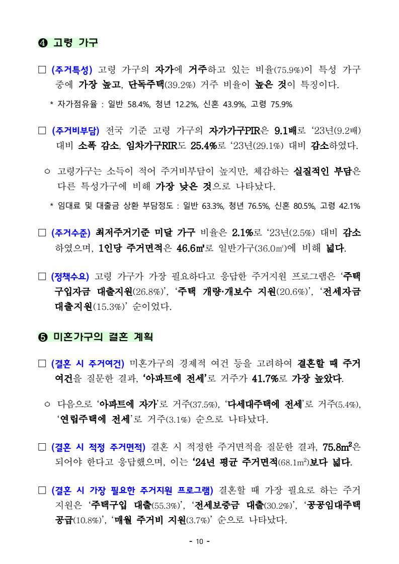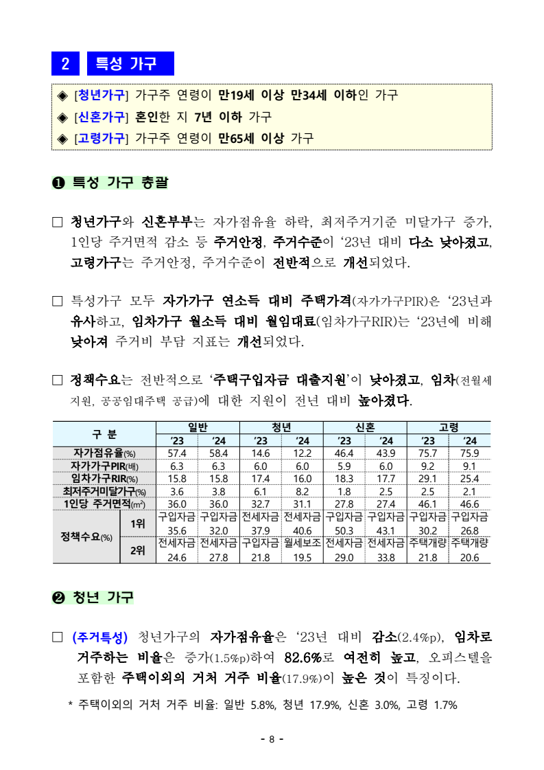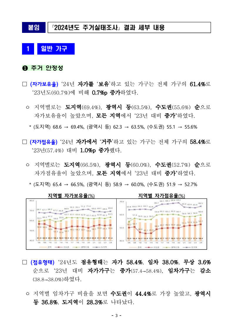 - 1 - 보도자료 보도시점 : 2025. 11. 16.(일) 11:00 이후(11. 17.(월) 조간) / 배포 : 2025. 11. 14.(금) 「2024년도 주거실태조사」 결과 □ 국토교통부(장관 김윤덕)는 전국 표본 6.1만 가구를 대상으로 조사한 2024년도 주거실태조사 결과를 발표하였다. ㅇ 주거실태조사는 국민 주거생활에 관한 전반적인 사항을 파악하고, 주택정책 수립 등에 참고하기 위해 매년 실시하는 표본조사로서주요 조사결과는 다음과 같다. □ 2024년도 주거실태조사 결과(요약) ㅇ 자가보유율 61.4% 및 자가점유율 58.4% - ‘23년 대비 증가, 자가보유율(60.7%→61.4%), 자가점유율(57.4%→58.4%) ㅇ 자가가구의 연소득 대비 주택가격 비율 6.3배 - ‘23년 대비 동일, 6.3배→6.3배(중위수 기준) ㅇ 임차가구의 월소득 대비 월임대료 비율 15.8% - ‘23년 대비 동일, 15.8%→15.8%(중위수 기준) ㅇ 1인당 주거면적 36.0m2 - ‘23년 대비 동일 36.0m2→36.0m2 ㅇ 최저주거기준 미달가구 비중 3.8% - ‘23년 대비 증가, 3.6%→3.8% ㅇ 평균 거주기간 8.4년 - ‘23년 대비 증가, 8.0년→8.4년 ㅇ 주거이동률(현재주택에 거주하고 있는 기간이 2년 이내인 비율) 30.3% - ‘23년 대비 감소, 32.2%→30.3% 주거실태조사 - 2 - 담당 부서 주택정책관 책임자 과 장 이유리 (044-201-3317) < 총괄 > 주택정책과 담당자 사무관 고명윤 (044-201-3333) 주거복지정책관 책임자 과 장 최정민 (044-201-4504) 주거복지정책과 담당자 사무관 한 수 (044-201-3360) 국토 주택·부동산 책임자 선임연구위원 강미나 (044-960-0349) 연구원 연구본부 담당자 연구원 이건우 (044-960-0318) - 3 - 붙임 「2024년도 주거실태조사」 결과 세부 내용 1 일반 가구 ❶ 주거 안정성 □ (자가보유율) ‘24년 자가를 ‘보유’하고 있는 가구는 전체 가구의 61.4%로‘23년도(60.7%)에 비해 0.7%p 증가하였다. ㅇ 지역별로는 도지역(69.4%), 광역시 등(63.5%), 수도권(55.6%) 순으로 자가보유율이 높았으며, 모든 지역에서 ‘23년 대비 증가*하였다. * (도지역) 68.6 → 69.4%, (광역시 등) 62.3 → 63.5%, (수도권) 55.1 → 55.6% □ (자가점유율) ‘24년 자가에서 ‘거주’하고 있는 가구는 전체 가구의 58.4%로‘23년(57.4%) 대비 1.0%p 증가했다. ㅇ 지역별로는 도지역(66.5%), 광역시 등(60.0%), 수도권(52.7%) 순으로 자가점유율이 높았으며, 모든 지역에서 ‘23년 대비 증가*하였다. * (도지역) 65.4 → 66.5%, (광역시 등) 58.9 → 60.0%, (수도권) 51.9 → 52.7% 지역별 자가보유율(%) 지역별 자가점유율(%) □ (점유형태) ‘24년도 점유형태는 자가 58.4%, 임차 38.0%, 무상 3.6% 순으로 ‘23년 대비 자가가구는 증가(57.4→58.4%), 임차가구는 감소(38.8→38.0%)하였다. ㅇ 지역별 임차가구 비율을 보면 수도권이 44.4%로 가장 높았고, 광역시 등 36.8%, 도지역이 28.3%로 나타났다. - 4 - 점유형태 비율(%) 지역별 점유형태 비율(%) ❷ 주거비 부담 □ (자가가구) ‘24년도 자가가구의 연소득 대비 주택가격 비율(자가가구 PIR)은 전국 6.3배(중위수)로 ‘23년과 동일한 수준으로 나타났다. ㅇ 지역별로는 수도권, 광역시 등, 도지역 순으로 수도권이 8.7배로 ‘23년(8.5배) 대비 증가했으며, 광역시 등이 ‘23년과 동일한 6.3배, 도지역은 ‘23년(3.7배) 대비 증가한 4.0배를 기록하였다. □ (임차가구) ‘24년도 전국 임차가구의 월소득 대비 월임대료 비율(임차가구 RIR)은 15.8%(중위수)로 ‘23년과 동일하게 나타났다. ㅇ 지역별로는 수도권이 18.4%로 가장 높았고, 광역시 등이 15.2%, 도지역 12.7% 순으로 나타났고, 모두 ‘23년 대비 감소*하였다. * (수도권) 20.3 → 18.4%, (광역시 등) 15.3 → 15.2%, (도지역) 13.0 → 12.7% 자가가구 연소득 대비 주택가격 비율(배) 임차가구 월소득 대비 월임대료 비율(%) - 5 - □ (생애최초 주택 마련 소요연수) 가구주가 된 이후 생애최초 주택을 마련하는데 소요된 연수는 ‘24년 7.9년으로 ‘23년(7.7년) 대비 약 2개월 늘어났다. 생애최초 주택마련 소요연수(년) 구 분 2018 2019 2020 2021 2022 2023 2024 소요연수 7.1 6.9 7.7 7.7 7.4 7.7 7.9 ❸ 주거수준 및 만족도 □ (1인당 주거면적) ‘24년도 1인당 주거면적은 36.0m2으로 ‘23년과 동일한 수준이며, 도지역(40.2m 2 ), 광역시 등(36.7m 2 ), 수도권(33.0m 2 ) 순이었다. ㅇ 가구당 평균 주거면적은 ’23년 대비 소폭 감소*하였다. * 가구당 주거면적(’23→‘24): 68.9m2→68.1m2 □ (최저주거기준 미달가구) ‘24년도 최저주거기준 미달가구 비율은 3.8%로 ‘23년(3.6%) 대비 0.2%p 증가하였다. 1인당 주거면적(m2 ) 최저주거기준 미달가구(%) □ (주택 및 주거환경 만족도) ‘24년 주택 만족도(3.01→3.03점)와 주거환경 만족도(2.99→3.01점) 모두 ‘23년 대비 증가한 것으로 나타났다. ㅇ 주택 만족도는 도지역(3.05점), 광역시 등(3.03점), 수도권(3.00점) 순으로높았으며, 주거환경 만족도는 수도권, 광역시 등, 도지역 모두 3.01점으로 동일하게 나타났다. - 6 - 주택 및 주거환경 만족도(점) 구 분 2018 2019 2020 2021 2022 2023 2024 주택 만족도 2.98 3.00 3.00 3.00 3.00 3.01 3.03 지역별 수도권 2.96 2.98 2.99 2.98 2.98 2.97 3.00 광역시 등 3.02 3.06 3.02 3.04 3.01 3.04 3.03 도지역 2.97 2.99 3.00 2.99 3.03 3.03 3.05 주거환경 만족도 2.94 2.94 2.97 2.96 2.96 2.99 3.01 지역별 수도권 2.94 2.96 2.98 2.97 2.96 2.98 3.01 광역시 등 2.98 3.00 3.00 3.01 2.98 3.02 3.01 도지역 2.92 2.88 2.93 2.92 2.96 2.98 3.01 * 4점 척도로 1에 가까울수록 ’