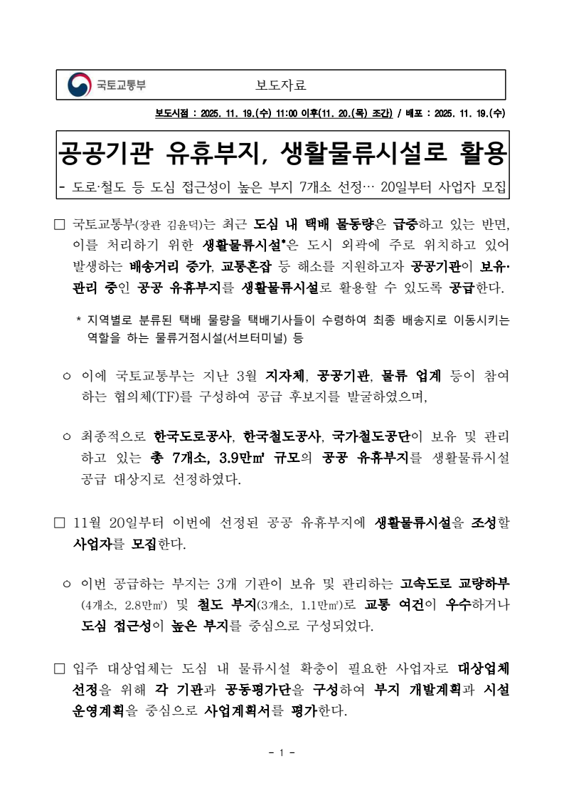 - 1 - 보도자료 보도시점 : 2025. 11. 19.(수) 11:00 이후(11. 20.(목) 조간) / 배포 : 2025. 11. 19.(수) 공공기관 유휴부지, 생활물류시설로 활용 - 도로·철도 등 도심 접근성이 높은 부지 7개소 선정… 20일부터 사업자 모집 □ 국토교통부(장관 김윤덕)는 최근 도심 내 택배 물동량은 급증하고 있는 반면, 이를 처리하기 위한 생활물류시설*은 도시 외곽에 주로 위치하고 있어 발생하는 배송거리 증가, 교통혼잡 등 해소를 지원하고자 공공기관이 보유· 관리 중인 공공 유휴부지를 생활물류시설로 활용할 수 있도록 공급한다. * 지역별로 분류된 택배 물량을 택배기사들이 수령하여 최종 배송지로 이동시키는 역할을 하는 물류거점시설(서브터미널) 등 ㅇ 이에 국토교통부는 지난 3월 지자체, 공공기관, 물류 업계 등이 참여하는 협의체(TF)를 구성하여 공급 후보지를 발굴하였으며, ㅇ 최종적으로 한국도로공사, 한국철도공사, 국가철도공단이 보유 및 관리하고 있는 총 7개소, 3.9만㎡ 규모의 공공 유휴부지를 생활물류시설 공급 대상지로 선정하였다. □ 11월 20일부터 이번에 선정된 공공 유휴부지에 생활물류시설을 조성할 사업자를 모집한다. ㅇ 이번 공급하는 부지는 3개 기관이 보유 및 관리하는 고속도로 교량하부(4개소, 2.8만㎡) 및 철도 부지(3개소, 1.1만㎡)로 교통 여건이 우수하거나 도심 접근성이 높은 부지를 중심으로 구성되었다. □ 입주 대상업체는 도심 내 물류시설 확충이 필요한 사업자로 대상업체 선정을 위해 각 기관과 공동평가단을 구성하여 부지 개발계획과 시설 운영계획을 중심으로 사업계획서를 평가한다. - 2 - ㅇ 중소·중견 업체에 대해서는 평가 시 가점을 부여하여 우대하며, 특히, 이번 공모부터는 종사자 근로여건 개선을 유도하기 위해 자동분류기 설치 여부, 우천·동절기 대비 시설계획, 휴게시설 등 종사자 안전과 근로여건에 대한 평가도 강화한다. □ 참여를 희망하는 업체는 11월 20일(목)부터 각 기관별 누리집*에 게시될 모집공고문을 확인하여 입찰에 참여하면 된다. * (한국도로공사) www.ex.co.kr (한국철도공사) www.korail.com (국가철도공단) www.kr.or.kr ㅇ 아울러, 11월 27일(목) 오후 한국통합물류협회에서 사업 설명회를 개최하여 사업대상 부지에 대한 설명과 사업계획서 작성요령 안내 등을 진행할 계획이다. □ 국토교통부 첨단물류과 심지영 과장은 “본 사업으로 도시 외곽 터미널 대비 배송 거리가 단축되어 교통혼잡 및 대기오염 완화 등 사회적 비용 절감 뿐 아니라 운행 피로도 감소 등 종사자 근로여건 개선도 기대한다”면서, ㅇ “앞으로도 적재적소에 물류시설이 지속 공급될 수 있도록 다각적 노력을기울이겠다”고 밝혔다. 담당 부서 물류정책관 책임자 과 장 심지영 (044-201-4006) 첨단물류과 담당자 사무관 이누리 (044-201-4007) 유관 기관 한국도로공사 담당자 팀 장 허오수 (054-811-3520) 한국철도공사 담당자 부 장 이유정 (042-615-4112) 국가철도공단 담당자 부 장 김정곤 (042-607-3832)