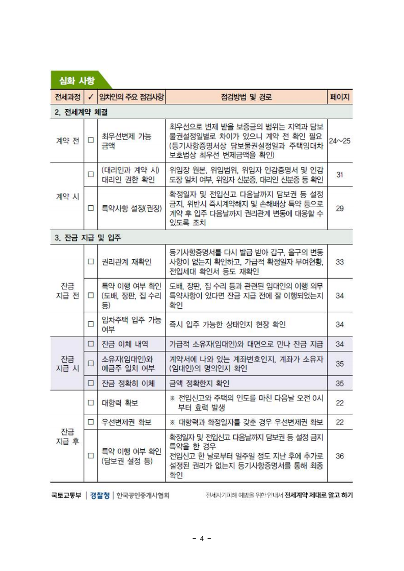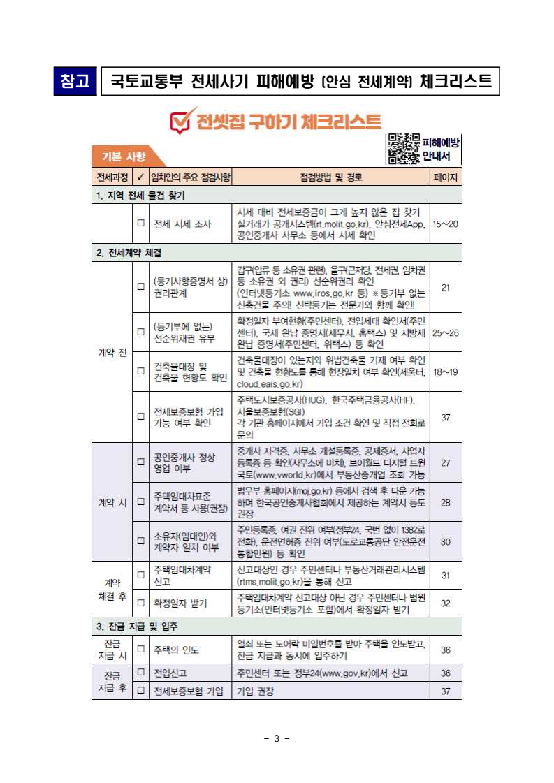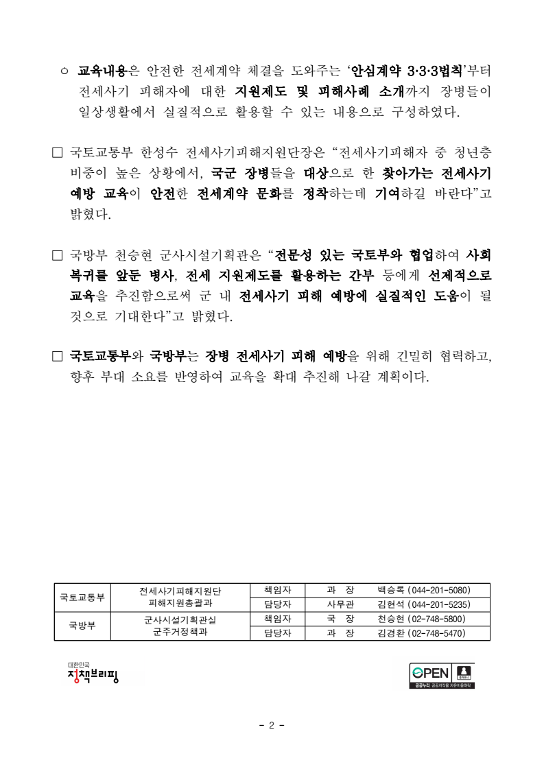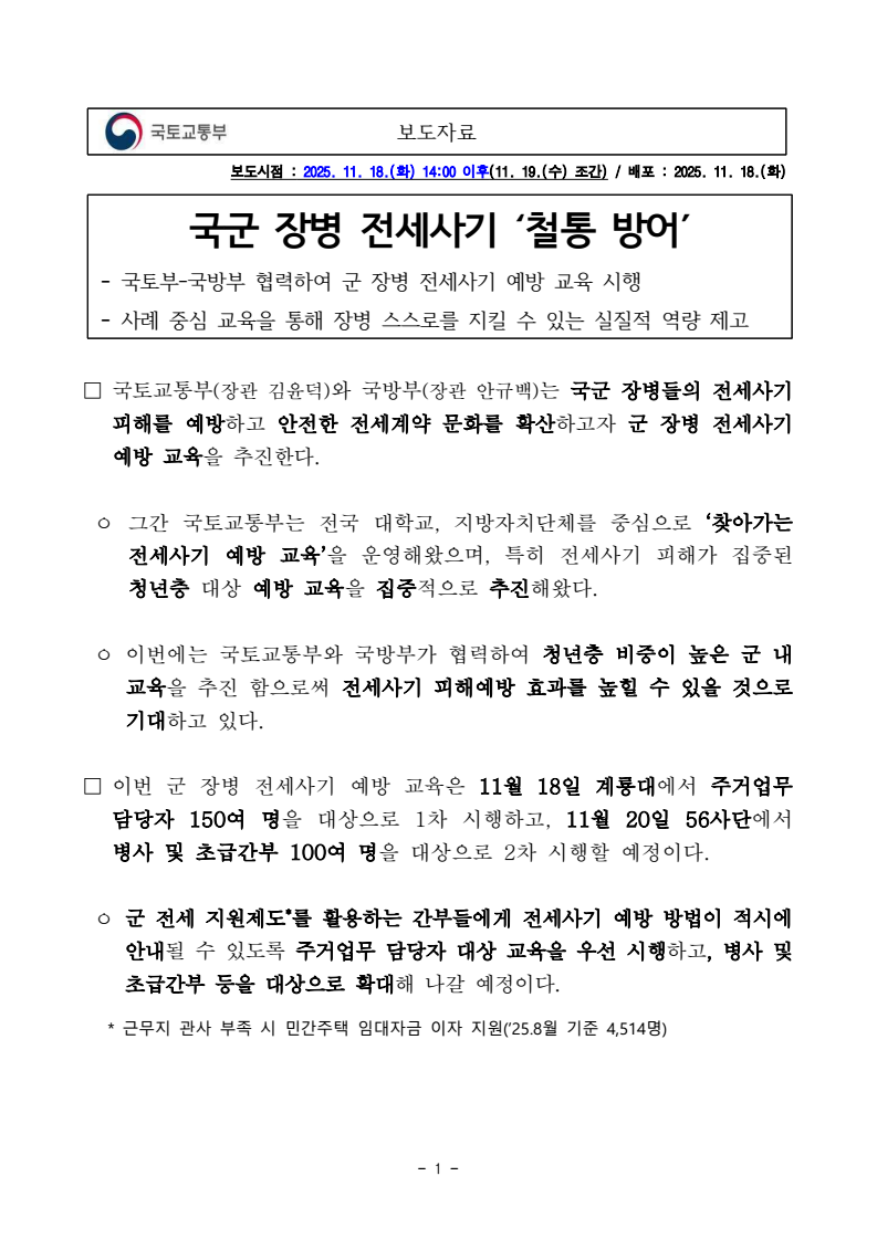 - 1 - 보도자료 보도시점 : 2025. 11. 18.(화) 14:00 이후(11. 19.(수) 조간) / 배포 : 2025. 11. 18.(화) 국군 장병 전세사기 ‘철통 방어’ - 국토부국방부 협력하여 군 장병 전세사기 예방 교육 시행 - 사례 중심 교육을 통해 장병 스스로를 지킬 수 있는 실질적 역량 제고□ 국토교통부(장관 김윤덕)와 국방부(장관 안규백)는 국군 장병들의 전세사기 피해를 예방하고 안전한 전세계약 문화를 확산하고자 군 장병 전세사기 예방 교육을 추진한다. ㅇ 그간 국토교통부는 전국 대학교, 지방자치단체를 중심으로 ‘찾아가는 전세사기 예방 교육’을 운영해왔으며, 특히 전세사기 피해가 집중된 청년층 대상 예방 교육을 집중적으로 추진해왔다. ㅇ 이번에는 국토교통부와 국방부가 협력하여 청년층 비중이 높은 군 내 교육을 추진 함으로써 전세사기 피해예방 효과를 높힐 수 있을 것으로 기대하고 있다. □ 이번 군 장병 전세사기 예방 교육은 11월 18일 계룡대에서 주거업무 담당자 150여 명을 대상으로 1차 시행하고, 11월 20일 56사단에서 병사 및 초급간부 100여 명을 대상으로 2차 시행할 예정이다. ㅇ 군 전세 지원제도*를 활용하는 간부들에게 전세사기 예방 방법이 적시에 안내될 수 있도록 주거업무 담당자 대상 교육을 우선 시행하고, 병사 및 초급간부 등을 대상으로 확대해 나갈 예정이다. * 근무지 관사 부족 시 민간주택 임대자금 이자 지원(’25.8월 기준 4,514명) - 2 - ㅇ 교육내용은 안전한 전세계약 체결을 도와주는 ‘안심계약 3·3·3법칙’부터 전세사기 피해자에 대한 지원제도 및 피해사례 소개까지 장병들이 일상생활에서 실질적으로 활용할 수 있는 내용으로 구성하였다. □ 국토교통부 한성수 전세사기피해지원단장은 “전세사기피해자 중 청년층 비중이 높은 상황에서, 국군 장병들을 대상으로 한 찾아가는 전세사기 예방 교육이 안전한 전세계약 문화를 정착하는데 기여하길 바란다”고 밝혔다. □ 국방부 천승현 군사시설기획관은 “전문성 있는 국토부와 협업하여 사회 복귀를 앞둔 병사, 전세 지원제도를 활용하는 간부 등에게 선제적으로 교육을 추진함으로써 군 내 전세사기 피해 예방에 실질적인 도움이 될 것으로 기대한다”고 밝혔다. □ 국토교통부와 국방부는 장병 전세사기 피해 예방을 위해 긴밀히 협력하고, 향후 부대 소요를 반영하여 교육을 확대 추진해 나갈 계획이다. 국토교통부 전세사기피해지원단 책임자 과 장 백승록 (044-201-5080) 피해지원총괄과 담당자 사무관 김현석 (044-201-5235) 국방부 군사시설기획관실 책임자 국 장 천승현 (02-748-5800) 군주거정책과 담당자 과 장 김경환 (02-748-5470) - 3 - 참고 국토교통부 전세사기 피해예방 (안심 전세계약) 체크리스트 - 4 -