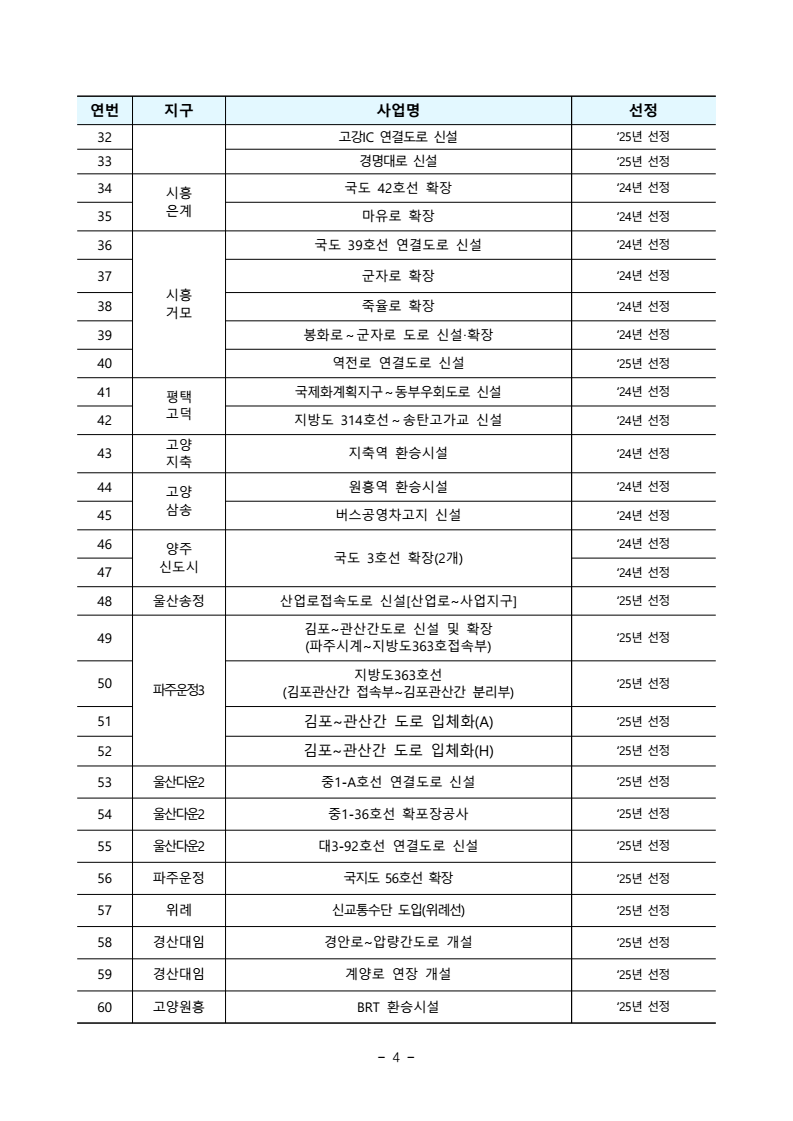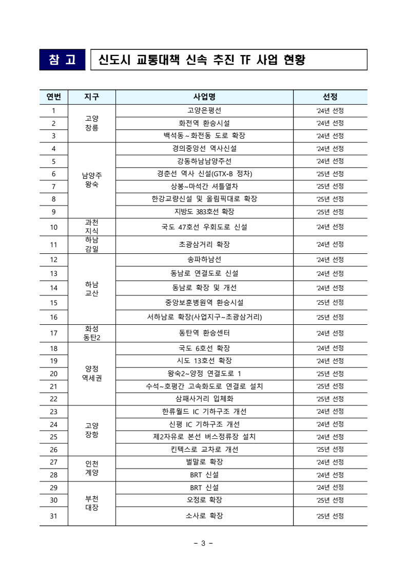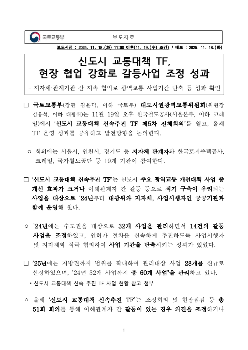 - 1 - 보도자료 보도시점 : 2025. 11. 18.(화) 11:00 이후(11. 19.(수) 조간) / 배포 : 2025. 11. 18.(화) 신도시 교통대책 TF, 현장 협업 강화로 갈등사업 조정 성과 - 지자체·관계기관 간 지속 협의로 광역교통 사업기간 단축 등 성과 확인 □ 국토교통부(장관 김윤덕, 이하 국토부) 대도시권광역교통위원회(위원장 김용석, 이하 대광위)는 11월 19일 오후 한국철도공사(서울본부, 이하 코레일)에서 ‘신도시 교통대책 신속추진 TF 제5차 전체회의’를 열고, 올해 TF 운영 성과를 공유하고 발전방향을 논의한다. ㅇ 회의에는 서울시, 인천시, 경기도 등 지자체 관계자와 한국토지주택공사, 코레일, 국가철도공단 등 19개 기관이 참여한다. □ ‘신도시 교통대책 신속추진 TF’는 신도시 주요 광역교통 개선대책 사업 중개선 효과가 크거나 이해관계자 간 갈등 등으로 적기 구축이 우려되는 사업을 대상으로 ’24년부터 대광위와 지자체, 사업시행자인 공공기관과 함께 운영해 왔다. ㅇ ’24년에는 수도권을 대상으로 32개 사업을 관리하면서 14건의 갈등사업을 조정하였고, 인허가 절차를 신속하게 추진하도록 사업시행자 및 지자체와 적극 협의하여 사업 기간을 단축시키는 성과가 있었다. □ ’25년에는 지방권까지 범위를 확대하여 관리대상 사업 28개를 신규로 선정하였으며, ’24년 32개 사업까지 총 60개 사업*을 관리하고 있다. * 신도시 교통대책 신속 추진 TF 사업 현황 참고 첨부 ㅇ 올해 ‘신도시 교통대책 신속추진 TF’는 조정회의 및 현장점검 등 총 51회 회의를 통해 이해관계자 간 갈등이 있는 경우 의견을 조정하거나 - 2 - 현실적인 대안을 마련하고, 인허가 지연사업의 경우 행정절차 단축방안을 논의하는 등 사업이 신속하게 추진될 수 있도록 하고, 사업별 세부 추진계획을 마련하였다. ㅇ 특히, 개정된 「광역교통법」(‘25.10.23일 시행)에 따라 새롭게 신설된 갈등조정 절차, 주요 도로사업계획의 국토교통부 직접 인허가등의 제도를 적극 활용하여 사업 속도를 정상궤도에 올리는 성과도 있었다. < 개정 「광역교통법」에 따른 갈등조정, 직접 인허가 추진 사례 > □ 김용석 대광위원장은 “신도시 개발에 수반되는 교통혼잡 문제를 해결하는 것은 국민 삶의 질과 직결되는 중요한 문제”라면서, ㅇ “앞으로도 TF와 함께 정책 현장에서 관계기관과 적극적으로 소통하며 광역교통시설이 적기에 추진될 수 있도록 최선을 다하겠다”라고 밝힐 예정이다. 담당 부서 광역교통정책국 책임자 과 장 김혜진 (044-201-5045) 광역교통정책과 담당자 담당자 사무관 주무관 전준영 강승구 (044-201-5049) (044-201-5057) ‣ (남양주 왕숙지구 경의중앙선 및 경춘선 역사신설 사업) 역사 신설 초기 운영손실비 부담주체 관련하여 지자체-사업시행자간 장기간 이어진 갈등에 대해 신설된 갈등조정 절차를 진행하여 대광위 조정안 마련 ‣ (하남 교산지구 동남로 연결도로 신설 사업) 둘 이상의 지자체를 통과하는 도로로서 각 지자체 인허가에 장기간이 소요되는 동남로 연결도로 등 3개 도로사업은 국토교통부에서 직접 사업계획 심의·의결하기로 협의 - 3 - 참 고 신도시 교통대책 신속 추진 TF 사업 현황 연번 지구 사업명 선정 1 고양 창릉 고양은평선 ‘24년 선정 2 화전역 환승시설 ‘24년 선정 3 백석동~화전동 도로 확장 ‘24년 선정 4 남양주 왕숙 경의중앙선 역사신설 ‘24년 선정 5 강동하남남양주선 ‘24년 선정 6 경춘선 역사 신설(GTX-B 정차) ‘25년 선정 7 상봉~마석간 셔틀열차 ‘25년 선정 8 한강교량신설 및 올림픽대로 확장 ‘25년 선정 9 지방도 383호선 확장 ‘25년 선정 10 과천 지식 국도 47호선 우회도로 신설 ‘24년 선정 11 하남 감일 초광삼거리 확장 ‘24년 선정 12 하남 교산 송파하남선 ‘24년 선정 13 동남로 연결도로 신설 ‘24년 선정 14 동남로 확장 및 개선 ‘24년 선정 15 중앙보훈병원역 환승시설 ‘25년 선정 16 서하남로 확장(사업지구~초광삼거리) ‘25년 선정 17 화성 동탄2 동탄역 환승센터 ‘24년 선정 18 양정 역세권 국도 6호선 확장 ‘24년 선정 19 시도 13호선 확장 ‘24년 선정 20 왕숙2~양정 연결도로 1 ‘25년 선정 21 수석~호평간 고속화도로 연결로 설치 ‘25년 선정 22 삼패사거리 입체화 ‘25년 선정 23 고양 장항 한류월드 IC 기하구조 개선 ‘24년 선정 24 신평 IC 기하구조 개선 ‘24년 선정 25 제2자유로 본선 버스정류장 설치 ‘24년 선정 26 킨텍스로 교차로 개선 ‘25년 선정 27 인천 계양 벌말로 확장 ‘24년 선정 28 BRT 신설 ‘24년 선정 29 부천 대장 BRT 신설 ‘24년 선정 30 오정로 확장 ‘25년 선정 31 소사로 확장 ‘25년 선정 - 4 - 연번 지구 사업명 선정 32 고강IC 연결도로 신설 ‘25년 선정 33 경명대로 신설 ‘25년 선정 34 시흥 은계 국도 42호선 확장 ‘24년 선정 35 마유로 확장 ‘24년 선정 36 시흥 거모 국도 39호선 연결도로 신설 ‘24년 선정 37 군자로 확장 ‘24년 선정 38 죽율로 확장 ‘24년 선정 39 봉화로~군자로 도로 신설‧확장 ‘24년 선정 40 역전로 연결도로 신설 ‘25년 선정 41 평택 고덕 국제화계획지구~동부우회도로 신설 ‘24년 선정 42 지방도 314호선~송탄고가교 신설 ‘24년 선정 43 고양 지축 지축역 환승시설 ‘24년 선정 44 고양 삼송 원흥역 환승시