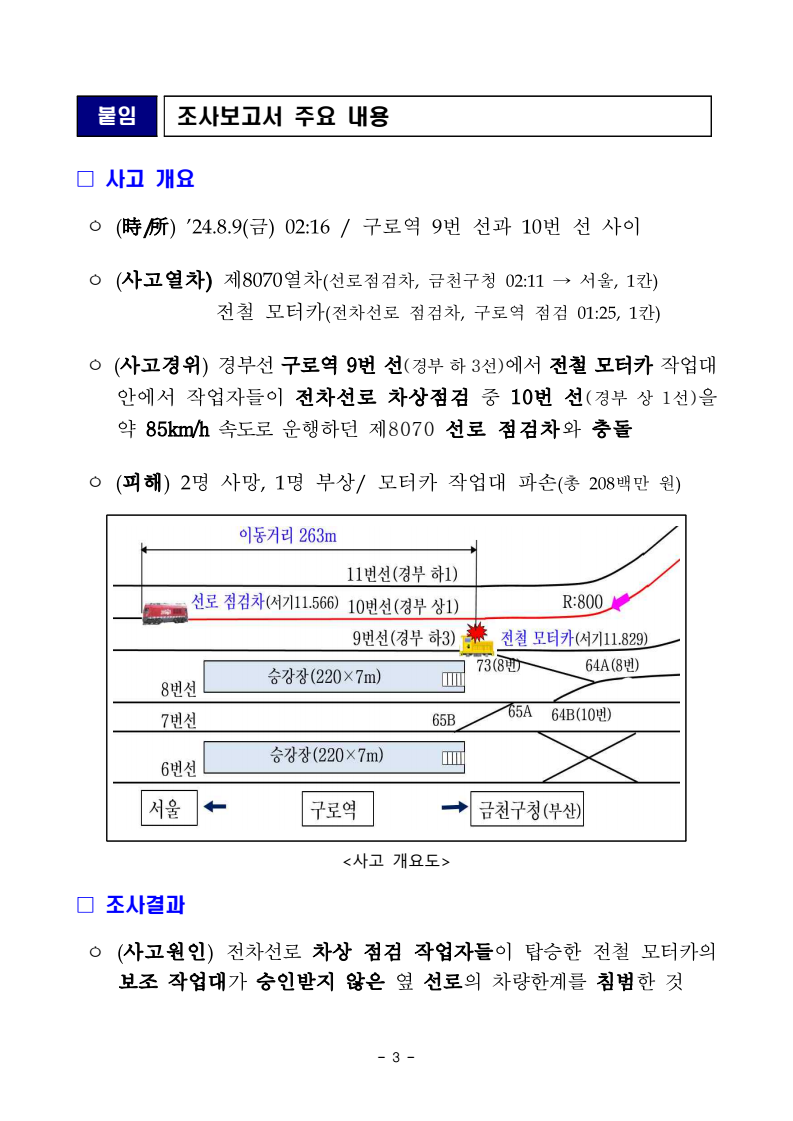 - 1 - 보도시점 : 2025. 11. 18.(화) 11:00 이후(11. 19.(수) 조간) / 배포 : 2025. 11. 18.(화) 구로역 충돌사고 조사 결과- 직접 원인은 작업대의 선로 침범, 작업통제체계 미흡 등 복합 요인도 확인- 전차선로 작업과 정거장 관리 등에 3건의 안전대책 마련 권고 □ 항공철도사고조사위원회(이하 사조위)는 지난 ’24년 8월 9일 새벽 2시 16분경 경부선 구로역에서 발생한 한국철도공사(이하 코레일)의 장비열차 간 충돌사고(작업자 2명 사망, 1명 부상)에 대한 조사결과를 발표했다. ㅇ 사고는 구로역 9번 선로에서 전기설비 점검을 위해 전철 모터카를 투입해 작업하는 중 발생했다. ㅇ 사전에 차단승인을 받지 않은 10번 선로 방향으로 작업대를 2.6m 펼쳐절연장치(애자) 교체 작업을 하던 중, 서울역으로 회송 중이던 선로 점검차가 약 85km/h 속도로 10번 선로에 진입하면서 충돌했다. ㅇ 선로 점검차 운전원은 충돌 직전 약 20m 앞에서 10번 선로로 넘어온 작업대를 발견하고 급제동을 시도했으나, 거리와 시간이 부족해 충돌을 피할 수 없었던 것으로 조사됐다. □ 사조위는 지난해 8월 코레일에 ‘① 선로 작업·점검 시 승인 구간 내에서 작업·점검이 이뤄지도록 엄격 관리, ② 모터카 작업대의 구조적인 특성을고려하여 사전에 안전 작업·점검 범위 확보 철저, ③ 모터카 작업·점검 구간의 인접선로 운행 열차·차량에 대한 통제 강화 방안 마련’하도록3건의 긴급 안전권고를 내린 바 있다. ㅇ 이후 사조위의 현장조사, 재연시험, 관계인 조사 등 종합적인 분석을 통해 조사한 결과, 직접적인 사고원인은 ‘작업자들이 탑승한 작업대가 옆 선로의 차량 운행 보호 구간을 침범한 것’으로 분석했다. ㅇ 특히, 10번과 11번 선로(또는 경부 상·하 1선)의 지장 작업 및 열차 운행을 적절하게 통제할 수 있는 운전취급체계가 마련되지 않은 점이 사고의 주요 기여요인 중 가장 핵심적인 요인으로 지적됐다. 보도자료 - 2 - ㅇ 작업계획 수립과 철도운행안전관리 협의가 충분히 이뤄지지 않았고, 임시 운전명령을 시스템에 등록하지 않아 임시 운행열차 계획이 반영되지않은 운전시행전달부를 사용하고 있는 점도 기여요인으로 확인됐다. □ 사조위는 이번 사고를 중대한 인명피해 사고로 보고, 코레일에 대해 전차선로 및 선로 내 작업 안전 강화, 정거장 구간 운전취급 보완, 열차운행 통제 개선 등 총 3건의 안전대책을 마련하도록 권고했다. ㅇ 첫째, 전차선로(선로 포함)에서의 작업 내용 및 구간을 명확히 명시하여 승인된 범위 내에서만 작업이 이루어지도록 관리체계를 강화해야 한다. 운전명령이나 임시 열차운행 계획을 사전에 반드시 확인하며, 작업자 안전 협의를 철저히 이행해 유사 사고가 재발하지 않도록 해야 한다. ㅇ 둘째, 정거장 구간(구로역 10·11번 또는 경부 상·하 1선)의 운전취급 및 경계 관리체계를 개선해야 한다. 운전취급 상 통제공간이 불분명한 구간에대해서는 운전취급 주체를 명확히 하고, 경계표지 등을 설치해 작업 중운행열차와의 충돌 위험을 사전에 차단해야 한다. ㅇ 셋째, 관계자 간 정보 공유 및 열차운행 통제 절차를 개선해 작업자가 열차 운행 상황을 인지할 수 있는 체계를 구축해야 한다. 운전취급자와 작업 책임자 간 통신체계 및 보고절차를 개선해 작업·운행 간 충돌 위험을 사전에 차단하는 것이 핵심이다. □ 사조위는 이번 권고사항이 현장에서 신속히 이행되도록 지속적으로 점검할 계획이다. 또한, 유사사고 재발 방지를 위한 관리체계를 강화하고, 조사기관으로서의 책무를 충실히 이행할 계획이다. □ 조사보고서 전문은 11월 18일 오전 11시 사조위 누리집(http://araib.molit.go.kr) 에서 공개된다. 담당 부서 항공·철도사고조사위원회 사무국 책임자 사무국장 김기훈 (044-201-5422) 담당자 사무관 전성진 (044-201-5429) 주무관 김지현 (044-201-5443) - 3 - 붙임 조사보고서 주요 내용 □ 사고 개요 ㅇ (時/所) ’24.8.9(금) 02:16 / 구로역 9번 선과 10번 선 사이 ㅇ (사고열차) 제8070열차(선로점검차, 금천구청 02:11 → 서울, 1칸) 전철 모터카(전차선로 점검차, 구로역 점검 01:25, 1칸) ㅇ (사고경위) 경부선 구로역 9번 선(경부 하 3선)에서 전철 모터카작업대안에서 작업자들이 전차선로 차상점검 중 10번 선(경부 상 1선)을약 85km/h 속도로 운행하던 제8070 선로 점검차와 충돌 ㅇ (피해) 2명 사망, 1명 부상/ 모터카 작업대 파손(총 208백만 원) <사고 개요도> □ 조사결과 ㅇ (사고원인) 전차선로 차상 점검 작업자들이 탑승한 전철 모터카의보조 작업대가 승인받지 않은 옆 선로의 차량한계를 침범한것 - 4 - ㅇ (기여요인) ① 사고지점(구로역 10·11번 선(경부 상ㆍ하 1선))의 지장 작업및열차운행을 적정하게 통제할 수 있는 운전취급1)체계가 마련되지않은점 ② 전차선로 차상 점검의 작업계획 수립이 미흡하였고, 철도운행안전협의서 작성 시 협의가 부족했던 점 ③ 영등포 전기사업소 전철부서는 철도운영정보시스템에서임시운전명령을 수신하고도 이를 등록하지 않아, 임시 열차등이 반영되지 않은 운전시행전달부2) 를 사용하고 있는 점□ 긴급안전권고(2024. 8. 14): 한국철도공사 3건 ① 선로(전차선로 포함)작업·점검시 승인 구간 내에서