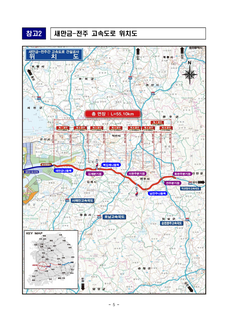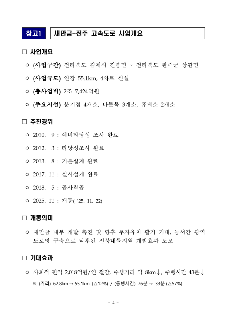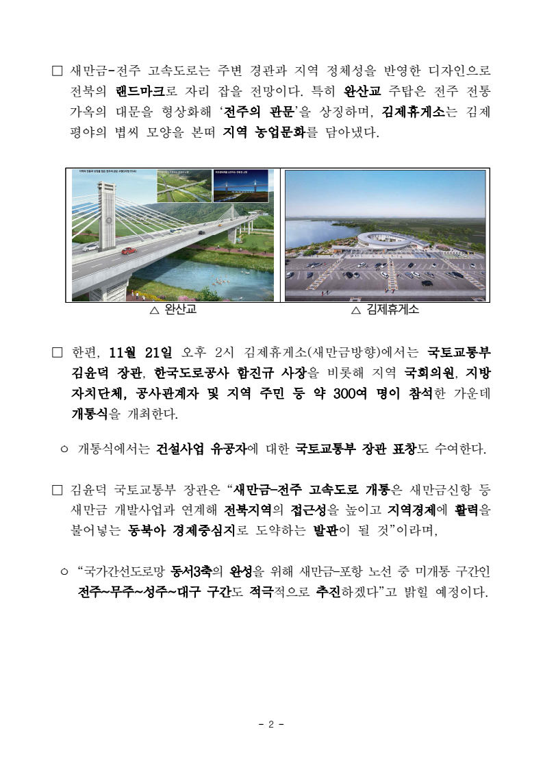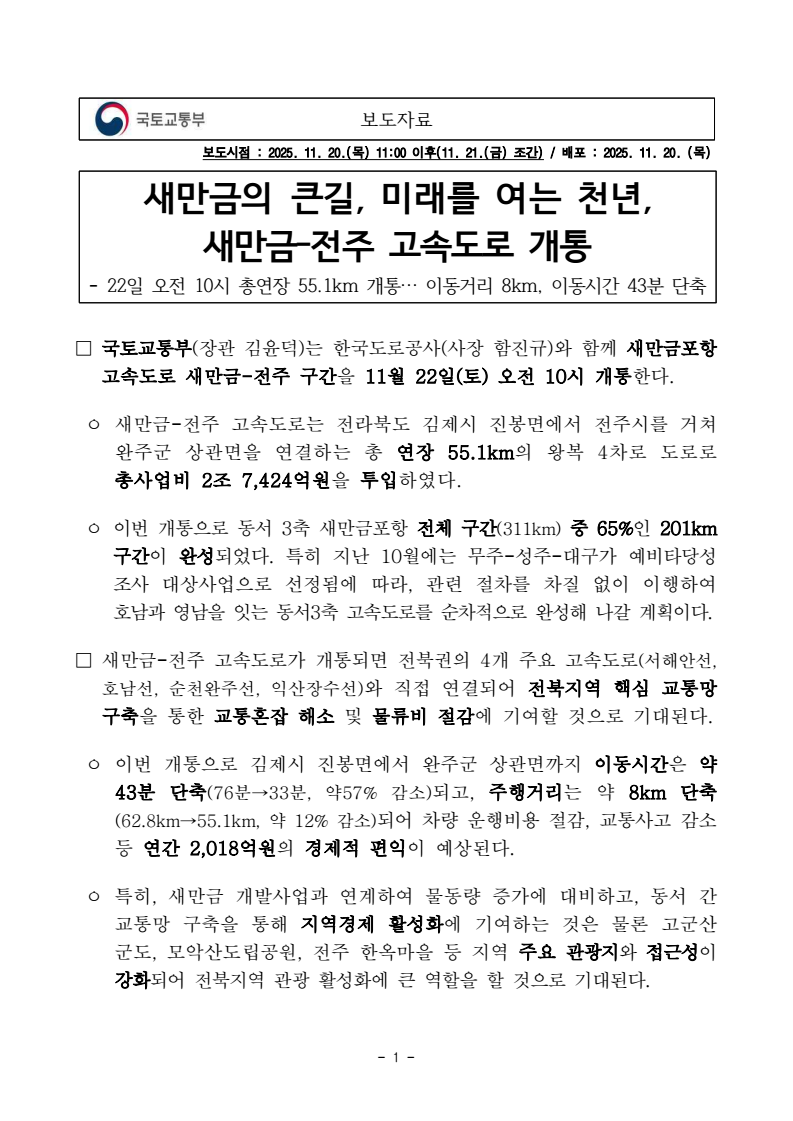 - 1 - 보도시점 : 2025. 11. 20.(목) 11:00 이후(11. 21.(금) 조간) / 배포 : 2025. 11. 20. (목) 새만금의 큰길, 미래를 여는 천년, 새만금-전주 고속도로 개통- 22일 오전 10시 총연장 55.1km 개통… 이동거리 8km, 이동시간 43분 단축□ 국토교통부(장관 김윤덕)는 한국도로공사(사장 함진규)와 함께 새만금포항고속도로 새만금-전주 구간을 11월 22일(토) 오전 10시 개통한다. ㅇ 새만금-전주 고속도로는 전라북도 김제시 진봉면에서 전주시를 거쳐 완주군 상관면을 연결하는 총 연장 55.1km의 왕복 4차로 도로로 총사업비 2조 7,424억원을 투입하였다. ㅇ 이번 개통으로 동서 3축 새만금포항 전체 구간(311km) 중 65%인 201km 구간이 완성되었다. 특히 지난 10월에는 무주-성주-대구가 예비타당성조사 대상사업으로 선정됨에 따라, 관련 절차를 차질 없이 이행하여호남과 영남을 잇는 동서3축 고속도로를 순차적으로 완성해 나갈 계획이다. □ 새만금-전주 고속도로가 개통되면 전북권의 4개 주요 고속도로(서해안선, 호남선, 순천완주선, 익산장수선)와 직접 연결되어 전북지역 핵심 교통망 구축을 통한 교통혼잡 해소 및 물류비 절감에 기여할 것으로 기대된다. ㅇ 이번 개통으로 김제시 진봉면에서 완주군 상관면까지 이동시간은 약 43분 단축(76분→33분, 약57% 감소)되고, 주행거리는 약 8km 단축(62.8km→55.1km, 약 12% 감소)되어 차량 운행비용 절감, 교통사고 감소등 연간 2,018억원의 경제적 편익이 예상된다. ㅇ 특히, 새만금 개발사업과 연계하여 물동량 증가에 대비하고, 동서 간 교통망 구축을 통해 지역경제 활성화에 기여하는 것은 물론 고군산 군도, 모악산도립공원, 전주 한옥마을 등 지역 주요 관광지와 접근성이 강화되어 전북지역 관광 활성화에 큰 역할을 할 것으로 기대된다. 보도자료 - 2 - □ 새만금-전주 고속도로는 주변 경관과 지역 정체성을 반영한 디자인으로전북의 랜드마크로 자리 잡을 전망이다. 특히 완산교 주탑은 전주 전통가옥의 대문을 형상화해 ‘전주의 관문’을 상징하며, 김제휴게소는 김제평야의 볍씨 모양을 본떠 지역 농업문화를 담아냈다. △ 완산교 △ 김제휴게소 □ 한편, 11월 21일 오후 2시 김제휴게소(새만금방향)에서는 국토교통부 김윤덕 장관, 한국도로공사 함진규 사장을 비롯해 지역 국회의원, 지방자치단체, 공사관계자 및 지역 주민 등 약 300여 명이 참석한 가운데 개통식을 개최한다. ㅇ 개통식에서는 건설사업 유공자에 대한 국토교통부 장관 표창도 수여한다. □ 김윤덕 국토교통부 장관은 “새만금–전주 고속도로 개통은 새만금신항 등새만금 개발사업과 연계해 전북지역의 접근성을 높이고 지역경제에 활력을불어넣는 동북아 경제중심지로 도약하는 발판이 될 것”이라며, ㅇ “국가간선도로망 동서3축의 완성을 위해 새만금–포항 노선 중 미개통 구간인전주~무주~성주~대구 구간도 적극적으로 추진하겠다”고 밝힐 예정이다. - 3 - 담당 부서 <총괄> 도로국 도로건설과 책임자 과 장 오수영 (044-201-3888) 담당자 사무관 송정규 (044-201-3889) 주무관 배현식 (044-201-3896) 전문위원 공규찬 (044-201-4780) <협조> 한국도로공사 책임자 처 장 손영호 (054-811-3001) 건설처 담당자 부 장 안병선 (054-811-3050) - 4 - 참고1 새만금-전주 고속도로 사업개요 □ 사업개요 ㅇ (사업구간) 전라북도 김제시 진봉면 ~ 전라북도 완주군 상관면ㅇ (사업규모) 연장 55.1km, 4차로 신설 ㅇ (총사업비) 2조 7,424억원 ㅇ (주요시설) 분기점 4개소, 나들목 3개소, 휴게소 2개소 □ 추진경위 ㅇ 2010. 9 : 예비타당성 조사 완료 ㅇ 2012. 3 : 타당성조사 완료 ㅇ 2013. 8 : 기본설계 완료 ㅇ 2017. 11 : 실시설계 완료 ㅇ 2018. 5 : 공사착공 ㅇ 2025. 11 : 개통( ’25. 11. 22) □ 개통의미 ㅇ 새만금 내부 개발 촉진 및 향후 투자유치 활기 기대, 동서간광역도로망 구축으로 낙후된 전북내륙지역 개발효과 도모 □ 기대효과 ㅇ 사회적 편익 2,018억원/연 절감, 주행거리 약 8km↓, 주행시간43분↓ ※ (거리) 62.8km → 55.1km (△12%) / (통행시간) 76분 → 33분 (△57%) - 5 - 참고2 새만금-전주 고속도로 위치도 새만금나들목 김제분기점 북김제나들목 서완주분기점 남전주나들목 동완주분기점 전주분기점