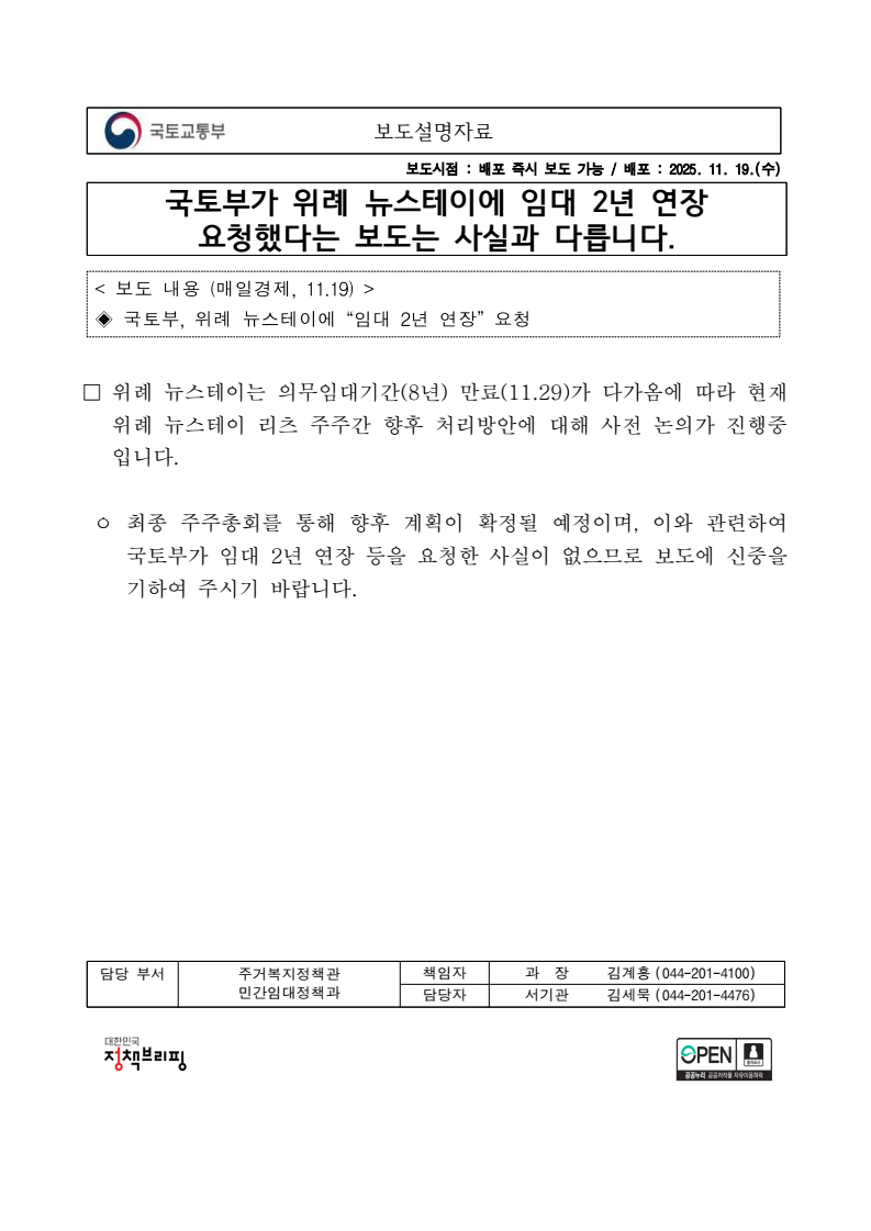 보도설명자료 보도시점 : 배포 즉시 보도 가능 / 배포 : 2025. 11. 19.(수) 국토부가 위례 뉴스테이에 임대 2년 연장 요청했다는 보도는 사실과 다릅니다. < 보도 내용 (매일경제, 11.19) > ◈ 국토부, 위례 뉴스테이에 “임대 2년 연장” 요청 □ 위례 뉴스테이는 의무임대기간(8년) 만료(11.29)가 다가옴에 따라 현재 위례 뉴스테이 리츠 주주간 향후 처리방안에 대해 사전 논의가 진행중입니다. ㅇ 최종 주주총회를 통해 향후 계획이 확정될 예정이며, 이와 관련하여 국토부가 임대 2년 연장 등을 요청한 사실이 없으므로 보도에 신중을 기하여 주시기 바랍니다. 담당 부서 주거복지정책관 책임자 과 장 김계흥 (044-201-4100) 민간임대정책과 담당자 서기관 김세묵 (044-201-4476)
