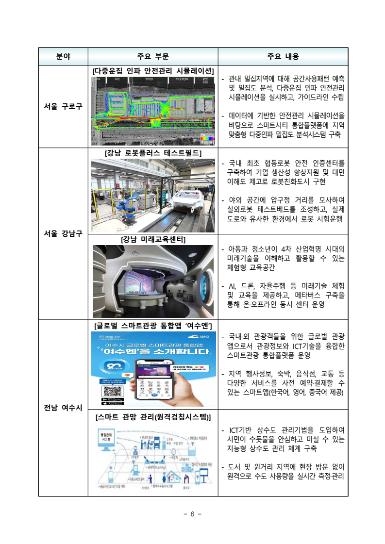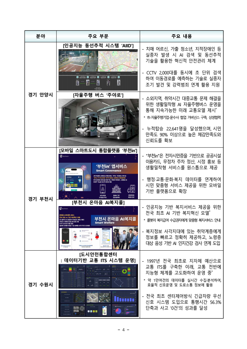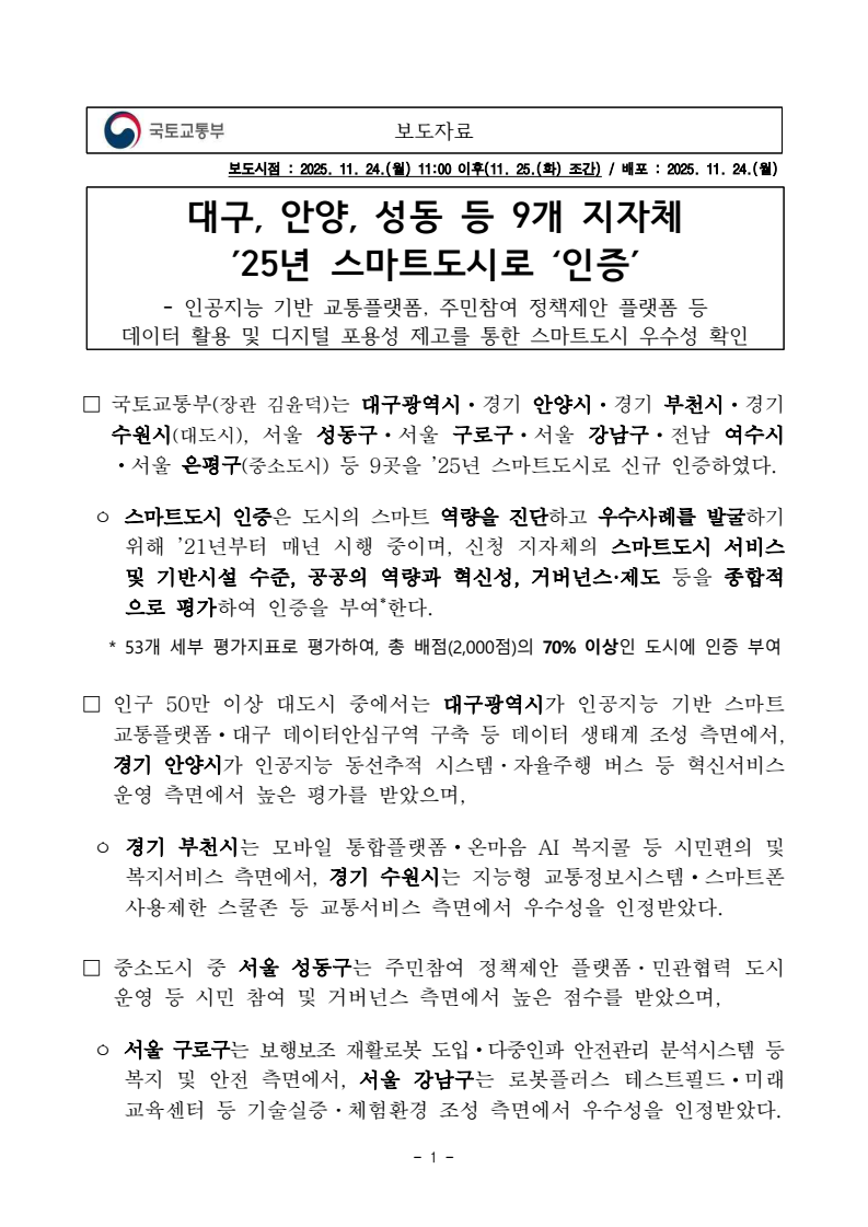 - 1 - 보도시점 : 2025. 11. 24.(월) 11:00 이후(11. 25.(화) 조간) / 배포 : 2025. 11. 24.(월) 대구, 안양, 성동 등 9개 지자체’25년 스마트도시로 ‘인증’ - 인공지능 기반 교통플랫폼, 주민참여 정책제안 플랫폼 등 데이터 활용 및 디지털 포용성 제고를 통한 스마트도시 우수성 확인□ 국토교통부(장관 김윤덕)는 대구광역시ㆍ경기 안양시ㆍ경기 부천시ㆍ경기 수원시(대도시), 서울 성동구ㆍ서울 구로구ㆍ서울 강남구ㆍ전남 여수시ㆍ서울 은평구(중소도시) 등 9곳을 ’25년 스마트도시로 신규 인증하였다. ㅇ 스마트도시 인증은 도시의 스마트 역량을 진단하고 우수사례를 발굴하기위해 ’21년부터 매년 시행 중이며, 신청 지자체의 스마트도시 서비스 및 기반시설 수준, 공공의 역량과 혁신성, 거버넌스·제도 등을 종합적으로 평가하여 인증을 부여*한다. * 53개 세부 평가지표로 평가하여, 총 배점(2,000점)의 70% 이상인 도시에 인증 부여□ 인구 50만 이상 대도시 중에서는 대구광역시가 인공지능 기반 스마트교통플랫폼ㆍ대구 데이터안심구역 구축 등 데이터 생태계 조성 측면에서, 경기 안양시가 인공지능 동선추적 시스템ㆍ자율주행 버스 등 혁신서비스운영 측면에서 높은 평가를 받았으며, ㅇ 경기 부천시는 모바일 통합플랫폼ㆍ온마음 AI 복지콜 등 시민편의 및 복지서비스 측면에서, 경기 수원시는 지능형 교통정보시스템ㆍ스마트폰사용제한 스쿨존 등 교통서비스 측면에서 우수성을 인정받았다. □ 중소도시 중 서울 성동구는 주민참여 정책제안 플랫폼ㆍ민관협력 도시운영 등 시민 참여 및 거버넌스 측면에서 높은 점수를 받았으며, ㅇ 서울 구로구는 보행보조 재활로봇 도입ㆍ다중인파 안전관리 분석시스템 등복지 및 안전 측면에서, 서울 강남구는 로봇플러스 테스트필드ㆍ미래교육센터 등 기술실증ㆍ체험환경 조성 측면에서 우수성을 인정받았다. 보도자료 - 2 - ㅇ 또한 전남 여수시는 글로벌 스마트관광ㆍ스마트 원격검침시스템, 서울 은평구는 교통약자의 이동 지원 플랫폼ㆍ서비스 등의 우수성을 인정받아 올해 처음*으로 스마트도시 인증을 받게 되었다. * 여수시, 은평구 외 7곳은 기존 인증 유효기간이 만료됨에 따라 ’25년 신규인증 신청□ 한편, ’23년 인증을 받은 도시들은 인증 재검토기간(2년)이 도래하여 지속 여부를 심사하였으며, 신청한 7곳* 모두 인증 연장이 결정되었다. * (대도시 3곳) 서울특별시, 경기 성남시, 울산시 (중소도시 4곳) 대구 수성구, 서울 관악구, 서울 송파구, 서울 종로구 □ 인증 대상으로 결정된 지자체에는 국내외에 우수한 스마트도시로 홍보될 수 있도록 국토교통부 장관 명의의 인증서와 함께 동판이 수여된다. □ 국토교통부 윤종빈 도시경제과장은 “인증제를 통해 국내 스마트도시 수준이지속적으로 높아지고 있음을 확인할 수 있었다”며, ㅇ “우수사례를 발굴하여 국내외로 확산될 수 있도록 적극 지원하는 한편, 체계적인 도시수준 진단을 통해 지역 간 기술격차 완화 등에도 정책적 지원을 강화해 나가겠다”라고 말했다. 담당 부서 도시정책관 책임자 과 장 윤종빈 (044-201-4845) 도시경제과 담당자 담당자 사무관 주무관 이지형 정공주 (044-201-4097) (044-201-4973) - 3 - 참 고 2025년 스마트도시 인증 우수사례 분야 주요 부문 주요 내용 ㅇ 대도시 4곳 대구광역시 [AI기반 스마트교통플랫폼] ‒ 대구시 주요 250개 교차로에 900여대의AI기반 엣지CCTV를 설치하고, 교통정보 13종에 대한 수집‧운영관리 플랫폼을 구축‒ 이와 연계하여 교통신호체계 알고리즘 개발및 디지털트윈 시뮬레이터를 개발‧구축* 시 유관부서 및 관계 공공기관에 상습 혼잡구간 교통데이터 등 교통량 분석을 위한 기초자료 제공[대구 데이터안심구역 구축] ‒ ‘25년 대구스마트시티센터 내에 데이터안심구역*을 구축하여, 시민들이 다양한 미개방데이터를 활용할 수 있는 환경 제공* 활용가치가 높은 미공개 공공·민간 데이터를 누구든지 안전하게 분석‧활용할 수 있는 플랫폼- 스마트시티 및 모빌리티 분야 지역특화 데이터, 금융‧의료‧연구 등 14분야에 대해171종 데이터를 확보, 수요기업에 제공[스마트도시 특화단지 조성 추진] ‒ 수성 알파시티 일원에 전국 최초로 스마트도시 특화단지 조성(‘25~’27년) ‒ 국산 반도체 활용 온디바이스 AI 서비스개발·실증을 위해 데이터 학습, 인프라, 규제특례 등을 지원하는 민간 개방형 R&D 생태계 조성 추진 경기 안양시 [안양시 스마트도시통합센터] - 시민들에게 안전·교통·방재·복지·환경 등 다양한 서비스를 통합적으로 제공하는 스마트도시통합센터 구축·운영* * 시민들이 스마트도시서비스를 체험·견학할 수 있도록 홍보체험관 운영, 주요 관광지로 기능 - 광자가통신망, loT기술과 안전 인프라를 활용하여 지능형 방범, 투망 감시, 맞춤형안전복지 및 지능형 교통서비스 등 제공 - 4 - 분야 주요 부문 주요 내용 경기 안양시 [인공지능 동선추적 시스템 ‘AIID’] - 치매 어르신, 가출 청소년, 지적장애인 등실종자 발생 시 AI 검색 및 동선추적 기술을 활용한 혁신적 안전관리 체계- CCTV 2,000대를 동시에 초 단위 검색하여 이동경로를 예측하는 기술로 실종자조기 