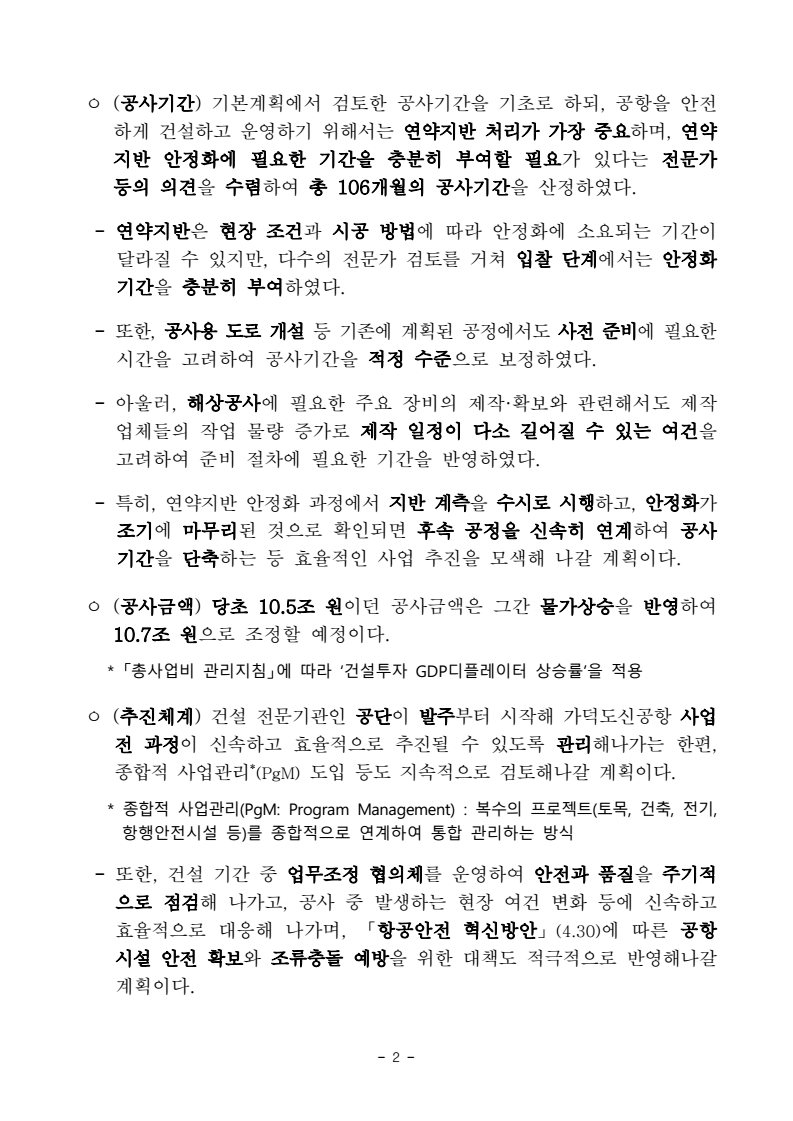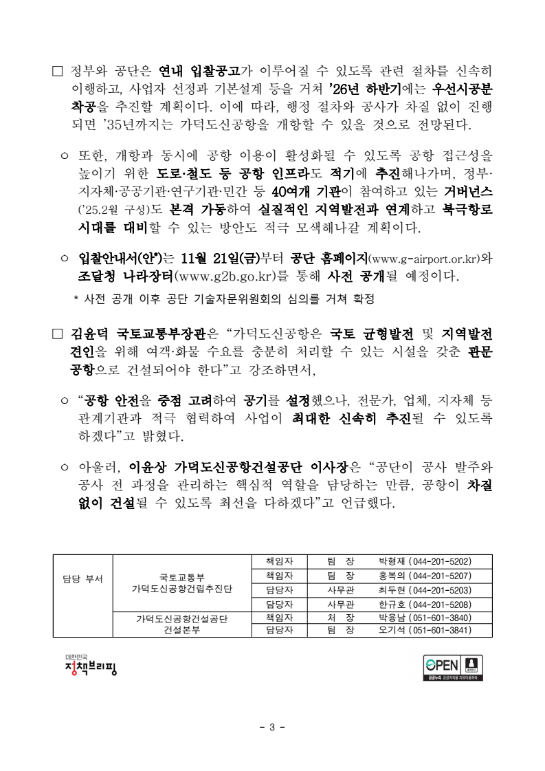 보도참고자료 - 1 - 보도시점 : 2025. 11. 21.(금) 16:00 이후 / 배포 : 11. 21.(금) 10:00 가덕도신공항 부지조성공사 재추진- 전문가 등의 의견 들어 턴키방식과 공기 106개월 산정, 공사금액은 10.7조원□ 국토교통부(장관 김윤덕)와 가덕도신공항건설공단(이사장 이윤상, 이하 공단)은가덕도신공항 부지조성공사를 연내 입찰 공고할 계획이라고 밝혔다. ㅇ 부지조성공사는 설계·시공 일괄입찰(턴키) 방식으로 추진될 예정이며, 공사기간은 106개월, 공사금액은 물가상승을 반영한 10.7조 원 규모로산정하였다. □ 정부는 「가덕도신공항 건설을 위한 특별법」('21.3월 제정)에 따라 기본계획을 수립('23.12월 고시)한 후 공사에 착수하기 위한 입찰절차를 진행해왔으나, 4차례 유찰('24.5~9월)에 이어 현대건설 컨소시엄과의 수의계약 절차가 중단('25.6월)됨에 따라, 사업 재개를 위한 방안을 모색해왔다. ㅇ 특히, 가덕도신공항 사업을 성공적으로 추진하기 위해서는 무엇보다 공항의 건설과 운영 과정에서 안전이 확보되는 것이 가장 중요하다는 판단 하에, 입찰방식, 공사기간 등 사업추진 방안에 대한 충분한 기술 검토를 실시하고 전문가 등의 의견을 폭넓게 수렴하였다. * 국토교통부·공단 합동TF 구성·운영(4.28~)을 통한 내부 기술검토(31회), 전문가 자문단구성·운영(4.29~)을 통한 전문가 자문회의(16회), 업계 간담회(2회) 등 □ 주요 추진 방안은 다음과 같다. ㅇ (입찰방식) 신공항 예정지에는 해상 연약지반이 두껍게 분포하고 있어육·해상에 걸친 활주로의 특성상 부등침하 가능성이 있는 고난도 공사라는 점을 고려하여, - 시공업체가 전문성과 책임성을 가지고 토석채취 → 연약지반 처리 → 방파제 설치 → 해상매립 → 육상매립 → 활주로 설치 등 여러 공정을 유기적으로 연계할 수 있는 설계·시공 일괄입찰(턴키) 방식으로 입찰을 추진한다. - 2 - ㅇ (공사기간) 기본계획에서 검토한 공사기간을 기초로 하되, 공항을 안전하게 건설하고 운영하기 위해서는 연약지반 처리가 가장 중요하며, 연약지반 안정화에 필요한 기간을 충분히 부여할 필요가 있다는 전문가 등의 의견을 수렴하여 총 106개월의 공사기간을 산정하였다. - 연약지반은 현장 조건과 시공 방법에 따라 안정화에 소요되는 기간이 달라질 수 있지만, 다수의 전문가 검토를 거쳐 입찰 단계에서는 안정화 기간을 충분히 부여하였다. - 또한, 공사용 도로 개설 등 기존에 계획된 공정에서도 사전 준비에 필요한시간을 고려하여 공사기간을 적정 수준으로 보정하였다. - 아울러, 해상공사에 필요한 주요 장비의 제작·확보와 관련해서도 제작업체들의 작업 물량 증가로 제작 일정이 다소 길어질 수 있는 여건을 고려하여 준비 절차에 필요한 기간을 반영하였다. - 특히, 연약지반 안정화 과정에서 지반 계측을 수시로 시행하고, 안정화가조기에 마무리된 것으로 확인되면 후속 공정을 신속히 연계하여 공사기간을 단축하는 등 효율적인 사업 추진을 모색해 나갈 계획이다. ㅇ (공사금액) 당초 10.5조 원이던 공사금액은 그간 물가상승을 반영하여 10.7조 원으로 조정할 예정이다. * 「총사업비 관리지침」에 따라 ‘건설투자 GDP디플레이터 상승률’을 적용 ㅇ (추진체계) 건설 전문기관인 공단이 발주부터 시작해 가덕도신공항 사업 전 과정이 신속하고 효율적으로 추진될 수 있도록 관리해나가는 한편, 종합적 사업관리*(PgM) 도입 등도 지속적으로 검토해나갈 계획이다. * 종합적 사업관리(PgM: Program Management) : 복수의 프로젝트(토목, 건축, 전기, 항행안전시설 등)를 종합적으로 연계하여 통합 관리하는 방식 - 또한, 건설 기간 중 업무조정 협의체를 운영하여 안전과 품질을 주기적으로 점검해 나가고, 공사 중 발생하는 현장 여건 변화 등에 신속하고 효율적으로 대응해 나가며, 「항공안전 혁신방안」(4.30)에 따른 공항시설 안전 확보와 조류충돌 예방을 위한 대책도 적극적으로 반영해나갈계획이다. - 3 - □ 정부와 공단은 연내 입찰공고가 이루어질 수 있도록 관련 절차를 신속히이행하고, 사업자 선정과 기본설계 등을 거쳐 ’26년 하반기에는 우선시공분 착공을 추진할 계획이다. 이에 따라, 행정 절차와 공사가 차질 없이 진행되면 ’35년까지는 가덕도신공항을 개항할 수 있을 것으로 전망된다. ㅇ 또한, 개항과 동시에 공항 이용이 활성화될 수 있도록 공항 접근성을 높이기 위한 도로·철도 등 공항 인프라도 적기에 추진해나가며, 정부· 지자체·공공기관·연구기관·민간 등 40여개 기관이 참여하고 있는 거버넌스(’25.2월 구성)도 본격 가동하여 실질적인 지역발전과 연계하고 북극항로 시대를 대비할 수 있는 방안도 적극 모색해나갈 계획이다. ㅇ 입찰안내서(안*)는 11월 21일(금)부터 공단 홈페이지(www.g-airport.or.kr)와조달청 나라장터(www.g2b.go.kr)를 통해 사전 공개될 예정이다. * 사전 공개 이후 공단 기술자문위원회의 심의를 거쳐 확정 □ 김윤덕 국토교통부장관은 “가덕도신공항은 국토 균형발전 및 지역발전 견인을 위해 여객·화물 수요를 충분히 처리할 수 있는 시설을 갖춘 관문공항으로 건설되어야 한다”고 강조하면서, ㅇ “공항 안전을 중점 고려하여 공기를 설정