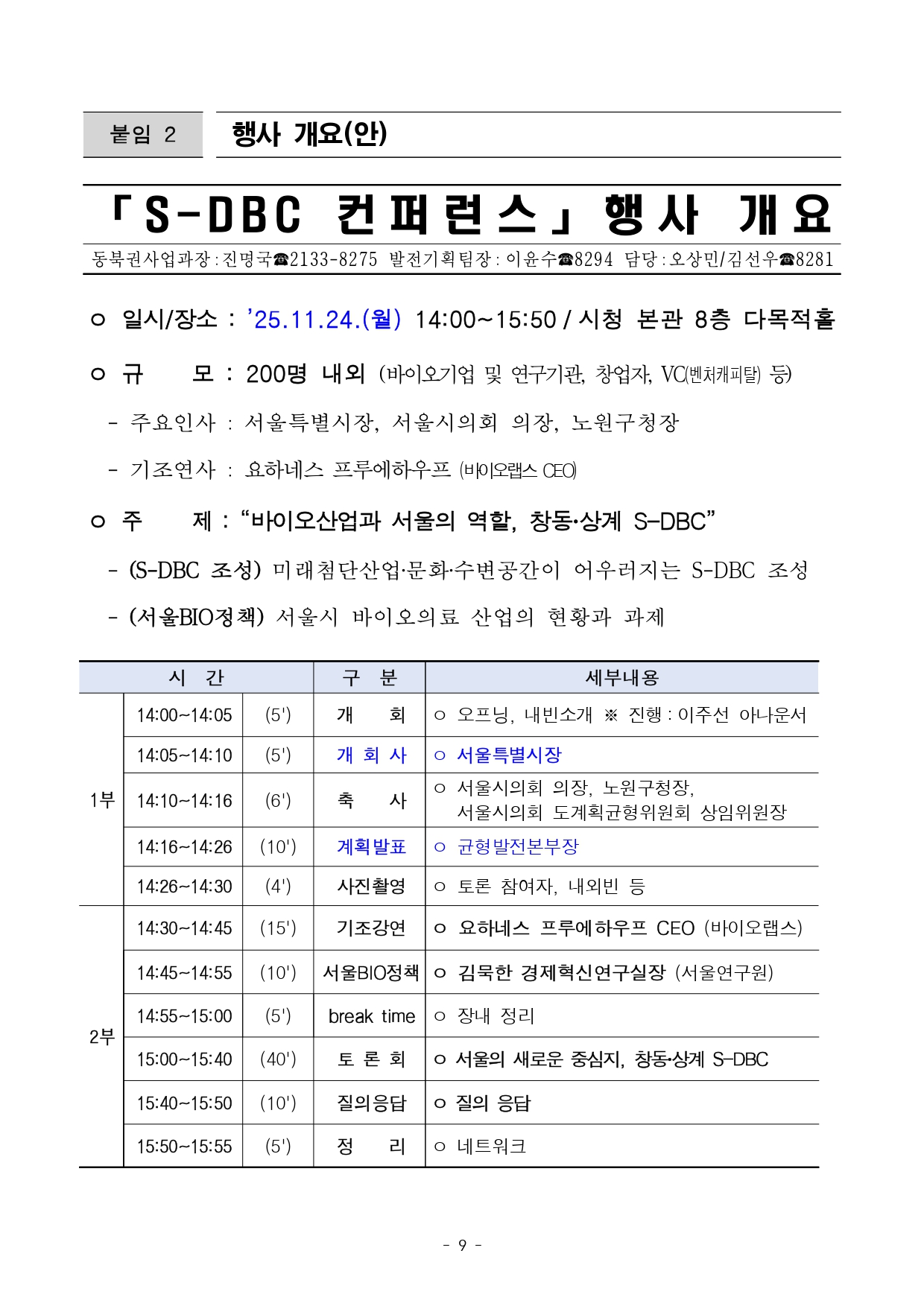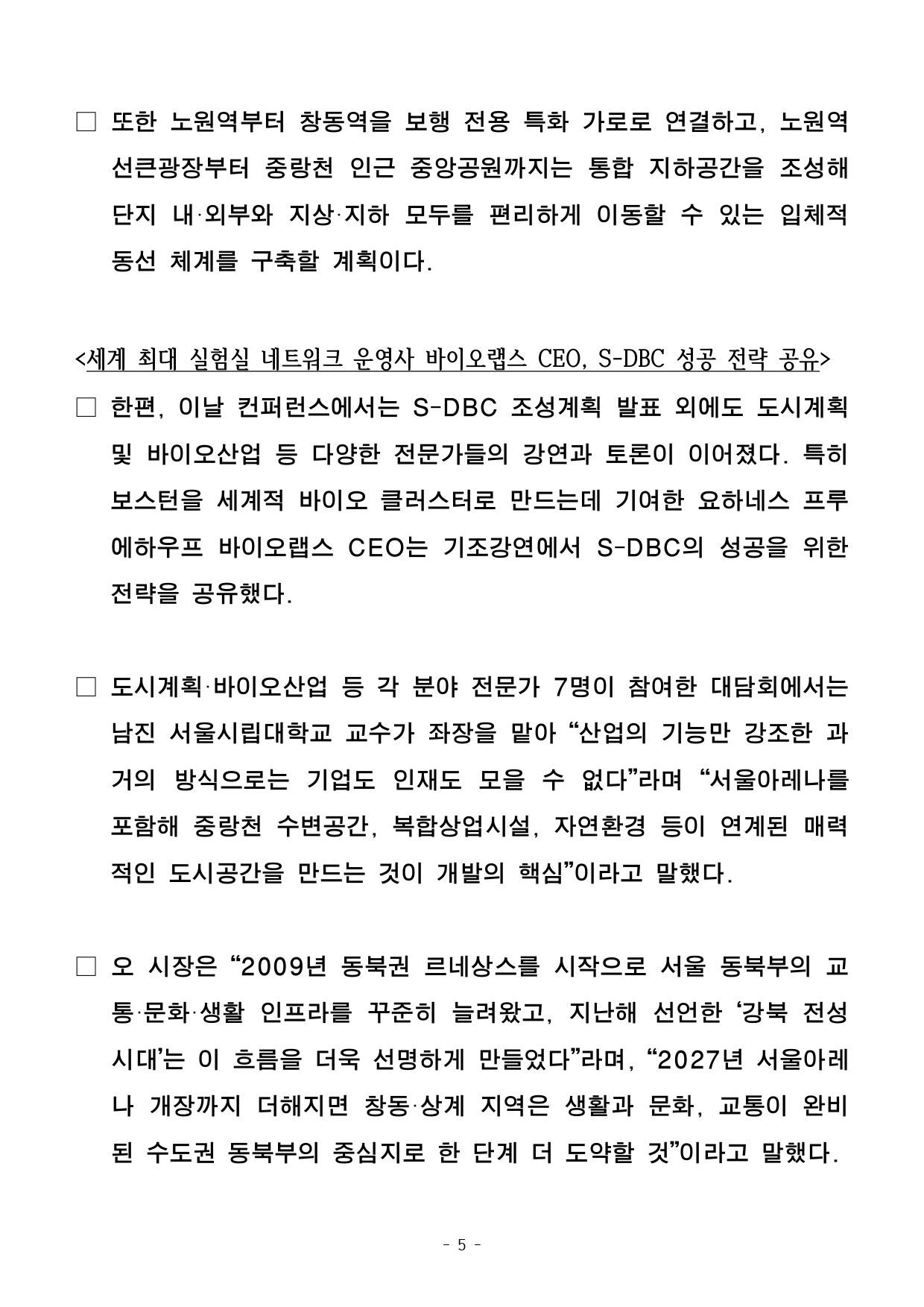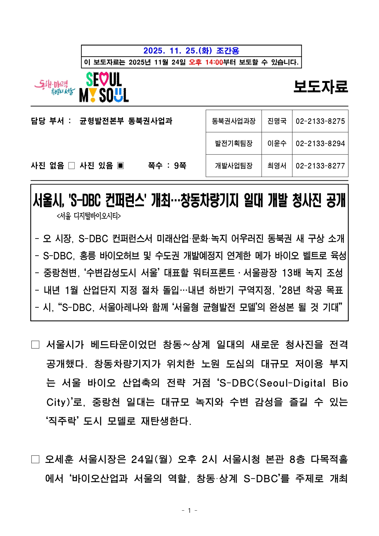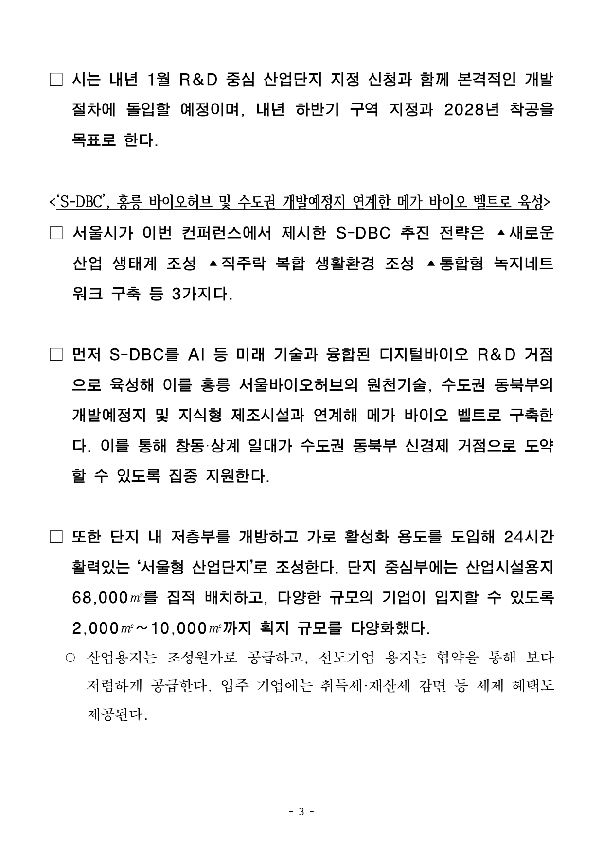 - 1 - 2025. 11. 25.(화) 조간용 이 보도자료는 2025년 11월 24일 오후 14:00부터 보도할 수 있습니다. 보도자료담당 부서 : 균형발전본부 동북권사업과 동북권사업과장 진명국 02-2133-8275발전기획팀장 이윤수 02-2133-8294사진 없음 □ 사진 있음 ▣ 쪽수 : 9쪽 개발사업팀장 최영서 02-2133-8277서울시, 'S-DBC 컨퍼런스' 개최…창동차량기지 일대 개발 청사진 공개 <서울 디지털바이오시티> - 오 시장, S-DBC 컨퍼런스서 미래산업·문화·녹지 어우러진 동북권 새 구상소개- S-DBC, 홍릉 바이오허브 및 수도권 개발예정지 연계한 메가 바이오 벨트로육성- 중랑천변, ‘수변감성도시 서울’ 대표할 워터프론트․서울광장 13배 녹지조성- 내년 1월 산업단지 지정 절차 돌입…내년 하반기 구역지정, ’28년 착공목표- 시, “S-DBC, 서울아레나와 함께 ‘서울형 균형발전 모델’의 완성본 될 것기대” □ 서울시가 베드타운이었던 창동~상계 일대의 새로운 청사진을전격공개했다. 창동차량기지가 위치한 노원 도심의 대규모 저이용부지는 서울 바이오 산업축의 전략 거점 ‘S-DBC(Seoul-Digital BioCity)’로, 중랑천 일대는 대규모 녹지와 수변 감성을 즐길 수있는‘직주락’ 도시 모델로 재탄생한다. □ 오세훈 서울시장은 24일(월) 오후 2시 서울시청 본관 8층 다목적홀에서 ‘바이오산업과 서울의 역할, 창동·상계 S-DBC’를 주제로개최 - 2 - 한 ‘S-DBC(Seoul-Digital Bio City) 컨퍼런스’에 참석해 미래첨단산업‧문화‧녹지가 어우러진 서울 동북권의 새 비전을 소개했다. ○ 이날 행사에는 바이오·헬스케어·AI·디지털 산업 등 미래 첨단산업분야의국내외 기업, 연구기관, 창업자, 벤처캐피탈(VC) 등 200여 명이참석해 서울의 바이오산업과 S-DBC 추진 방향에 높은 관심을 보였다. □ 서울시는 「강북권 대개조-강북 전성시대」의 핵심사업으로 서울아레나와 S-DBC 조성을 역점적으로 추진해 왔다. 시는 “서울아레나가개장하면 창동은 연간 270만 명의 관람객이 찾는 월드클래스공연성지로 변모하고, 창동차량기지에는 일자리, 문화·상업, 여가가복합된 서울형 신(新)산업단지가 조성되어 강북이 진정한 ‘일자리중심경제도시’로 변모할 것이라고 강조했다. ○ 시는 지난해 3월 ‘강북 전성시대’를 발표하며 동북권에 활력 넘치는일자리 경제도시를 만들겠다고 선언했다. 지난해 5월 S-DBC 기업설명회에서는 대·중견기업 등 총 81개사 130명이 참석한 가운데 오시장이직접 S-DBC 구상을 밝히며 큰 호응을 얻었다. ○ 올해 9월에는 오 시장이 창동 서울아레나 현장을 찾아 직접 공사진행현황 및 안전 관리 상황을 점검하는 등 강북권 사업을 챙겨왔다. □ 창동차량기지 이전은 진접차량기지 공사가 마무리 단계에 접어들고, 지난 11월부터 철도종합시험운행을 개시함에 따라 본격화됐다. 내년6월 진접차량기지가 정식 개통하면 도심 한복판 입지임에도40여년간 차량기지로만 이용돼 온 창동차량기지 부지가 동북권경제를견인할 새로운 경제 거점으로 탈바꿈한다. - 3 - □ 시는 내년 1월 R&D 중심 산업단지 지정 신청과 함께 본격적인개발절차에 돌입할 예정이며, 내년 하반기 구역 지정과 2028년착공을목표로 한다. <‘S-DBC’, 홍릉 바이오허브 및 수도권 개발예정지 연계한 메가 바이오 벨트로 육성>□ 서울시가 이번 컨퍼런스에서 제시한 S-DBC 추진 전략은 ▴새로운산업 생태계 조성 ▴직주락 복합 생활환경 조성 ▴통합형 녹지네트워크 구축 등 3가지다. □ 먼저 S-DBC를 AI 등 미래 기술과 융합된 디지털바이오 R&D거점으로 육성해 이를 홍릉 서울바이오허브의 원천기술, 수도권 동북부의개발예정지 및 지식형 제조시설과 연계해 메가 바이오 벨트로구축한다. 이를 통해 창동·상계 일대가 수도권 동북부 신경제 거점으로도약할 수 있도록 집중 지원한다. □ 또한 단지 내 저층부를 개방하고 가로 활성화 용도를 도입해24시간활력있는 ‘서울형 산업단지’로 조성한다. 단지 중심부에는 산업시설용지68,000㎡를 집적 배치하고, 다양한 규모의 기업이 입지할 수있도록2,000㎡~10,000㎡까지 획지 규모를 다양화했다. ○ 산업용지는 조성원가로 공급하고, 선도기업 용지는 협약을 통해보다저렴하게 공급한다. 입주 기업에는 취득세·재산세 감면 등 세제혜택도제공된다. - 4 - <중랑천 일대, 수변감성도시 서울 대표할 워터프론트로 도약…직주락 완성> □ 중랑천 인근은 일자리와 문화·상업시설 등이 어우러진 복합용지를배치해 ‘수변감성도시 서울’을 대표할 워터프론트로 조성한다. 현재진행 중인 동부간선도로 지하화 및 상부 공원화가 완료되면 S-DBC는동부간선도로 상부 공원을 통해 중랑천까지 연결된 명소로 거듭난다. ○ 중랑천변 저층부에는 쇼핑·여가·문화시설 등이 들어서고, 이를수변부까지 입체보행데크로 연결한 특화 가로로 조성함으로써 중랑천일대유동 인구를 활성화한다. □ 노원역세권 일대에는 호텔, 컨벤션, 복합문화시설 등을 도입할수있는 지원시설용지를 배치해 고밀 복합개발을 유도함으로써‘직주락복합 생활환경’을 완성한다. ○ 또한 스카이전망대, 루프탑가든 등 개방형 공간을 설치해 시민누구나중랑천, 서울아레나 경관을 감상할 수 있도록 한다. <창