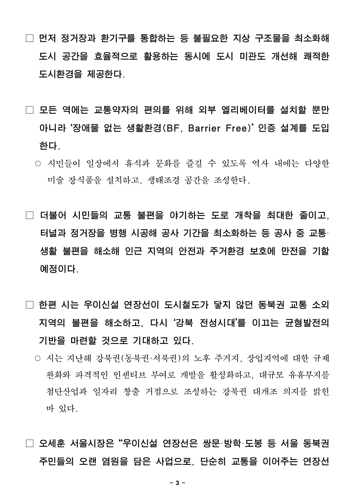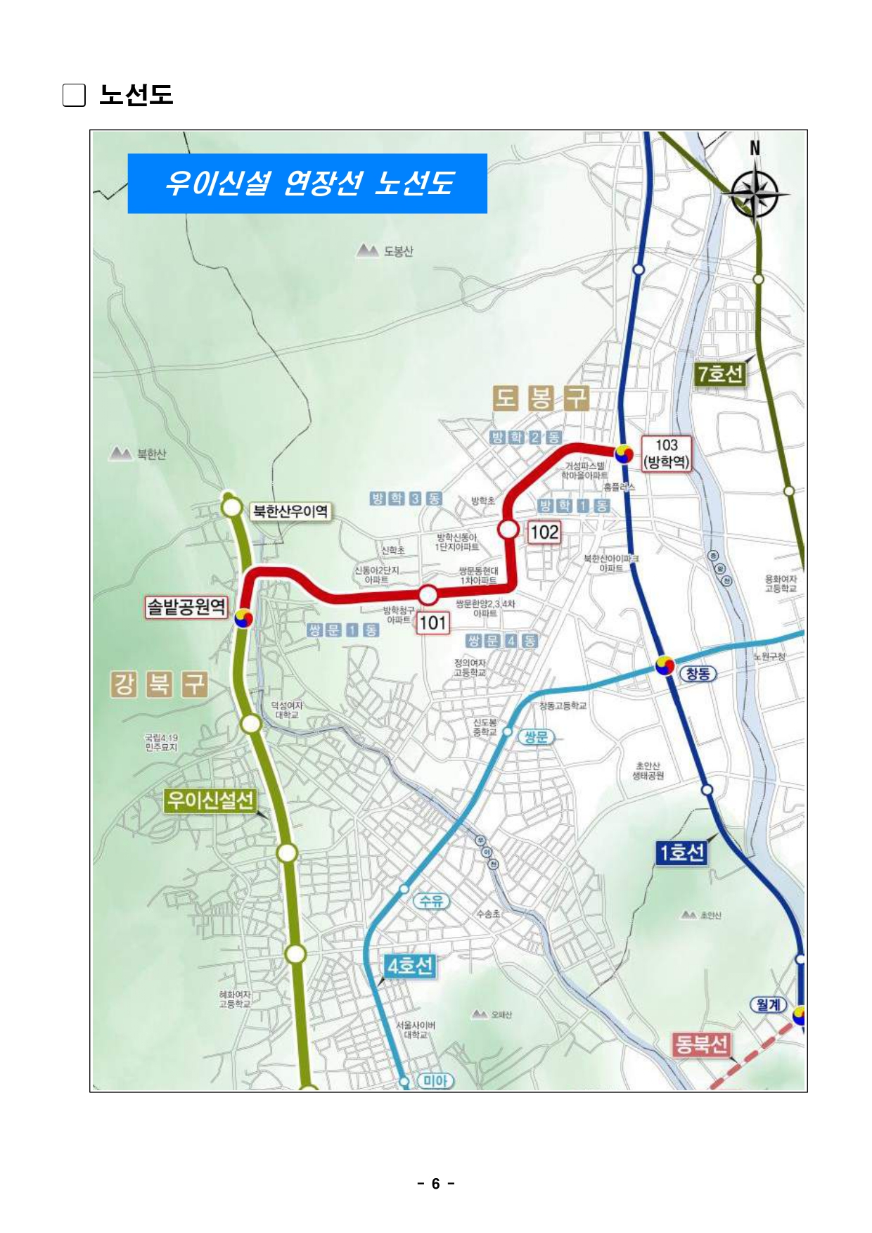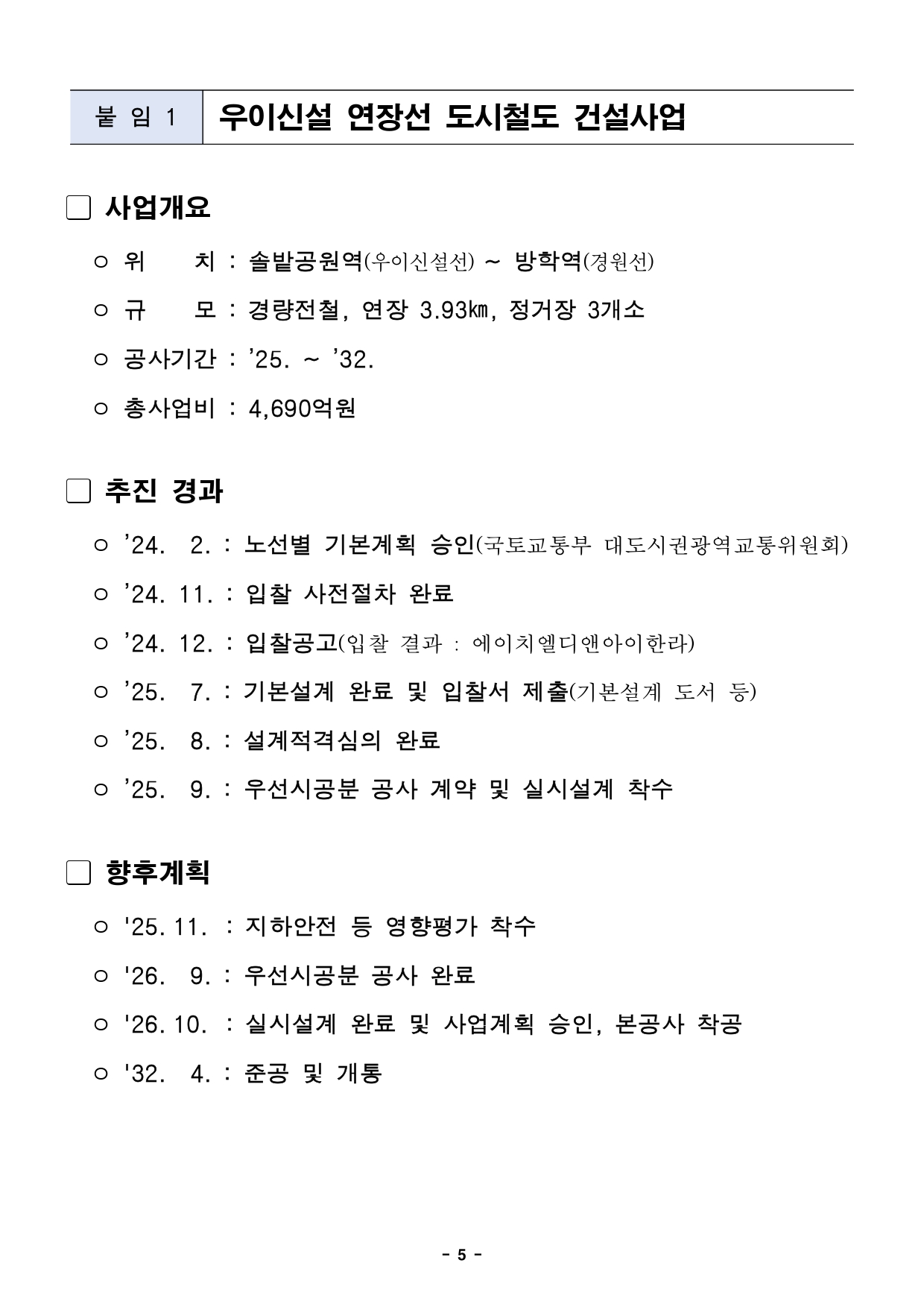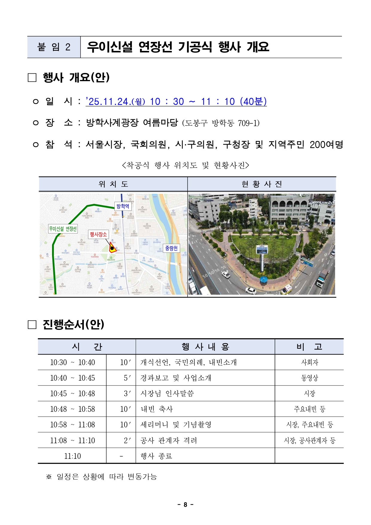 - 1 - 2025. 11. 24.(월) 석간용 이 보도자료는 2025년 11월 24일 오전 10:30부터 보도할 수 있습니다. 보도자료담당 부서: 도시기반시설본부 도시철도사업부 도시철도사업부장 이진오 02-6438-2558사진 없음 □ 사진 있음 ▣ 쪽수: 8쪽 공정관리과장 안덕용 02-6438-2560서울시, 우이신설 연장선 드디어 착공…동북권 교통망 확충 가속화- 24일(월) 10시 30분 도봉구 방학사계광장서 주민들과 함께 기공식…2032년개통목표- 솔밭공원역(우이신설선)~방학역(1호선) 정거장 3개소 신설…동북권 지역의 교통불편해소- 도시환경 미관 개선, 교통약자 배려, 주민 불편 최소화 등에 중점을 두고 실시설계·공사진행- 우이신설 연장선 개통이 다시 ‘강북 전성시대’를 이끄는 균형발전 기반 마련할 것으로기대□ 서울시는 24일(월) 오전 10시 30분, 도봉구 방학사계광장(방학동709-1)에서 ‘우이신설 연장선 도시철도 건설공사’의 기공식을개최했다. ○ 이날 행사에는 오세훈 서울시장, 오언석 도봉구청장, 오기형 의원, 최호정서울시의장을 비롯한 시의원과 지역 주민 등이 참석해 우이신설연장선공사의 시작을 축하했다. □ 우이신설 연장선은 2017년부터 운영 중인 솔밭공원역(우이신설선)과방학역(1호선)을 연결하는 사업이다. 2032년 준공을 목표로총연장3.94㎞의 정거장 3개소(방학역 환승 포함)를 신설하며, 총 사업비로4,690억 원이 투입된다. - 2 - □ 2010년부터 동북권 지역의 숙원 사업이었지만 장기간 추진에진통을겪었던 우이신설 연장선 공사를 본격적으로 시작하게 되면서, 동북권지역에 보다 촘촘한 도시철도망 구축을 통해 시민들의 교통 편의성이개선될 것으로 전망된다. □ 우이신설 연장선이 개통되면 기존 우이신설선의 신설동역(1·2호선),보문역(6호선), 성신여대입구역(4호선)에 더해 방학역(1호선)이새롭게 환승역으로 추가돼 동북권의 핵심 도시철도 노선으로 거듭난다. ○ 향후 우이신설선 솔밭공원역 이후 구간은 기존의 북한산우이역방향과연장선 방학역 방향으로 열차가 나뉘어 운행될 계획이다. □ 신설되는 정거장 3개소의 도보 생활권(반경 500m) 내 생활인구는약 10만 명으로, 시민들의 도시철도 접근성이 강화돼 주변 지역의교통서비스가 대폭 향상된다. □ 또한 현재 시내버스로 약 25분(자가용 약 13분) 걸리는 솔밭공원역~방학역 구간이 약 8분 만에 이동 가능해져 시민들의 이동시간이최대17분까지 단축된다. □ 서울시는 우이신설 연장선 사업을 추진하는 데 있어 ▴지상 구조물최소화로 도시환경 미관 개선 ▴교통약자 배려 및 휴식·문화 공간조성▴공사에 따른 주민 불편 최소화 등 세 가지 사항에 대해 중점을두고실시설계와 공사를 진행할 계획이다. - 3 - □ 먼저 정거장과 환기구를 통합하는 등 불필요한 지상 구조물을최소화해도시 공간을 효율적으로 활용하는 동시에 도시 미관도 개선해쾌적한도시환경을 제공한다. □ 모든 역에는 교통약자의 편의를 위해 외부 엘리베이터를 설치할뿐만아니라 ‘장애물 없는 생활환경(BF, Barrier Free)’ 인증 설계를도입한다. ○ 시민들이 일상에서 휴식과 문화를 즐길 수 있도록 역사 내에는다양한미술 장식품을 설치하고, 생태조경 공간을 조성한다. □ 더불어 시민들의 교통 불편을 야기하는 도로 개착을 최대한줄이고,터널과 정거장을 병행 시공해 공사 기간을 최소화하는 등 공사중교통· 생활 불편을 해소해 인근 지역의 안전과 주거환경 보호에 만전을기할예정이다. □ 한편 시는 우이신설 연장선이 도시철도가 닿지 않던 동북권 교통소외지역의 불편을 해소하고, 다시 ‘강북 전성시대’를 이끄는 균형발전의기반을 마련할 것으로 기대하고 있다. ○ 시는 지난해 강북권(동북권·서북권)의 노후 주거지, 상업지역에 대한규제완화와 파격적인 인센티브 부여로 개발을 활성화하고, 대규모 유휴부지를첨단산업과 일자리 창출 거점으로 조성하는 강북권 대개조 의지를밝힌바 있다. □ 오세훈 서울시장은 “우이신설 연장선은 쌍문·방학·도봉 등 서울동북권주민들의 오랜 염원을 담은 사업으로, 단순히 교통을 이어주는연장선 - 4 - 이 아닌 강북의 잠재력을 깨울 중요한 열쇠”라며, “우이신설 연장선이성공적으로 추진될 수 있도록 전폭적으로 지원하고, 시민 여러분이‘강북 전성시대’를 일상에서 체감하실 수 있도록 더욱 노력하겠다”라고말했다. 붙임: 1. 우이신설 연장선 사업현황, 노선도 및 조감도 1부. 2. 기공식 행사개요 1부. 끝. - 5 - 붙 임 1 우이신설 연장선 도시철도 건설사업 사업개요 ㅇ 위 치 : 솔밭공원역(우이신설선) ~ 방학역(경원선) ㅇ 규 모 : 경량전철, 연장 3.93㎞, 정거장 3개소 ㅇ 공사기간 : ’25. ~ ’32. ㅇ 총사업비 : 4,690억원 추진 경과 ㅇ ’24. 2. : 노선별 기본계획 승인(국토교통부 대도시권광역교통위원회) ㅇ ’24. 11. : 입찰 사전절차 완료 ㅇ ’24. 12. : 입찰공고(입찰 결과 : 에이치엘디앤아이한라) ㅇ ’25. 7. : 기본설계 완료 및 입찰서 제출(기본설계 도서 등) ㅇ ’25. 8. : 설계적격심의 완료 ㅇ ’25. 9. : 우선시공분 공사 계약 및 실시설계 착수 향후계획 ㅇ '25. 11. : 지하안전 등 영향평가 착수 ㅇ '26. 9. : 우선시공분 공사 완료 ㅇ '26. 10. : 실시설계 완료 