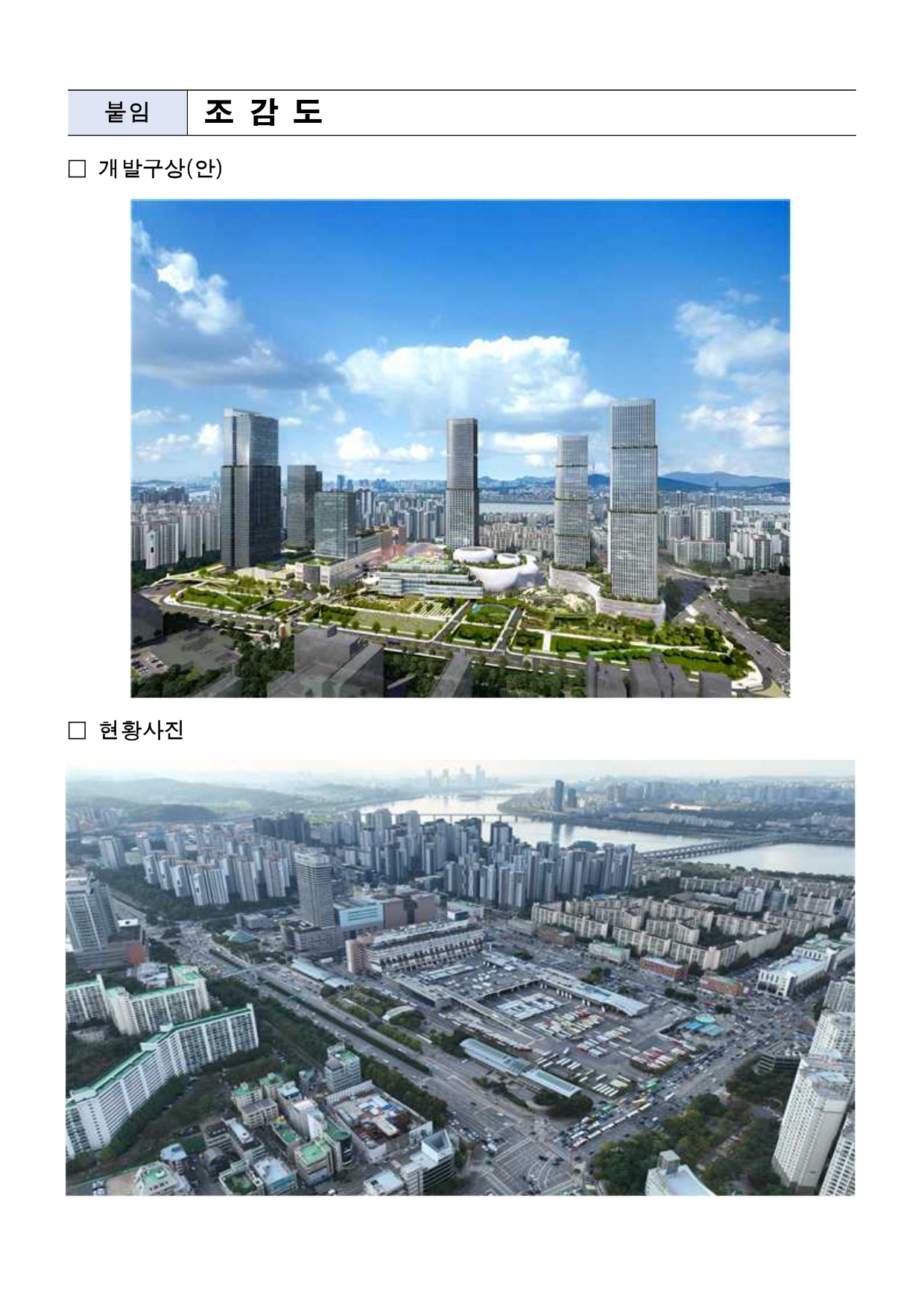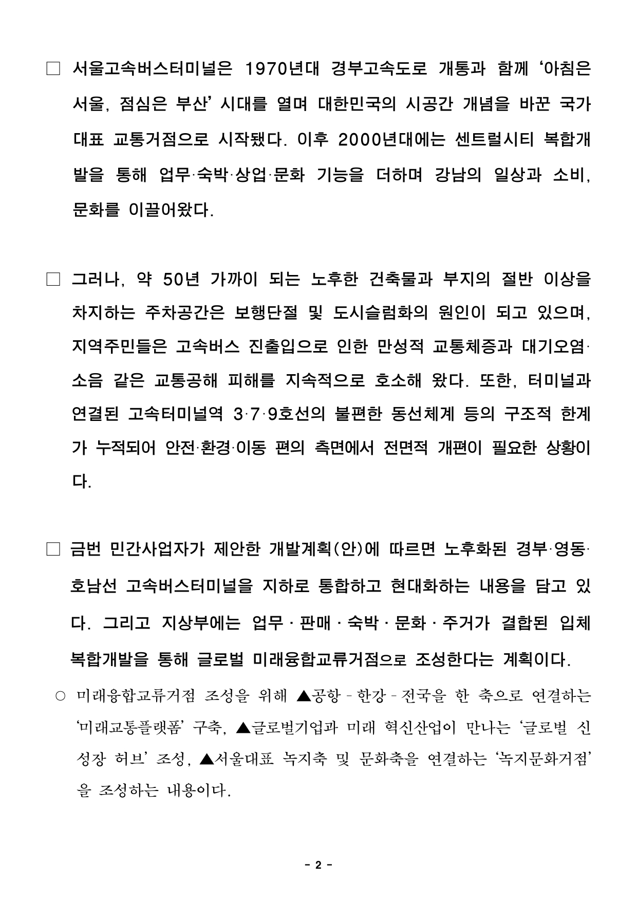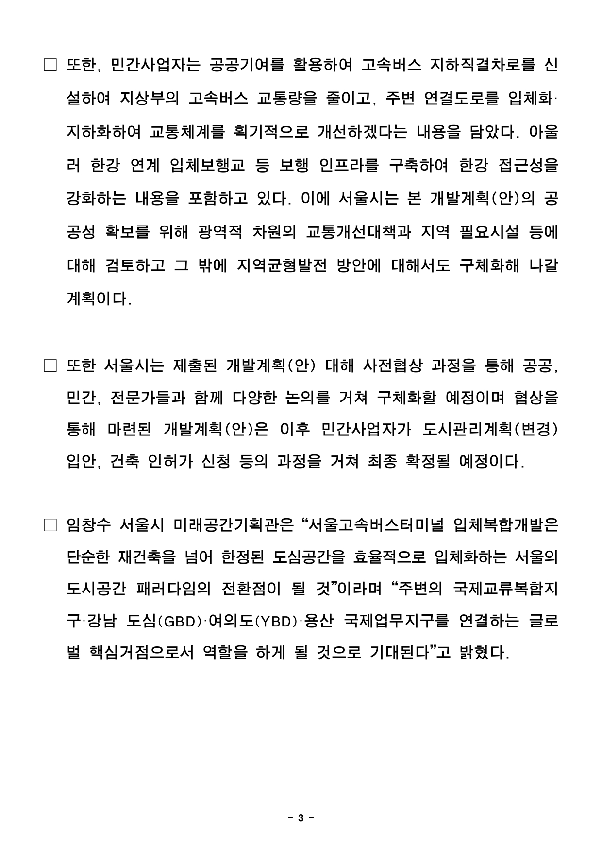 - 1 - 2025. 11. 26.(수) 석간용 이 보도자료는 2025년 11월 26일 오전 06:00부터 보도할 수 있습니다.보도자료담당 부서: 미래공간기획관 공공개발담당관 공공개발담당관 강성필 02-2133-8245 개발정책팀장 정현중 02-2133-8346 사진 없음 □ 사진 있음 ▣ 쪽수: 5쪽 관련 누리집 (메뉴) https://www.seoul.go.kr/main/index.jsp (서울소식) 서울고속버스터미널 사전협상 대상지선정... 입체복합개발 추진- 민간사업자, 경부·영동·호남 고속버스터미널 지하 통합‧현대화...미래융합교류거점조성제안- 업무·판매·숙박·문화·MICE·주거 등 결합된 입체복합개발 …도심 속 ‘콤팩트시티’’ 조성- 공공기여 활용해 고속버스 지하직결차로 설치 등 교통체계 개선 및 한강 접근성강화- 사전협상과정에서공공‧민간‧전문가논의를통해개발계획(안) 구체화..이후행정절차를통해확정예정□ 서울시는 서초구 서울고속버스터미널 부지(146,260.4㎡)를 사전협상대상지로 선정(′25.9)하고, 민간사업자(㈜신세계센트럴, 서울고속버스터미널㈜)가 제안한 대규모 복합개발에 대해 본격적인 사전협상에 착수한다. ○ 금번 사전협상 대상지는 서울 중심에 위치한 대규모 부지로, 한강이남유일의 3·7·9호선 트리플 역세권으로서 도심 및 공항까지 뛰어난접근및연결성을 확보하고 한강변이라는 입지적 차별성을 가지고 있어그개발파급력은 상당할 것으로 예상된다. - 2 - □ 서울고속버스터미널은 1970년대 경부고속도로 개통과 함께‘아침은서울, 점심은 부산’ 시대를 열며 대한민국의 시공간 개념을 바꾼국가대표 교통거점으로 시작됐다. 이후 2000년대에는 센트럴시티복합개발을 통해 업무·숙박·상업·문화 기능을 더하며 강남의 일상과소비,문화를 이끌어왔다. □ 그러나, 약 50년 가까이 되는 노후한 건축물과 부지의 절반이상을차지하는 주차공간은 보행단절 및 도시슬럼화의 원인이 되고있으며,지역주민들은 고속버스 진출입으로 인한 만성적 교통체증과 대기오염· 소음 같은 교통공해 피해를 지속적으로 호소해 왔다. 또한, 터미널과연결된 고속터미널역 3·7·9호선의 불편한 동선체계 등의 구조적한계가 누적되어 안전·환경·이동 편의 측면에서 전면적 개편이 필요한상황이다. □ 금번 민간사업자가 제안한 개발계획(안)에 따르면 노후화된 경부·영동· 호남선 고속버스터미널을 지하로 통합하고 현대화하는 내용을담고있다. 그리고 지상부에는 업무․판매․숙박․문화․주거가 결합된입체복합개발을 통해 글로벌 미래융합교류거점으로 조성한다는 계획이다. ○ 미래융합교류거점 조성을 위해 ▲공항–한강–전국을 한 축으로 연결하는‘미래교통플랫폼’ 구축, ▲글로벌기업과 미래 혁신산업이 만나는 ‘글로벌신성장 허브’ 조성, ▲서울대표 녹지축 및 문화축을 연결하는 ‘녹지문화거점’ 을 조성하는 내용이다. - 3 - □ 또한, 민간사업자는 공공기여를 활용하여 고속버스 지하직결차로를신설하여 지상부의 고속버스 교통량을 줄이고, 주변 연결도로를입체화· 지하화하여 교통체계를 획기적으로 개선하겠다는 내용을 담았다. 아울러 한강 연계 입체보행교 등 보행 인프라를 구축하여 한강 접근성을강화하는 내용을 포함하고 있다. 이에 서울시는 본 개발계획(안)의공공성 확보를 위해 광역적 차원의 교통개선대책과 지역 필요시설등에대해 검토하고 그 밖에 지역균형발전 방안에 대해서도 구체화해나갈계획이다. □ 또한 서울시는 제출된 개발계획(안) 대해 사전협상 과정을 통해공공,민간, 전문가들과 함께 다양한 논의를 거쳐 구체화할 예정이며협상을통해 마련된 개발계획(안)은 이후 민간사업자가 도시관리계획(변경)입안, 건축 인허가 신청 등의 과정을 거쳐 최종 확정될 예정이다. □ 임창수 서울시 미래공간기획관은 “서울고속버스터미널 입체복합개발은단순한 재건축을 넘어 한정된 도심공간을 효율적으로 입체화하는서울의도시공간 패러다임의 전환점이 될 것”이라며 “주변의 국제교류복합지구·강남 도심(GBD)·여의도(YBD)·용산 국제업무지구를 연결하는글로벌 핵심거점으로서 역할을 하게 될 것으로 기대된다”고 밝혔다. 붙임 조 감 도 □ 개발구상(안) □ 현황사진 - 5 - □ 터미널 조감도