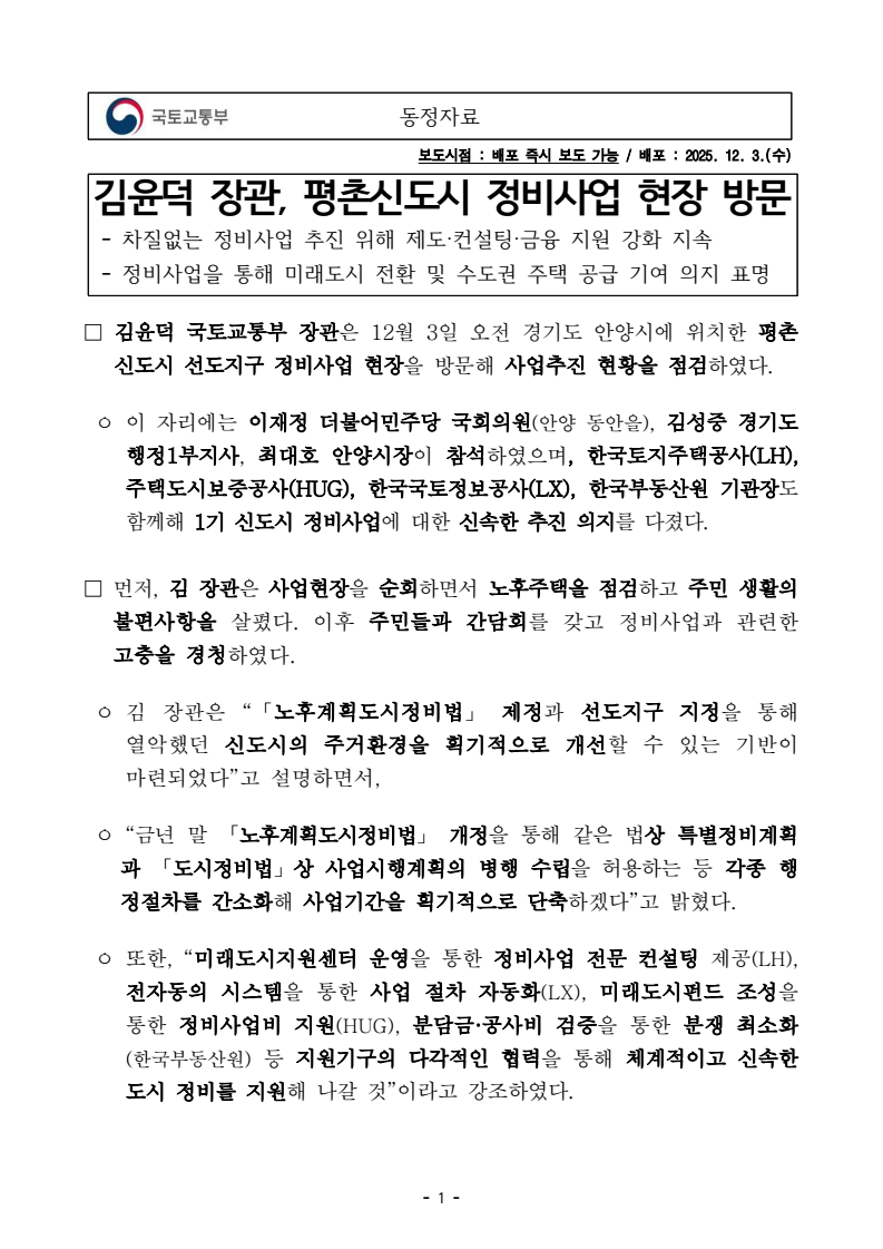 - 1 - 동정자료 보도시점 : 배포 즉시 보도 가능 / 배포 : 2025. 12. 3.(수) 김윤덕 장관, 평촌신도시 정비사업 현장 방문- 차질없는 정비사업 추진 위해 제도·컨설팅·금융 지원 강화 지속 - 정비사업을 통해 미래도시 전환 및 수도권 주택 공급 기여 의지 표명□ 김윤덕 국토교통부 장관은 12월 3일 오전 경기도 안양시에 위치한 평촌신도시 선도지구 정비사업 현장을 방문해 사업추진 현황을 점검하였다. ㅇ 이 자리에는 이재정 더불어민주당 국회의원(안양 동안을), 김성중 경기도 행정1부지사, 최대호 안양시장이 참석하였으며, 한국토지주택공사(LH), 주택도시보증공사(HUG), 한국국토정보공사(LX), 한국부동산원 기관장도함께해 1기 신도시 정비사업에 대한 신속한 추진 의지를 다졌다. □ 먼저, 김 장관은 사업현장을 순회하면서 노후주택을 점검하고 주민 생활의 불편사항을 살폈다. 이후 주민들과 간담회를 갖고 정비사업과 관련한 고충을 경청하였다. ㅇ 김 장관은 “「노후계획도시정비법」 제정과 선도지구 지정을 통해 열악했던 신도시의 주거환경을 획기적으로 개선할 수 있는 기반이 마련되었다”고 설명하면서, ㅇ “금년 말 「노후계획도시정비법」 개정을 통해 같은 법상 특별정비계획과 「도시정비법」상 사업시행계획의 병행 수립을 허용하는 등 각종 행정절차를 간소화해 사업기간을 획기적으로 단축하겠다”고 밝혔다. ㅇ 또한, “미래도시지원센터 운영을 통한 정비사업 전문 컨설팅 제공(LH), 전자동의 시스템을 통한 사업 절차 자동화(LX), 미래도시펀드 조성을 통한 정비사업비 지원(HUG), 분담금·공사비 검증을 통한 분쟁 최소화(한국부동산원) 등 지원기구의 다각적인 협력을 통해 체계적이고 신속한 도시 정비를 지원해 나갈 것”이라고 강조하였다. - 2 - □ 김 장관은 “국토부가 중심이 되어 중앙정부와 국회, 지자체, 지원기구가 하나의 팀으로 소통과 협력을 통해 신속한 정비사업을 이끌어가겠다” 면서, ㅇ “이번 정비사업을 신속하게 진행하여 안양을 비롯한 1기 신도시가미래도시로의 전환을 통해 도시경쟁력을 강화하고, 신속한 수도권 주택 공급이이루어질 수 있도록 최선을 다해달라.”고 관계자들에게 당부했다. 담당 부서 도시정책관 책임자 과 장 김종성 (044-201-4920) 신도시정비협력과 담당자 사무관 박종인 (044-201-4957) - 3 - 참고 평촌신도시 선도지구 재건축 사업 개요 □ 개요 구분 A-17 A-18 A-19 위치 경기도 안양시 동안구 평촌동 932번지 일원 경기도 안양시 동안구 평촌동 933번지 일원 경기도 안양시 동안구 호계동 1115번지면적(m2 ) 151,136.2 129,213.9 155,731.3 용도지역 제3종 일반주거지역 현 황 세대 수 1,750호 1,376호 2,334호 용적률 207% 206% 207% 계 획 세대 수 2,875호 2,395호 - 용적률 360% 이하 330% 이하 - 사업기간 ‘26년 ~ ’30년 * A-19는 정비계획 제안서 접수 이전으로 계획 세대 수 및 용적률 미공개 □ 추진경과 구분 A-17 A-18 A-19 사업방식 신탁방식 주민대표단 구성 `25.5.15 `25.4.27 `25.7.23 예비시행자 후보 선정 `25.6.4 (하나자산신탁) `25.4.29 (한국자산신탁) `25.10.21 (한국토지신탁&KB신탁) 예비시행자 지정 `25.6.13 `25.5.30 `25.11.27 정비계획 제안서 접수 `25.10.16 `25.10.17 - 평촌신도시 선도지구 재건축 위치도 주택재건축 조감도(A-18구역)