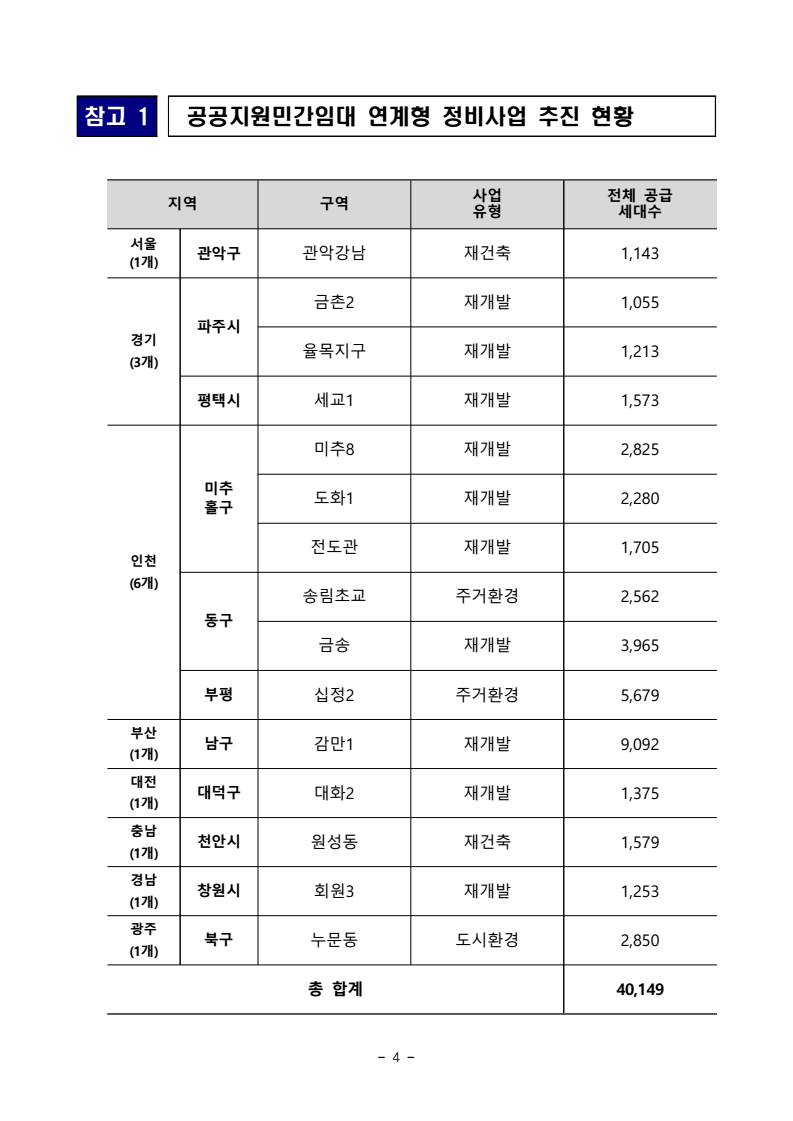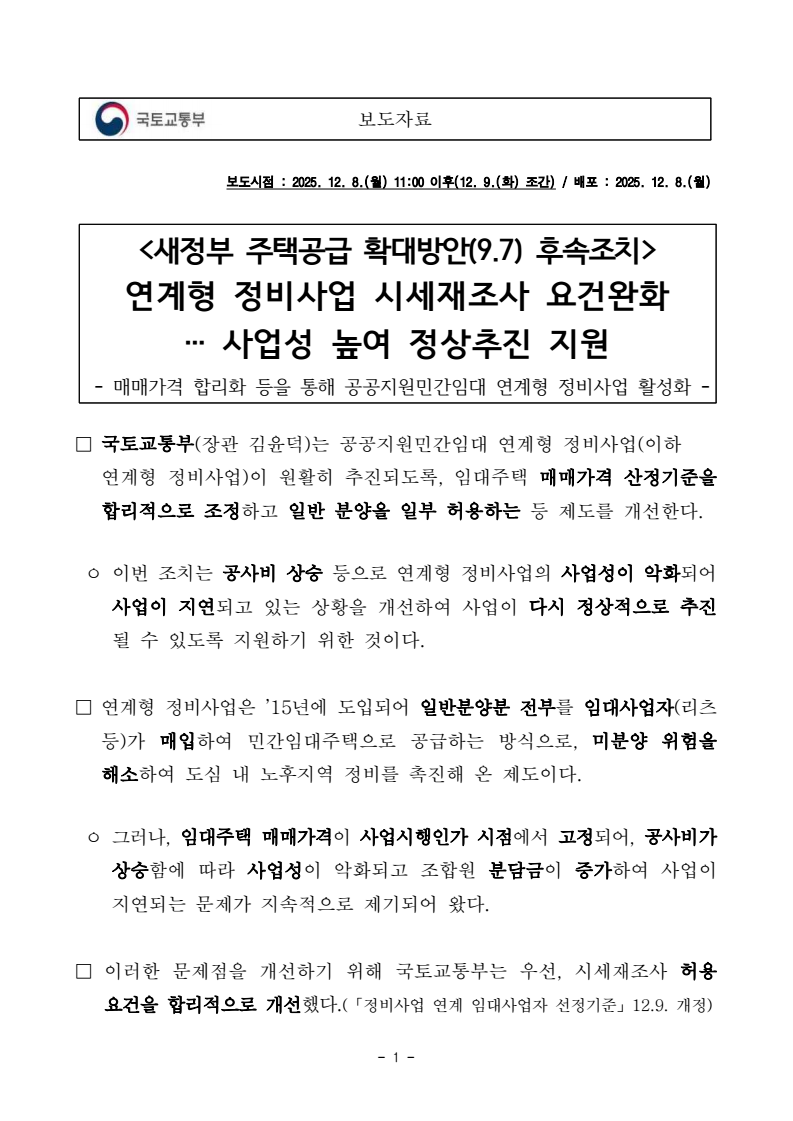 - 1 - 보도자료 보도시점 : 2025. 12. 8.(월) 11:00 이후(12. 9.(화) 조간) / 배포 : 2025. 12. 8.(월) <새정부 주택공급 확대방안(9.7) 후속조치> 연계형 정비사업 시세재조사 요건완화… 사업성 높여 정상추진 지원- 매매가격 합리화 등을 통해 공공지원민간임대 연계형 정비사업 활성화 - □ 국토교통부(장관 김윤덕)는 공공지원민간임대 연계형 정비사업(이하 연계형 정비사업)이 원활히 추진되도록, 임대주택 매매가격 산정기준을 합리적으로 조정하고 일반 분양을 일부 허용하는 등 제도를 개선한다. ㅇ 이번 조치는 공사비 상승 등으로 연계형 정비사업의 사업성이 악화되어 사업이 지연되고 있는 상황을 개선하여 사업이 다시 정상적으로 추진될 수 있도록 지원하기 위한 것이다. □ 연계형 정비사업은 ’15년에 도입되어 일반분양분 전부를 임대사업자(리츠 등)가 매입하여 민간임대주택으로 공급하는 방식으로, 미분양 위험을 해소하여 도심 내 노후지역 정비를 촉진해 온 제도이다. ㅇ 그러나, 임대주택 매매가격이 사업시행인가 시점에서 고정되어, 공사비가 상승함에 따라 사업성이 악화되고 조합원 분담금이 증가하여 사업이 지연되는 문제가 지속적으로 제기되어 왔다. □ 이러한 문제점을 개선하기 위해 국토교통부는 우선, 시세재조사 허용 요건을 합리적으로 개선했다.(「정비사업 연계 임대사업자 선정기준」12.9. 개정) - 2 - ㅇ 현재는 사업시행계획인가 고시월(月)부터 시세재조사 의뢰월(月)까지 건설공사비지수가 20%이상 증가한 경우, 최초 관리처분인가 시점으로 시세재조사가 가능하다. - 단, 사업시행인가 고시 후 3년이 지나 시세재조사를 의뢰하는 경우에는 최근 3년간 건설공사비지수 상승률만을 반영하도록 제한하고 있다. - 이에 따라 사업시행인가 고시 후 3년이 지난 상태에서 시세재조사를 의뢰하려는 사업장의 경우, 수년 간 공사비가 상승하였음에도 불구하고 최근 3년간의 공사비 증가율이 20%가 안되면 시세재조사가 불가능한 문제가 있었다. ㅇ 개정된 규정에 따르면 사업시행인가 고시 시점부터 시세재조사를 의뢰하는 시점까지 전체 기간의 건설공사비지수가 20% 이상 상승한 경우에는 최초 관리처분계획인가 기준으로 시세를 다시 조사할 수 있다. - 이를 통해, 공사비 증가분이 현실적으로 반영되어 정비사업의 사업성이 회복되고 사업이 원활히 추진될 수 있을 것으로 기대된다. □ 아울러, 일반분양분 전부를 임대리츠에 매각하는 구조를 개선하여 일부는 일반분양을 허용한다. ㅇ 일반적인 정비사업의 경우에는 일반분양가가 높아지는 경우 사업성 개선이 가능한 것과 달리, 연계형 정비사업은 조합이 일반분양분을 임대리츠에 고정된 금액으로 전량 매각하는 사업으로 일반분양이 원천적으로 불가능하여, 이러한 사업성 확보가 어려웠다. ㅇ 그러나, 연계형 정비사업의 취지가 주택공급 활성화라는 점을 고려할 때 공사비 상승 등으로 악화된 사업성을 개선시켜 다시 정상적으로 추진할 필요성이 있으므로, 일부 물량의 일반분양을 허용한다. - 3 - - 다만, 공공지원민간임대 사업 시행에 따라 완화받은 용적률에 해당하는 물량은 임대주택으로 공급하도록 하여 제도의 취지와 공공성은 유지한다. □ 이번 제도개선이 시행될 경우, 공사비 상승 등으로 사업성이 악화된 사업장에서 시세재조사와 일반분양 전환을 활용할 수 있게 되어, 사업성이 개선되고 정비사업 추진에 속도가 붙을 것으로 기대된다. □ 국토교통부 조민우 주택정비과장은 “이번 제도 개선으로 전국적으로 약 4만세대 정도의 연계형 정비사업 추진에 속도가 붙을 것으로 기대된다”며, ㅇ “도심 내 양질의 주택이 신속하게 공급되도록 주택공급 확대방안(9.7대책)에 포함된 정비사업 제도 종합 개편을 차질없이 추진해 나갈 것” 이라고 밝혔다. 담당부서 주택정책관 주택정비과 책임자 과 장 조민우 (044-201-3383) 담당자 사무관 윤종현 (044-201-3387) 연계형 사업 용적률인센티브 ⇨ 민간임대 민간임대 일반분양 민간임대 일반분양 조합원 조합원 조합원 재개발 의무임대 재개발 의무임대 재개발 의무임대일반 재개발 現연계형정비사업 改연계형정비사업 - 4 - 참고 1 공공지원민간임대 연계형 정비사업 추진 현황 지역 구역 사업 유형 전체 공급 세대수 서울 (1개) 관악구 관악강남 재건축 1,143 경기 (3개) 파주시 금촌2 재개발 1,055 율목지구 재개발 1,213 평택시 세교1 재개발 1,573 인천 (6개) 미추 홀구 미추8 재개발 2,825 도화1 재개발 2,280 전도관 재개발 1,705 동구 송림초교 주거환경 2,562 금송 재개발 3,965 부평 십정2 주거환경 5,679 부산 (1개) 남구 감만1 재개발 9,092 대전 (1개) 대덕구 대화2 재개발 1,375 충남 (1개) 천안시 원성동 재건축 1,579 경남 (1개) 창원시 회원3 재개발 1,253 광주 (1개) 북구 누문동 도시환경 2,850 총 합계 40,149 - 5 - 참고 2 전국 연계형 정비사업 추진 현황