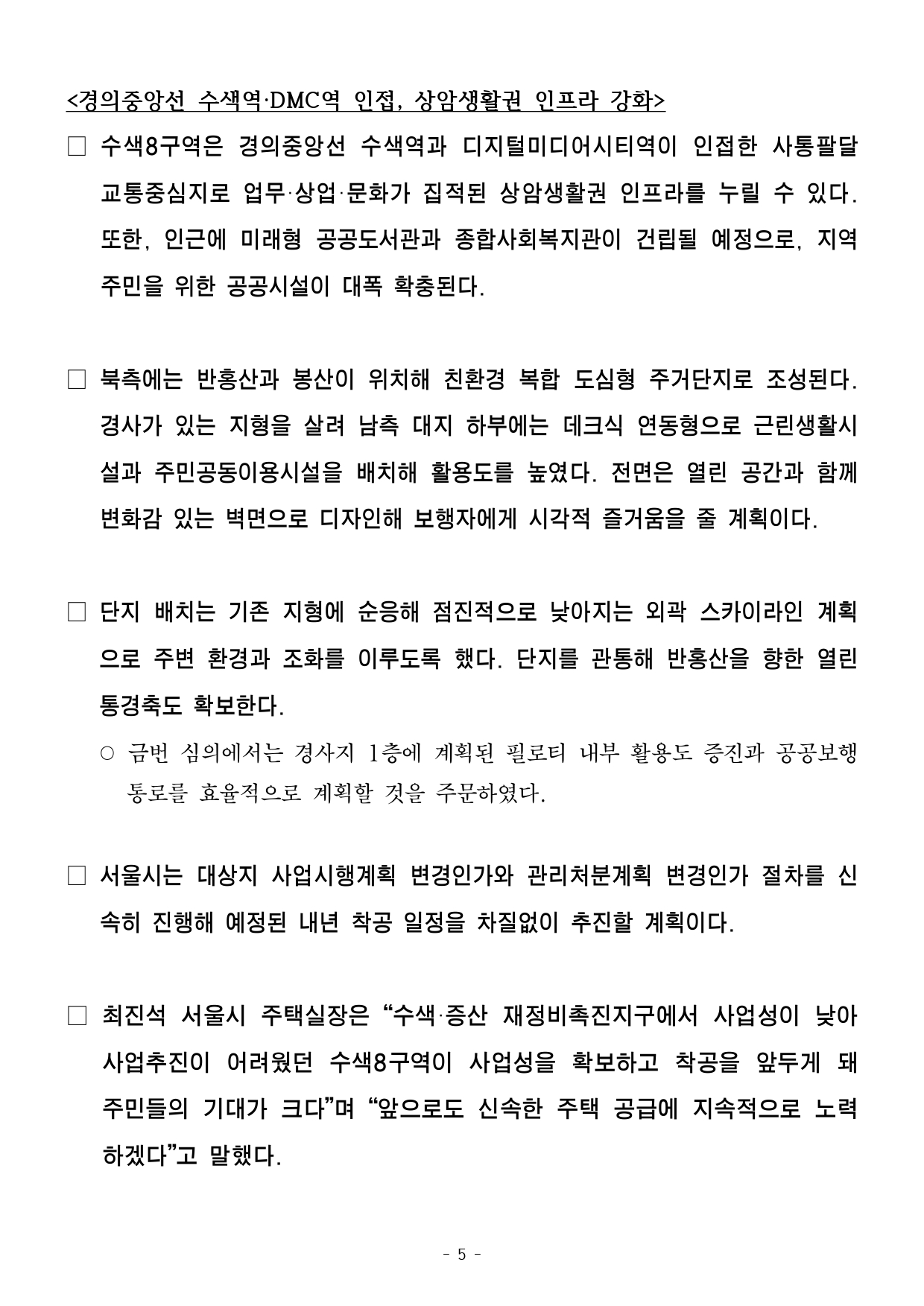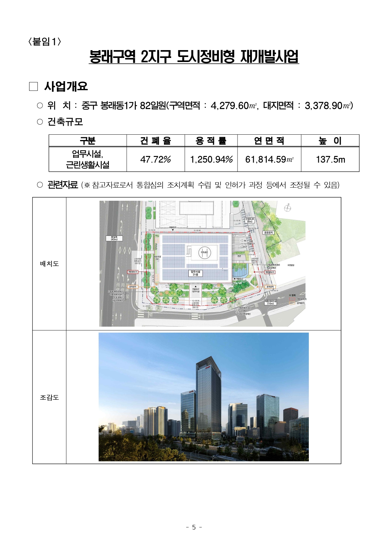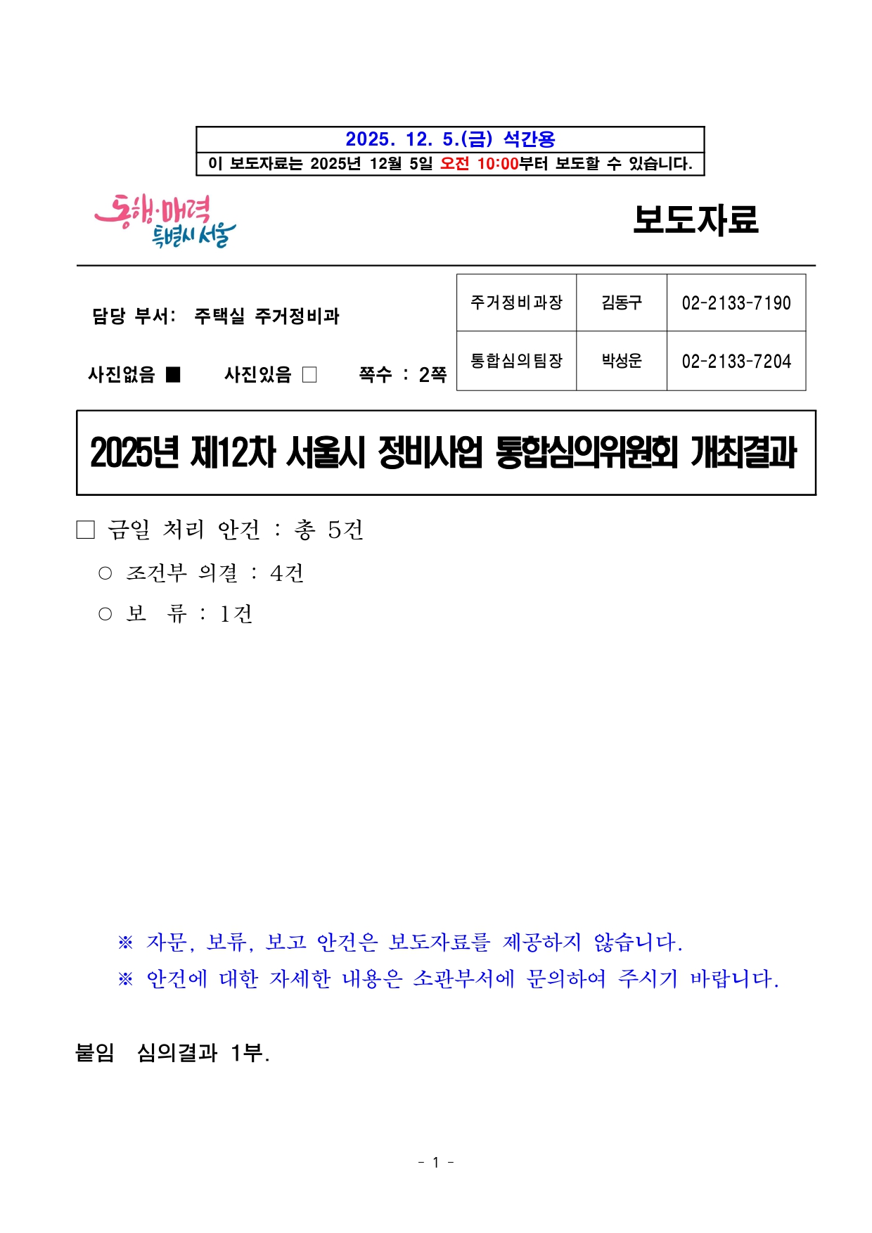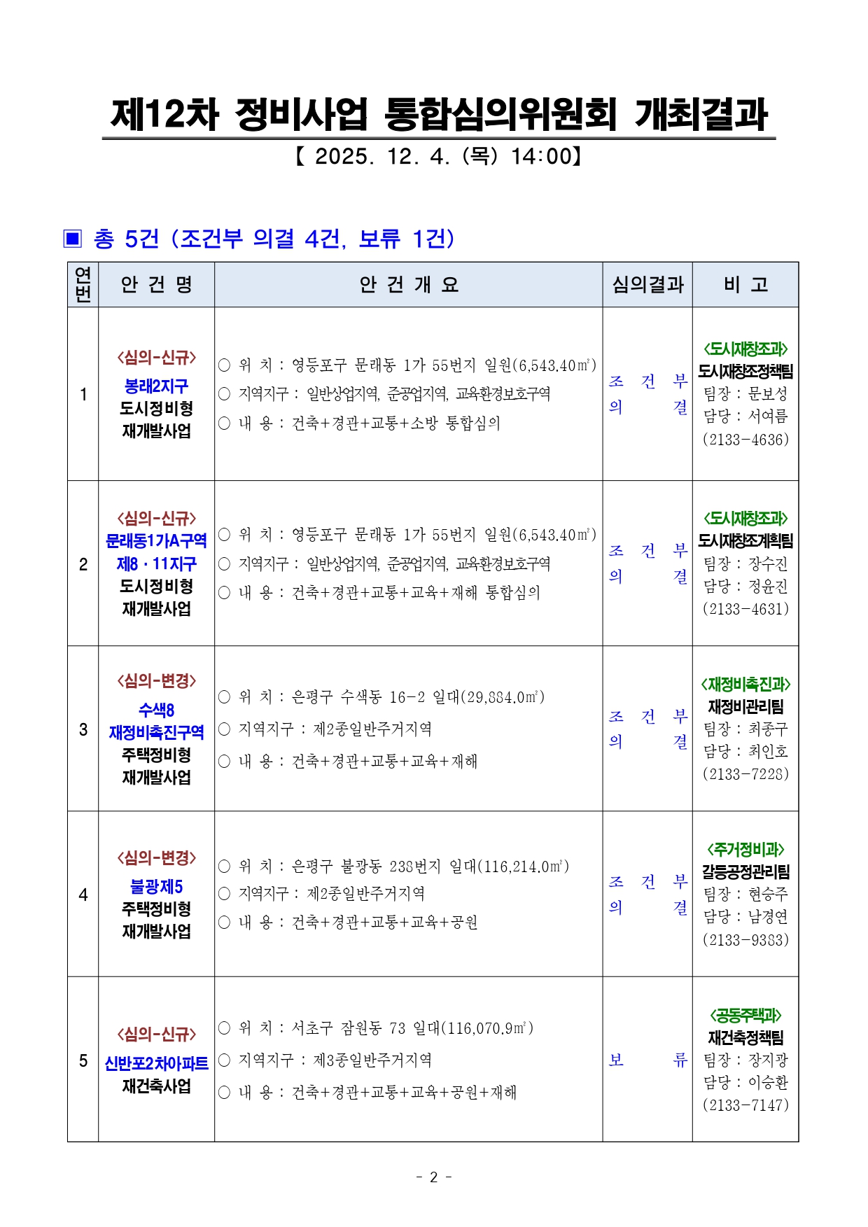 - 1 - 2025. 12. 5.(금) 석간용 이 보도자료는 2025년 12월 5일 오전 10:00부터 보도할 수 있습니다. 보도자료담당 부서: 주택실 주거정비과 주거정비과장 김동구 02-2133-7190통합심의팀장 박성운 02-2133-7204사진없음 ■ 사진있음 □ 쪽수 : 2쪽 2025년 제12차 서울시 정비사업 통합심의위원회 개최결과□ 금일 처리 안건 : 총 5건 ○ 조건부 의결 : 4건 ○ 보 류 : 1건 ※ 자문, 보류, 보고 안건은 보도자료를 제공하지 않습니다. ※ 안건에 대한 자세한 내용은 소관부서에 문의하여 주시기 바랍니다. 붙임 심의결과 1부. - 2 - 제12차 정비사업 통합심의위원회 개최결과【 2025. 12. 4. (목) 14:00】 ▣ 총 5건 (조건부 의결 4건, 보류 1건) 연 번 안 건 명 안 건 개 요 심의결과 비고1 <심의-신규> 봉래2지구 도시정비형 재개발사업 ○ 위 치 : 영등포구 문래동 1가 55번지 일원(6,543.40㎡) ○ 지역지구 : 일반상업지역, 준공업지역, 교육환경보호구역 ○ 내 용 : 건축+경관+교통+소방 통합심의 조 건 부 의 결 <도시재창조과> 도시재창조정책팀팀장 : 문보성담당 : 서여름(2133-4636) 2 <심의-신규> 문래동1가A구역 제8·11지구 도시정비형 재개발사업 ○ 위 치 : 영등포구 문래동 1가 55번지 일원(6,543.40㎡) ○ 지역지구 : 일반상업지역, 준공업지역, 교육환경보호구역 ○ 내 용 : 건축+경관+교통+교육+재해 통합심의 조 건 부 의 결 <도시재창조과> 도시재창조계획팀팀장 : 장수진담당 : 정윤진(2133-4631) 3 <심의-변경> 수색8 재정비촉진구역 주택정비형 재개발사업 ○ 위 치 : 은평구 수색동 16-2 일대(29,884.0㎡) ○ 지역지구 : 제2종일반주거지역 ○ 내 용 : 건축+경관+교통+교육+재해 조 건 부 의 결 <재정비촉진과> 재정비관리팀팀장 : 최종구담당 : 최인호(2133-7228) 4 <심의-변경> 불광제5 주택정비형 재개발사업 ○ 위 치 : 은평구 불광동 238번지 일대(116,214.0㎡) ○ 지역지구 : 제2종일반주거지역 ○ 내 용 : 건축+경관+교통+교육+공원 조 건 부 의 결 <주거정비과> 갈등공정관리팀팀장 : 현승주담당 : 남경연(2133-9383) 5 <심의-신규> 신반포2차아파트 재건축사업 ○ 위 치 : 서초구 잠원동 73 일대(116,070.9㎡) ○ 지역지구 : 제3종일반주거지역 ○ 내 용 : 건축+경관+교통+교육+공원+재해 보 류 <공동주택과> 재건축정책팀팀장 : 장지광담당 : 이승환(2133-7147) - 3 - 2025. 12. 5.(금) 석간용 이 보도자료는 2025년 12월 5일 오전 10:00부터 보도할 수 있습니다.보도자료담당부서 : 도시공간본부 도시재창조과 도시재창조과장 김용배 02-2133-4630 도시재창조정책팀장 문보성 02-2133-4632 사진없음 □ 사진있음 ■ 쪽수 : 3쪽 봉래구역 2지구 정비사업 통합심의위원회 통과…사업 본격화- 제12차 서울특별시 정비사업 통합심의위원회 개최결과 ‘조건부 의결’ - 31층 규모 업무시설 건립, 서울역 일대 노후 도심환경 개선 기대- 대상지 인근 외부공간 통합기획, 공공-민간 협력 생활체육시설 조성□ 서울시는 12.04.(목)에 열린 제12차 정비사업 통합심의위원회에서‘봉래구역 2지구 도시정비형 재개발사업’ 심의안을 건축․경관․교통․소방 분야에 대해 통합심의해 ‘조건부 의결’ 됐다고 밝혔다. □ 대상지는 서울역 인근으로 입지적 강점을 가지고 있음에도 불구하고30년 이상 노후 건축물이 밀집된 지역으로 이번 통합심의를통해지상 31층 규모의 새로운 업무시설로 탈바꿈한다. ○ 서울역 주변은 서울역 북부역세권 개발사업을 포함해 서소문, 서울역서대문 1‧2구역, 양동 등에서 다수의 정비사업이 활발하게 추진되고있으며 봉래구역까지 정비사업 대열에 합류하여 서울역 일대에 획기적인변화를 가져올 것으로 기대된다. - 4 - □ 대상지 남‧동측으로 개방형녹지(대지면적의 33%)를 조성하는것뿐만아니라 기 조성된 봉래구역 1지구 외부공간을 재조성하여 통합그린네트워크를 구축하고 자연과 일상이 만나는 감성 가로공간으로조성할예정이다. 또한, 숲을 테마로 하는 공공공지 조성을 통해 도심속녹지의 흐름과 연결성을 강화한다. □ 특히, 지역 내 부족했던 체육 인프라를 확충함으로써 주민들의생활체육 활동을 활성화할 수 있는 기반을 마련했다. 새로운 모델의공공-민간 협력을 기반으로 민간은 실내 체육시설 공간 제공 및 시설(장비포함) 유지관리 등을 통해 공공성을 확보하고, 공공은 초기 투자비용없이 시설 운영을 통해 시민 건강증진과 생활체육 활성화를 도모한다. ○ 생활체육시설(지하 1층)은 피클볼, 탁구 등 다목적 실내체육관과피트니스센터 등으로 조성될 예정이다. ○ 금번 통합심의에서는 한개 층을 길게 내려가는 주차램프에 대해비상시를 대비한 소방시설 확충을 주문하였다. □ 조남준 서울시 도시공간본부장은 “봉래구역 2지구 통합심의통과로,낙후된 대상지에 대규모 업무공간과 양질의 편의시설을 조성함으로써지역 활성화에 기여하고, 서울역 일대의 개발사업과 연계하여대대적공간변화를 가져올 것으로 기대된다”고 말했다. - 5 - <붙임1> 봉래구역 2지구 도시정비형 재개발사업□ 사업개요 ○ 위 치 : 중구 봉래동1가 82일원(구역면적 : 4,279.60㎡, 대지면적 : 3,378.90㎡) ○ 건축규모 구분 건 폐 율 용 적 률 연 면 적 높이업무시설, 근린생활시설 47.72% 1,250.94% 61,814.59㎡ 137.5m○ 관