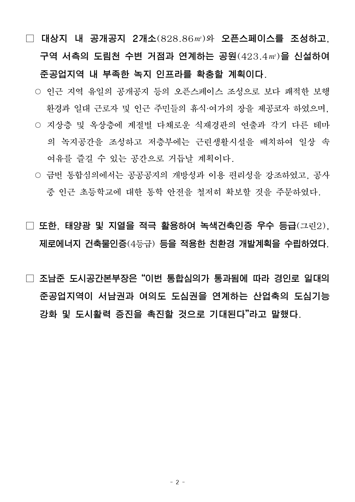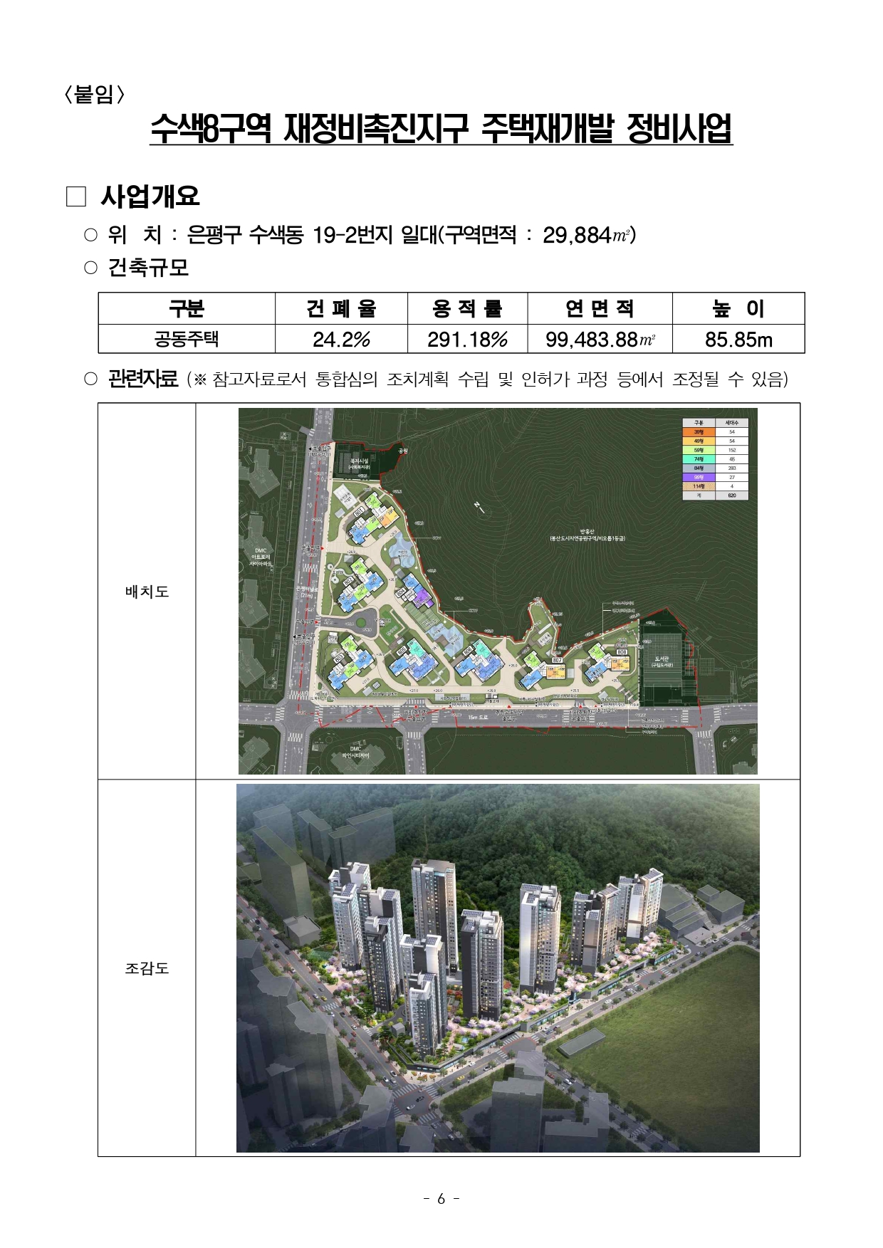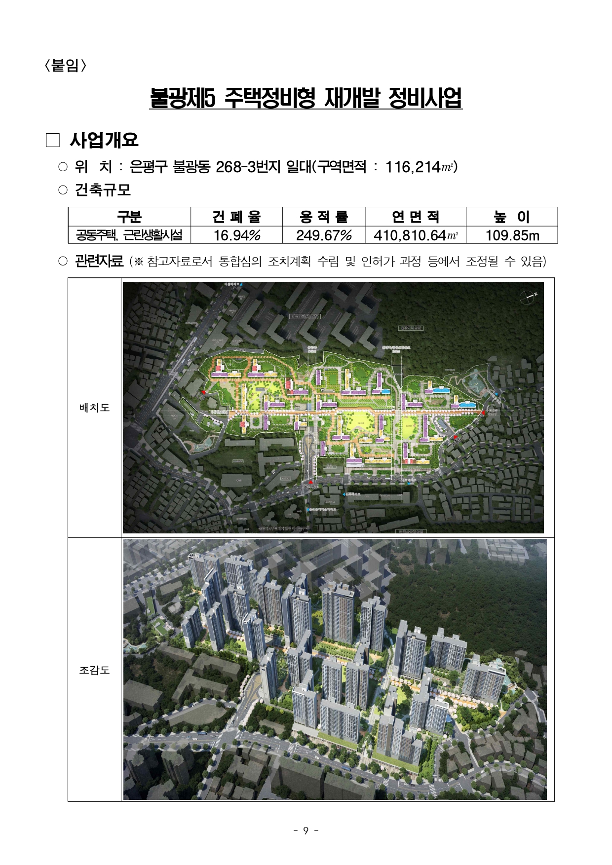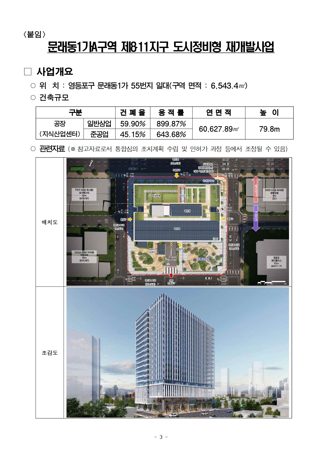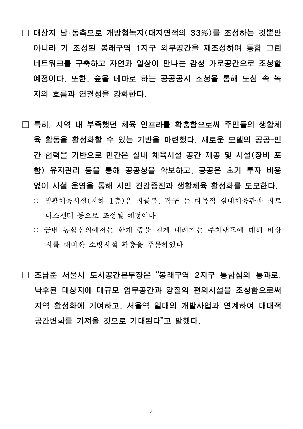 - 1 - 2025. 12. 5.(금) 석간용 이 보도자료는 2025년 12월 5일 오전 10:00부터 보도할 수 있습니다. 보도자료담당 부서: 주택실 주거정비과 주거정비과장 김동구 02-2133-7190통합심의팀장 박성운 02-2133-7204사진없음 ■ 사진있음 □ 쪽수 : 2쪽 2025년 제12차 서울시 정비사업 통합심의위원회 개최결과□ 금일 처리 안건 : 총 5건 ○ 조건부 의결 : 4건 ○ 보 류 : 1건 ※ 자문, 보류, 보고 안건은 보도자료를 제공하지 않습니다. ※ 안건에 대한 자세한 내용은 소관부서에 문의하여 주시기 바랍니다. 붙임 심의결과 1부. - 2 - 제12차 정비사업 통합심의위원회 개최결과【 2025. 12. 4. (목) 14:00】 ▣ 총 5건 (조건부 의결 4건, 보류 1건) 연 번 안 건 명 안 건 개 요 심의결과 비고1 <심의-신규> 봉래2지구 도시정비형 재개발사업 ○ 위 치 : 영등포구 문래동 1가 55번지 일원(6,543.40㎡) ○ 지역지구 : 일반상업지역, 준공업지역, 교육환경보호구역 ○ 내 용 : 건축+경관+교통+소방 통합심의 조 건 부 의 결 <도시재창조과> 도시재창조정책팀팀장 : 문보성담당 : 서여름(2133-4636) 2 <심의-신규> 문래동1가A구역 제8·11지구 도시정비형 재개발사업 ○ 위 치 : 영등포구 문래동 1가 55번지 일원(6,543.40㎡) ○ 지역지구 : 일반상업지역, 준공업지역, 교육환경보호구역 ○ 내 용 : 건축+경관+교통+교육+재해 통합심의 조 건 부 의 결 <도시재창조과> 도시재창조계획팀팀장 : 장수진담당 : 정윤진(2133-4631) 3 <심의-변경> 수색8 재정비촉진구역 주택정비형 재개발사업 ○ 위 치 : 은평구 수색동 16-2 일대(29,884.0㎡) ○ 지역지구 : 제2종일반주거지역 ○ 내 용 : 건축+경관+교통+교육+재해 조 건 부 의 결 <재정비촉진과> 재정비관리팀팀장 : 최종구담당 : 최인호(2133-7228) 4 <심의-변경> 불광제5 주택정비형 재개발사업 ○ 위 치 : 은평구 불광동 238번지 일대(116,214.0㎡) ○ 지역지구 : 제2종일반주거지역 ○ 내 용 : 건축+경관+교통+교육+공원 조 건 부 의 결 <주거정비과> 갈등공정관리팀팀장 : 현승주담당 : 남경연(2133-9383) 5 <심의-신규> 신반포2차아파트 재건축사업 ○ 위 치 : 서초구 잠원동 73 일대(116,070.9㎡) ○ 지역지구 : 제3종일반주거지역 ○ 내 용 : 건축+경관+교통+교육+공원+재해 보 류 <공동주택과> 재건축정책팀팀장 : 장지광담당 : 이승환(2133-7147) - 3 - 2025. 12. 5.(금) 석간용 이 보도자료는 2025년 12월 5일 오전 10:00부터 보도할 수 있습니다.보도자료담당부서 : 도시공간본부 도시재창조과 도시재창조과장 김용배 02-2133-4630 도시재창조정책팀장 문보성 02-2133-4632 사진없음 □ 사진있음 ■ 쪽수 : 3쪽 봉래구역 2지구 정비사업 통합심의위원회 통과…사업 본격화- 제12차 서울특별시 정비사업 통합심의위원회 개최결과 ‘조건부 의결’ - 31층 규모 업무시설 건립, 서울역 일대 노후 도심환경 개선 기대- 대상지 인근 외부공간 통합기획, 공공-민간 협력 생활체육시설 조성□ 서울시는 12.04.(목)에 열린 제12차 정비사업 통합심의위원회에서‘봉래구역 2지구 도시정비형 재개발사업’ 심의안을 건축․경관․교통․소방 분야에 대해 통합심의해 ‘조건부 의결’ 됐다고 밝혔다. □ 대상지는 서울역 인근으로 입지적 강점을 가지고 있음에도 불구하고30년 이상 노후 건축물이 밀집된 지역으로 이번 통합심의를통해지상 31층 규모의 새로운 업무시설로 탈바꿈한다. ○ 서울역 주변은 서울역 북부역세권 개발사업을 포함해 서소문, 서울역서대문 1‧2구역, 양동 등에서 다수의 정비사업이 활발하게 추진되고있으며 봉래구역까지 정비사업 대열에 합류하여 서울역 일대에 획기적인변화를 가져올 것으로 기대된다. - 4 - □ 대상지 남‧동측으로 개방형녹지(대지면적의 33%)를 조성하는것뿐만아니라 기 조성된 봉래구역 1지구 외부공간을 재조성하여 통합그린네트워크를 구축하고 자연과 일상이 만나는 감성 가로공간으로조성할예정이다. 또한, 숲을 테마로 하는 공공공지 조성을 통해 도심속녹지의 흐름과 연결성을 강화한다. □ 특히, 지역 내 부족했던 체육 인프라를 확충함으로써 주민들의생활체육 활동을 활성화할 수 있는 기반을 마련했다. 새로운 모델의공공-민간 협력을 기반으로 민간은 실내 체육시설 공간 제공 및 시설(장비포함) 유지관리 등을 통해 공공성을 확보하고, 공공은 초기 투자비용없이 시설 운영을 통해 시민 건강증진과 생활체육 활성화를 도모한다. ○ 생활체육시설(지하 1층)은 피클볼, 탁구 등 다목적 실내체육관과피트니스센터 등으로 조성될 예정이다. ○ 금번 통합심의에서는 한개 층을 길게 내려가는 주차램프에 대해비상시를 대비한 소방시설 확충을 주문하였다. □ 조남준 서울시 도시공간본부장은 “봉래구역 2지구 통합심의통과로,낙후된 대상지에 대규모 업무공간과 양질의 편의시설을 조성함으로써지역 활성화에 기여하고, 서울역 일대의 개발사업과 연계하여대대적공간변화를 가져올 것으로 기대된다”고 말했다. - 5 - <붙임1> 봉래구역 2지구 도시정비형 재개발사업□ 사업개요 ○ 위 치 : 중구 봉래동1가 82일원(구역면적 : 4,279.60㎡, 대지면적 : 3,378.90㎡) ○ 건축규모 구분 건 폐 율 용 적 률 연 면 적 높이업무시설, 근린생활시설 47.72% 1,250.94% 61,814.59㎡ 137.5m○ 관