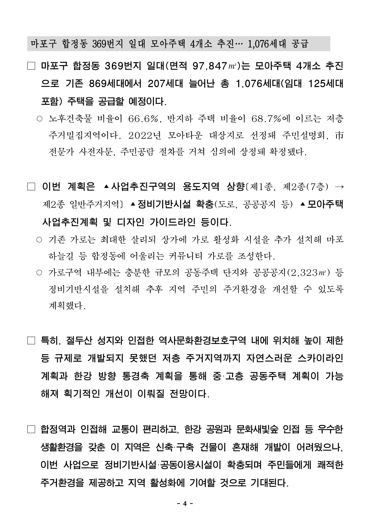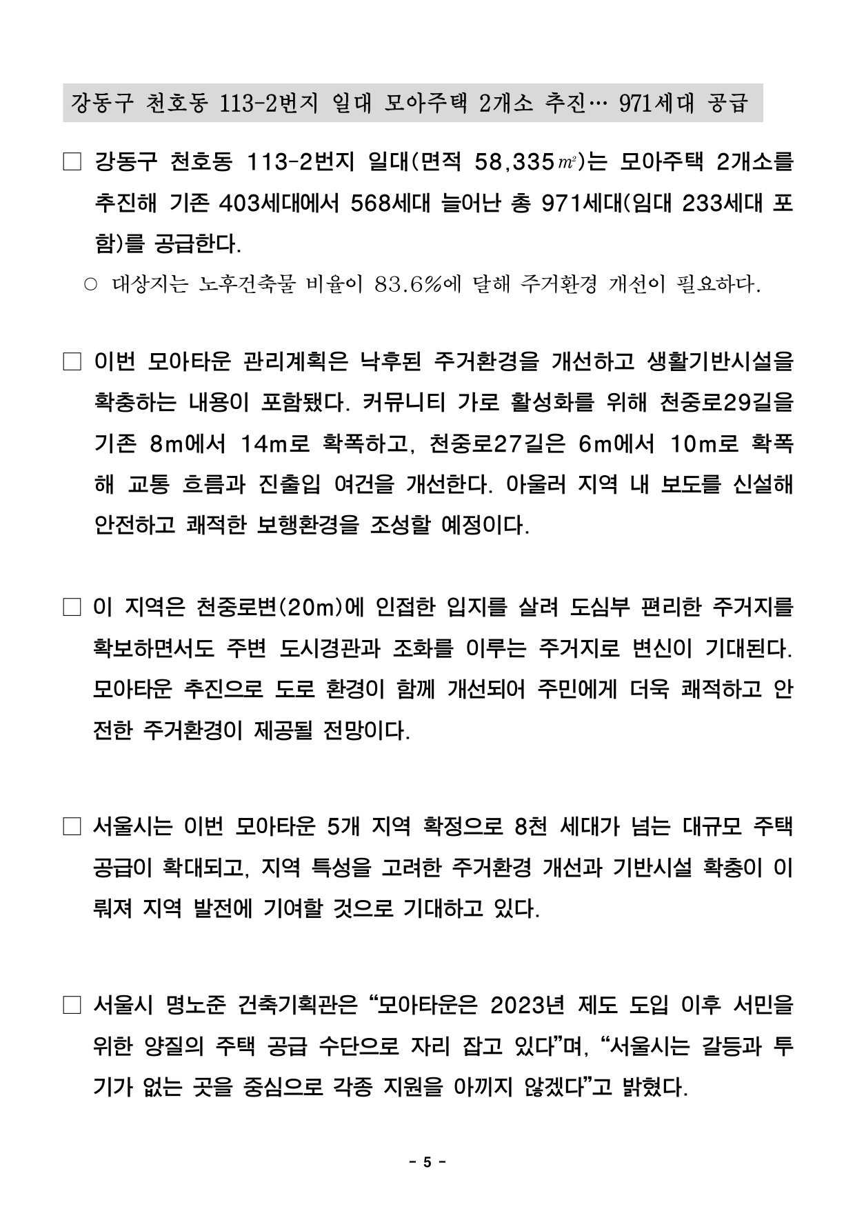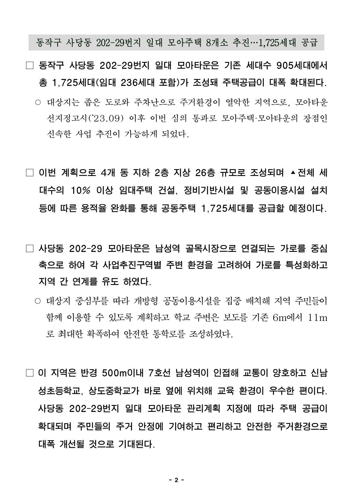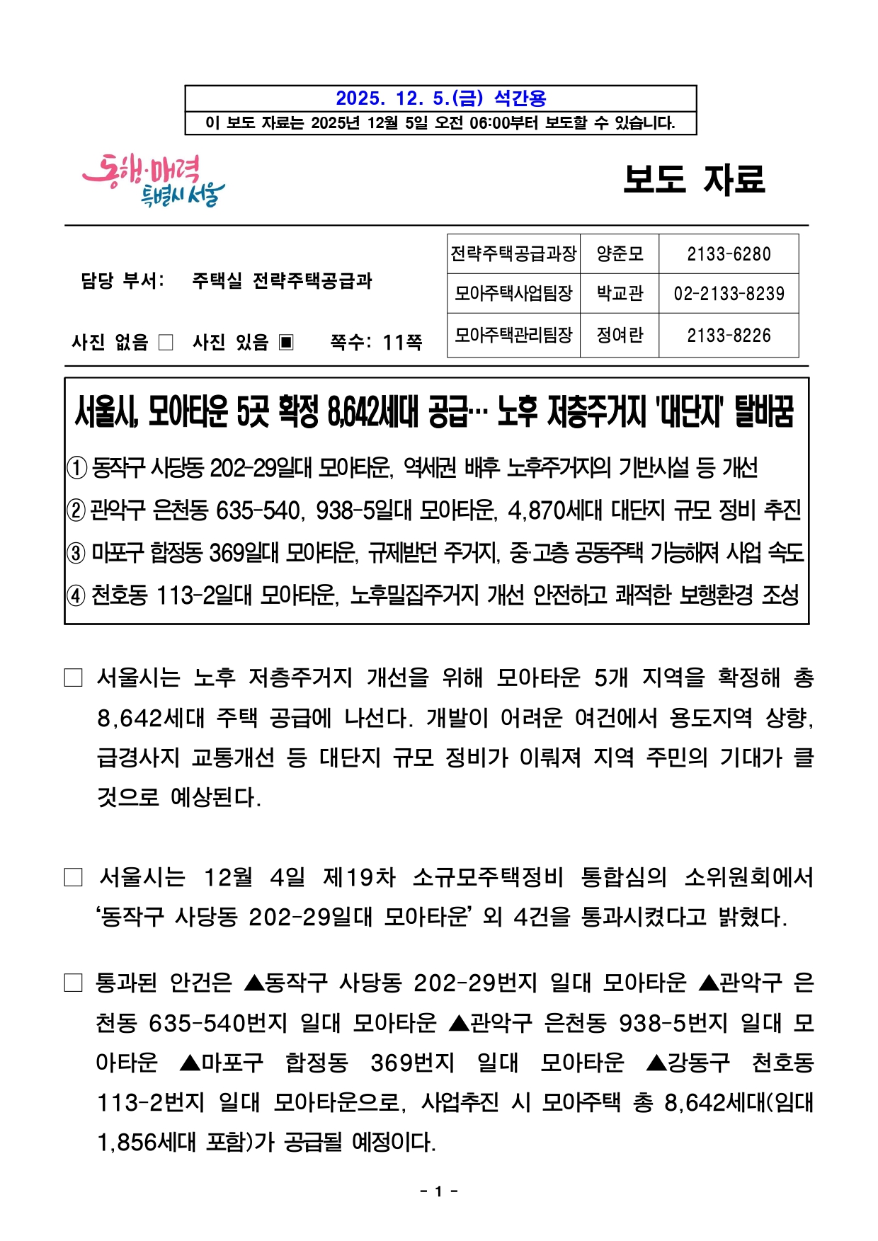 - 1 - 2025. 12. 5.(금) 석간용 이 보도 자료는 2025년 12월 5일 오전 06:00부터 보도할 수 있습니다. 보도 자료담당 부서: 주택실 전략주택공급과 전략주택공급과장 양준모 2133-6280 모아주택사업팀장 박교관 02-2133-8239 사진 없음 □ 사진 있음 ▣ 쪽수 모아주택관리팀장 정여란 2133-8226 : 11쪽 서울시, 모아타운 5곳 확정 8,642세대 공급… 노후 저층주거지 '대단지' 탈바꿈① 동작구 사당동 202-29일대 모아타운, 역세권 배후 노후주거지의 기반시설 등개선②관악구 은천동 635-540, 938-5일대 모아타운, 4,870세대 대단지 규모정비추진③ 마포구 합정동 369일대 모아타운, 규제받던 주거지, 중·고층 공동주택 가능해져사업속도④ 천호동 113-2일대 모아타운, 노후밀집주거지 개선 안전하고 쾌적한 보행환경조성□ 서울시는 노후 저층주거지 개선을 위해 모아타운 5개 지역을 확정해총8,642세대 주택 공급에 나선다. 개발이 어려운 여건에서 용도지역상향,급경사지 교통개선 등 대단지 규모 정비가 이뤄져 지역 주민의 기대가클것으로 예상된다. □ 서울시는 12월 4일 제19차 소규모주택정비 통합심의 소위원회에서‘동작구 사당동 202-29일대 모아타운’ 외 4건을 통과시켰다고 밝혔다. □ 통과된 안건은 ▲동작구 사당동 202-29번지 일대 모아타운 ▲관악구은천동 635-540번지 일대 모아타운 ▲관악구 은천동 938-5번지일대모아타운 ▲마포구 합정동 369번지 일대 모아타운 ▲강동구천호동113-2번지 일대 모아타운으로, 사업추진 시 모아주택 총 8,642세대(임대1,856세대 포함)가 공급될 예정이다. - 2 - 동작구 사당동 202-29번지 일대 모아주택 8개소 추진…1,725세대공급□ 동작구 사당동 202-29번지 일대 모아타운은 기존 세대수 905세대에서총 1,725세대(임대 236세대 포함)가 조성돼 주택공급이 대폭 확대된다.○ 대상지는 좁은 도로와 주차난으로 주거환경이 열악한 지역으로, 모아타운선지정고시(‘23.09) 이후 이번 심의 통과로 모아주택·모아타운의장점인신속한 사업 추진이 가능하게 되었다. □ 이번 계획으로 4개 동 지하 2층 지상 26층 규모로 조성되며 ▴전체세대수의 10% 이상 임대주택 건설, 정비기반시설 및 공동이용시설설치등에 따른 용적율 완화를 통해 공동주택 1,725세대를 공급할 예정이다.□ 사당동 202-29 모아타운은 남성역 골목시장으로 연결되는 가로를중심축으로 하여 각 사업추진구역별 주변 환경을 고려하여 가로를 특성화하고지역 간 연계를 유도 하였다. ○ 대상지 중심부를 따라 개방형 공동이용시설을 집중 배치해 지역주민들이함께 이용할 수 있도록 계획하고 학교 주변은 보도를 기존 6m에서11m로 최대한 확폭하여 안전한 통학로를 조성하였다. □ 이 지역은 반경 500m이내 7호선 남성역이 인접해 교통이 양호하고신남성초등학교, 상도중학교가 바로 옆에 위치해 교육 환경이 우수한편이다.사당동 202-29번지 일대 모아타운 관리계획 지정에 따라 주택공급이확대되며 주민들의 주거 안정에 기여하고 편리하고 안전한 주거환경으로대폭 개선될 것으로 기대된다. - 3 - 관악구 은천동 635-540 및 938-5일대 모아주택 9개소 추진 … 4,870세대공급□ 관악구 은천동 635-540번지 일대(면적 91,988.0㎡)와 938-5번지일대(면적 86,070.0㎡) 모아타운은 9개소 모아주택 추진으로 총 4,870세대(임대 1,262세대 포함) 대단지 규모의 주택이 공급될 예정이다. ○ 대상지는 국사봉 자락에 위치해 국회단지길(12m)을 사이에 두고 있어, 가파른 경사로 도로 통행 여건이 열악한 지역이다. □ 이번 계획으로 은천동 635-540 일대는 기존 2,239세대에서 2,507세대(임대 660세대 포함)로, 938-5 일대는 1,742세대에서 2,363세대(임대602세대 포함)로 대폭 늘어나 총 4,870세대 주택이 공급된다. □ 특히, 기존 좁은 도로를 넓혀 경사지의 차량 통행을 원활히 하고 건축한계선지정으로 안전한 보행로를 확보한다. 남북방향 도로를 신설해 모아타운내순환형 도로체계를 구축할 계획이다. ○ 국회단지길(12m→20m)을 확폭해 왕복 4차선 도로를 구축하고, 양측에각 3.25m 총 6.5m의 보행로를 조성해 안전을 강화한다. 또한, 학교변으로 6~10m 순환형 도로 조성과 함께 최소 2m이상 보도를 확보해안전한 보행환경을 만든다. □ 이 지역은 상도근린공원과 국사봉에 연접해 도로 개선과 기반시설확충으로자연 친화적인 쾌적한 주거지로 탄생이 기대된다. 또한, 서울관광고등학교,은천초등학교 등 보행 공간 확보로 안전한 교육환경 조성에도 기여할전망이다. - 4 - 마포구 합정동 369번지 일대 모아주택 4개소 추진… 1,076세대 공급□ 마포구 합정동 369번지 일대(면적 97,847㎡)는 모아주택 4개소추진으로 기존 869세대에서 207세대 늘어난 총 1,076세대(임대125세대포함) 주택을 공급할 예정이다. ○ 노후건축물 비율이 66.6%, 반지하 주택 비율이 68.7%에 이르는저층주거밀집지역이다. 2022년 모아타운 대상지로 선정돼 주민설명회, 市전문가 사전자문, 주민공람 절차를 거쳐 심의에 상정돼 확정됐다. □ 이번 계획은 ▴사업추진구역의 용도지역 상향[제1종, 제2종(7층) →제2종 일반주거지역] ▴정비기반시설 확충(도로, 공공공지 등) ▴모아주택사업추진계획 및 디자인 가이드라인 등이다. ○ 기존 가로는 최대한 살리되 상가에 