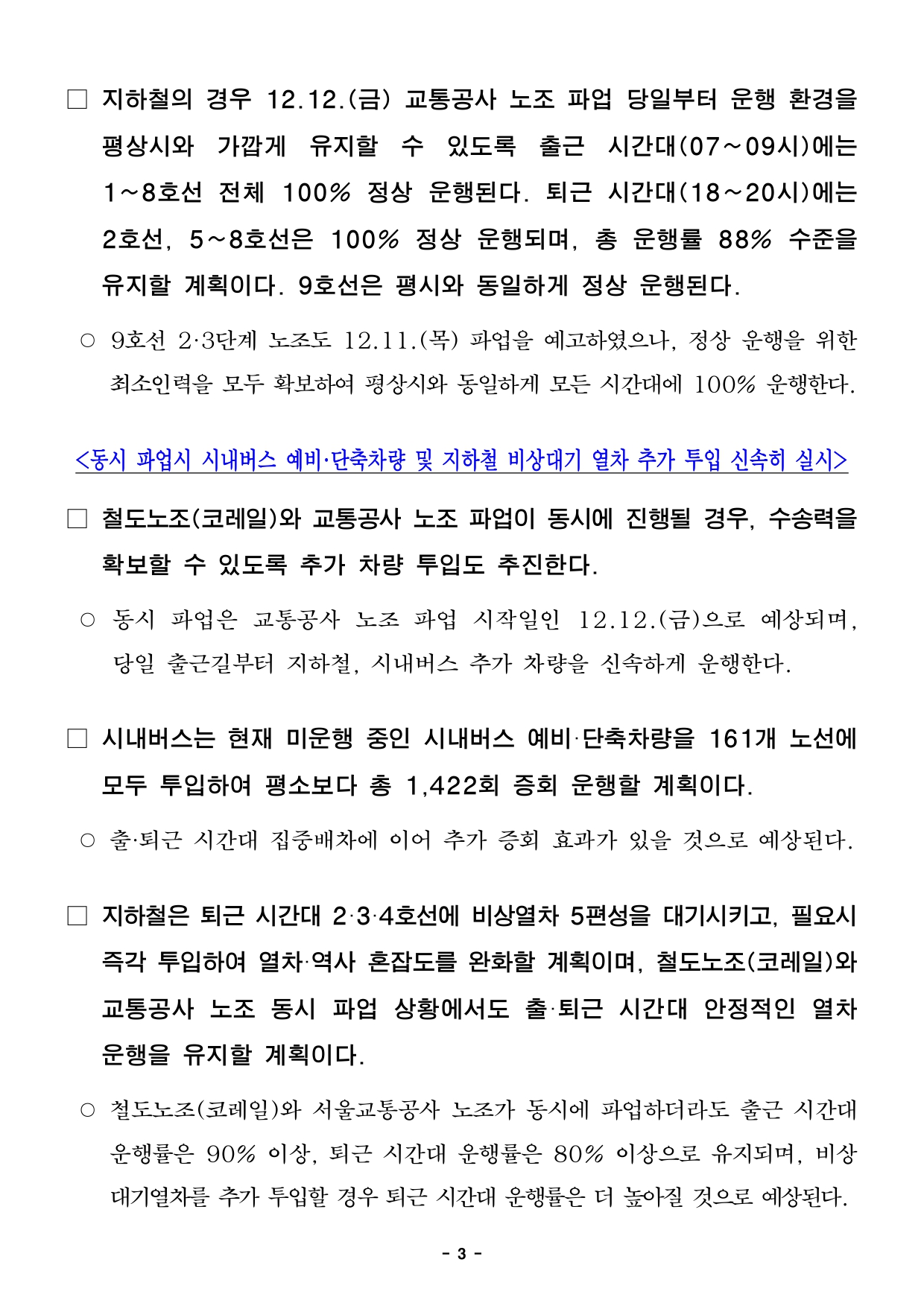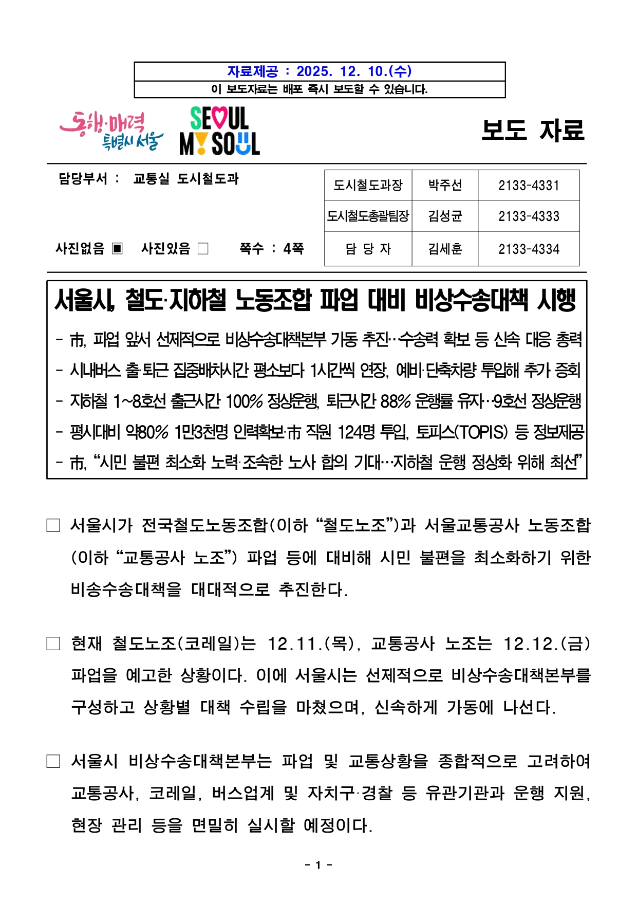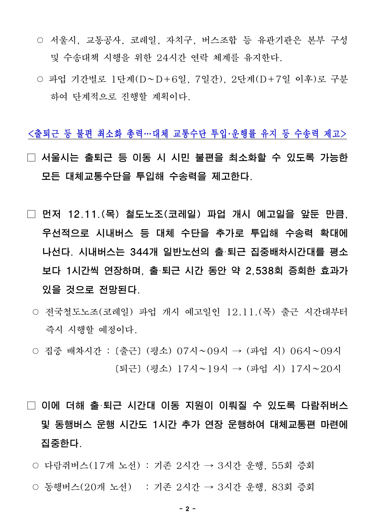 - 1 - 자료제공 : 2025. 12. 10.(수) 이 보도자료는 배포 즉시 보도할 수 있습니다. 보도 자료담당부서 : 교통실 도시철도과 도시철도과장 박주선 2133-4331 도시철도총괄팀장 김성균 2133-4333 사진없음 ▣ 사진있음 □ 쪽수 : 4쪽 담 당 자 김세훈 2133-4334 서울시, 철도·지하철 노동조합 파업 대비 비상수송대책 시행- 市, 파업 앞서 선제적으로 비상수송대책본부 가동 추진…수송력 확보 등 신속대응총력- 시내버스 출·퇴근 집중배차시간 평소보다 1시간씩 연장, 예비·단축차량 투입해추가증회- 지하철 1~8호선 출근시간 100% 정상운행, 퇴근시간 88% 운행률 유지…9호선정상운행- 평시대비 약80% 1만3천명 인력확보·市 직원 124명 투입, 토피스(TOPIS) 등정보제공- 市, “시민 불편 최소화 노력·조속한 노사 합의 기대…지하철 운행 정상화위해최선” □ 서울시가 전국철도노동조합(이하 “철도노조”)과 서울교통공사노동조합(이하 “교통공사 노조”) 파업 등에 대비해 시민 불편을 최소화하기위한비송수송대책을 대대적으로 추진한다. □ 현재 철도노조(코레일)는 12.11.(목), 교통공사 노조는 12.12.(금)파업을 예고한 상황이다. 이에 서울시는 선제적으로 비상수송대책본부를구성하고 상황별 대책 수립을 마쳤으며, 신속하게 가동에 나선다. □ 서울시 비상수송대책본부는 파업 및 교통상황을 종합적으로 고려하여교통공사, 코레일, 버스업계 및 자치구·경찰 등 유관기관과 운행지원,현장 관리 등을 면밀히 실시할 예정이다. - 2 - ○ 서울시, 교통공사, 코레일, 자치구, 버스조합 등 유관기관은 본부구성및 수송대책 시행을 위한 24시간 연락 체계를 유지한다. ○ 파업 기간별로 1단계(D~D+6일, 7일간), 2단계(D+7일 이후)로구분하여 단계적으로 진행할 계획이다. <출퇴근 등 불편 최소화 총력…대체 교통수단 투입·운행률 유지 등 수송력제고>□ 서울시는 출퇴근 등 이동 시 시민 불편을 최소화할 수 있도록가능한모든 대체교통수단을 투입해 수송력을 제고한다. □ 먼저 12.11.(목) 철도노조(코레일) 파업 개시 예고일을 앞둔만큼,우선적으로 시내버스 등 대체 수단을 추가로 투입해 수송력확대에나선다. 시내버스는 344개 일반노선의 출·퇴근 집중배차시간대를평소보다 1시간씩 연장하며, 출·퇴근 시간 동안 약 2,538회 증회한효과가있을 것으로 전망된다. ○ 전국철도노조(코레일) 파업 개시 예고일인 12.11.(목) 출근 시간대부터즉시 시행할 예정이다. ○ 집중 배차시간 : [출근] (평소) 07시~09시 → (파업 시) 06시~09시[퇴근] (평소) 17시~19시 → (파업 시) 17시~20시□ 이에 더해 출·퇴근 시간대 이동 지원이 이뤄질 수 있도록 다람쥐버스및 동행버스 운행 시간도 1시간 추가 연장 운행하여 대체교통편마련에집중한다. ○ 다람쥐버스(17개 노선) : 기존 2시간 → 3시간 운행, 55회 증회○ 동행버스(20개 노선) : 기존 2시간 → 3시간 운행, 83회 증회 - 3 - □ 지하철의 경우 12.12.(금) 교통공사 노조 파업 당일부터 운행환경을평상시와 가깝게 유지할 수 있도록 출근 시간대(07~09시)에는1~8호선 전체 100% 정상 운행된다. 퇴근 시간대(18~20시)에는2호선, 5~8호선은 100% 정상 운행되며, 총 운행률 88%수준을유지할 계획이다. 9호선은 평시와 동일하게 정상 운행된다. ○ 9호선 2·3단계 노조도 12.11.(목) 파업을 예고하였으나, 정상 운행을위한최소인력을 모두 확보하여 평상시와 동일하게 모든 시간대에 100% 운행한다. <동시 파업시 시내버스 예비·단축차량 및 지하철 비상대기 열차 추가 투입 신속히실시>□ 철도노조(코레일)와 교통공사 노조 파업이 동시에 진행될 경우, 수송력을확보할 수 있도록 추가 차량 투입도 추진한다. ○ 동시 파업은 교통공사 노조 파업 시작일인 12.12.(금)으로 예상되며, 당일 출근길부터 지하철, 시내버스 추가 차량을 신속하게 운행한다. □ 시내버스는 현재 미운행 중인 시내버스 예비·단축차량을 161개노선에모두 투입하여 평소보다 총 1,422회 증회 운행할 계획이다. ○ 출·퇴근 시간대 집중배차에 이어 추가 증회 효과가 있을 것으로 예상된다. □ 지하철은 퇴근 시간대 2·3·4호선에 비상열차 5편성을 대기시키고, 필요시즉각 투입하여 열차·역사 혼잡도를 완화할 계획이며, 철도노조(코레일)와교통공사 노조 동시 파업 상황에서도 출·퇴근 시간대 안정적인열차운행을 유지할 계획이다. ○ 철도노조(코레일)와 서울교통공사 노조가 동시에 파업하더라도 출근시간대운행률은 90% 이상, 퇴근 시간대 운행률은 80% 이상으로 유지되며, 비상대기열차를 추가 투입할 경우 퇴근 시간대 운행률은 더 높아질 것으로 예상된다. - 4 - <현장 지원인력 배치 등 지하철 안전 관리, 파업 장기화 시에도 수송대책철저시행>□ 서울시는 지하철이 필수 공익사업장으로 지정 되어있는 만큼, 운행률유지뿐만 아니라 혼잡·안전 관리 인력 배치 등 지하철 안전 관리에도만전을 다할 계획이다. □ 이를 위해 파업 미참여자 및 협력업체 직원 등 평시 대비 80%수준인약 1만 3천여 명의 인력을 확보하여 지하철 수송기능을 유지하고,주요 혼잡역사 31개역에 서울시 직원 124명을 역무지원 근무인력으로배치하는 등 현장 안전 관리에 집중할 계획이다. □ 원만한 노사 합의와 조