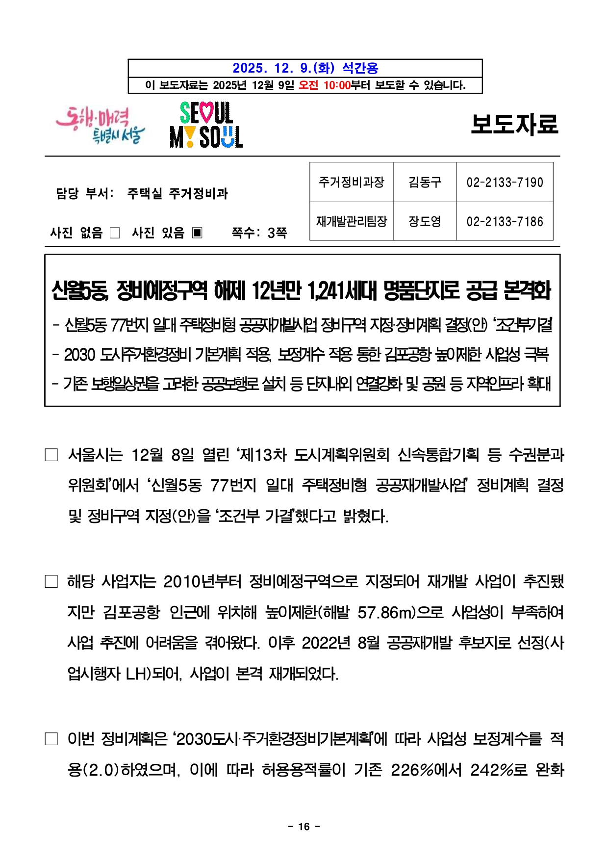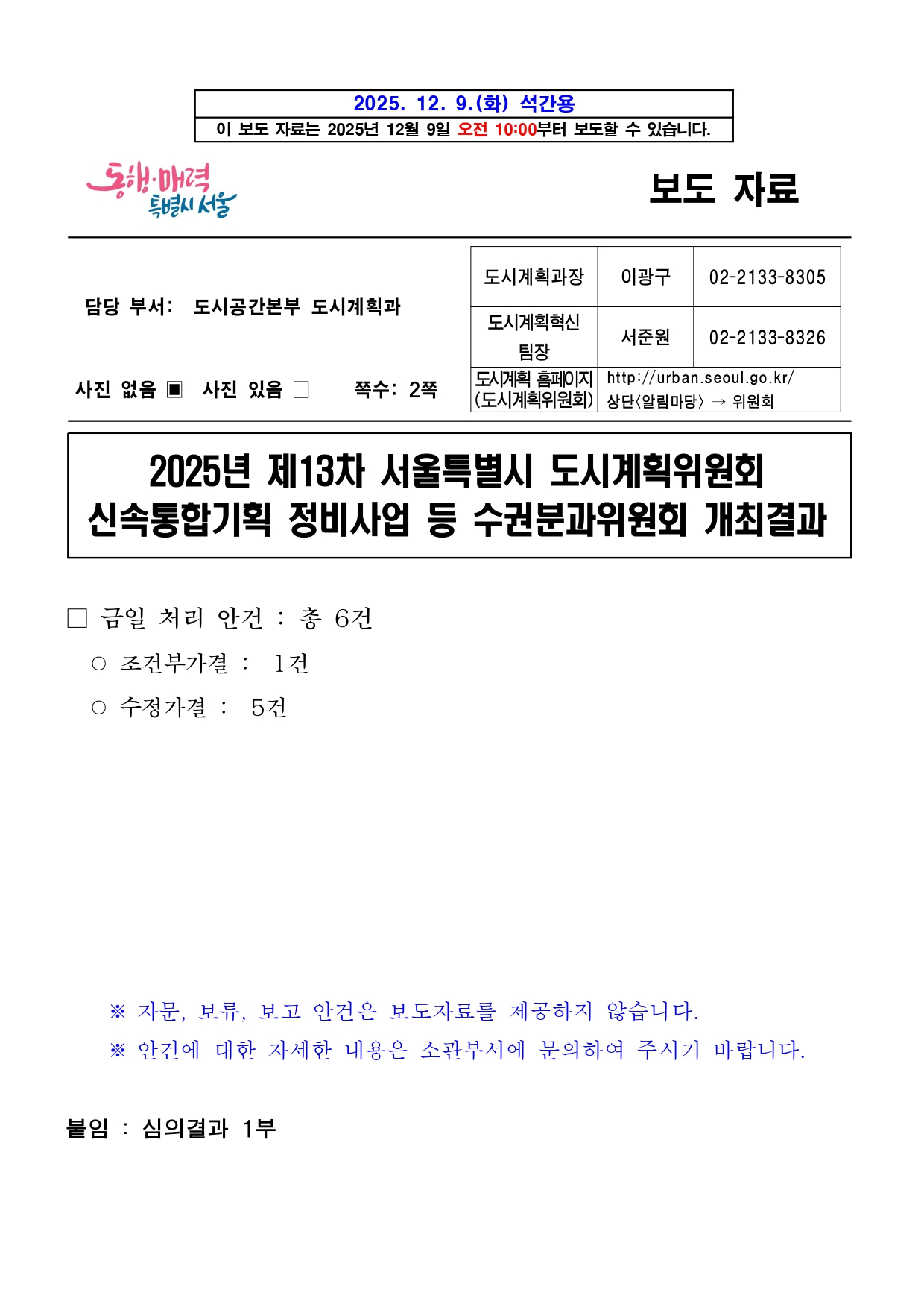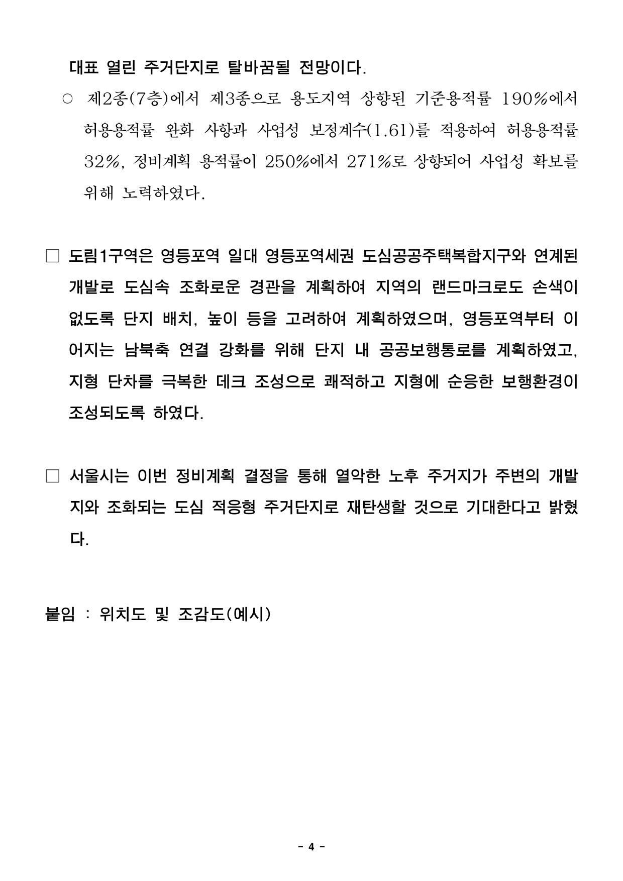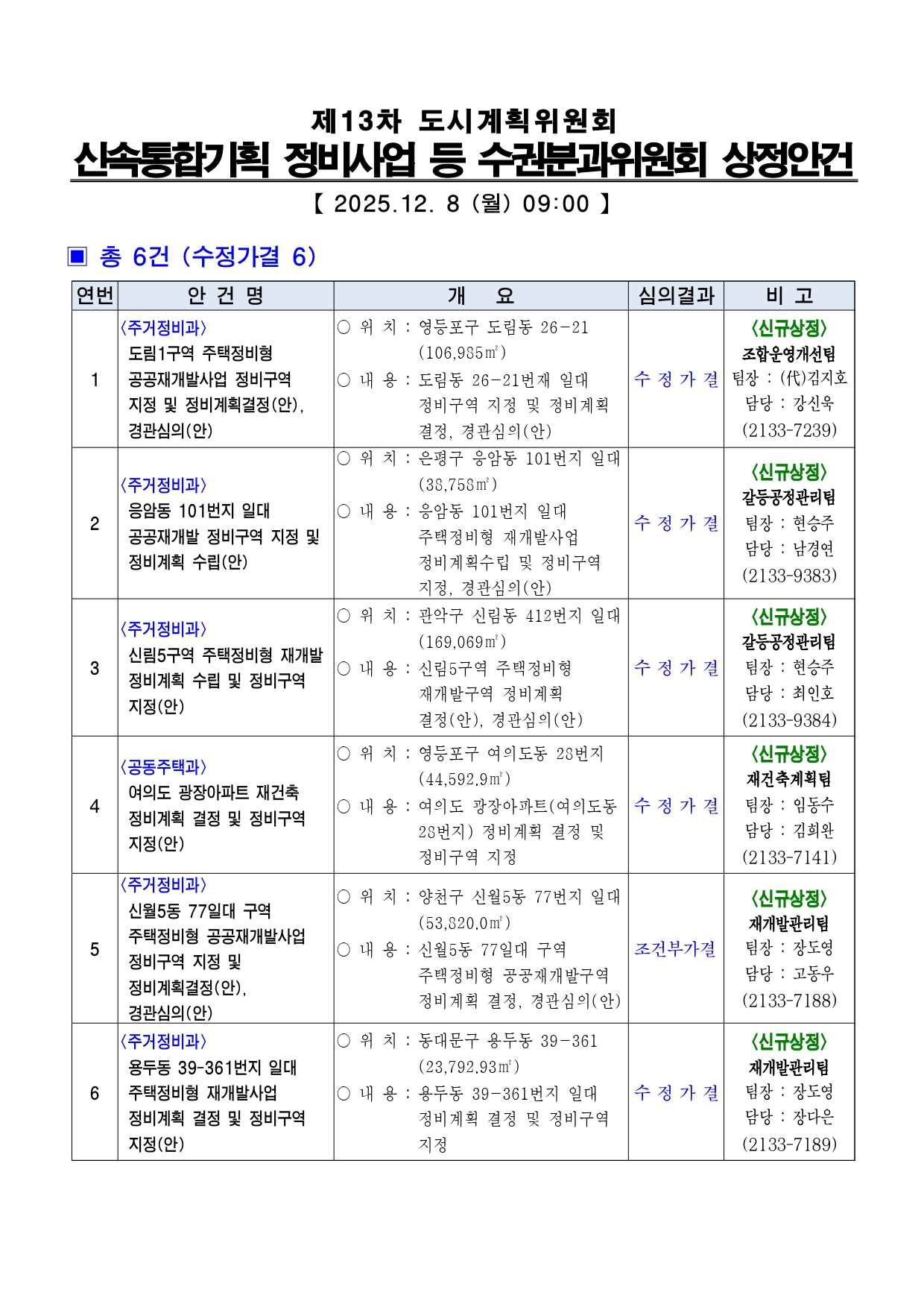2025. 12. 9.(화) 석간용 이 보도 자료는 2025년 12월 9일 오전 10:00부터 보도할 수 있습니다. 보도 자료담당 부서: 도시공간본부 도시계획과 도시계획과장 이광구 02-2133-8305 도시계획혁신 팀장 서준원 02-2133-8326 사진 없음 ▣ 사진 있음 □ 쪽수: 2쪽 도시계획 홈페이지 (도시계획위원회) http://urban.seoul.go.kr/ 상단<알림마당> → 위원회 2025년 제13차 서울특별시 도시계획위원회 신속통합기획 정비사업 등 수권분과위원회 개최결과□ 금일 처리 안건 : 총 6건 ○ 조건부가결 : 1건 ○ 수정가결 : 5건 ※ 자문, 보류, 보고 안건은 보도자료를 제공하지 않습니다. ※ 안건에 대한 자세한 내용은 소관부서에 문의하여 주시기 바랍니다. 붙임 : 심의결과 1부 제13차 도시계획위원회 신속통합기획 정비사업 등 수권분과위원회 상정안건 【 2025.12. 8 (월) 09:00 】 ▣ 총 6건 (수정가결 6) 연번 안 건 명 개 요 심의결과 비고1 <주거정비과> 도림1구역 주택정비형 공공재개발사업 정비구역 지정 및 정비계획결정(안), 경관심의(안) ○ 위 치 : 영등포구 도림동 26-21 (106,985㎡) ○ 내 용 : 도림동 26-21번재 일대 정비구역 지정 및 정비계획 결정, 경관심의(안) 수 정 가 결 <신규상정> 조합운영개선팀팀장 : (代)김지호담당 : 강신욱(2133-7239) 2 <주거정비과> 응암동 101번지 일대 공공재개발 정비구역 지정 및 정비계획 수립(안) ○ 위 치 : 은평구 응암동 101번지 일대 (38,758㎡) ○ 내 용 : 응암동 101번지 일대 주택정비형 재개발사업 정비계획수립 및 정비구역 지정, 경관심의(안) 수 정 가 결 <신규상정> 갈등공정관리팀팀장 : 현승주담당 : 남경연(2133-9383) 3 <주거정비과> 신림5구역 주택정비형 재개발 정비계획 수립 및 정비구역 지정(안) ○ 위 치 : 관악구 신림동 412번지 일대 (169,069㎡) ○ 내 용 : 신림5구역 주택정비형 재개발구역 정비계획 결정(안), 경관심의(안) 수 정 가 결 <신규상정> 갈등공정관리팀팀장 : 현승주담당 : 최인호(2133-9384) 4 <공동주택과> 여의도 광장아파트 재건축 정비계획 결정 및 정비구역 지정(안) ○ 위 치 : 영등포구 여의도동 28번지 (44,592.9㎡) ○ 내 용 : 여의도 광장아파트(여의도동 28번지) 정비계획 결정 및 정비구역 지정 수 정 가 결 <신규상정> 재건축계획팀팀장 : 임동수담당 : 김희완(2133-7141) 5 <주거정비과> 신월5동 77일대 구역 주택정비형 공공재개발사업 정비구역 지정 및 정비계획결정(안), 경관심의(안) ○ 위 치 : 양천구 신월5동 77번지 일대 (53,820.0㎡) ○ 내 용 : 신월5동 77일대 구역 주택정비형 공공재개발구역 정비계획 결정, 경관심의(안) 조건부가결 <신규상정> 재개발관리팀팀장 : 장도영담당 : 고동우(2133-7188) 6 <주거정비과> 용두동 39-361번지 일대 주택정비형 재개발사업 정비계획 결정 및 정비구역 지정(안) ○ 위 치 : 동대문구 용두동 39-361 (23,792.93㎡) ○ 내 용 : 용두동 39-361번지 일대 정비계획 결정 및 정비구역 지정 수 정 가 결 <신규상정> 재개발관리팀팀장 : 장도영담당 : 장다은(2133-7189) - 3 - □ 서울시는 2025년 12월 8일(월) 「제13차 도시계획위원회 신속통합기획정비사업 등 수권분과위원회」를 개최하여 ‘도림동 26-21번지 일대(이하도림1구역) 주택정비형 공공재개발사업’ 정비구역 지정 및 정비계획결정(안)을 '수정가결' 했다고 밝혔다. □ 대상지 일대는 영등포역 남측 노후된 단독·다세대주택이 혼재되어있고, 보행환경이 열악한 주택지이다. 2022년 8월 2차 공공재개발후보지선정 이후 분야별 전문가들이 참여하여 마련한 사전기획을 반영하여정비계획을 수립했다. □ 「2030 도시주거환경정비기본계획」의 허용용적률 완화를 적용해분양세대 비율이 높아져 사업성을 확보했으며, 45층 이하 총 2,500세대(임대주택626세대 포함)로 계획하여 지역 차원의 활력을 이끄는 영등포역일대2025. 12. 9.(화) 석간용 이 보도자료는 2025년 12월 9일 오전 10:00부터 보도할 수 있습니다. 보도자료 담당부서 : 주택실 주거정비과 주거정비과장 김동구 2133-7190 (도림1구역 주택정비형 공공재개발) 주거정비정책팀장 김지호 2133-7205 사진없음 □ 사진있음 ▣ 쪽수 : 3쪽 도림1구역 2,500세대 영등포역 일대 새로운 대표 주거단지 조성- 영등포구 도림1구역 주택정비형 공공재개발사업 정비구역 지정·정비계획 결정(안) ‘수정가결’ - 영등포역 일대 보행 친화적 열린공간 조성, 다채로운 도시경관 및 특화디자인도입- 2030 도시주거환경정비기본계획 적용, 보정계수 등 반영으로 공공성과 사업성높여 - 4 - 대표 열린 주거단지로 탈바꿈될 전망이다. ○ 제2종(7층)에서 제3종으로 용도지역 상향된 기준용적률 190%에서허용용적률 완화 사항과 사업성 보정계수(1.61)를 적용하여 허용용적률32%, 정비계획 용적률이 250%에서 271%로 상향되어 사업성확보를위해 노력하였다. □ 도림1구역은 영등포역 일대 영등포역세권 도심공공주택복합지구와연계된개발로 도심속 조화로운 경관을 계획하여 지역의 랜드마크로도손색이없도록 단지 배치, 높이 등을 고려하여 계획하였으며, 영등포역부터이어지는 남북축 연결 강화를 위해 단지 내 공공보행통로를 계획하였고,지형 단차를 극복한 데크 조성으로 쾌적하고 지형에 순응한 보행환경이조성되도록 하였다. □ 서울시