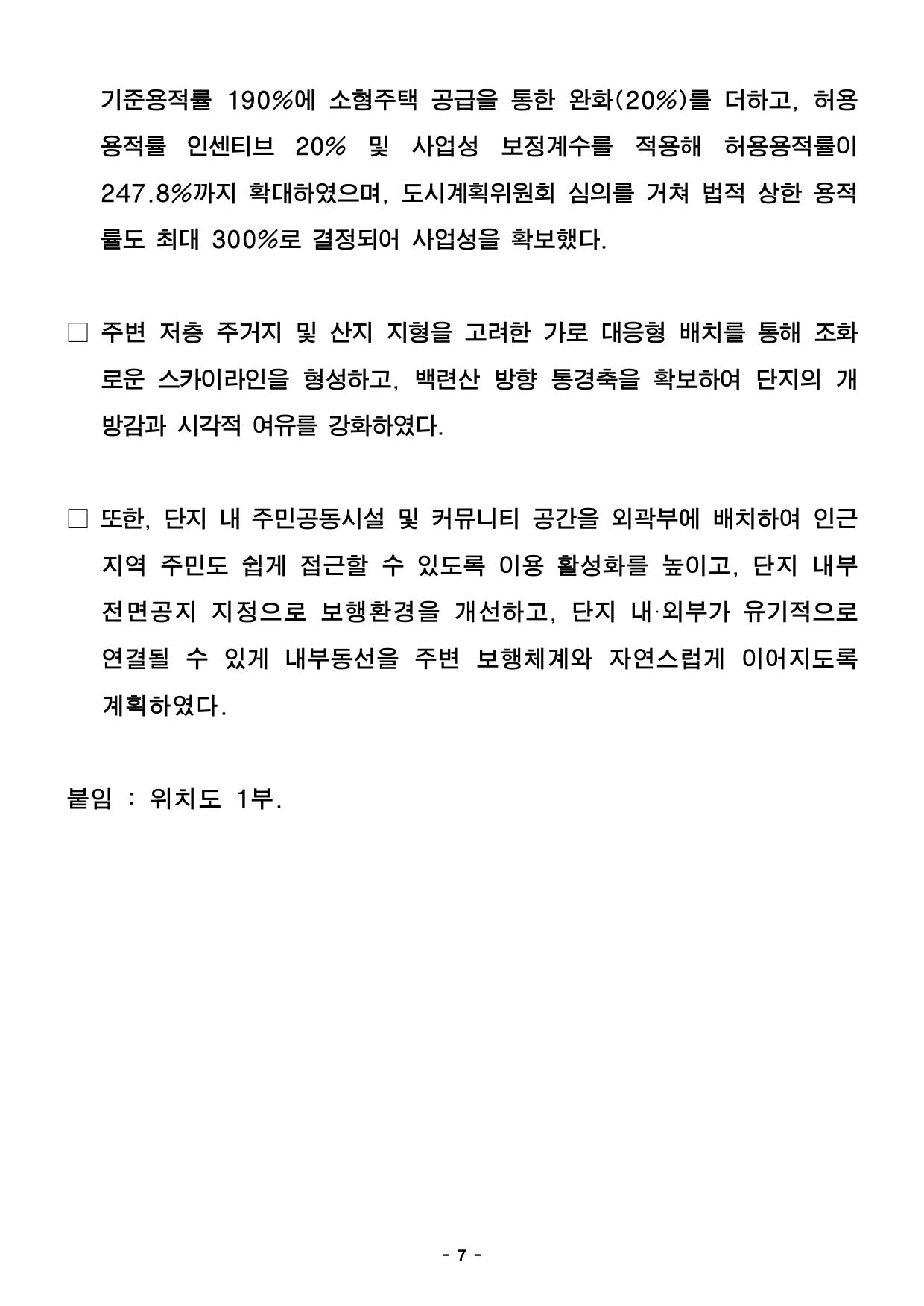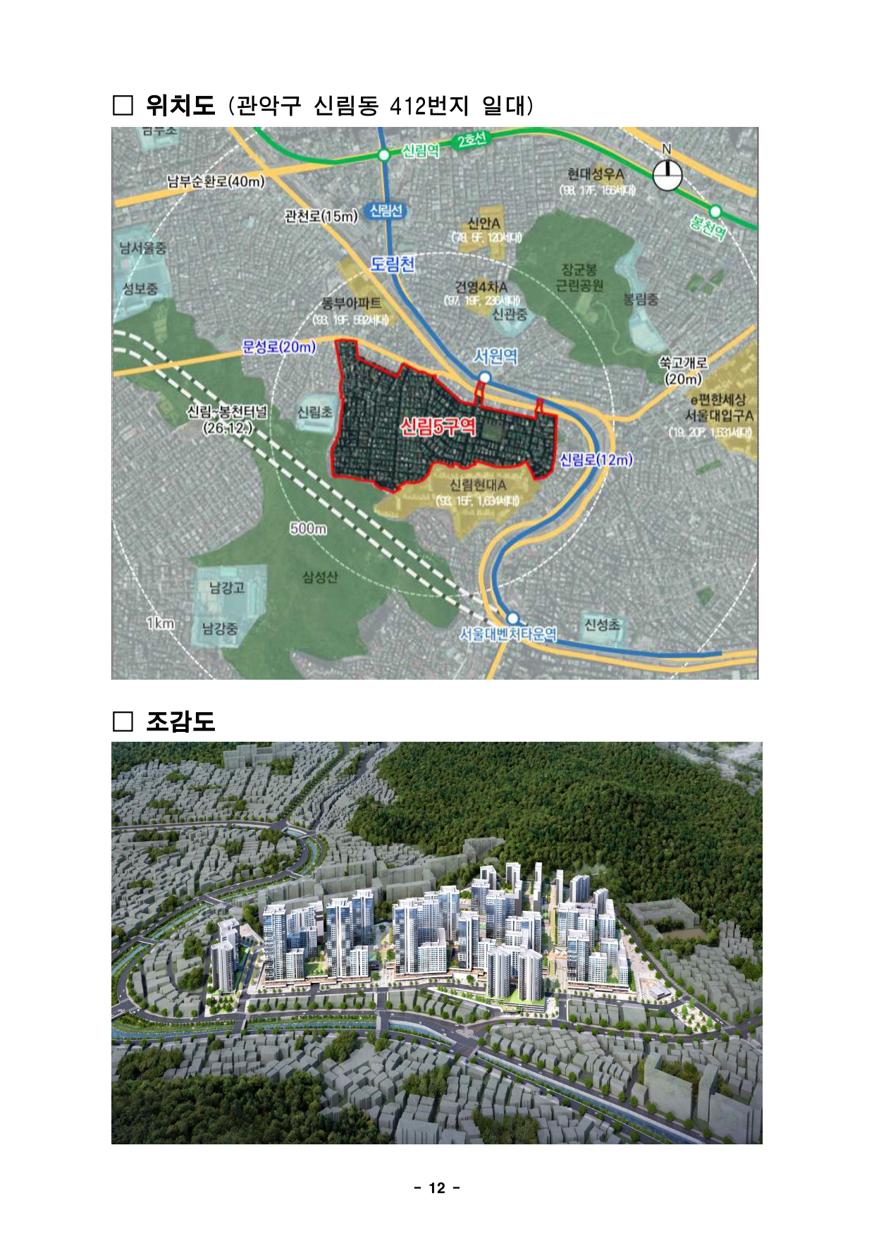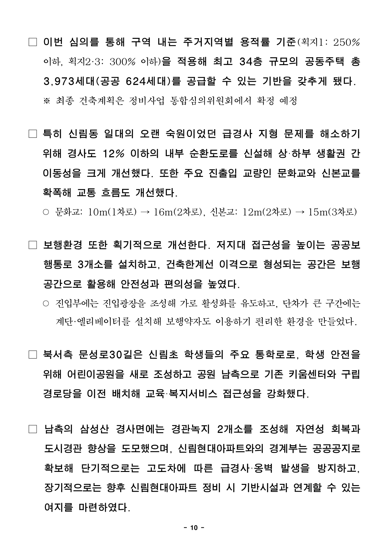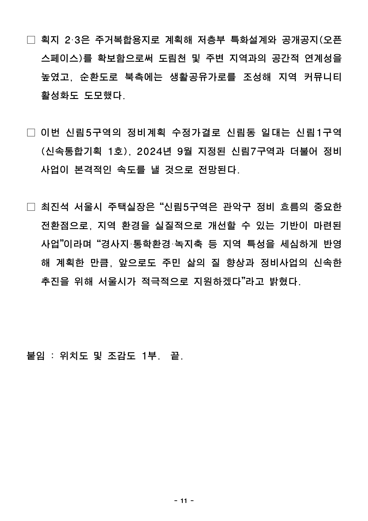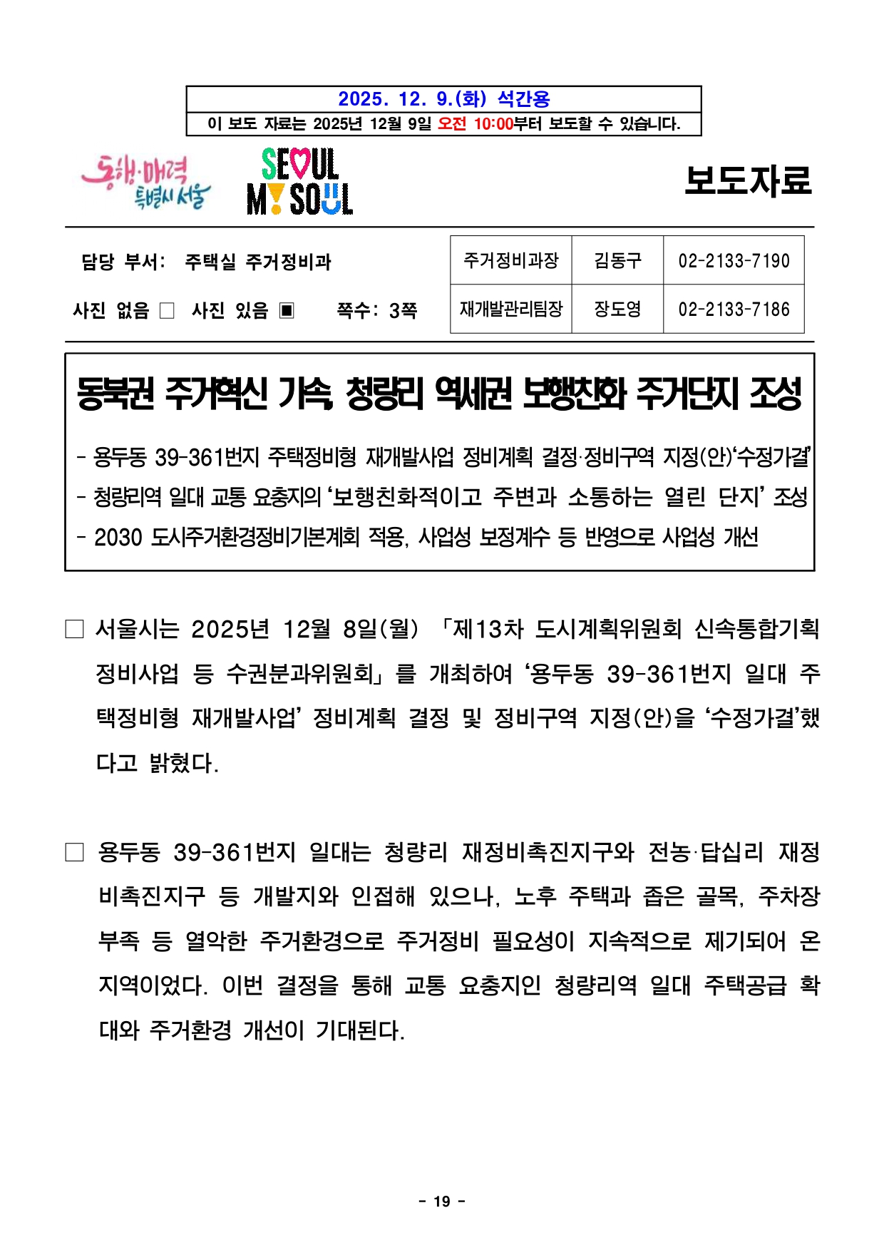 2025. 12. 9.(화) 석간용 이 보도 자료는 2025년 12월 9일 오전 10:00부터 보도할 수 있습니다. 보도 자료담당 부서: 도시공간본부 도시계획과 도시계획과장 이광구 02-2133-8305 도시계획혁신 팀장 서준원 02-2133-8326 사진 없음 ▣ 사진 있음 □ 쪽수: 2쪽 도시계획 홈페이지 (도시계획위원회) http://urban.seoul.go.kr/ 상단<알림마당> → 위원회 2025년 제13차 서울특별시 도시계획위원회 신속통합기획 정비사업 등 수권분과위원회 개최결과□ 금일 처리 안건 : 총 6건 ○ 조건부가결 : 1건 ○ 수정가결 : 5건 ※ 자문, 보류, 보고 안건은 보도자료를 제공하지 않습니다. ※ 안건에 대한 자세한 내용은 소관부서에 문의하여 주시기 바랍니다. 붙임 : 심의결과 1부 제13차 도시계획위원회 신속통합기획 정비사업 등 수권분과위원회 상정안건 【 2025.12. 8 (월) 09:00 】 ▣ 총 6건 (수정가결 6) 연번 안 건 명 개 요 심의결과 비고1 <주거정비과> 도림1구역 주택정비형 공공재개발사업 정비구역 지정 및 정비계획결정(안), 경관심의(안) ○ 위 치 : 영등포구 도림동 26-21 (106,985㎡) ○ 내 용 : 도림동 26-21번재 일대 정비구역 지정 및 정비계획 결정, 경관심의(안) 수 정 가 결 <신규상정> 조합운영개선팀팀장 : (代)김지호담당 : 강신욱(2133-7239) 2 <주거정비과> 응암동 101번지 일대 공공재개발 정비구역 지정 및 정비계획 수립(안) ○ 위 치 : 은평구 응암동 101번지 일대 (38,758㎡) ○ 내 용 : 응암동 101번지 일대 주택정비형 재개발사업 정비계획수립 및 정비구역 지정, 경관심의(안) 수 정 가 결 <신규상정> 갈등공정관리팀팀장 : 현승주담당 : 남경연(2133-9383) 3 <주거정비과> 신림5구역 주택정비형 재개발 정비계획 수립 및 정비구역 지정(안) ○ 위 치 : 관악구 신림동 412번지 일대 (169,069㎡) ○ 내 용 : 신림5구역 주택정비형 재개발구역 정비계획 결정(안), 경관심의(안) 수 정 가 결 <신규상정> 갈등공정관리팀팀장 : 현승주담당 : 최인호(2133-9384) 4 <공동주택과> 여의도 광장아파트 재건축 정비계획 결정 및 정비구역 지정(안) ○ 위 치 : 영등포구 여의도동 28번지 (44,592.9㎡) ○ 내 용 : 여의도 광장아파트(여의도동 28번지) 정비계획 결정 및 정비구역 지정 수 정 가 결 <신규상정> 재건축계획팀팀장 : 임동수담당 : 김희완(2133-7141) 5 <주거정비과> 신월5동 77일대 구역 주택정비형 공공재개발사업 정비구역 지정 및 정비계획결정(안), 경관심의(안) ○ 위 치 : 양천구 신월5동 77번지 일대 (53,820.0㎡) ○ 내 용 : 신월5동 77일대 구역 주택정비형 공공재개발구역 정비계획 결정, 경관심의(안) 조건부가결 <신규상정> 재개발관리팀팀장 : 장도영담당 : 고동우(2133-7188) 6 <주거정비과> 용두동 39-361번지 일대 주택정비형 재개발사업 정비계획 결정 및 정비구역 지정(안) ○ 위 치 : 동대문구 용두동 39-361 (23,792.93㎡) ○ 내 용 : 용두동 39-361번지 일대 정비계획 결정 및 정비구역 지정 수 정 가 결 <신규상정> 재개발관리팀팀장 : 장도영담당 : 장다은(2133-7189) - 3 - □ 서울시는 2025년 12월 8일(월) 「제13차 도시계획위원회 신속통합기획정비사업 등 수권분과위원회」를 개최하여 ‘도림동 26-21번지 일대(이하도림1구역) 주택정비형 공공재개발사업’ 정비구역 지정 및 정비계획결정(안)을 '수정가결' 했다고 밝혔다. □ 대상지 일대는 영등포역 남측 노후된 단독·다세대주택이 혼재되어있고, 보행환경이 열악한 주택지이다. 2022년 8월 2차 공공재개발후보지선정 이후 분야별 전문가들이 참여하여 마련한 사전기획을 반영하여정비계획을 수립했다. □ 「2030 도시주거환경정비기본계획」의 허용용적률 완화를 적용해분양세대 비율이 높아져 사업성을 확보했으며, 45층 이하 총 2,500세대(임대주택626세대 포함)로 계획하여 지역 차원의 활력을 이끄는 영등포역일대2025. 12. 9.(화) 석간용 이 보도자료는 2025년 12월 9일 오전 10:00부터 보도할 수 있습니다. 보도자료 담당부서 : 주택실 주거정비과 주거정비과장 김동구 2133-7190 (도림1구역 주택정비형 공공재개발) 주거정비정책팀장 김지호 2133-7205 사진없음 □ 사진있음 ▣ 쪽수 : 3쪽 도림1구역 2,500세대 영등포역 일대 새로운 대표 주거단지 조성- 영등포구 도림1구역 주택정비형 공공재개발사업 정비구역 지정·정비계획 결정(안) ‘수정가결’ - 영등포역 일대 보행 친화적 열린공간 조성, 다채로운 도시경관 및 특화디자인도입- 2030 도시주거환경정비기본계획 적용, 보정계수 등 반영으로 공공성과 사업성높여 - 4 - 대표 열린 주거단지로 탈바꿈될 전망이다. ○ 제2종(7층)에서 제3종으로 용도지역 상향된 기준용적률 190%에서허용용적률 완화 사항과 사업성 보정계수(1.61)를 적용하여 허용용적률32%, 정비계획 용적률이 250%에서 271%로 상향되어 사업성확보를위해 노력하였다. □ 도림1구역은 영등포역 일대 영등포역세권 도심공공주택복합지구와연계된개발로 도심속 조화로운 경관을 계획하여 지역의 랜드마크로도손색이없도록 단지 배치, 높이 등을 고려하여 계획하였으며, 영등포역부터이어지는 남북축 연결 강화를 위해 단지 내 공공보행통로를 계획하였고,지형 단차를 극복한 데크 조성으로 쾌적하고 지형에 순응한 보행환경이조성되도록 하였다. □ 서울시