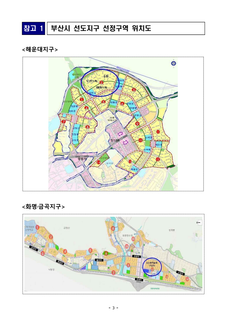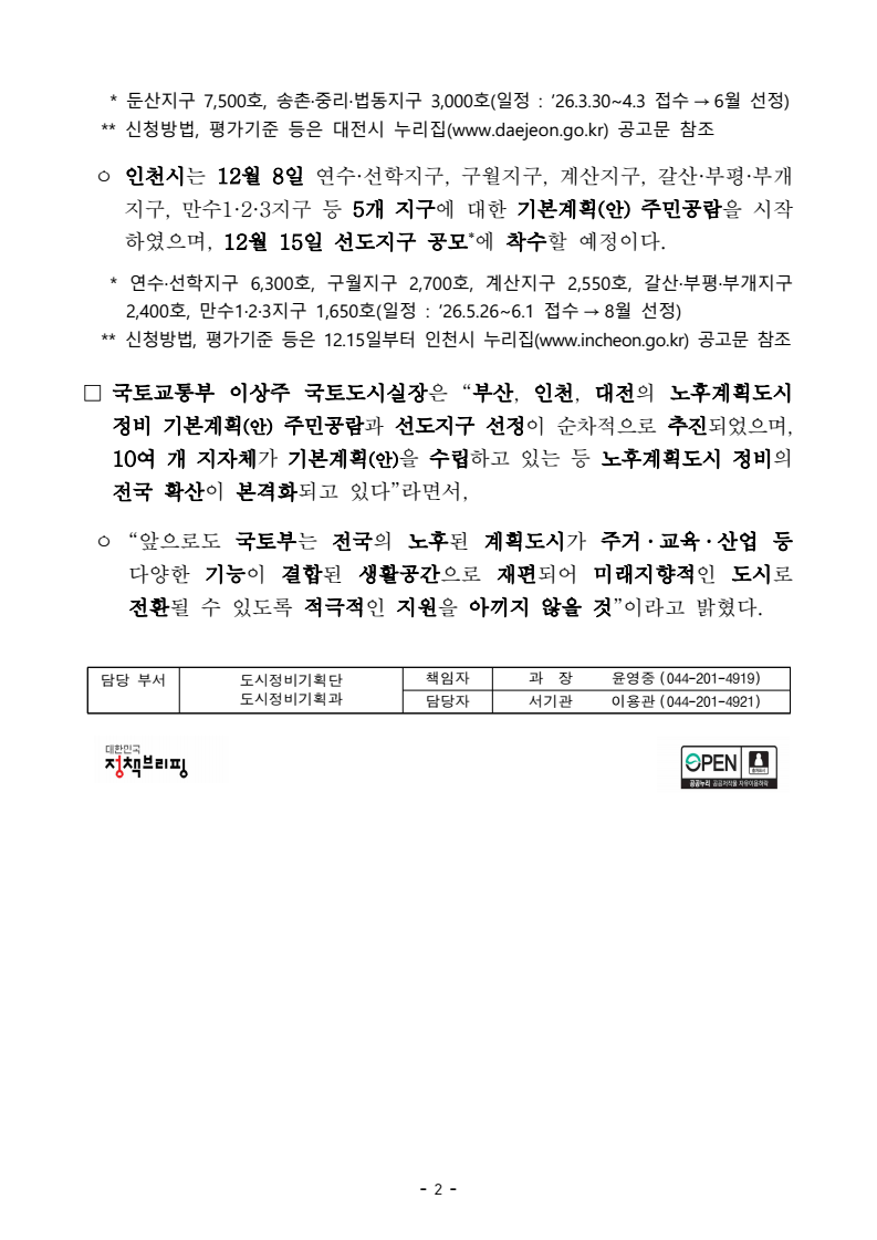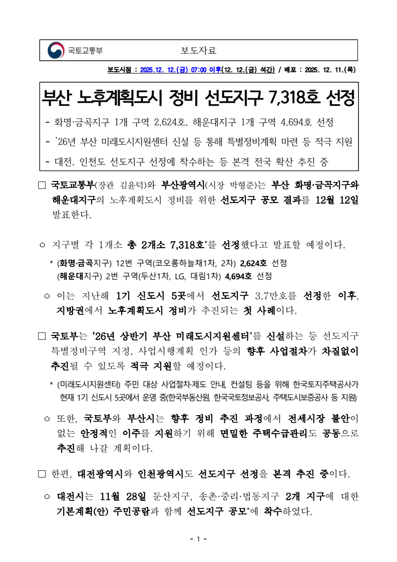 - 1 - 보도자료 보도시점 : 2025.12. 12.(금) 07:00 이후(12. 12.(금) 석간) / 배포 : 2025. 12. 11.(목) 부산 노후계획도시 정비 선도지구 7,318호 선정- 화명·금곡지구 1개 구역 2,624호, 해운대지구 1개 구역 4,694호 선정- ’26년 부산 미래도시지원센터 신설 등 통해 특별정비계획 마련 등 적극 지원- 대전, 인천도 선도지구 선정에 착수하는 등 본격 전국 확산 추진 중 □ 국토교통부(장관 김윤덕)와 부산광역시(시장 박형준)는 부산 화명·금곡지구와 해운대지구의 노후계획도시 정비를 위한 선도지구 공모 결과를 12월 12일발표한다. ㅇ 지구별 각 1개소 총 2개소 7,318호*를 선정했다고 발표할 예정이다. * (화명·금곡지구) 12번 구역(코오롱하늘채1차, 2차) 2,624호 선정 (해운대지구) 2번 구역(두산1차, LG, 대림1차) 4,694호 선정 ㅇ 이는 지난해 1기 신도시 5곳에서 선도지구 3.7만호를 선정한 이후, 지방권에서 노후계획도시 정비가 추진되는 첫 사례이다. □ 국토부는 ’26년 상반기 부산 미래도시지원센터*를 신설하는 등 선도지구특별정비구역 지정, 사업시행계획 인가 등의 향후 사업절차가 차질없이 추진될 수 있도록 적극 지원할 예정이다. * (미래도시지원센터) 주민 대상 사업절차·제도 안내, 컨설팅 등을 위해 한국토지주택공사가현재 1기 신도시 5곳에서 운영 중(한국부동산원, 한국국토정보공사, 주택도시보증공사 등 지원) ㅇ 또한, 국토부와 부산시는 향후 정비 추진 과정에서 전세시장 불안이 없는 안정적인 이주를 지원하기 위해 면밀한 주택수급관리도 공동으로추진해 나갈 계획이다. □ 한편, 대전광역시와 인천광역시도 선도지구 선정을 본격 추진 중이다. ㅇ 대전시는 11월 28일 둔산지구, 송촌·중리·법동지구 2개 지구에 대한 기본계획(안) 주민공람과 함께 선도지구 공모*에 착수하였다. - 2 - * 둔산지구 7,500호, 송촌·중리·법동지구 3,000호(일정 : ’26.3.30~4.3 접수 → 6월 선정) ** 신청방법, 평가기준 등은 대전시 누리집(www.daejeon.go.kr) 공고문 참조 ㅇ 인천시는 12월 8일 연수·선학지구, 구월지구, 계산지구, 갈산·부평·부개지구, 만수1·2·3지구 등 5개 지구에 대한 기본계획(안) 주민공람을 시작하였으며, 12월 15일 선도지구 공모*에 착수할 예정이다. * 연수·선학지구 6,300호, 구월지구 2,700호, 계산지구 2,550호, 갈산·부평·부개지구 2,400호, 만수1·2·3지구 1,650호(일정 : ’26.5.26~6.1 접수 → 8월 선정) ** 신청방법, 평가기준 등은 12.15일부터 인천시 누리집(www.incheon.go.kr) 공고문 참조□ 국토교통부 이상주 국토도시실장은 “부산, 인천, 대전의 노후계획도시 정비 기본계획(안) 주민공람과 선도지구 선정이 순차적으로 추진되었으며, 10여 개 지자체가 기본계획(안)을 수립하고 있는 등 노후계획도시 정비의전국 확산이 본격화되고 있다”라면서, ㅇ “앞으로도 국토부는 전국의 노후된 계획도시가 주거 · 교육 · 산업 등다양한 기능이 결합된 생활공간으로 재편되어 미래지향적인 도시로 전환될 수 있도록 적극적인 지원을 아끼지 않을 것”이라고 밝혔다. 담당 부서 도시정비기획단 책임자 과 장 윤영중 (044-201-4919) 도시정비기획과 담당자 서기관 이용관 (044-201-4921) - 3 - 참고 1 부산시 선도지구 선정구역 위치도 <해운대지구> <화명·금곡지구> - 4 - 참고 2 전국 노후계획도시 정비 추진 현황
