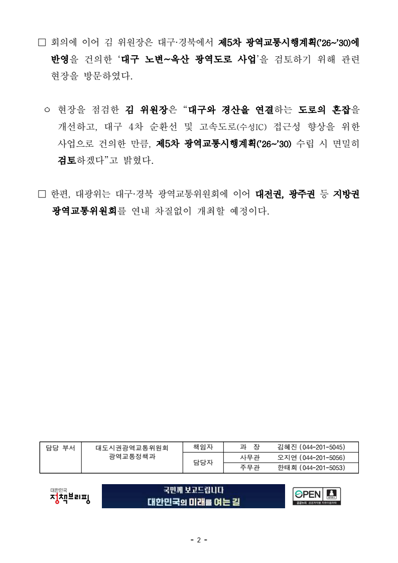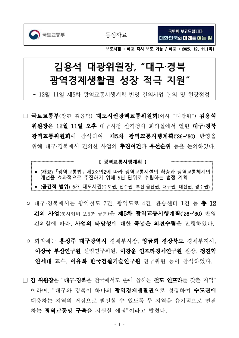 - 1 - 보도시점 : 배포 즉시 보도 가능 / 배포 : 2025. 12. 11.(목) 김용석 대광위원장, “대구·경북 광역경제생활권 성장 적극 지원” - 12월 11일 제5차 광역교통시행계획 반영 건의사업 논의 및 현장점검□ 국토교통부(장관 김윤덕) 대도시권광역교통위원회(이하 “대광위”) 김용석 위원장은 12월 11일 오후 대구시청 산격청사 회의실에서 열린 대구·경북 광역교통위원회에 참석하여, 제5차 광역교통시행계획(’26~’30) 반영을 위해 대구·경북에서 건의한 사업의 추진여건과 우선순위 등을 논의하였다. 【 광역교통시행계획 】 ▪ (개요) 「광역교통법」 제3조의2에 따라 광역교통시설의 확충과 광역교통체계의개선을 효과적으로 추진하기 위해 5년 단위로 수립하는 법정 계획 ▪ (공간적 범위) 6개 대도시권(수도권, 전주권, 부산‧울산권, 대구권, 대전권, 광주권) ㅇ 대구·경북에서는 광역철도 7건, 광역도로 4건, 환승센터 1건 등 총 12건의 사업(총사업비 2.5조 규모)을 제5차 광역교통시행계획(’26~’30) 반영 건의함에 따라, 사업의 타당성에 대한 폭넓은 의견수렴을 진행하였다. ㅇ 회의에는 홍성주 대구광역시 경제부시장, 양금희 경상북도 경제부지사, 이상국 부산연구원 선임연구위원, 이창운 인프라경제연구원 원장, 정진혁 연세대 교수, 이유화 한국건설기술연구원 연구위원 등이 참석하였다. □ 김 위원장은 “대구·경북은 전국에서도 손에 꼽히는 철도 인프라를 갖춘 지역” 이라며, “대구와 경북이 하나의 광역경제생활권으로 성장하여 수도권에 대응하는 지역의 거점으로 발전할 수 있도록 두 지역을 유기적으로 연결하는 광역교통망 구축을 지원할 예정”이라고 밝혔다. 동정자료 - 2 - □ 회의에 이어 김 위원장은 대구·경북에서 제5차 광역교통시행계획(’26~’30)에 반영을 건의한 ‘대구 노변~옥산 광역도로 사업’을 검토하기 위해 관련 현장을 방문하였다. ㅇ 현장을 점검한 김 위원장은 “대구와 경산을 연결하는 도로의 혼잡을 개선하고, 대구 4차 순환선 및 고속도로(수성IC) 접근성 향상을 위한 사업으로 건의한 만큼, 제5차 광역교통시행계획(’26~’30) 수립 시 면밀히 검토하겠다”고 밝혔다. □ 한편, 대광위는 대구·경북 광역교통위원회에 이어 대전권, 광주권 등 지방권광역교통위원회를 연내 차질없이 개최할 예정이다. 담당 부서 대도시권광역교통위원회 책임자 과 장 김혜진 (044-201-5045) 광역교통정책과 담당자 사무관 오지연 (044-201-5056) 주무관 한태희 (044-201-5053)