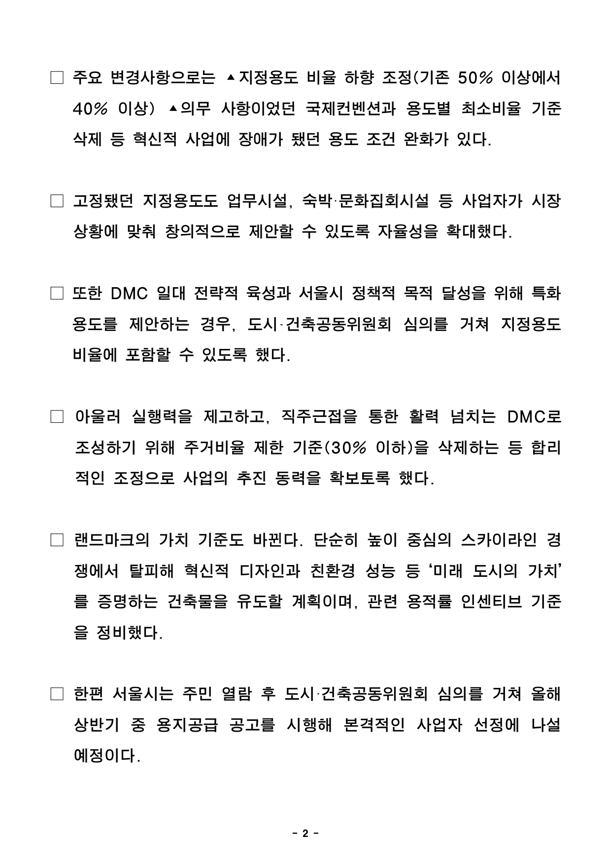 - 1 - 2026. 2. 5.(목) 석간용 이 보도자료는 2026년 2월 5일 오전 09:00부터 보도할 수 있습니다.보도자료담당 부서 : 미래공간기획관 도시활력담당관 도시활력담당관 임종현 02-2133-0400도시활력계획팀장 함주영 02-2133-0401사진 없음 ▣ 사진 있음 □ 쪽수 : 3쪽 관련 누리집 urban.seoul.go.kr DMC 랜드마크 용지, 민간의 창의성 입혀 개발동력 재점화…규제 완화 담아 열람공고- 서울시, 5일(목)부터 지구단위계획 변경(안) 열람공고…상반기 내 용지공급추진- 지정용도 비율 조정(50%→40%), 주거비율 제한 완화 등 사업성 및 실행력제고- 혁신디자인·친환경 성능 도입 시 인센티브 제공…‘직·주·락’ 공존 랜드마크로조성□ 서울시가 오랜 시간 멈춰 서 있던 ‘DMC 랜드마크 용지’ 개발의물꼬를 튼다. 시는 시장 환경에 맞춰 개발 여건을 실효성 있게재정비하고, 실제 사업 착수로 이어질 수 있도록 마련한 지구단위계획변경(안)을 2월 5일(목)부터 14일간 열람공고 한다. ○ 변경(안) 열람과 이에 대한 의견제출은 서울도시공간포털(urban.seoul. go.kr, 열람공고)에서 할 수 있다. □ 이번 변경(안)은 기존의 경직된 계획에서 벗어나 민간의 창의적인사업 모델이 투영될 수 있도록 규제 유연화에 방점을 뒀다. AI‧데이터기반의 미래산업과 미디어‧엔터테인먼트(M&E)가 결합한DMC대표 공간으로의 조성을 위해 민간 제안의 자율성을 극대화한것이특징이다. - 2 - □ 주요 변경사항으로는 ▴지정용도 비율 하향 조정(기존 50% 이상에서40% 이상) ▴의무 사항이었던 국제컨벤션과 용도별 최소비율기준삭제 등 혁신적 사업에 장애가 됐던 용도 조건 완화가 있다. □ 고정됐던 지정용도도 업무시설, 숙박·문화집회시설 등 사업자가시장상황에 맞춰 창의적으로 제안할 수 있도록 자율성을 확대했다. □ 또한 DMC 일대 전략적 육성과 서울시 정책적 목적 달성을 위해특화용도를 제안하는 경우, 도시‧건축공동위원회 심의를 거쳐 지정용도비율에 포함할 수 있도록 했다. □ 아울러 실행력을 제고하고, 직주근접을 통한 활력 넘치는 DMC로조성하기 위해 주거비율 제한 기준(30% 이하)을 삭제하는등합리적인 조정으로 사업의 추진 동력을 확보토록 했다. □ 랜드마크의 가치 기준도 바뀐다. 단순히 높이 중심의 스카이라인경쟁에서 탈피해 혁신적 디자인과 친환경 성능 등 ‘미래 도시의가치’ 를 증명하는 건축물을 유도할 계획이며, 관련 용적률 인센티브기준을 정비했다. □ 한편 서울시는 주민 열람 후 도시·건축공동위원회 심의를 거쳐올해상반기 중 용지공급 공고를 시행해 본격적인 사업자 선정에나설예정이다. - 3 - □ 김용학 미래공간기획관은 “이번 계획 변경은 상암 일대의 미래성장동력을 확보하고, 정체된 개발에 활력을 불어넣기 위한 초석”이라며, “DMC가 일과 삶, 즐길거리가 공존하는 직‧주‧락(職住樂)매력도시의 핵심 거점으로 재도약할 수 있도록 행정적 지원을 아끼지않겠다” 라고 말했다.