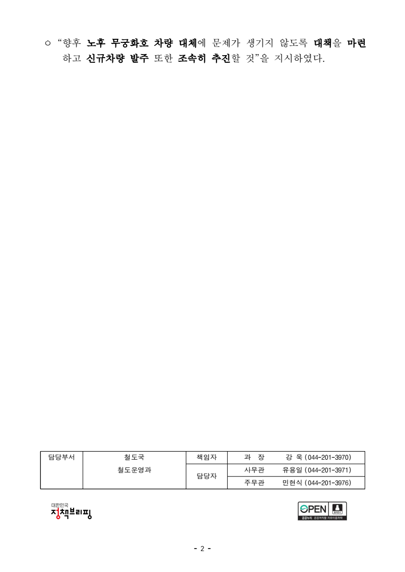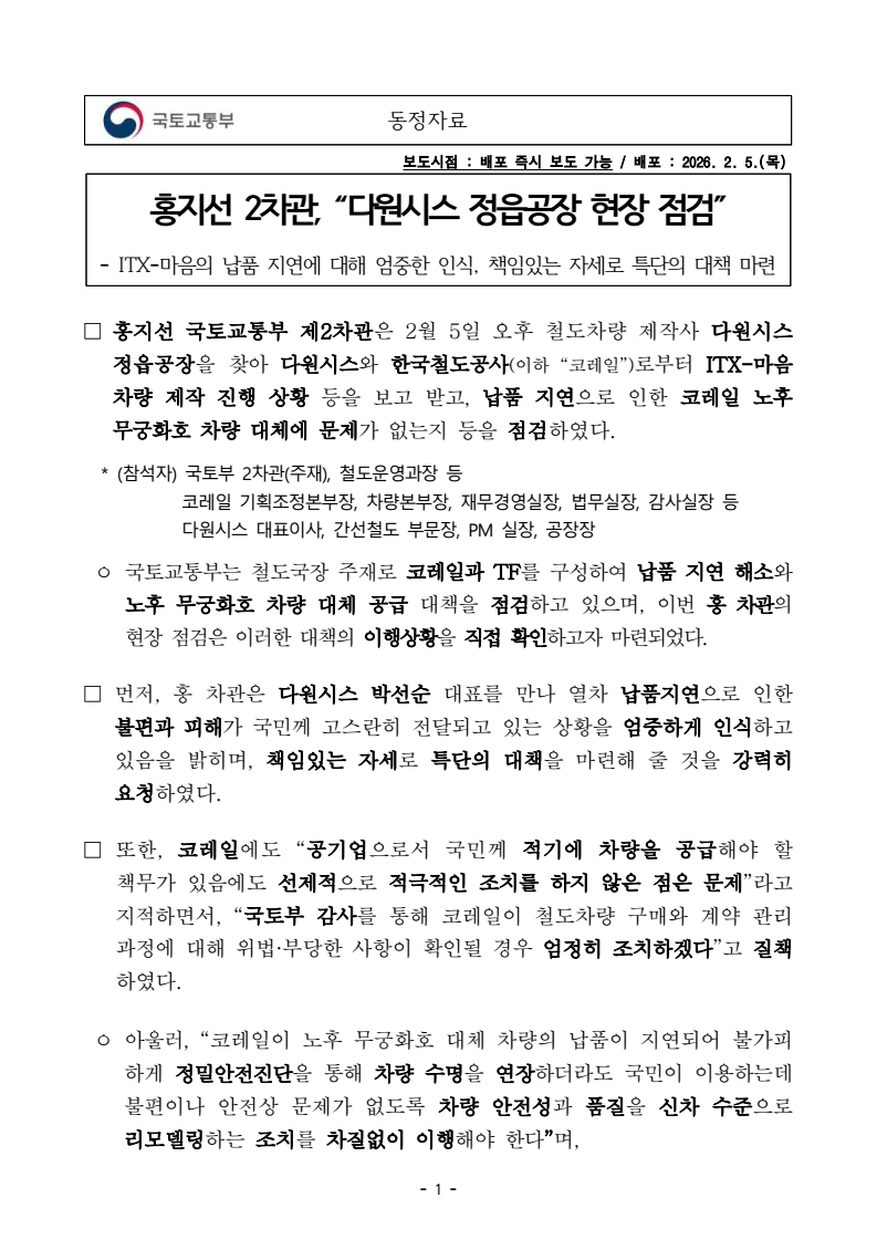 - 1 - 동정자료 보도시점 : 배포 즉시 보도 가능 / 배포 : 2026. 2. 5.(목) 홍지선 2차관, “다원시스 정읍공장 현장 점검” - ITX-마음의 납품 지연에 대해 엄중한 인식, 책임있는 자세로 특단의 대책 마련□ 홍지선 국토교통부 제2차관은 2월 5일 오후 철도차량 제작사 다원시스 정읍공장을 찾아 다원시스와 한국철도공사(이하 “코레일”)로부터 ITX-마음 차량 제작 진행 상황 등을 보고 받고, 납품 지연으로 인한 코레일 노후 무궁화호 차량 대체에 문제가 없는지 등을 점검하였다. * (참석자) 국토부 2차관(주재), 철도운영과장 등 코레일 기획조정본부장, 차량본부장, 재무경영실장, 법무실장, 감사실장 등 다원시스 대표이사, 간선철도 부문장, PM 실장, 공장장 ㅇ 국토교통부는 철도국장 주재로 코레일과 TF를 구성하여 납품 지연 해소와 노후 무궁화호 차량 대체 공급 대책을 점검하고 있으며, 이번 홍 차관의 현장 점검은 이러한 대책의 이행상황을 직접 확인하고자 마련되었다. □ 먼저, 홍 차관은 다원시스 박선순 대표를 만나 열차 납품지연으로 인한불편과 피해가 국민께 고스란히 전달되고 있는 상황을 엄중하게 인식하고있음을 밝히며, 책임있는 자세로 특단의 대책을 마련해 줄 것을 강력히 요청하였다. □ 또한, 코레일에도 “공기업으로서 국민께 적기에 차량을 공급해야 할 책무가 있음에도 선제적으로 적극적인 조치를 하지 않은 점은 문제”라고 지적하면서, “국토부 감사를 통해 코레일이 철도차량 구매와 계약 관리 과정에 대해 위법·부당한 사항이 확인될 경우 엄정히 조치하겠다”고 질책하였다. ㅇ 아울러, “코레일이 노후 무궁화호 대체 차량의 납품이 지연되어 불가피하게 정밀안전진단을 통해 차량 수명을 연장하더라도 국민이 이용하는데불편이나 안전상 문제가 없도록 차량 안전성과 품질을 신차 수준으로 리모델링하는 조치를 차질없이 이행해야 한다”며, - 2 - ㅇ “향후 노후 무궁화호 차량 대체에 문제가 생기지 않도록 대책을마련하고 신규차량 발주 또한 조속히 추진할 것”을 지시하였다. 담당부서 철도국 책임자 과 장 강 욱 (044-201-3970) 철도운영과 담당자 사무관 유용일 (044-201-3971) 주무관 민현식 (044-201-3976)