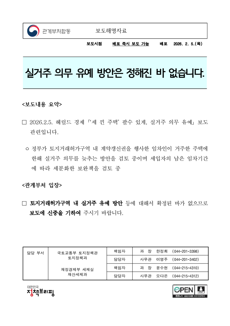 보도해명자료 보도시점 배포 즉시 보도 가능 배포 2026. 2. 5.(목) 실거주 의무 유예 방안은 정해진 바 없습니다. <보도내용 요약> □ 2026.2.5. 헤럴드 경제 「‘세 낀 주택’ 팔수 있게, 실거주 의무 유예」 보도관련입니다. ㅇ 정부가 토지거래허가구역 내 계약갱신권을 행사한 임차인이 거주한 주택에 한해 실거주 의무를 늦추는 방안을 검토 중이며 세입자의 남은 임차기간에 따라 세분화한 보완책을 검토 중 <관계부처 입장> □ 토지거래허가구역 내 실거주 유예 방안 등에 대해서 확정된 바가 없으므로보도에 신중을 기하여 주시기 바랍니다. 담당 부서 국토교통부 토지정책관 책임자 과 장 한정희 (044-201-3398) 토지정책과 담당자 사무관 이영주 (044-201-3402) 재정경제부 세제실 책임자 과 장 윤수현 (044-215-4310) 재산세제과 담당자 사무관 오다은 (044-215-4312)