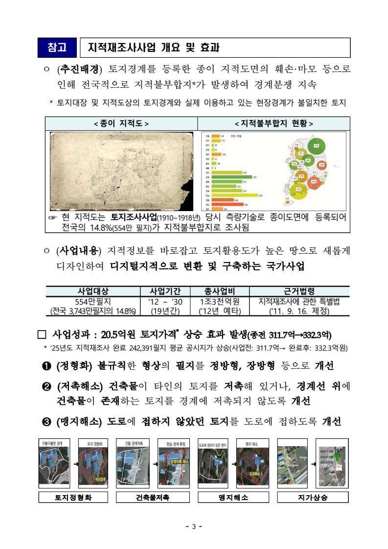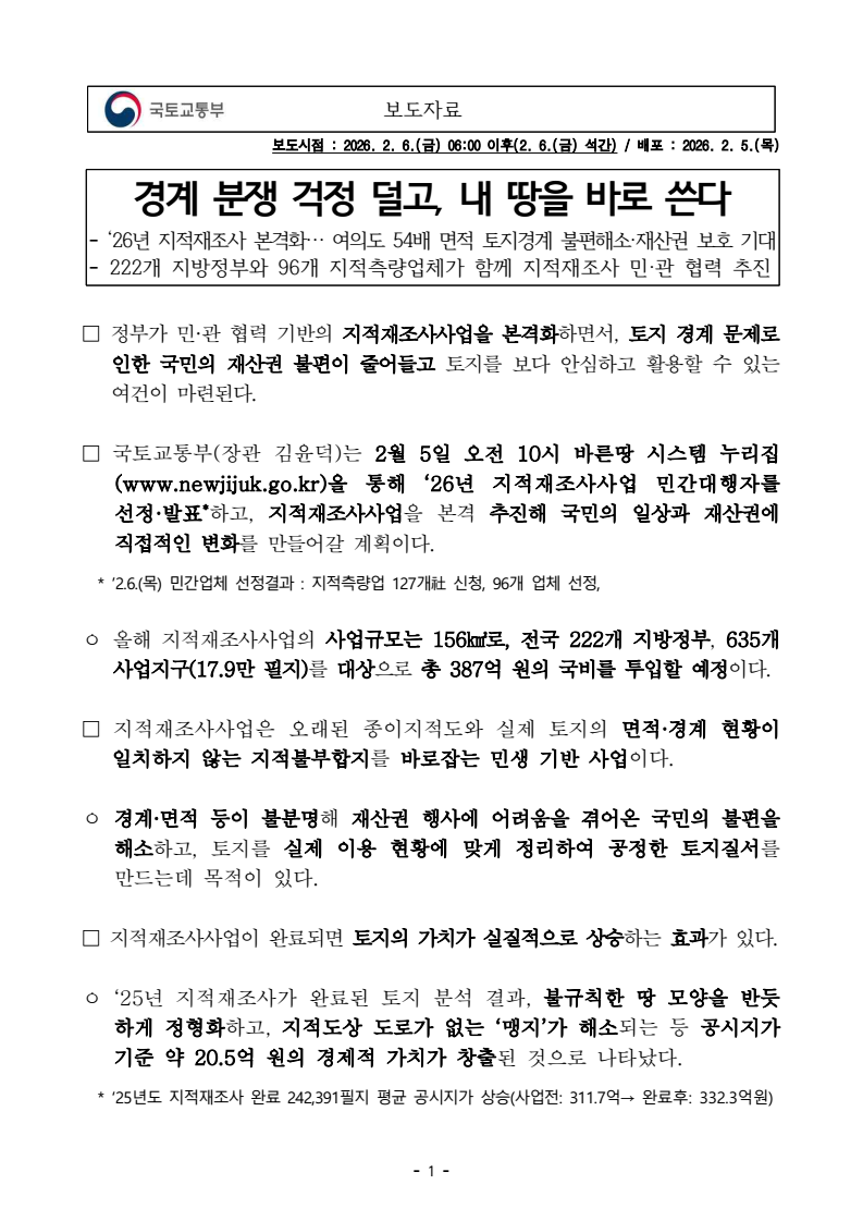 - 1 - 보도자료 보도시점 : 2026. 2. 6.(금) 06:00 이후(2. 6.(금) 석간) / 배포 : 2026. 2. 5.(목) 경계 분쟁 걱정 덜고, 내 땅을 바로 쓴다- ‘26년 지적재조사 본격화… 여의도 54배 면적 토지경계 불편해소·재산권 보호 기대- 222개 지방정부와 96개 지적측량업체가 함께 지적재조사 민·관 협력 추진□ 정부가 민·관 협력 기반의 지적재조사사업을 본격화하면서, 토지 경계 문제로 인한 국민의 재산권 불편이 줄어들고 토지를 보다 안심하고 활용할 수 있는 여건이 마련된다. □ 국토교통부(장관 김윤덕)는 2월 5일 오전 10시 바른땅 시스템 누리집(www.newjijuk.go.kr)을 통해 ‘26년 지적재조사사업 민간대행자를 선정·발표*하고, 지적재조사사업을 본격 추진해 국민의 일상과 재산권에 직접적인 변화를 만들어갈 계획이다. * ’2.6.(목) 민간업체 선정결과 : 지적측량업 127개社 신청, 96개 업체 선정, ㅇ 올해 지적재조사사업의 사업규모는 156㎢로, 전국 222개 지방정부, 635개 사업지구(17.9만 필지)를 대상으로 총 387억 원의 국비를 투입할 예정이다. □ 지적재조사사업은 오래된 종이지적도와 실제 토지의 면적·경계 현황이 일치하지 않는 지적불부합지를 바로잡는 민생 기반 사업이다. ㅇ 경계·면적 등이 불분명해 재산권 행사에 어려움을 겪어온 국민의 불편을 해소하고, 토지를 실제 이용 현황에 맞게 정리하여 공정한 토지질서를 만드는데 목적이 있다. □ 지적재조사사업이 완료되면 토지의 가치가 실질적으로 상승하는 효과가 있다. ㅇ ‘25년 지적재조사가 완료된 토지 분석 결과, 불규칙한 땅 모양을 반듯하게 정형화하고, 지적도상 도로가 없는 ‘맹지’가 해소되는 등 공시지가 기준 약 20.5억 원의 경제적 가치가 창출된 것으로 나타났다. * ‘25년도 지적재조사 완료 242,391필지 평균 공시지가 상승(사업전: 311.7억→ 완료후: 332.3억원) - 2 - □ 한편, 정부는 사업의 안정적인 추진과 품질 제고를 위해 민간업체와 책임수행기관인 한국국토정보공사의 역할을 분담하는 민‧관협력 체계를 지속적으로 강화하고 있다. ㅇ 선정된 민간업체는 기술력과 현장 경험을 적극 활용하여 사업 속도와 품질을 높이고, 책임수행기관은 경계 조정 등 핵심 공정을 수행함으로써공정성과 신뢰를 함께 확보할 계획이다. □ 국토교통부 김태형 공간정보제도과장은 “지적재조사사업은 국민의 재산권을 보호하고 지역의 잠재 가치를 높이는 핵심 정책”이라며, “앞으로도 현장의 목소리를 정책에 반영하고, 국민이 체감할 수 있는 지적재조사를 지속적으로 추진하겠다”고 밝혔다. 담당부서 국토교통부 공간정보제도과 책임자 과 장 김태형 (044-201-3478) 담당자 사무관 손기열 (044-201-4657) 담당자 주무관 송재홍 (044-201-4659) 담당부서 한국국토정보공사 (지적재조사처) 책임자 처 장 채국헌 (063-713-1440) 담당자 팀 장 김경원 (063-713-1445) 담당자 과 장 가명석 (063-713-1447) - 3 - 참고 지적재조사사업 개요 및 효과 ㅇ (추진배경) 토지경계를 등록한 종이 지적도면의 훼손·마모 등으로 인해 전국적으로 지적불부합지*가 발생하여 경계분쟁 지속* 토지대장 및 지적도상의 토지경계와 실제 이용하고 있는 현장경계가 불일치한 토지<종이 지적도> <지적불부합지 현황> ☞ 현 지적도는 토지조사사업(1910∼1918년) 당시 측량기술로 종이도면에 등록되어전국의 14.8%(554만 필지)가 지적불부합지로 조사됨 ㅇ (사업내용) 지적정보를 바로잡고 토지활용도가 높은 땅으로 새롭게디자인하여 디지털지적으로 변환 및 구축하는 국가사업 사업대상 사업기간 총사업비 근거법령 554만필지 (전국 3,743만필지의 14.8%) ’12 ∼ ’30 (19년간) 1조3천억원 (’12년 예타) 지적재조사에 관한 특별법(’11. 9. 16. 제정) □ 사업성과 : 20.5억원 토지가격* 상승 효과 발생(종전 311.7억→332.3억) * ‘25년도 지적재조사 완료 242,391필지 평균 공시지가 상승(사업전: 311.7억→ 완료후: 332.3억원) ➊ (정형화) 불규칙한 형상의 필지를 정방형, 장방형 등으로 개선➋ (저촉해소) 건축물이 타인의 토지를 저촉해 있거나, 경계선 위에 건축물이 존재하는 토지를 경계에 저촉되지 않도록 개선 ➌ (맹지해소) 도로에 접하지 않았던 토지를 도로에 접하도록 개선➜ ➜ ➜ ➜ 토지정형화 건축물저촉 맹지해소 지가상승