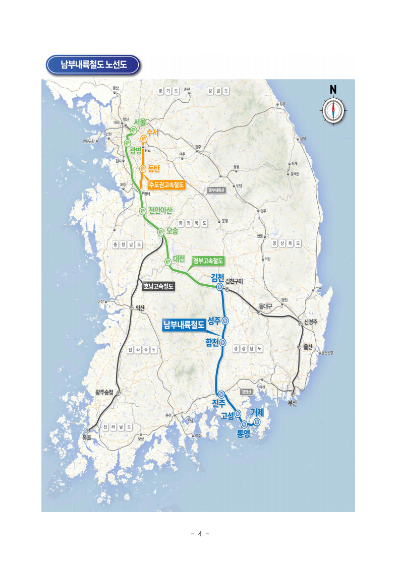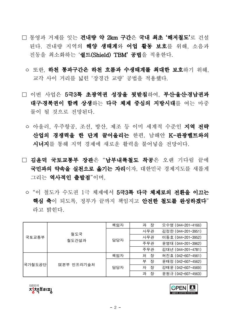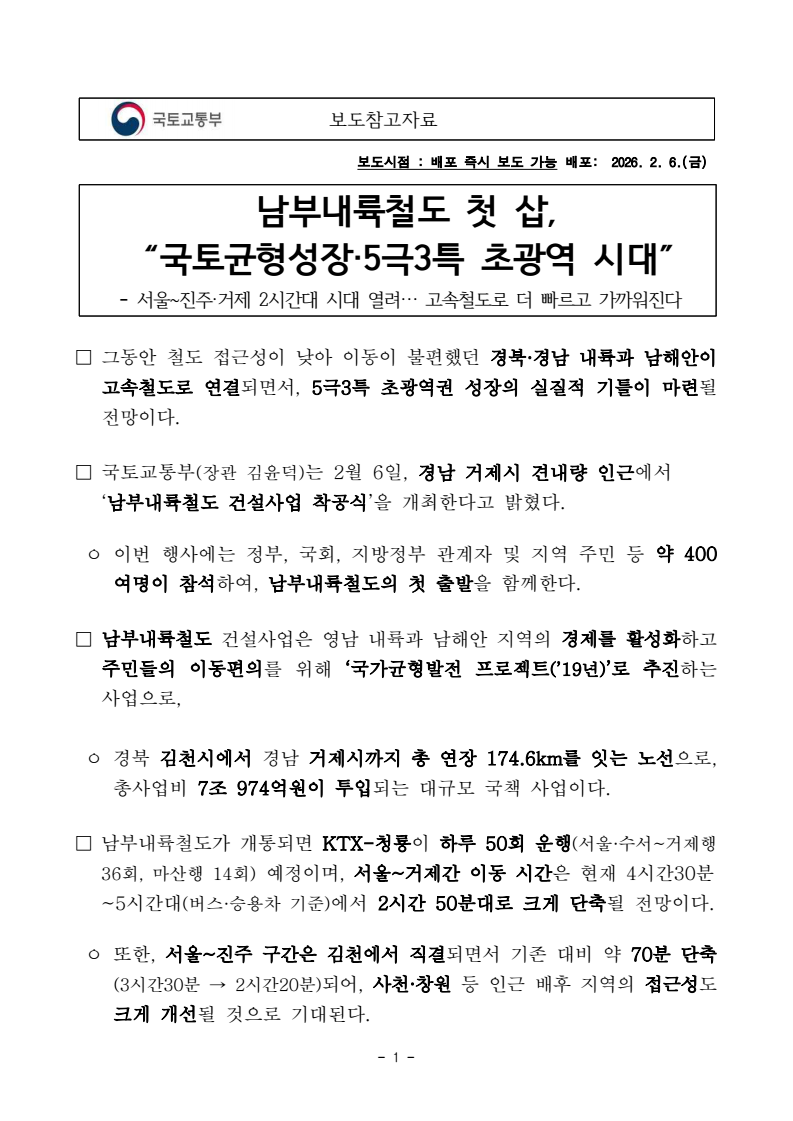 - 1 - □ 그동안 철도 접근성이 낮아 이동이 불편했던 경북·경남 내륙과 남해안이 고속철도로 연결되면서, 5극3특 초광역권 성장의 실질적 기틀이 마련될 전망이다. □ 국토교통부(장관 김윤덕)는 2월 6일, 경남 거제시 견내량 인근에서‘남부내륙철도 건설사업 착공식’을 개최한다고 밝혔다. ㅇ 이번 행사에는 정부, 국회, 지방정부 관계자 및 지역 주민 등 약 400여명이 참석하여, 남부내륙철도의 첫 출발을 함께한다. □ 남부내륙철도 건설사업은 영남 내륙과 남해안 지역의 경제를 활성화하고주민들의 이동편의를 위해 ‘국가균형발전 프로젝트(’19년)’로 추진하는 사업으로, ㅇ 경북 김천시에서 경남 거제시까지 총 연장 174.6km를 잇는 노선으로, 총사업비 7조 974억원이 투입되는 대규모 국책 사업이다. □ 남부내륙철도가 개통되면 KTX-청룡이 하루 50회 운행(서울·수서~거제행 36회, 마산행 14회) 예정이며, 서울~거제간 이동 시간은 현재 4시간30분~5시간대(버스·승용차 기준)에서 2시간 50분대로 크게 단축될 전망이다. ㅇ 또한, 서울~진주 구간은 김천에서 직결되면서 기존 대비 약 70분 단축(3시간30분 → 2시간20분)되어, 사천·창원 등 인근 배후 지역의 접근성도크게 개선될 것으로 기대된다. 남부내륙철도 첫 삽, “국토균형성장·5극3특 초광역 시대” - 서울~진주·거제 2시간대 시대 열려… 고속철도로 더 빠르고 가까워진다보도참고자료 보도시점 : 배포 즉시 보도 가능 배포: 2026. 2. 6.(금) - 2 - □ 통영과 거제를 잇는 견내량 약 2km 구간은 국내 최초 ‘해저철도’로 건설된다. 견내량 지역의 해양 생태계와 어업 활동 보호를 위해, 소음과 진동을 최소화하는 ‘쉴드(Shield) TBM’ 공법을 적용한다. ㅇ 또한, 하천 통과구간은 하천 흐름과 수생태계를 최대한 보호하기 위해, 교각 사이 거리를 넓힌 ‘장경간 교량’ 공법을 적용했다. □ 이번 사업은 5극3특 초광역권 성장을 뒷받침하여, 부산‧울산‧경남권과 대구‧경북권이 함께 상생하는 다극 체제 중심의 지방시대를 여는 마중물이 될 것으로 전망된다. ㅇ 아울러, 우주항공, 조선, 방산, 제조 등 이미 세계적 수준인 지역 전략산업의 경쟁력을 한 단계 끌어올리는 한편, 남해안 K-관광벨트와의 시너지를 통해 지역 경제에 새로운 활력을 불어넣을 전망이다. □ 김윤덕 국토교통부 장관은 “남부내륙철도 착공은 오랜 기다림 끝에 국민과의 약속을 실천으로 옮기는 자리이자, 대한민국 경제지도를 새롭게그리는 역사적인 출발점”이며, ㅇ “이 철도가 수도권 1극 체제에서 5극3특 다극 체제로의 전환을 이끄는 핵심 축이 되도록, 정부가 끝까지 책임지고 안전한 철도를 완성하겠다” 라고 밝힌다. 국토교통부 철도국 철도건설과 책임자 과 장 오수영 (044-201-4166) 담당자 사무관 김정한 (044-201-3951) 사무관 이동호 (044-201-3952) 주무관 윤영대 (044-201-3962) 주무관 김대년 (044-201-4781) 국가철도공단 SE본부 인프라기술처 책임자 처 장 허진효 (042-607-4561) 담당자 부 장 윤태정 (042-607-4562) 차 장 강태윤 (042-607-4569) 과 장 윤원규 (042-607-4563) - 3 - 참 고 남부내륙철도 사업개요 □ 사업개요 (V=250km/h) ㅇ 사업구간 : 김천∼거제(174.6km) 단선전철 ㅇ 총사업비 / 기간 : 7조 974억원 / ’20년∼’31년 ㅇ 열차운행계획 : KTX-청룡 50회/일(서울↔거제 36, 서울↔마산 14) □ 주요 추진경위 ㅇ '19. 1. : 국가균형발전 프로젝트 예타면제 대상사업 선정 ㅇ '22. 1. : 기본계획 고시 ㅇ '22. 2. : 대형공사 입찰방법 심의 ㅇ '22. 6. ⁓ 11. : 노반 기본 및 실시설계 순차 착수 ㅇ '23. 9. ~ ’24. 7. : 사업계획 적정성 재검토 (KDI) ㅇ ‘25.12. : 실시계획 승인 □ 향후 계획 ㅇ ’26.1월부터 연말까지 총 14개 공구에 대해 착공 예정 - 4 -