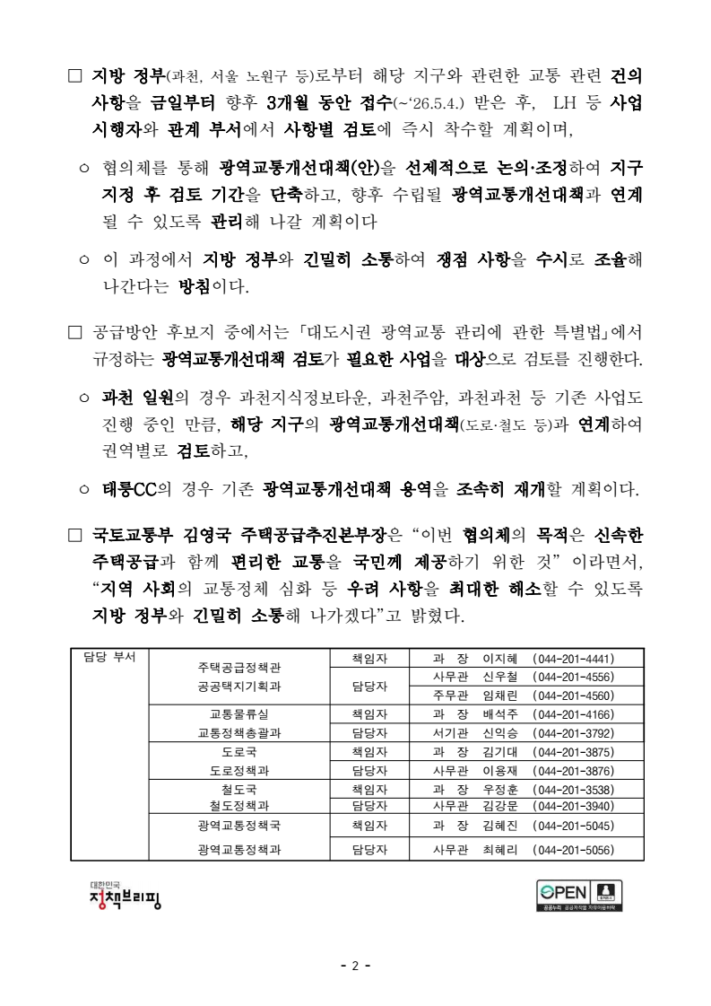 보도참고자료 - 1 - 보도시점 : 배포 즉시 보도 가능 / 배포 : 2026. 2. 5.(목) <도심 주택공급 확대 및 신속화 방안(1.29) 후속조치>주택 신속 공급 위해 선제적 교통개선대책 마련- 국토부 내 교통 유관부서와 함께 「교통개선 협의체」 구성 - 지방정부(과천, 서울 노원등) 의견을 수렴하여 광역교통개선대책 조속 수립 지원□ 국토교통부(장관 김윤덕)는 「도심 주택공급 확대 및 신속화 방안(1.29.)(이하“공급방안”)」의 후속 조치로, 사업 대상지별 교통 영향을 선제적으로 검토하고 신속한 교통개선대책 수립을 지원하기 위한 「주택 신속 공급을 위한 교통개선 협의체(이하 “협의체”)」를 구성·운영한다고 밝혔다. ㅇ 이번 협의체는 공급방안 발표 이후 지방 정부에서 제기하고 있는 교통혼잡 우려, 교통시설 확충 요구 등에 대해 관계 부서가 함께 교통개선대책을 선제적으로 검토, 사업 추진 과정에서의 지연 요인을최소화하기 위해 구성되었다. □ 협의체는 주택공급추진본부 주택공급정책관을 팀장으로 교통정책총괄과장, 도로정책과장, 철도정책과장, 광역교통정책과장으로 구성되며, 주택공급 대상지와 관련하여 도로·철도·대중교통 등 교통 전반에 관련한 개선방안을종합적으로 검토할 계획이다. < 주택 신속 공급을 위한 교통개선 협의체 구성 > 교통개선 협의체(팀장 : 주택본부 주택공급정책관) 간사 (공공택지기획과장) (공공택지관리과장) 사업시행자 교통정책총괄과장 도로정책과장 철도정책과장 광역교통정책과장 - 2 - □ 지방 정부(과천, 서울 노원구 등)로부터 해당 지구와 관련한 교통 관련 건의 사항을 금일부터 향후 3개월 동안 접수(~‘26.5.4.) 받은 후, LH 등 사업시행자와 관계 부서에서 사항별 검토에 즉시 착수할 계획이며, ㅇ 협의체를 통해 광역교통개선대책(안)을 선제적으로 논의·조정하여 지구 지정 후 검토 기간을 단축하고, 향후 수립될 광역교통개선대책과 연계될 수 있도록 관리해 나갈 계획이다 ㅇ 이 과정에서 지방 정부와 긴밀히 소통하여 쟁점 사항을 수시로 조율해나간다는 방침이다. □ 공급방안 후보지 중에서는 「대도시권 광역교통 관리에 관한 특별법」에서 규정하는 광역교통개선대책 검토가 필요한 사업을 대상으로 검토를 진행한다. ㅇ 과천 일원의 경우 과천지식정보타운, 과천주암, 과천과천 등 기존 사업도진행 중인 만큼, 해당 지구의 광역교통개선대책(도로·철도 등)과 연계하여권역별로 검토하고, ㅇ 태릉CC의 경우 기존 광역교통개선대책 용역을 조속히 재개할 계획이다. □ 국토교통부 김영국 주택공급추진본부장은 “이번 협의체의 목적은 신속한 주택공급과 함께 편리한 교통을 국민께 제공하기 위한 것” 이라면서, “지역 사회의 교통정체 심화 등 우려 사항을 최대한 해소할 수 있도록 지방 정부와 긴밀히 소통해 나가겠다”고 밝혔다. 담당 부서 주택공급정책관 공공택지기획과 책임자 과 장 이지혜 (044-201-4441) 담당자 사무관 신우철 (044-201-4556) 주무관 임채린 (044-201-4560) 교통물류실 책임자 과 장 배석주 (044-201-4166) 교통정책총괄과 담당자 서기관 신익승 (044-201-3792) 도로국 책임자 과 장 김기대 (044-201-3875) 도로정책과 담당자 사무관 이용재 (044-201-3876) 철도국 책임자 과 장 우정훈 (044-201-3538) 철도정책과 담당자 사무관 김강문 (044-201-3940) 광역교통정책국 책임자 과 장 김혜진 (044-201-5045) 광역교통정책과 담당자 사무관 최혜리 (044-201-5056)