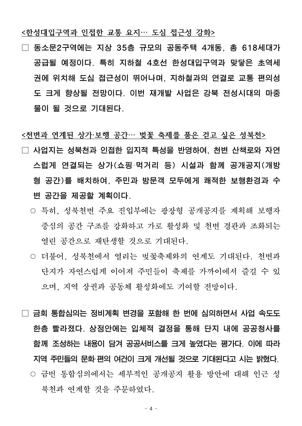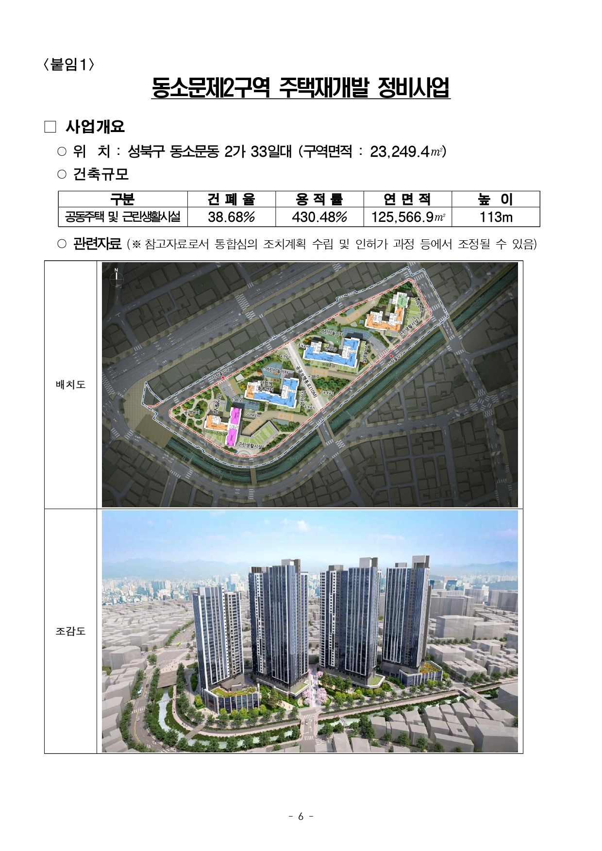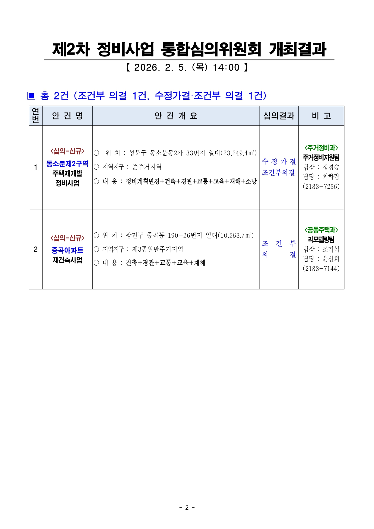 - 1 - 2026. 2. 6.(금) 석간용 이 보도자료는 2026년 2월 6일 오전 10:00부터 보도할 수 있습니다. 보도자료담당 부서: 주택실 주거정비과 주거정비과장 김동구 02-2133-7190통합심의팀장 박성운 02-2133-7204사진없음 ■ 사진있음 □ 쪽수 : 2쪽 2026년 제2차 서울시 정비사업 통합심의위원회 개최결과□ 금일 처리 안건 : 총 2건 ○ 조건부 의결 : 1건 ○ 수정가결·조건부 의결 : 1건 ※ 자문, 보류, 보고 안건은 보도자료를 제공하지 않습니다. ※ 안건에 대한 자세한 내용은 소관부서에 문의하여 주시기 바랍니다. 붙임 심의결과 1부. - 2 - 제2차 정비사업 통합심의위원회 개최결과【 2026. 2. 5. (목) 14:00 】 ▣ 총 2건 (조건부 의결 1건, 수정가결·조건부 의결 1건) 연 번 안 건 명 안 건 개 요 심의결과 비고1 <심의-신규> 동소문제2구역 주택재개발 정비사업 ○ 위 치 : 성북구 동소문동2가 33번지 일대(23,249.4㎡) ○ 지역지구 : 준주거지역 ○ 내 용 : 정비계획변경+건축+경관+교통+교육+재해+소방 수 정 가 결 조건부의결 <주거정비과> 주거정비지원팀팀장 : 정경승담당 : 최하람(2133-7236) 2 <심의-신규> 중곡아파트 재건축사업 ○ 위 치 : 광진구 중곡동 190-26번지 일대(10,263.7㎡) ○ 지역지구 : 제3종일반주거지역 ○ 내 용 : 건축+경관+교통+교육+재해 조 건 부 의 결 <공동주택과> 리모델링팀팀장 : 조기석담당 : 윤선희(2133-7144) - 3 - 2026. 2. 6.(금) 석간용 이 보도자료는 2026년 2월 6일 오전 10:00부터 보도할 수 있습니다.보도자료담당부서 : 주택실 주거정비과 주거정비과장 김동구 02-2133-7190 주거정비지원팀장 정경승 02-2133-7198 사진없음 □ 사진있음 ■ 쪽수 : 4쪽 동소문2구역, 20년 만에 재개발 본격화…초역세권에 618세대 공급- ’26년 제2차 서울특별시 정비사업 통합심의위원회 개최 결과 ‘수정가결‧조건부의결’ - 성북천변, 공개공지 배치…벚꽃 축제와 어우러진 걷고 싶은 수변감성 공간조성- 신속통합기획 시즌2 적용하여 철저하게 공정관리, 올해 사업시행인가, ’30년 착공목표□ 서울시는 2026년 제2차 서울특별시 정비사업 통합심의위원회를개최하고‘성북구 동소문2구역 주택재개발 정비사업’을 심의한 결과, 정비계획· 건축·경관·교통·소방 등 7개 분야에 대해 ‘수정가결‧조건부의결’ 하였다.□ 동소문제2구역은 주민 동의 부족 등 갈등으로 2002년 재개발구역지정 이후 20년 넘게 사업이 지연되었으며, 2008년 조합설립이후에도사업성 부족 사유로 사업 추진이 어려워 장기간 정체가 이어졌다. ○ 이 지역은 건축물의 81%가 노후건축물로, 10가구 중 8가구가낡은주택에 거주하고 있다. 또한, 필지의 67.9%가 90㎡ 미만의과소필지이며, 도로 접도율은 24.19%, 호수밀도는 92.4호/ha로주택밀집도가 높아 채광, 환기, 안전 등 주거환경이 전반적으로취약해정비가 시급하다. - 4 - <한성대입구역과 인접한 교통 요지… 도심 접근성 강화> □ 동소문2구역에는 지상 35층 규모의 공동주택 4개동, 총 618세대가공급될 예정이다. 특히 지하철 4호선 한성대입구역과 맞닿은초역세권에 위치해 도심 접근성이 뛰어나며, 지하철과의 연결로 교통편의성도 크게 향상될 전망이다. 이번 재개발 사업은 강북 전성시대의마중물이 될 것으로 기대된다. <천변과 연계된 상가·보행 공간… 벚꽃 축제를 품은 걷고 싶은 성북천> □ 사업지는 성북천과 인접한 입지적 특성을 반영하여, 천변 산책로와자연스럽게 연결되는 상가(쇼핑·먹거리 등) 시설과 함께 공개공지(개방형 공간)를 배치하여, 주민과 방문객 모두에게 쾌적한 보행환경과수변 공간을 제공할 계획이다. ○ 특히, 성북천변 주요 진입부에는 광장형 공개공지를 계획해보행자중심의 공간 구조를 강화하고 가로 활성화 및 천변 경관과조화되는열린 공간으로 재탄생할 것으로 기대된다. ○ 더불어, 성북천에서 열리는 벚꽃축제와의 연계도 기대된다. 천변과단지가 자연스럽게 이어져 주민들이 축제를 가까이에서 즐길수있으며, 지역 상권과 공동체 활성화에도 기여할 전망이다. □ 금회 통합심의는 정비계획 변경을 포함해 한 번에 심의하면서 사업속도도한층 빨라졌다. 상정안에는 입체적 결정을 통해 단지 내에 공공청사를함께 조성하는 내용이 담겨 공공서비스를 크게 높였다는 평가다. 이에따라지역 주민들의 문화·편의 여건이 크게 개선될 것으로 기대된다고 시는밝혔다. ○ 금번 통합심의에서는 세부적인 공개공지 활용 방안에 대해인근성북천과 연계할 것을 주문하였다. - 5 - □ 서울시는 “동소문2구역 재개발은 단순한 주거 공급을 넘어, 천변을중심으로 쾌적한 마을을 조성하는 강북 전성시대를 여는 사례”라며, “신속통합기획 시즌2를 적용해 주택 공급이 신속히 이루어지도록 사업관리를철저히 하겠다”고 말했다. 이어 “앞으로도 정비사업 시 해당지역의특성을 반영한 정비계획으로 주민 삶의 질을 높이겠다”고 덧붙였다. - 6 - <붙임1> 동소문제2구역 주택재개발 정비사업□ 사업개요 ○ 위 치 : 성북구 동소문동 2가 33일대 (구역면적 : 23,249.4㎡) ○ 건축규모 구분 건 폐 율 용 적 률 연 면 적 높 이공동주택 및 근린생활시설 38.68% 430.48% 125,566.9㎡ 113m○ 관련자료 (※참고자료로서 통합심의 조치계획 수립
