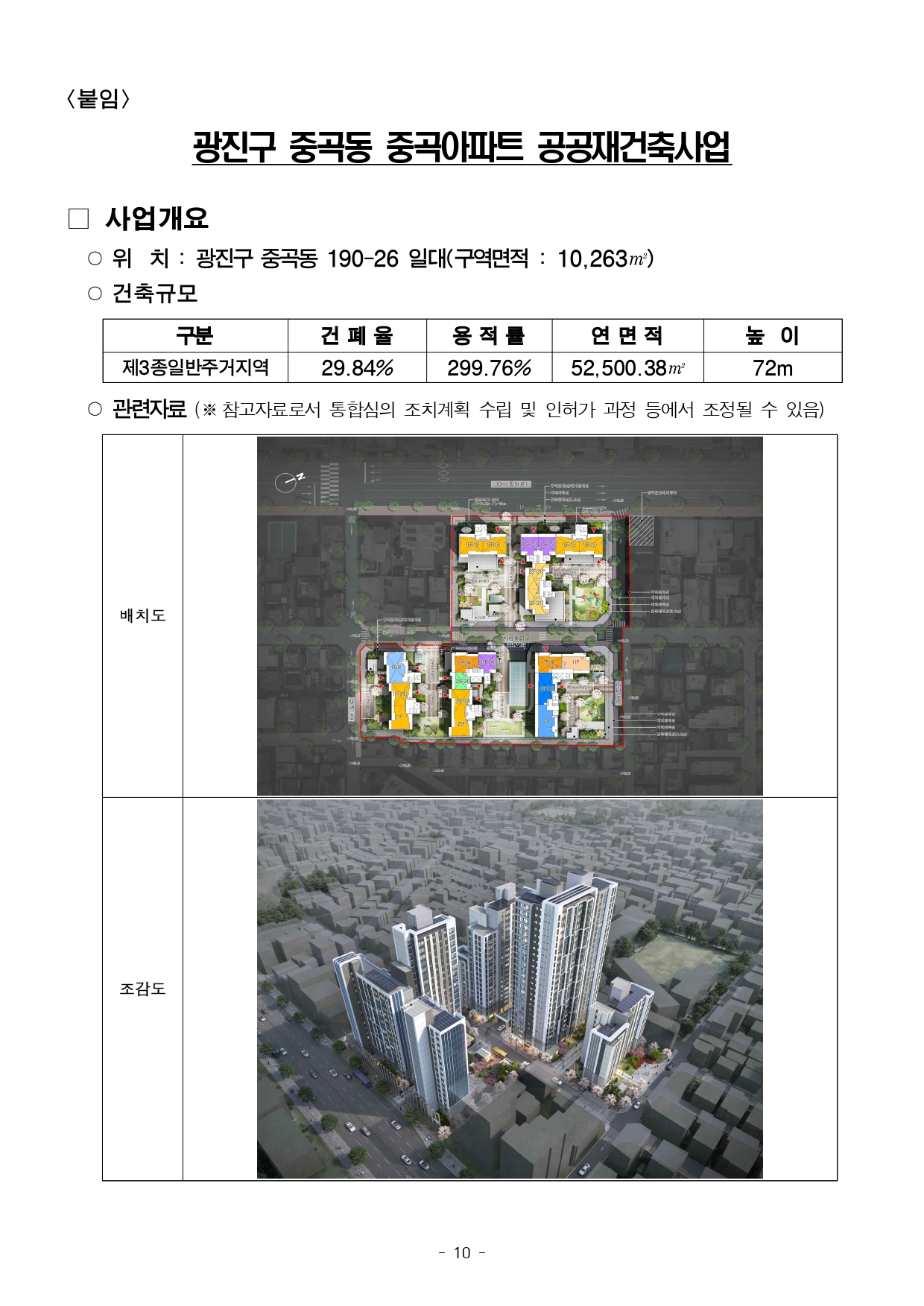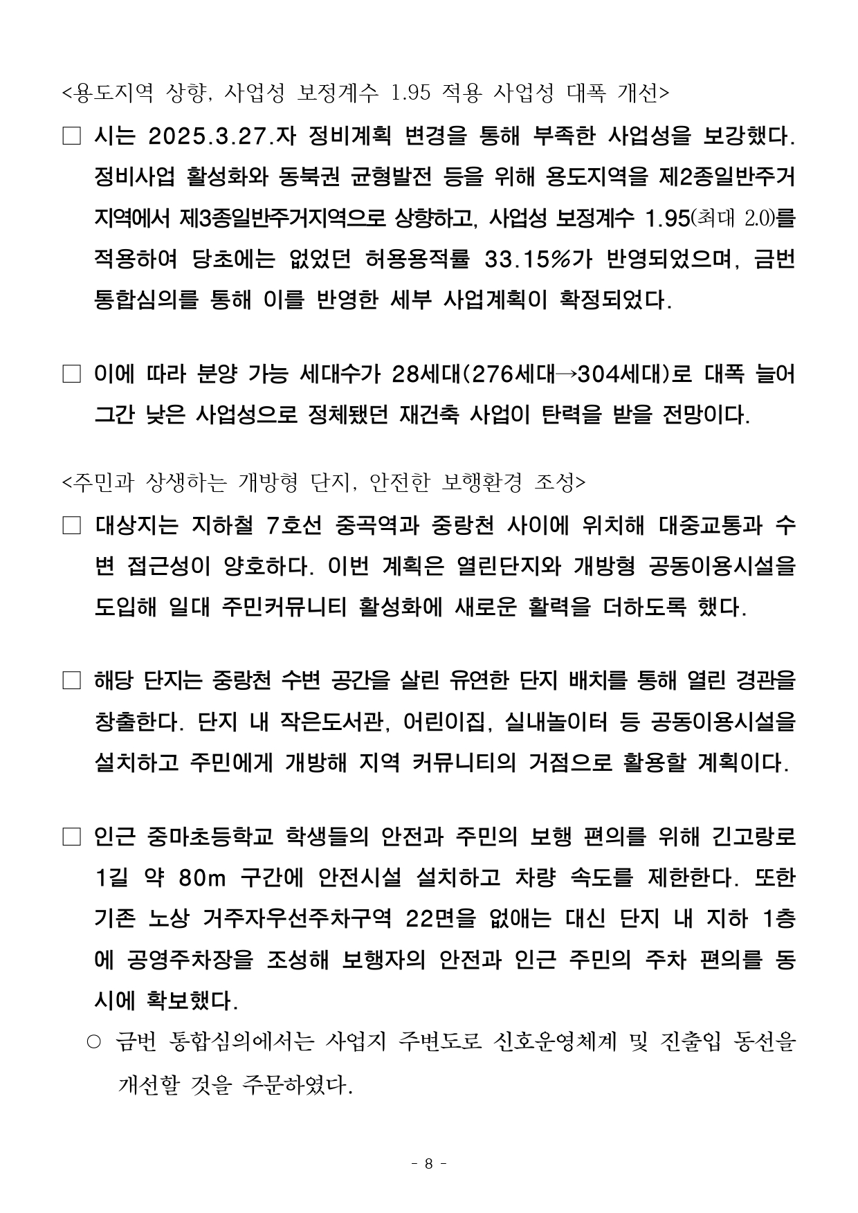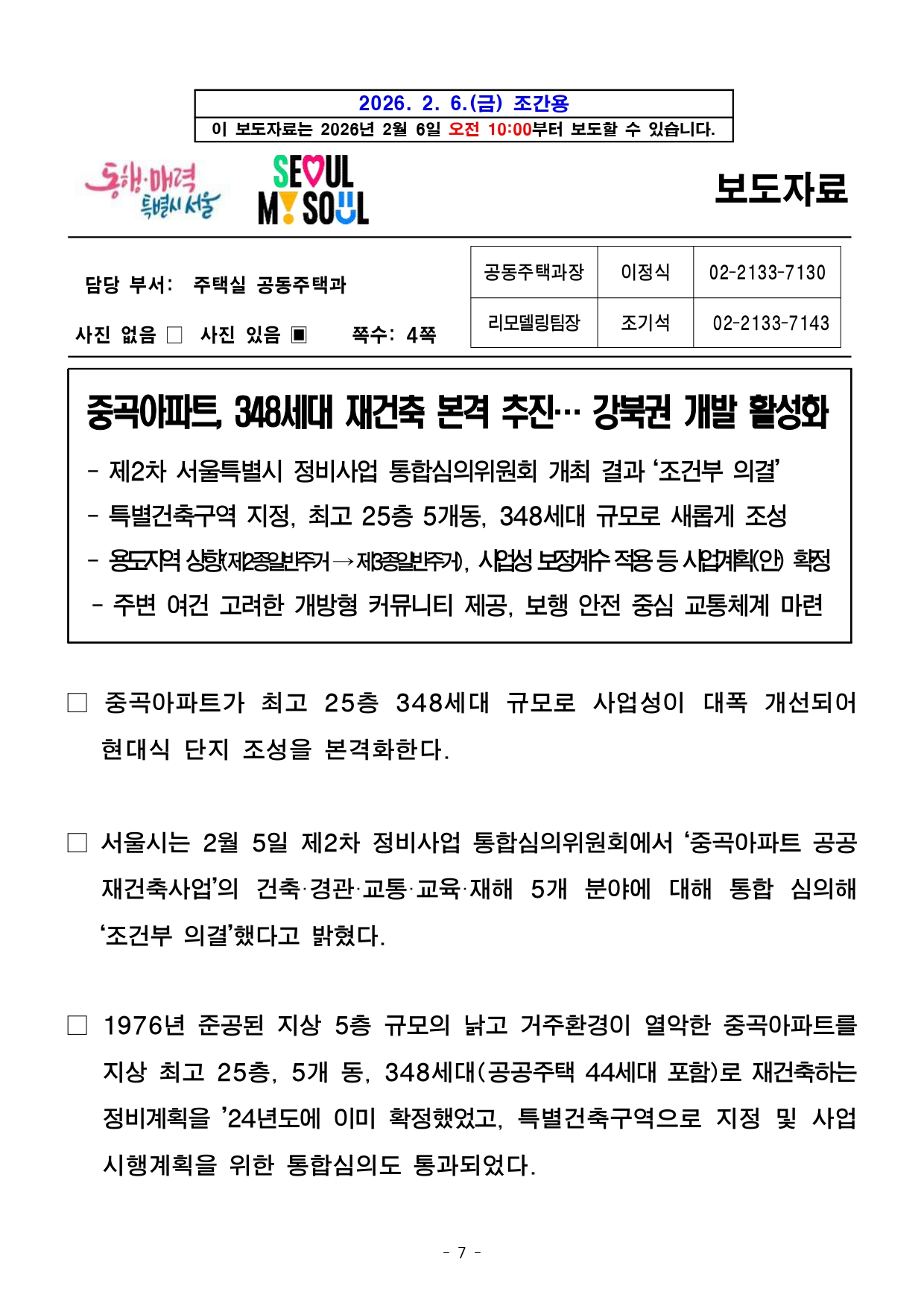 - 1 - 2026. 2. 6.(금) 석간용 이 보도자료는 2026년 2월 6일 오전 10:00부터 보도할 수 있습니다. 보도자료담당 부서: 주택실 주거정비과 주거정비과장 김동구 02-2133-7190통합심의팀장 박성운 02-2133-7204사진없음 ■ 사진있음 □ 쪽수 : 2쪽 2026년 제2차 서울시 정비사업 통합심의위원회 개최결과□ 금일 처리 안건 : 총 2건 ○ 조건부 의결 : 1건 ○ 수정가결·조건부 의결 : 1건 ※ 자문, 보류, 보고 안건은 보도자료를 제공하지 않습니다. ※ 안건에 대한 자세한 내용은 소관부서에 문의하여 주시기 바랍니다. 붙임 심의결과 1부. - 2 - 제2차 정비사업 통합심의위원회 개최결과【 2026. 2. 5. (목) 14:00 】 ▣ 총 2건 (조건부 의결 1건, 수정가결·조건부 의결 1건) 연 번 안 건 명 안 건 개 요 심의결과 비고1 <심의-신규> 동소문제2구역 주택재개발 정비사업 ○ 위 치 : 성북구 동소문동2가 33번지 일대(23,249.4㎡) ○ 지역지구 : 준주거지역 ○ 내 용 : 정비계획변경+건축+경관+교통+교육+재해+소방 수 정 가 결 조건부의결 <주거정비과> 주거정비지원팀팀장 : 정경승담당 : 최하람(2133-7236) 2 <심의-신규> 중곡아파트 재건축사업 ○ 위 치 : 광진구 중곡동 190-26번지 일대(10,263.7㎡) ○ 지역지구 : 제3종일반주거지역 ○ 내 용 : 건축+경관+교통+교육+재해 조 건 부 의 결 <공동주택과> 리모델링팀팀장 : 조기석담당 : 윤선희(2133-7144) - 3 - 2026. 2. 6.(금) 석간용 이 보도자료는 2026년 2월 6일 오전 10:00부터 보도할 수 있습니다.보도자료담당부서 : 주택실 주거정비과 주거정비과장 김동구 02-2133-7190 주거정비지원팀장 정경승 02-2133-7198 사진없음 □ 사진있음 ■ 쪽수 : 4쪽 동소문2구역, 20년 만에 재개발 본격화…초역세권에 618세대 공급- ’26년 제2차 서울특별시 정비사업 통합심의위원회 개최 결과 ‘수정가결‧조건부의결’ - 성북천변, 공개공지 배치…벚꽃 축제와 어우러진 걷고 싶은 수변감성 공간조성- 신속통합기획 시즌2 적용하여 철저하게 공정관리, 올해 사업시행인가, ’30년 착공목표□ 서울시는 2026년 제2차 서울특별시 정비사업 통합심의위원회를개최하고‘성북구 동소문2구역 주택재개발 정비사업’을 심의한 결과, 정비계획· 건축·경관·교통·소방 등 7개 분야에 대해 ‘수정가결‧조건부의결’ 하였다.□ 동소문제2구역은 주민 동의 부족 등 갈등으로 2002년 재개발구역지정 이후 20년 넘게 사업이 지연되었으며, 2008년 조합설립이후에도사업성 부족 사유로 사업 추진이 어려워 장기간 정체가 이어졌다. ○ 이 지역은 건축물의 81%가 노후건축물로, 10가구 중 8가구가낡은주택에 거주하고 있다. 또한, 필지의 67.9%가 90㎡ 미만의과소필지이며, 도로 접도율은 24.19%, 호수밀도는 92.4호/ha로주택밀집도가 높아 채광, 환기, 안전 등 주거환경이 전반적으로취약해정비가 시급하다. - 4 - <한성대입구역과 인접한 교통 요지… 도심 접근성 강화> □ 동소문2구역에는 지상 35층 규모의 공동주택 4개동, 총 618세대가공급될 예정이다. 특히 지하철 4호선 한성대입구역과 맞닿은초역세권에 위치해 도심 접근성이 뛰어나며, 지하철과의 연결로 교통편의성도 크게 향상될 전망이다. 이번 재개발 사업은 강북 전성시대의마중물이 될 것으로 기대된다. <천변과 연계된 상가·보행 공간… 벚꽃 축제를 품은 걷고 싶은 성북천> □ 사업지는 성북천과 인접한 입지적 특성을 반영하여, 천변 산책로와자연스럽게 연결되는 상가(쇼핑·먹거리 등) 시설과 함께 공개공지(개방형 공간)를 배치하여, 주민과 방문객 모두에게 쾌적한 보행환경과수변 공간을 제공할 계획이다. ○ 특히, 성북천변 주요 진입부에는 광장형 공개공지를 계획해보행자중심의 공간 구조를 강화하고 가로 활성화 및 천변 경관과조화되는열린 공간으로 재탄생할 것으로 기대된다. ○ 더불어, 성북천에서 열리는 벚꽃축제와의 연계도 기대된다. 천변과단지가 자연스럽게 이어져 주민들이 축제를 가까이에서 즐길수있으며, 지역 상권과 공동체 활성화에도 기여할 전망이다. □ 금회 통합심의는 정비계획 변경을 포함해 한 번에 심의하면서 사업속도도한층 빨라졌다. 상정안에는 입체적 결정을 통해 단지 내에 공공청사를함께 조성하는 내용이 담겨 공공서비스를 크게 높였다는 평가다. 이에따라지역 주민들의 문화·편의 여건이 크게 개선될 것으로 기대된다고 시는밝혔다. ○ 금번 통합심의에서는 세부적인 공개공지 활용 방안에 대해인근성북천과 연계할 것을 주문하였다. - 5 - □ 서울시는 “동소문2구역 재개발은 단순한 주거 공급을 넘어, 천변을중심으로 쾌적한 마을을 조성하는 강북 전성시대를 여는 사례”라며, “신속통합기획 시즌2를 적용해 주택 공급이 신속히 이루어지도록 사업관리를철저히 하겠다”고 말했다. 이어 “앞으로도 정비사업 시 해당지역의특성을 반영한 정비계획으로 주민 삶의 질을 높이겠다”고 덧붙였다. - 6 - <붙임1> 동소문제2구역 주택재개발 정비사업□ 사업개요 ○ 위 치 : 성북구 동소문동 2가 33일대 (구역면적 : 23,249.4㎡) ○ 건축규모 구분 건 폐 율 용 적 률 연 면 적 높 이공동주택 및 근린생활시설 38.68% 430.48% 125,566.9㎡ 113m○ 관련자료 (※참고자료로서 통합심의 조치계획 수립